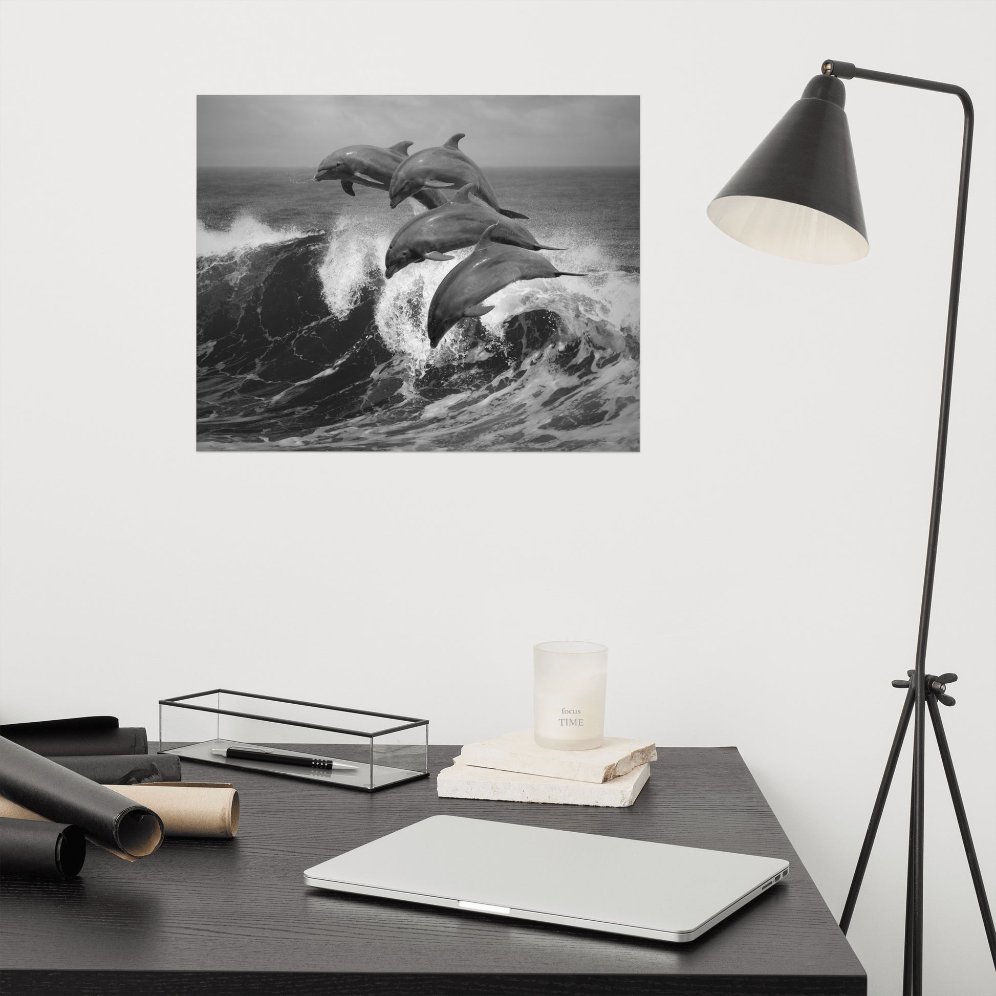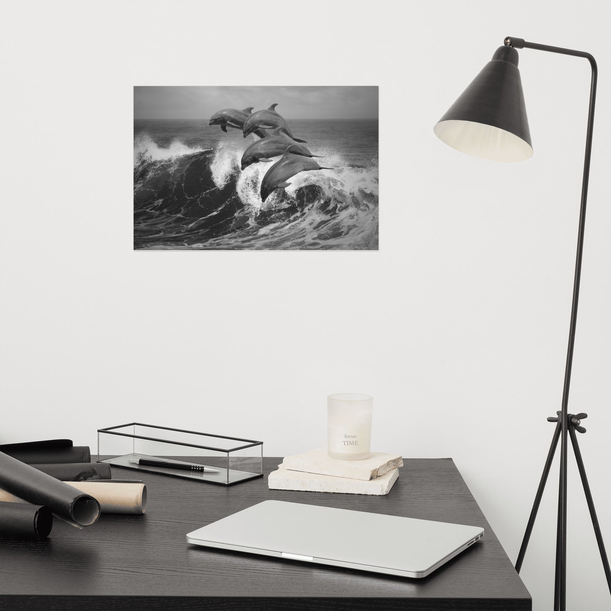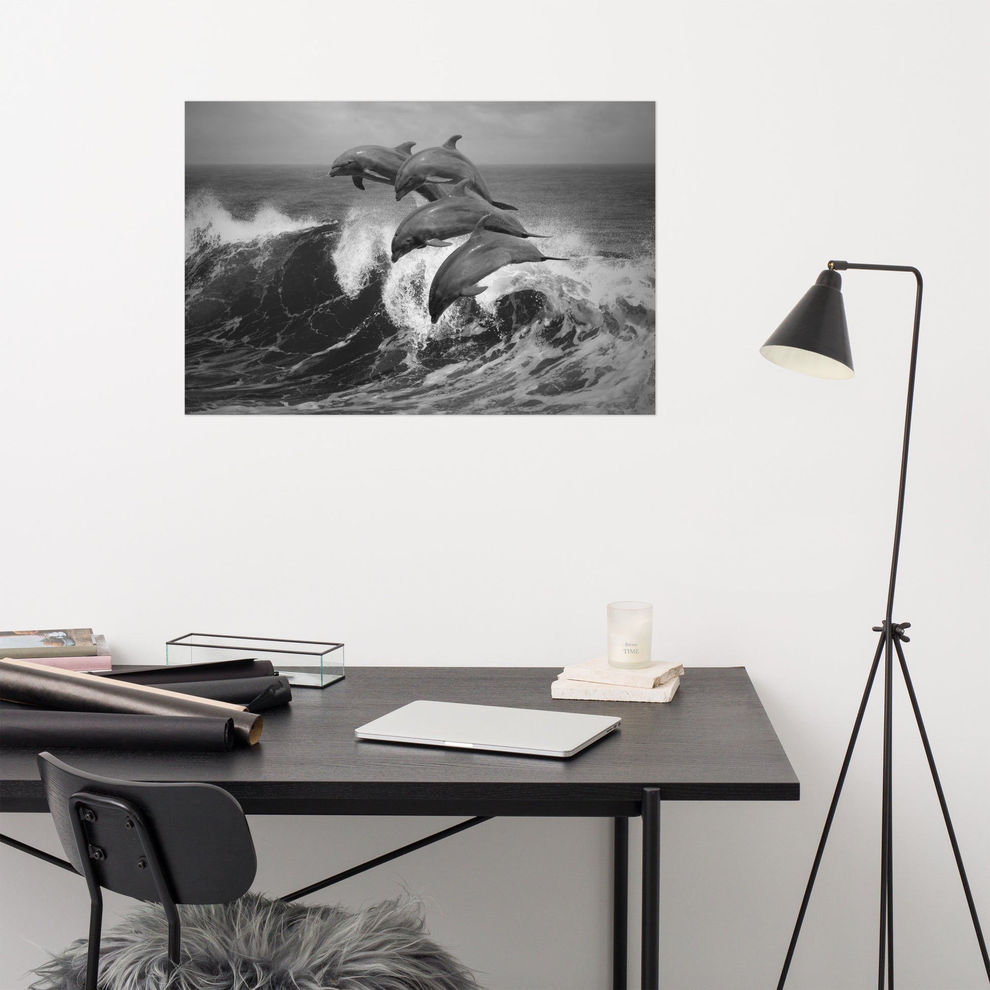 Four Bottle Noise Dolphins Jumping Waves In Tropical Ocean Black and White Animal Wildlife Photograph Loose Wall Art Print