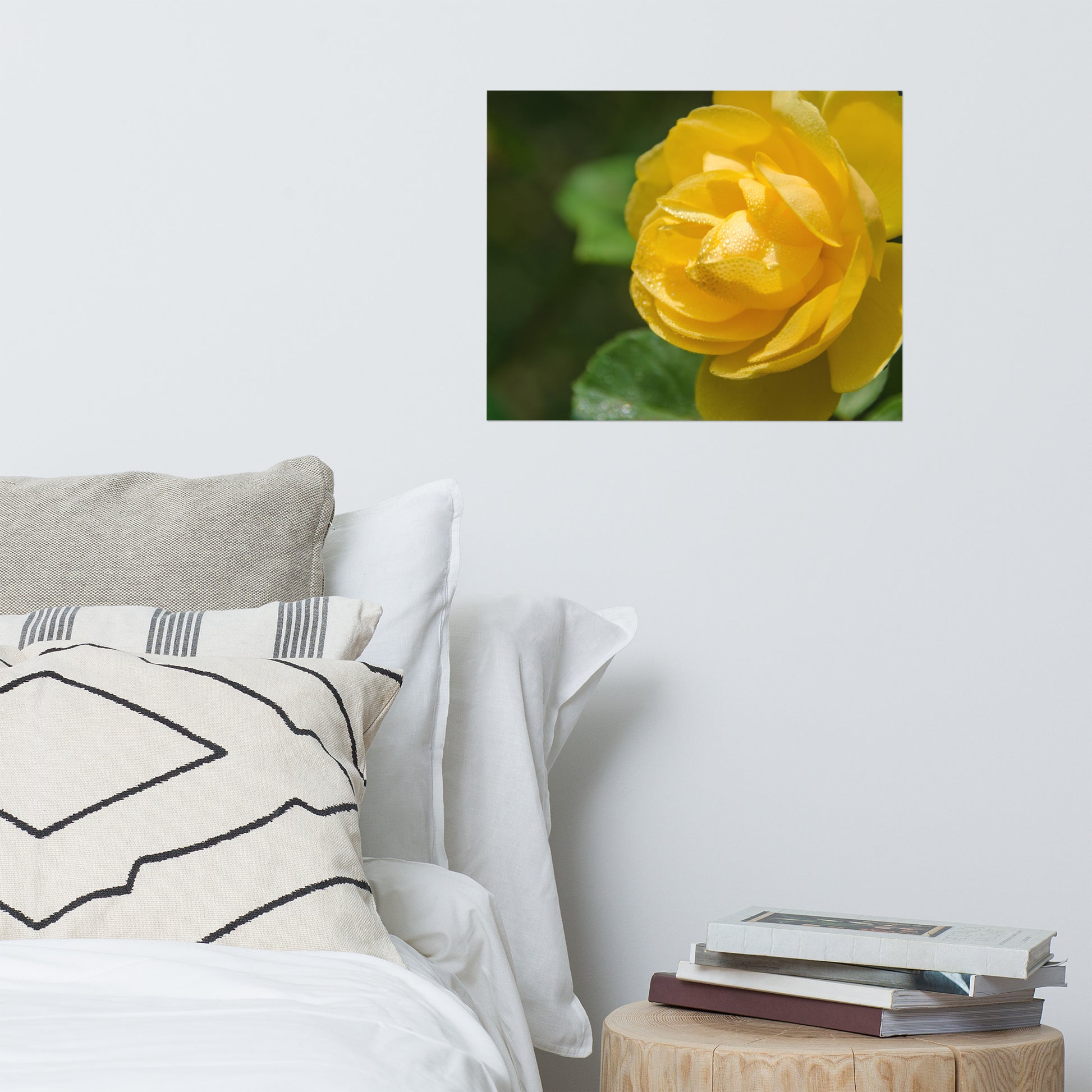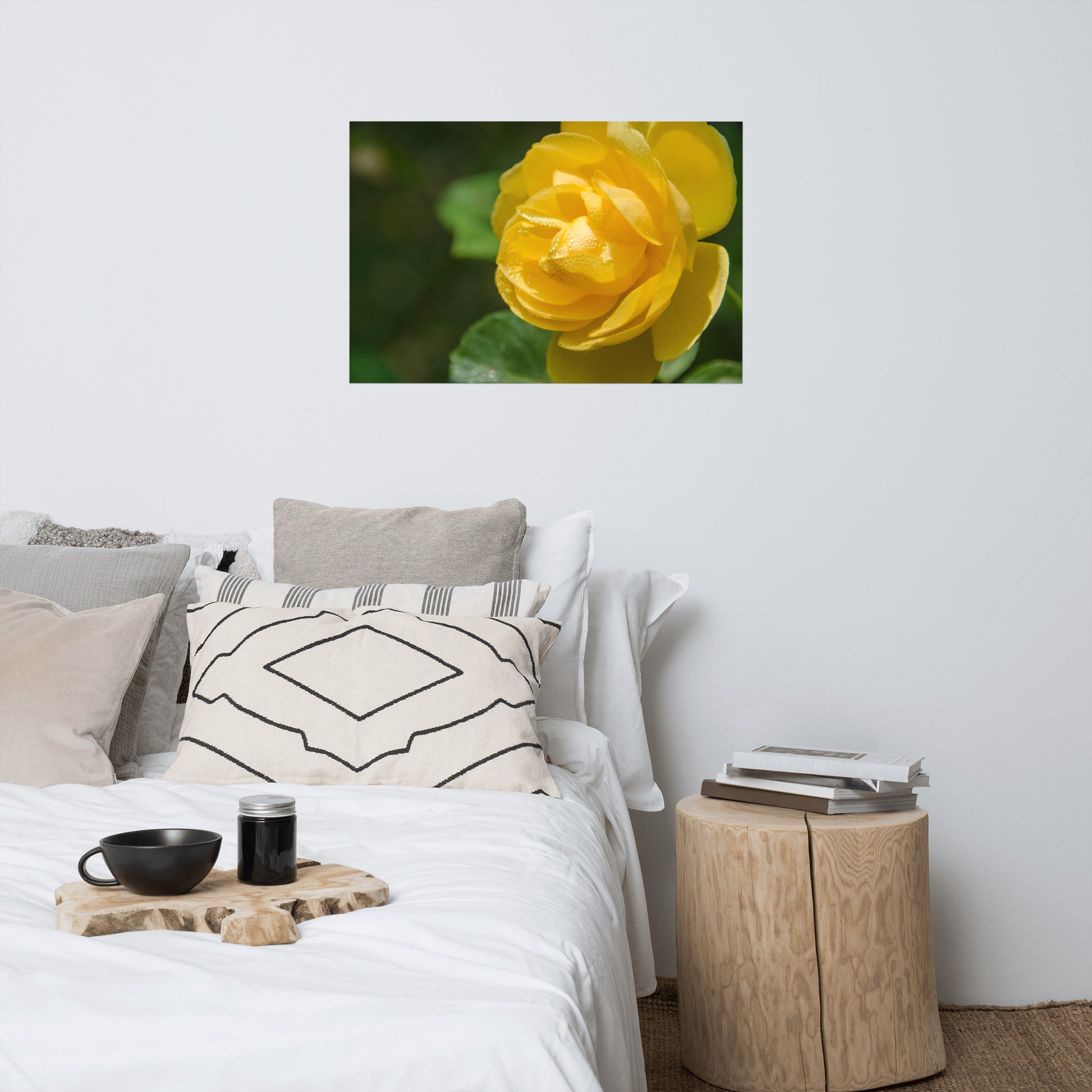 About this minimalist floral print: "Friendship Rose" is a softly lit floral nature photograph capturing the delicate beauty of a bright yellow rose in full bloom. Dewdrops glisten on each petal, set against the lush green foliage of Brandywine Park's award-winning Rose Garden in Wilmington, Delaware. Printed on high-quality photo paper, this unframed artwork invites you to bring the serenity of nature into your home.