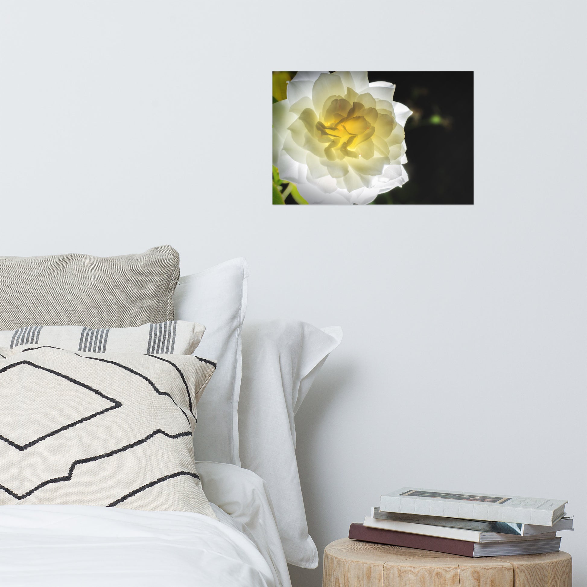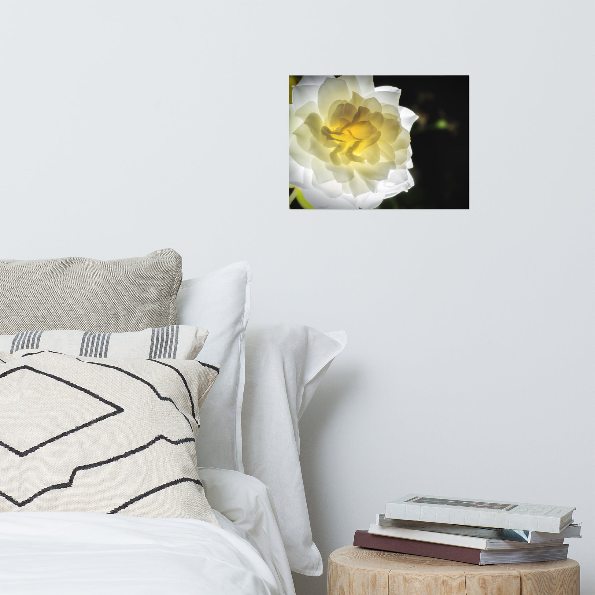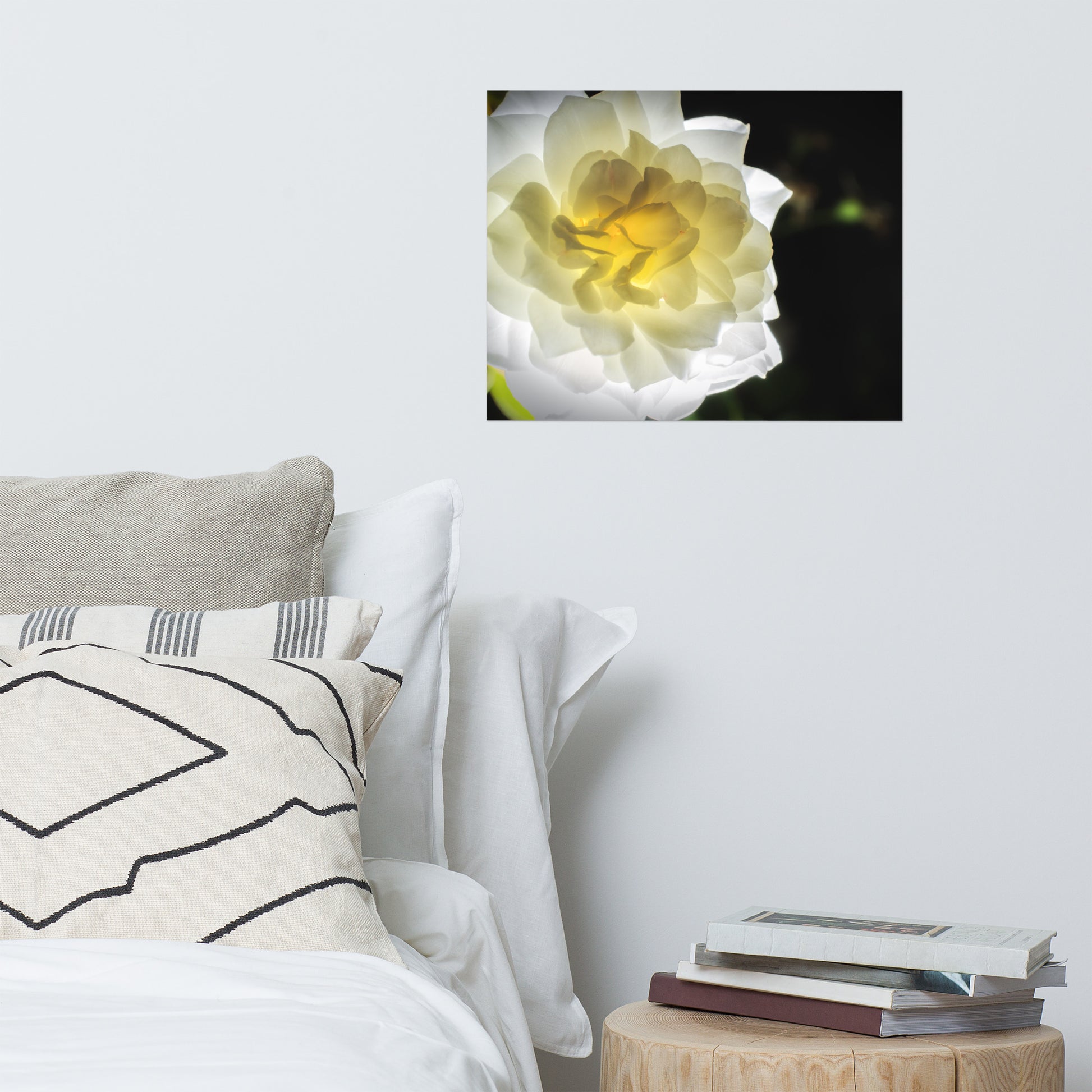 About this bold floral wall art: Capture the ethereal beauty of nature with this exquisite, unframed print. "Glowing Rose" is a meticulously detailed nature photograph showcasing a luminous white and yellow rose from the renowned Brandywine Rose garden in Wilmington, Delaware. The rose, in full bloom and bathed in a soft, ethereal glow, was expertly captured using a remote flash, highlighting the delicate translucence of the petals.