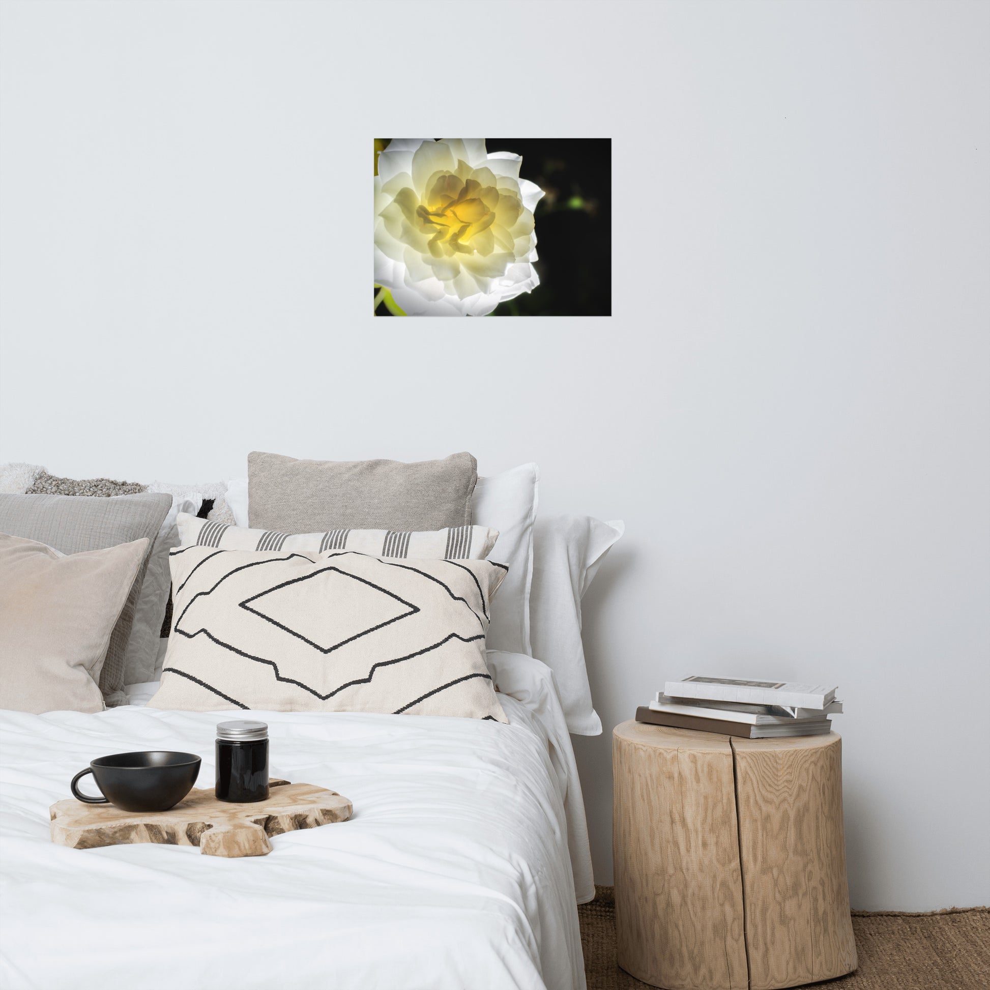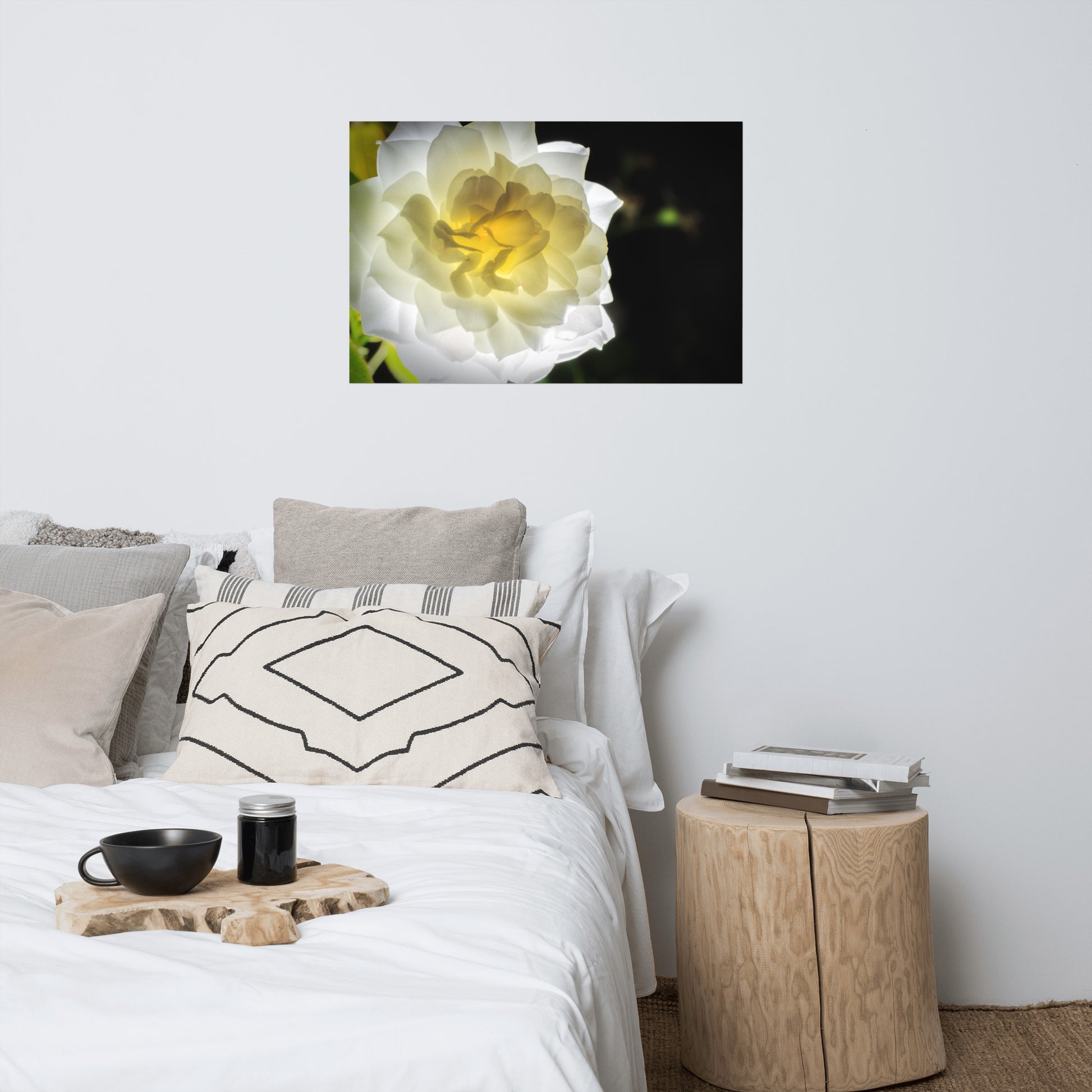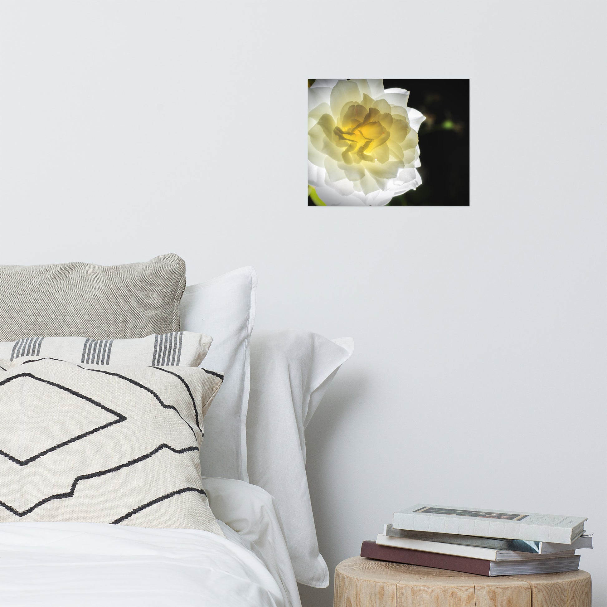 About this bold floral wall art: Capture the ethereal beauty of nature with this exquisite, unframed print. "Glowing Rose" is a meticulously detailed nature photograph showcasing a luminous white and yellow rose from the renowned Brandywine Rose garden in Wilmington, Delaware. The rose, in full bloom and bathed in a soft, ethereal glow, was expertly captured using a remote flash, highlighting the delicate translucence of the petals.