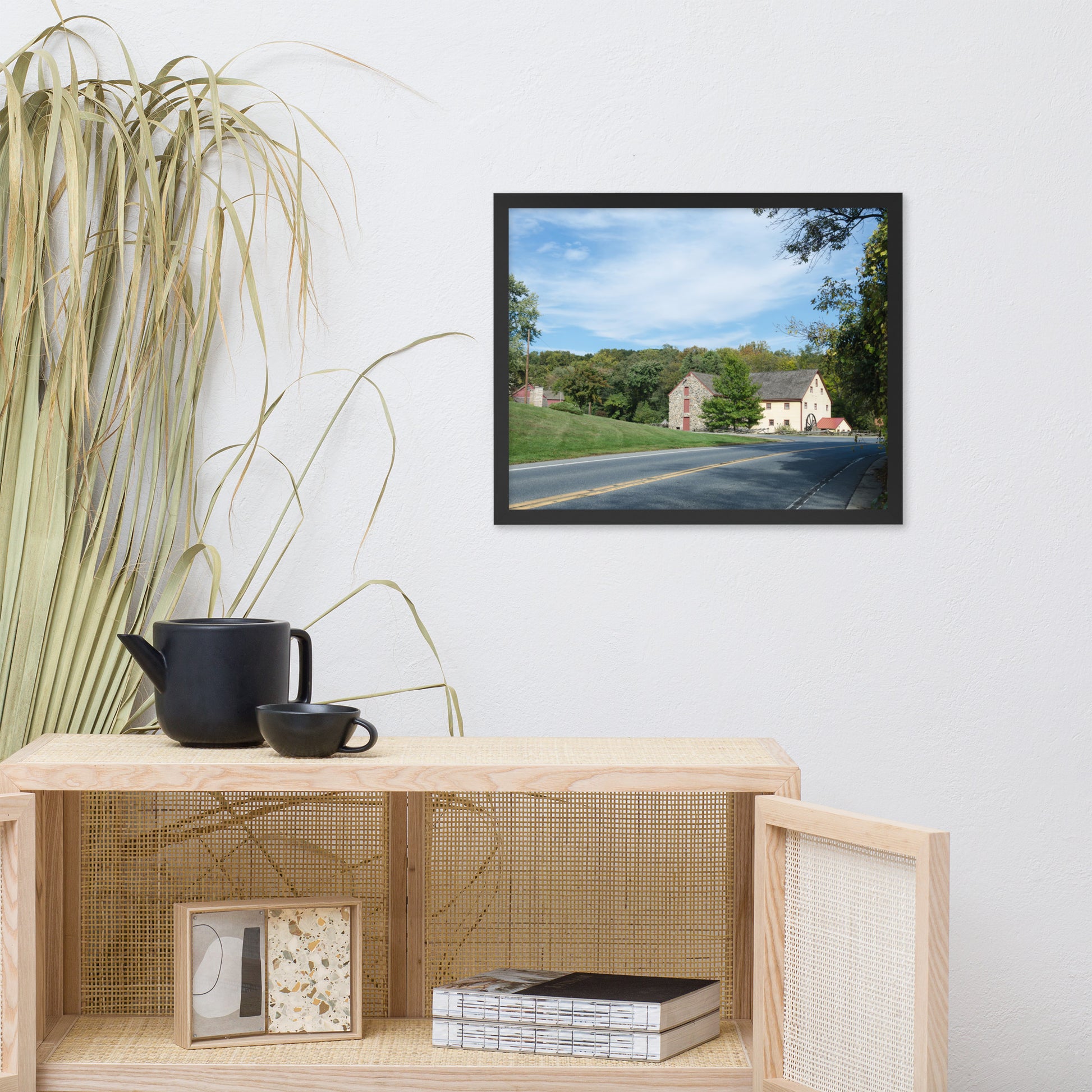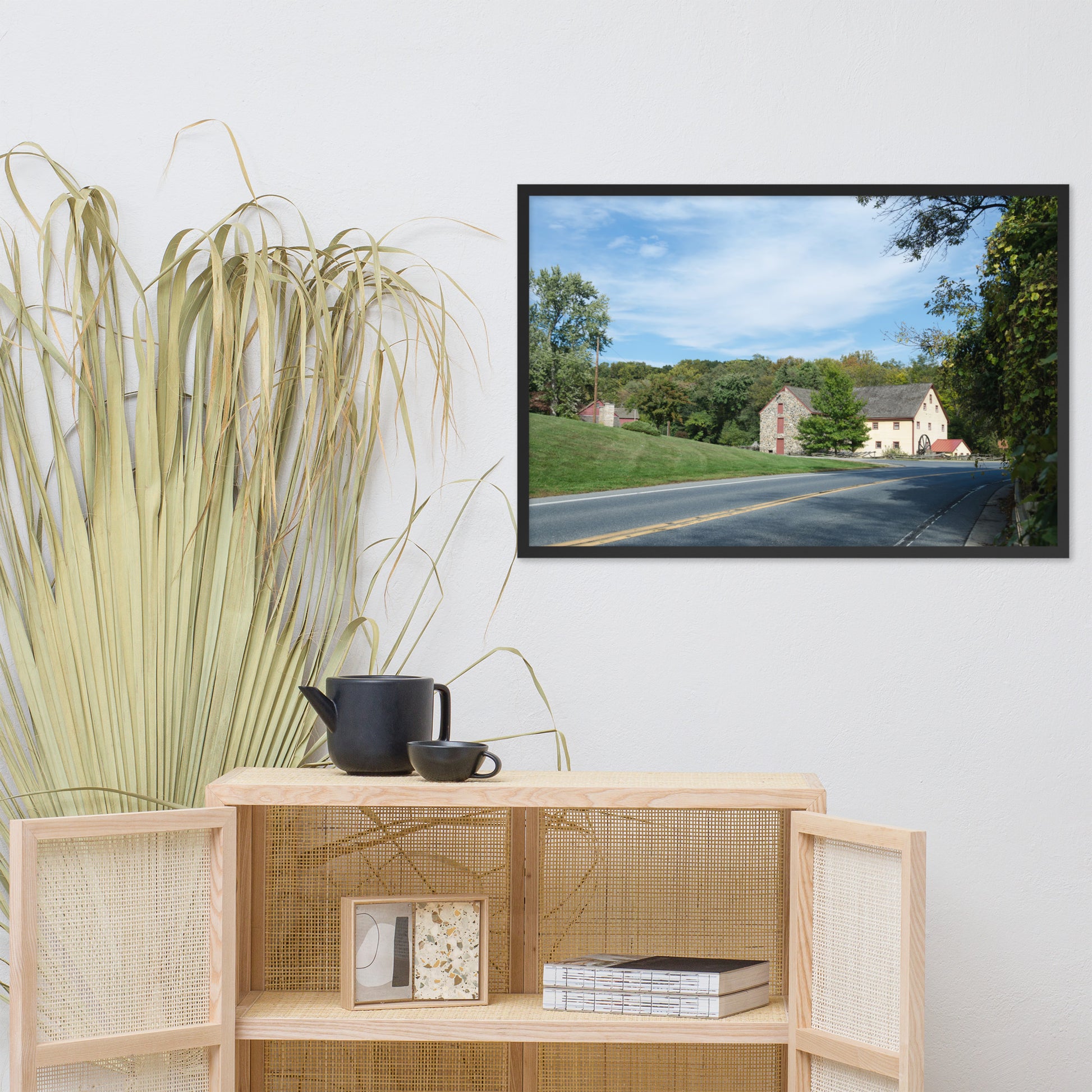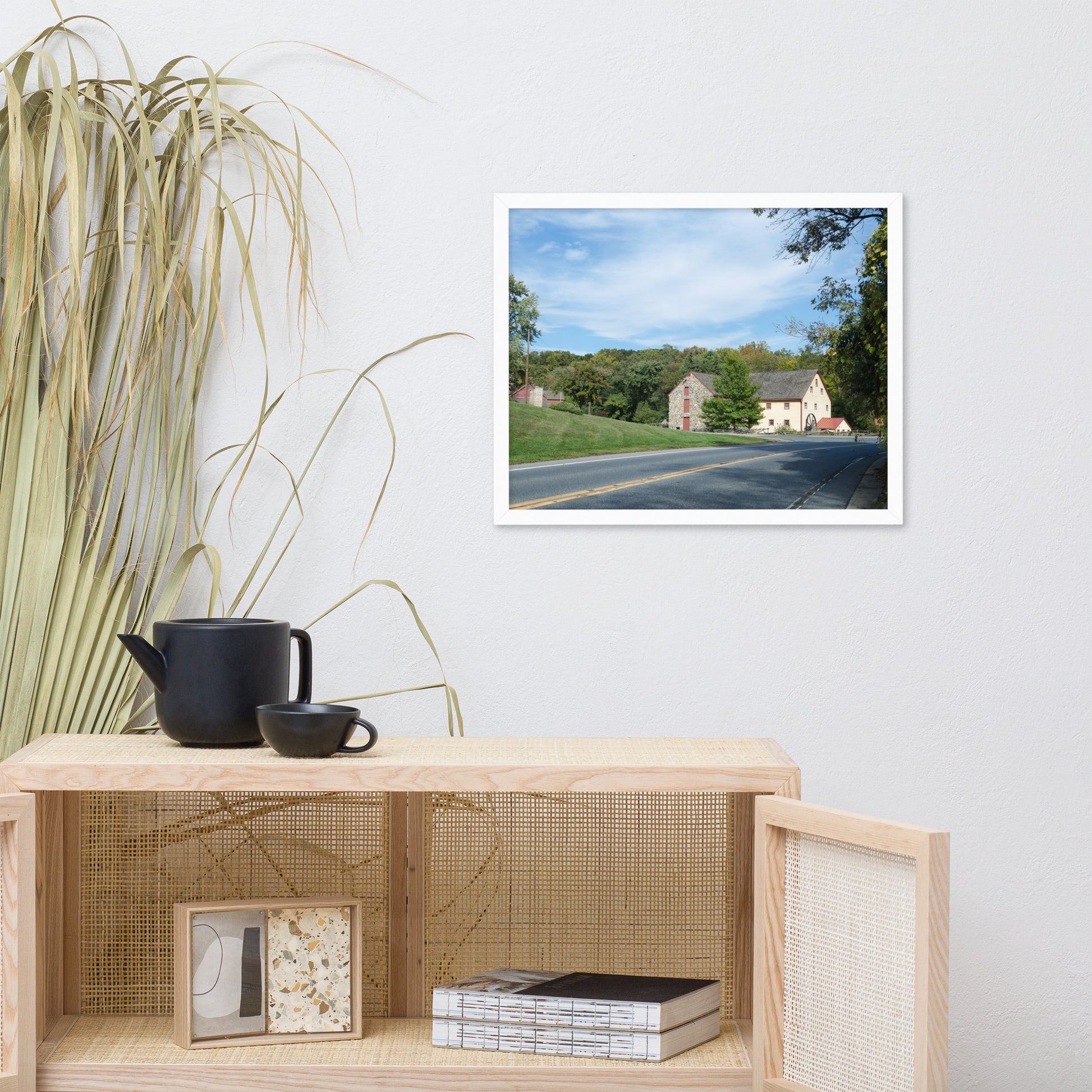 About this rustic framed art: This captivating photograph captures the timeless beauty of the Greenbank Mill, nestled amongst the lush greenery of a Delaware summer. The warm sunlight bathes the stone mill in a golden glow, highlighting its rich history and architectural details. The vibrant green landscape and clear blue sky evoke a sense of tranquility and nostalgia.