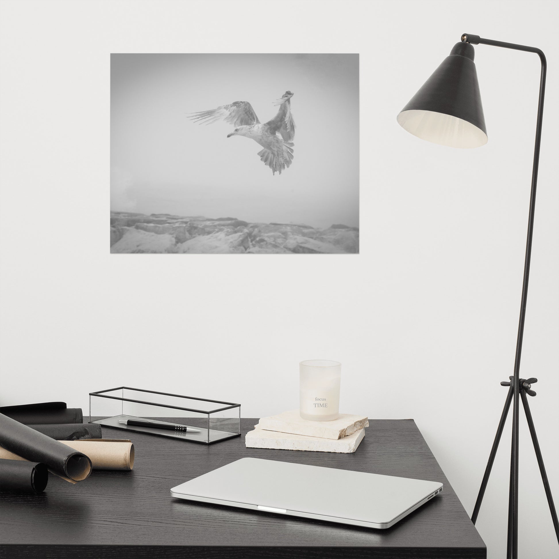Black and White Pictures to Frame: Coastal Seagull in the Fog Near Rock Jetty Bird / Animal / Wildlife / Nature Photograph - Loose / Frameable / Unframed / Frameless Wall Art Print - Artwork