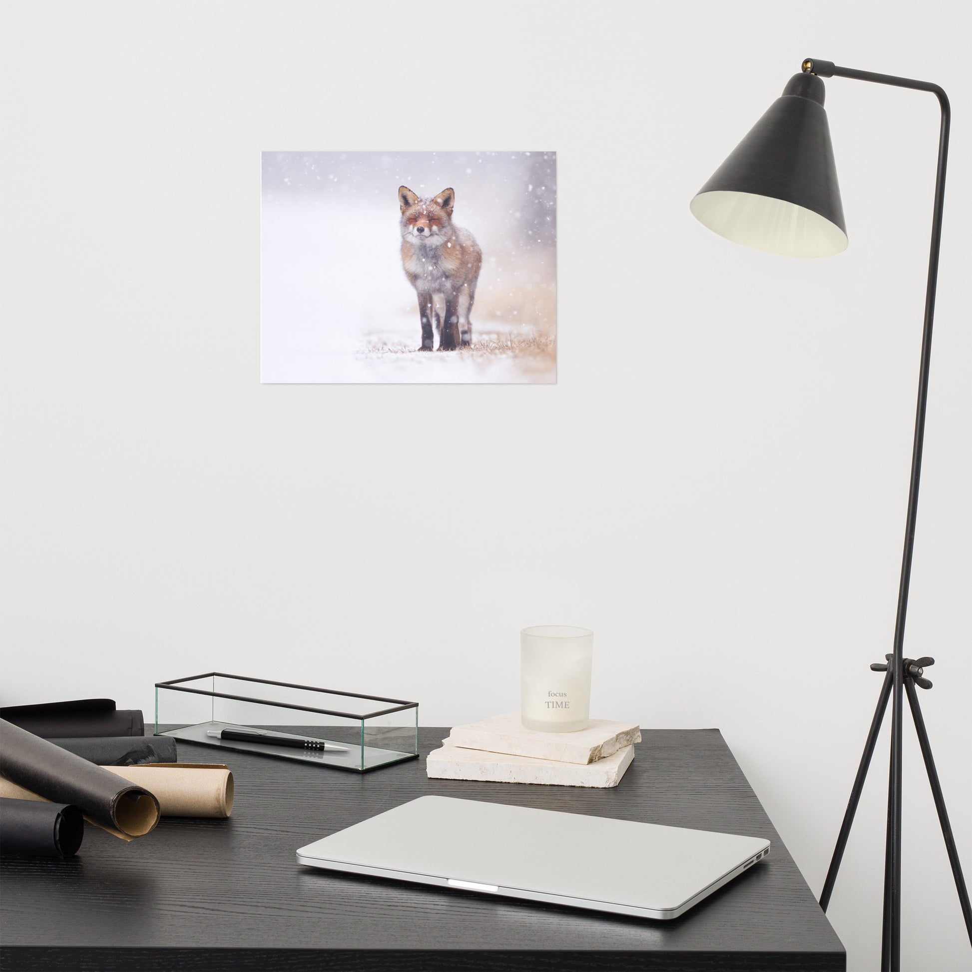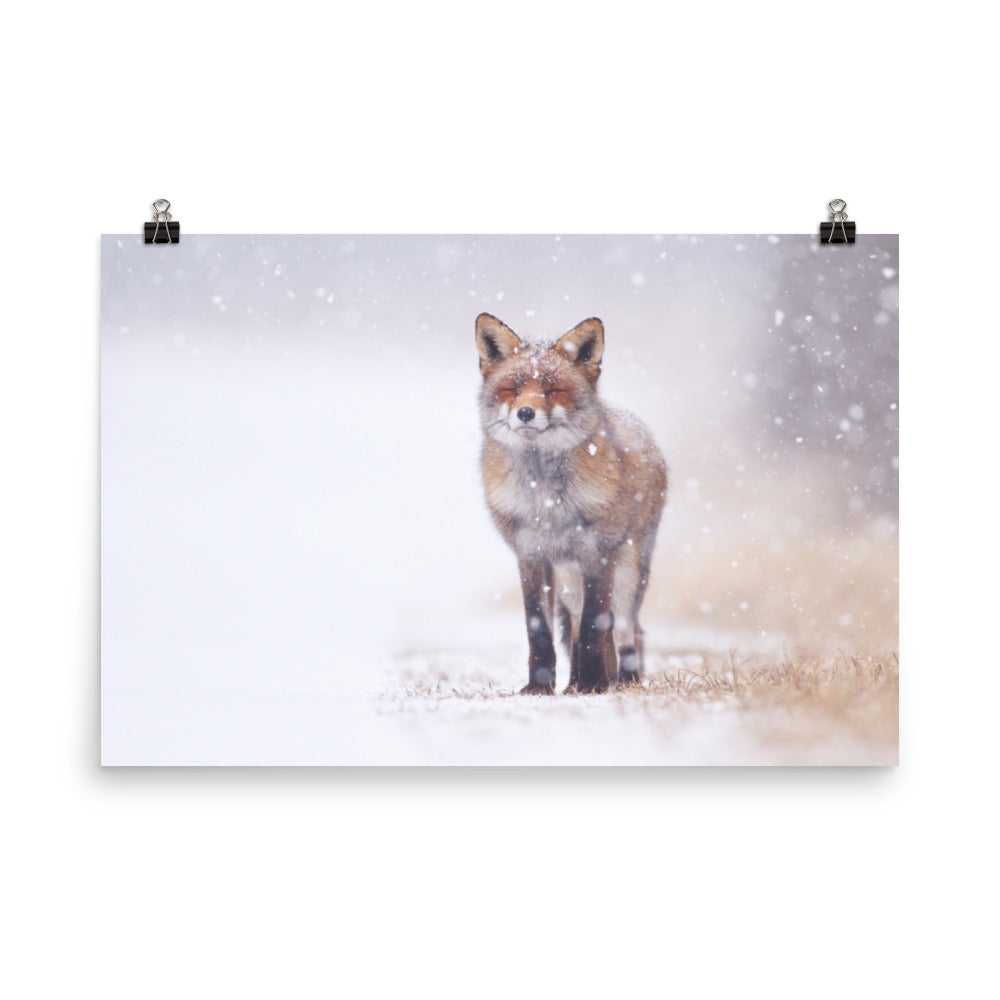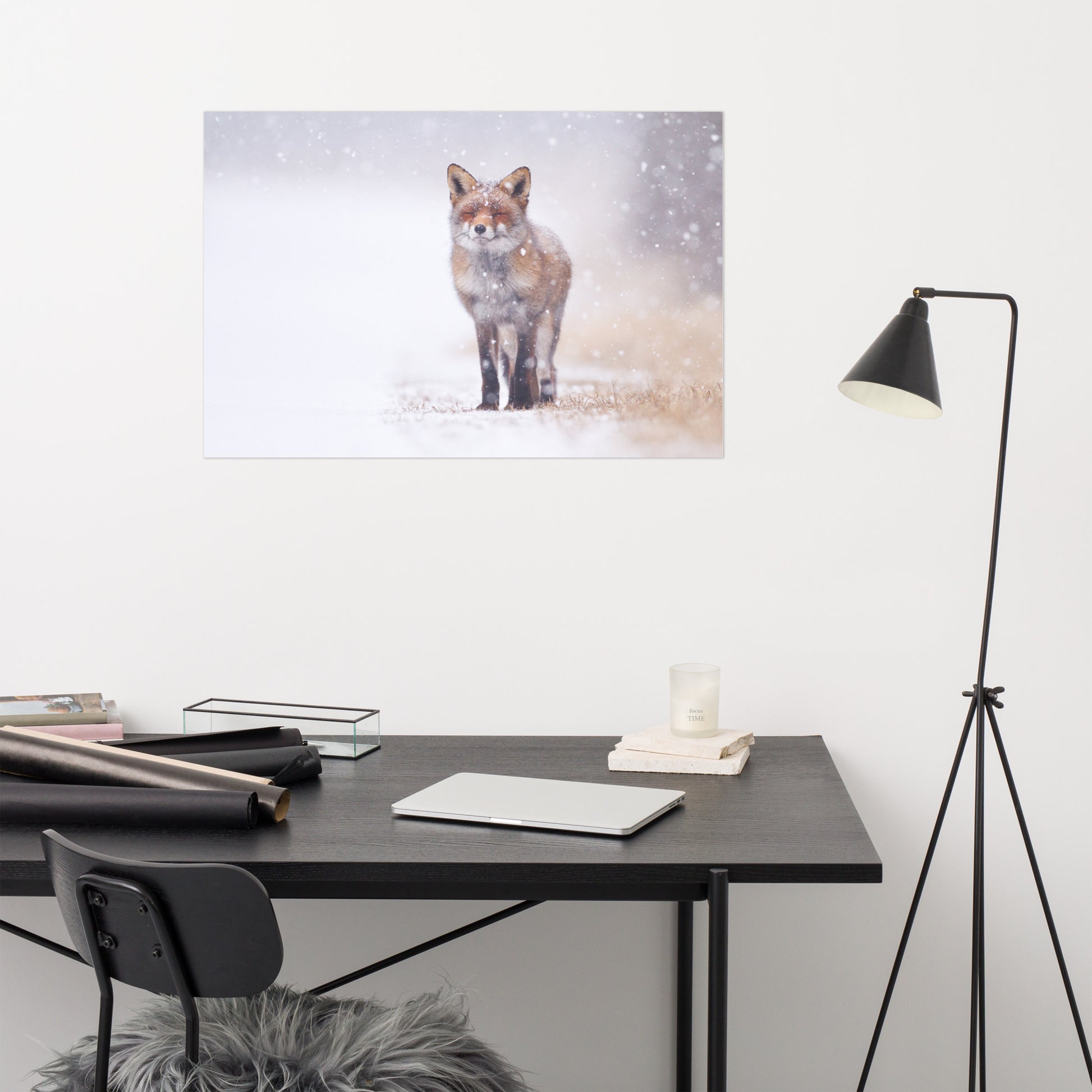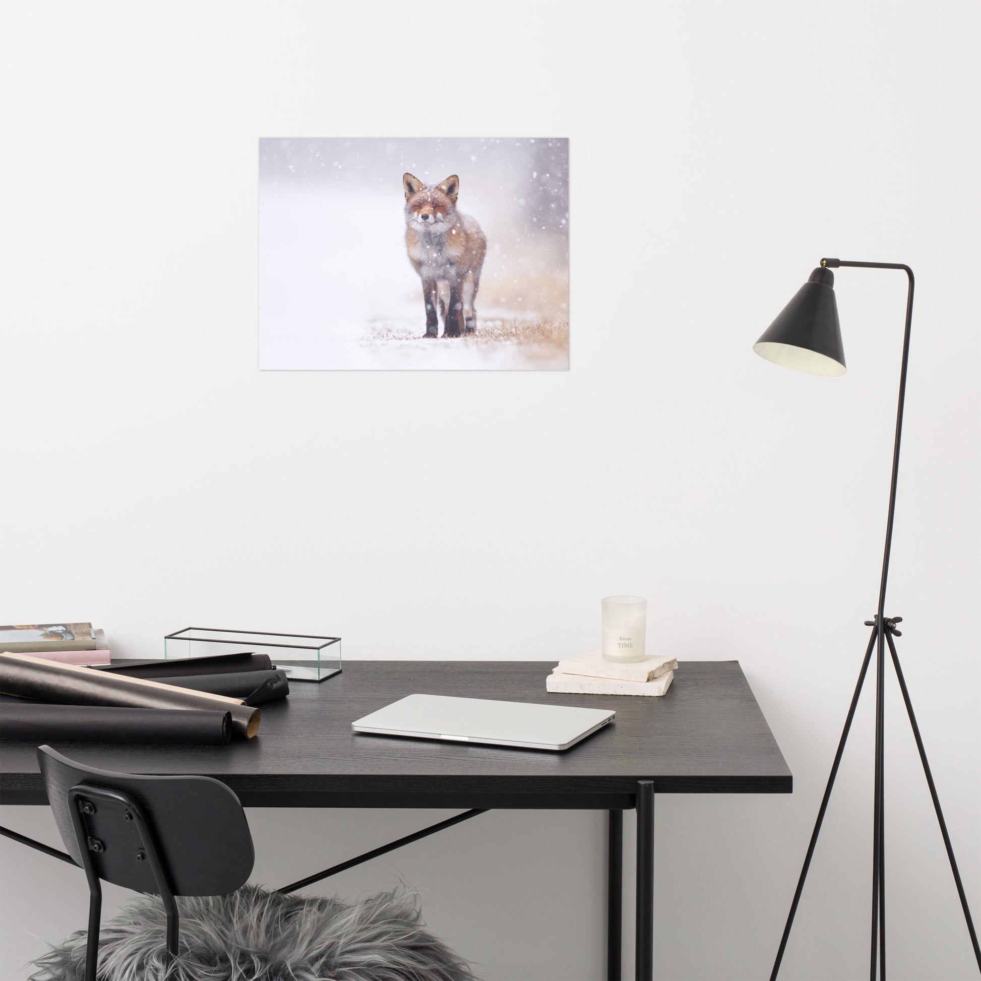 About these rustic winter wall art prints: Embrace the serenity of winter with this captivating wildlife art print. A majestic red fox stands poised in a snow-dusted field, its expression a tranquil reflection of the gentle snowfall. Capture the fleeting beauty of this moment and bring a touch of rustic charm to your home with this unframed art print, ready to complement your unique style and decor.