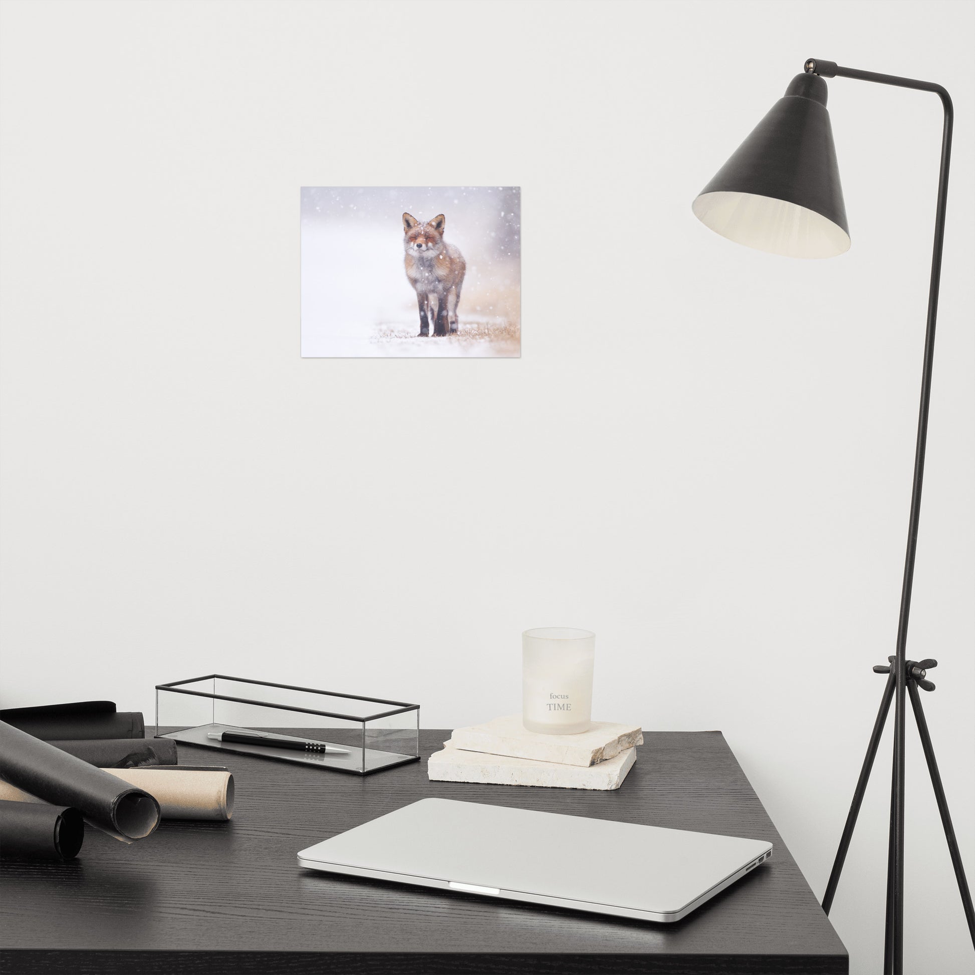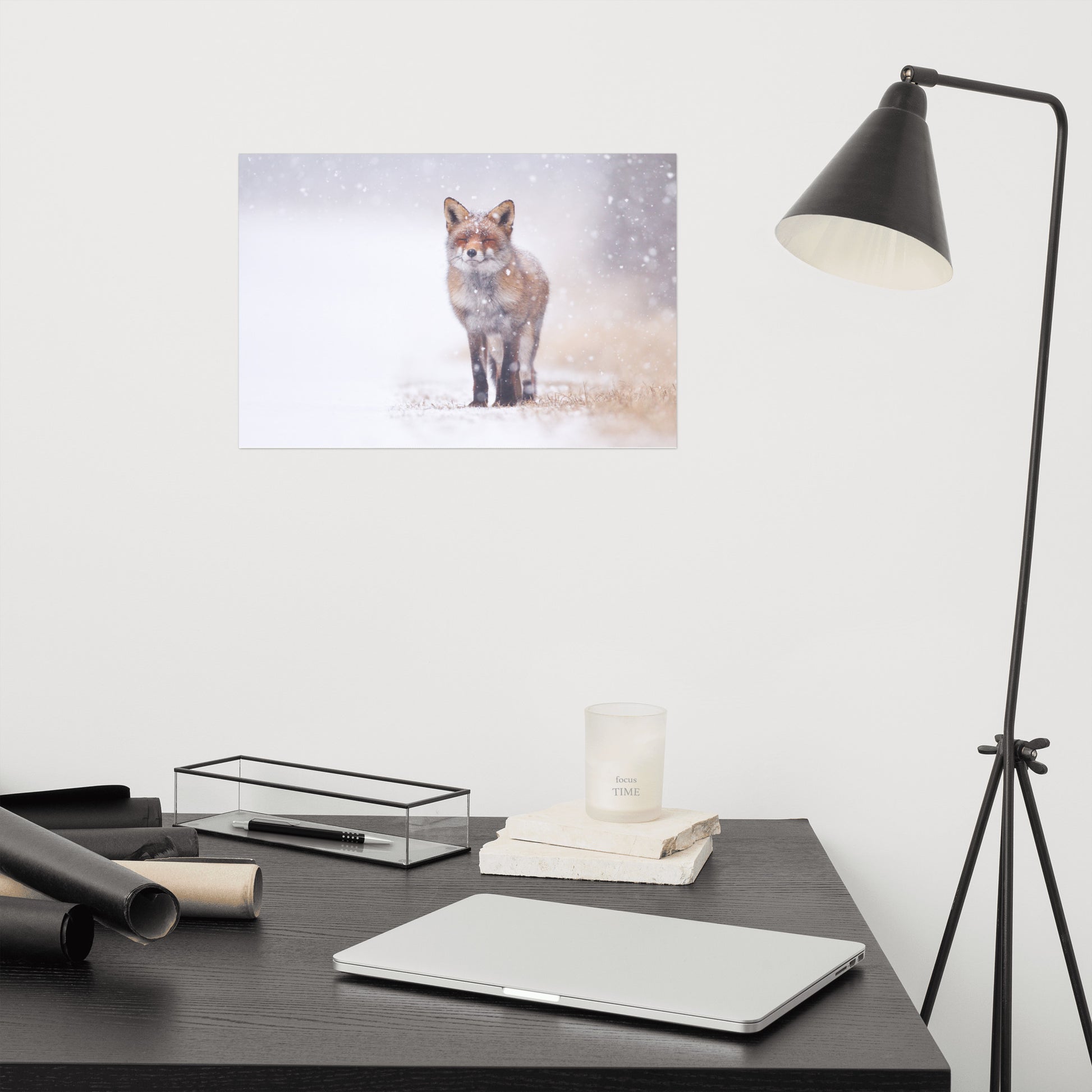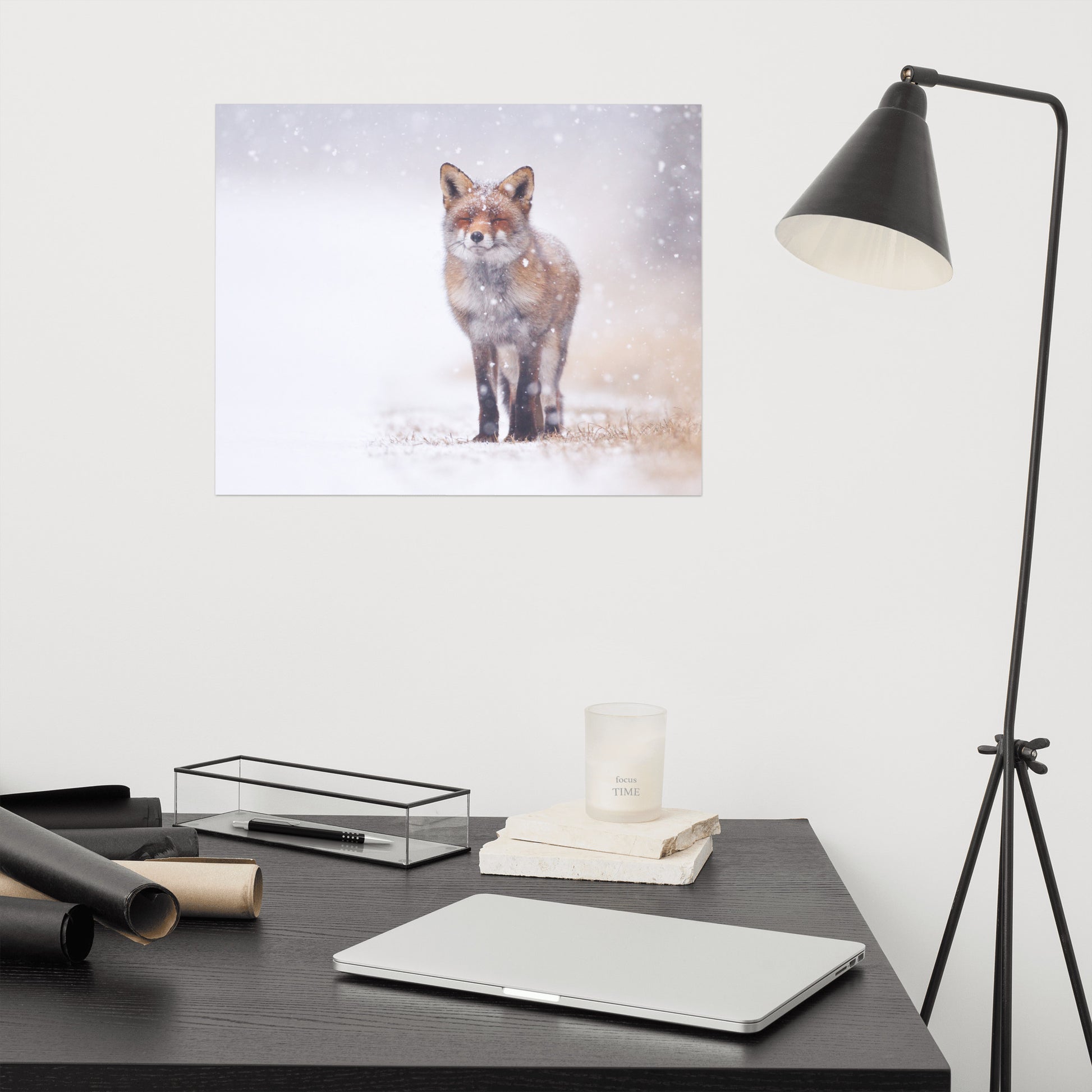 About these rustic winter wall art prints: Embrace the serenity of winter with this captivating wildlife art print. A majestic red fox stands poised in a snow-dusted field, its expression a tranquil reflection of the gentle snowfall. Capture the fleeting beauty of this moment and bring a touch of rustic charm to your home with this unframed art print, ready to complement your unique style and decor.