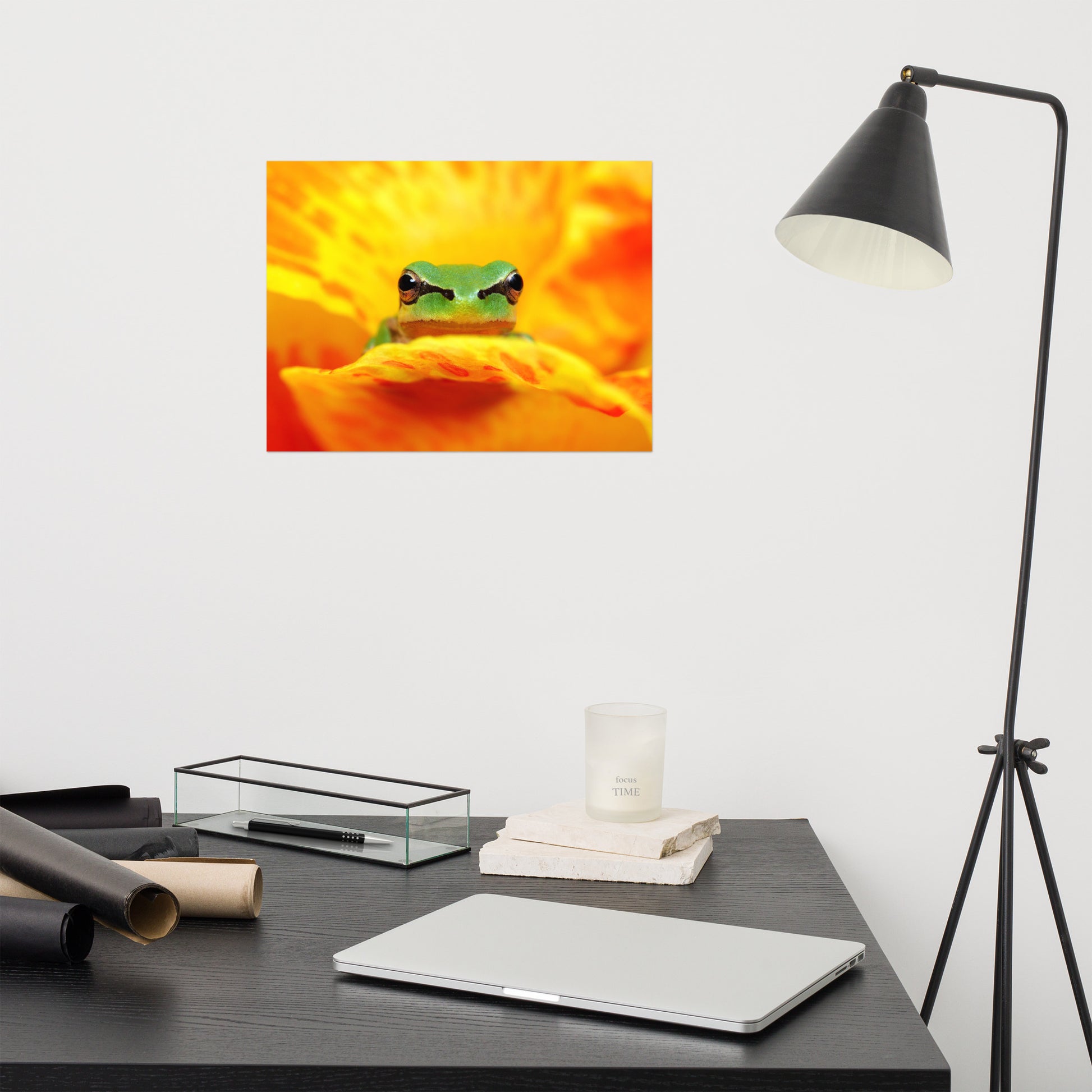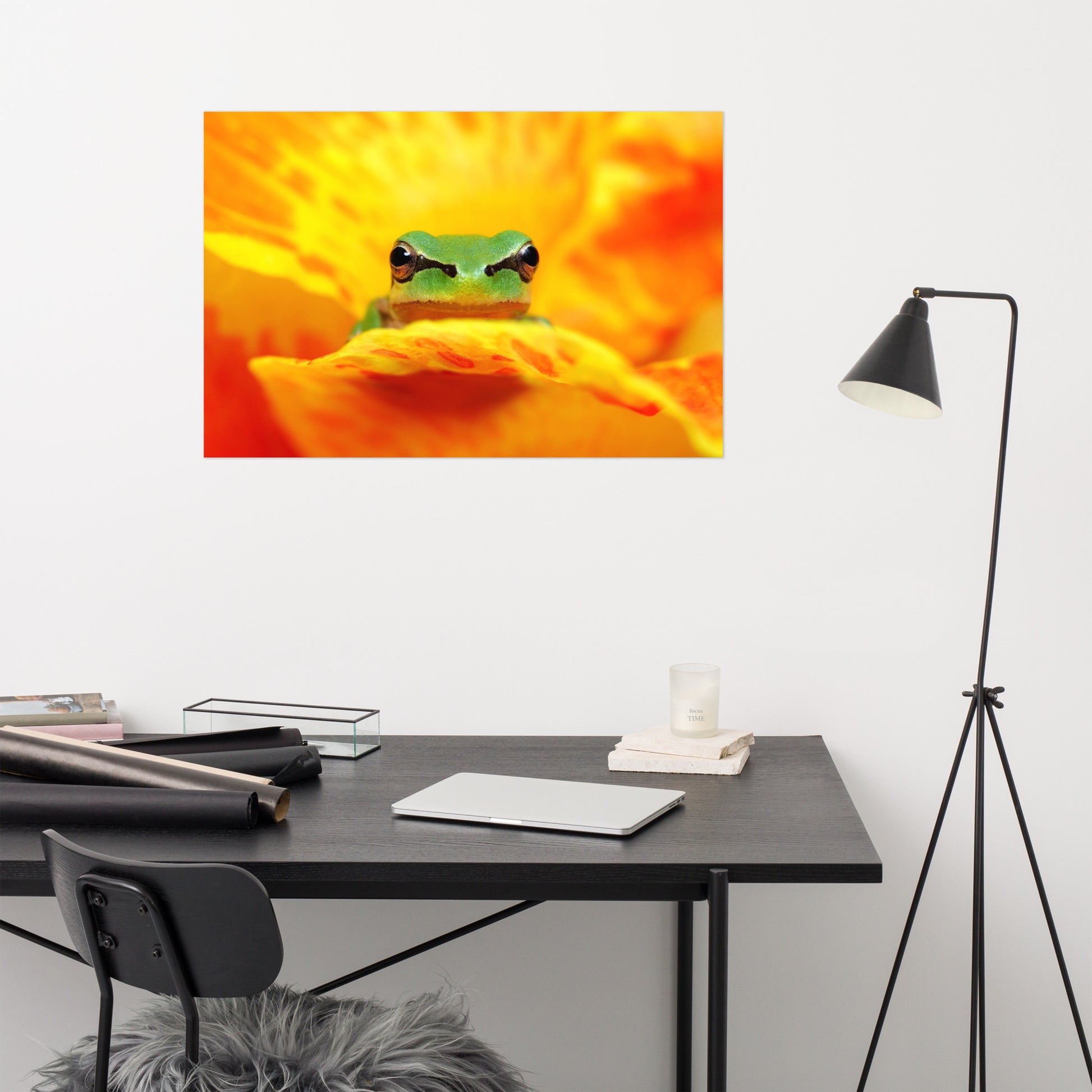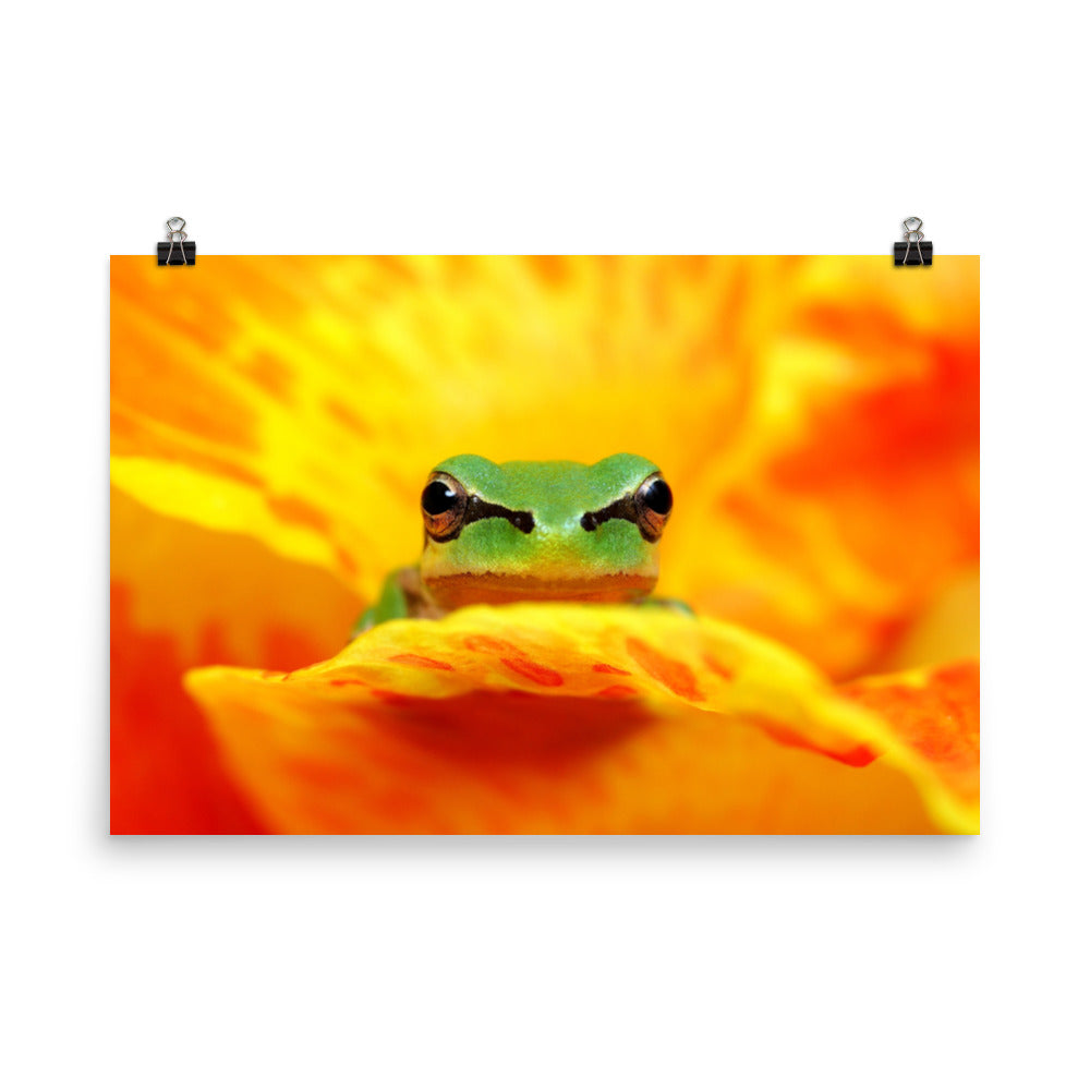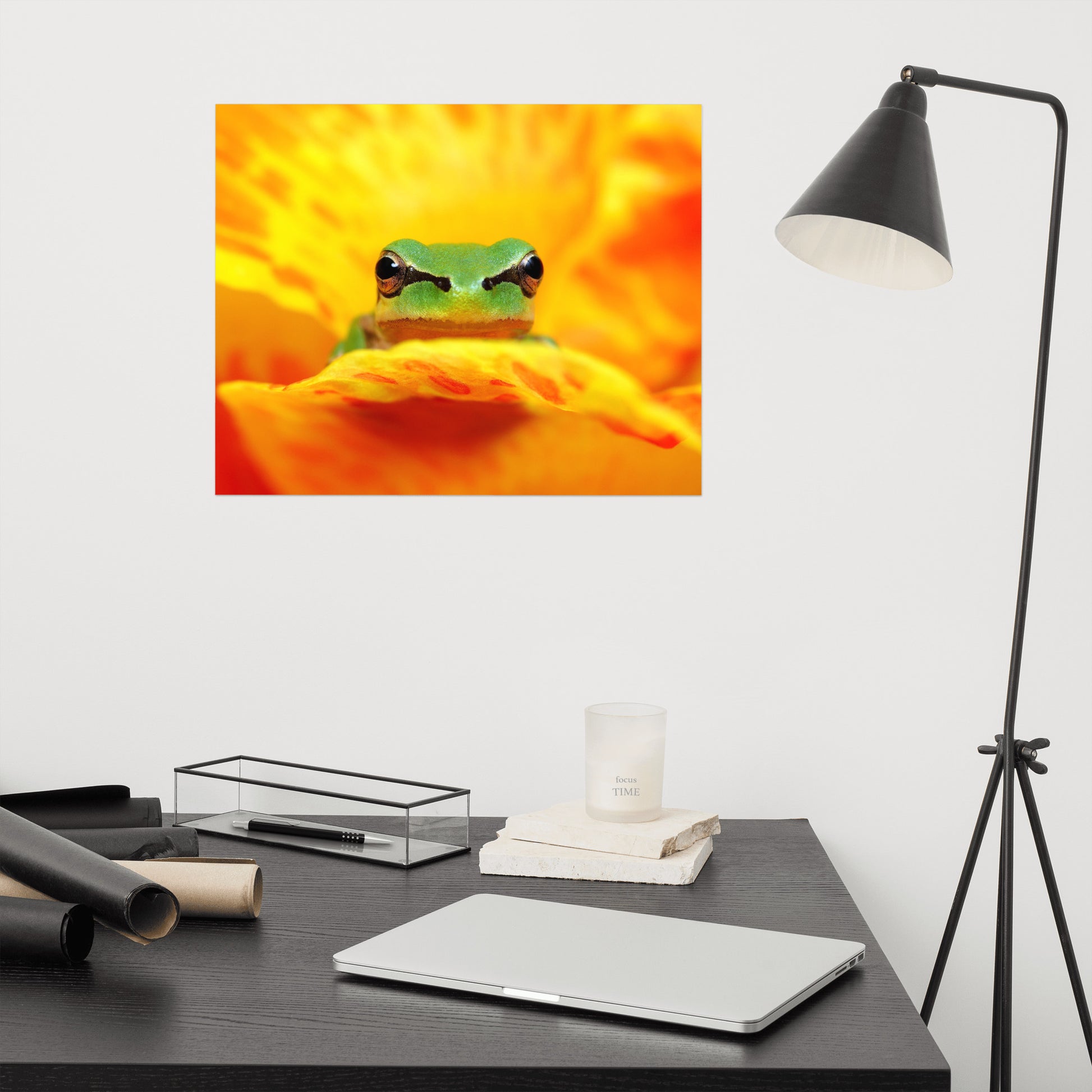 About this aesthetic flower poster: Immerse yourself in the vibrant beauty of nature with this high-quality photo print, showcasing a captivating close-up of a Hyla Tree Frog perched delicately on a radiant Iris flower. The vivid colors and intricate details of the frog's emerald skin and the flower's fiery petals are captured on premium photo paper, ready to transform your space with a touch of the wild. This loose print offers versatile display options, allowing you to effortlessly create a unique and personalized arrangement. Let the vibrant energy of this wildlife encounter infuse your home with a sense of wonder and appreciation for the natural world.