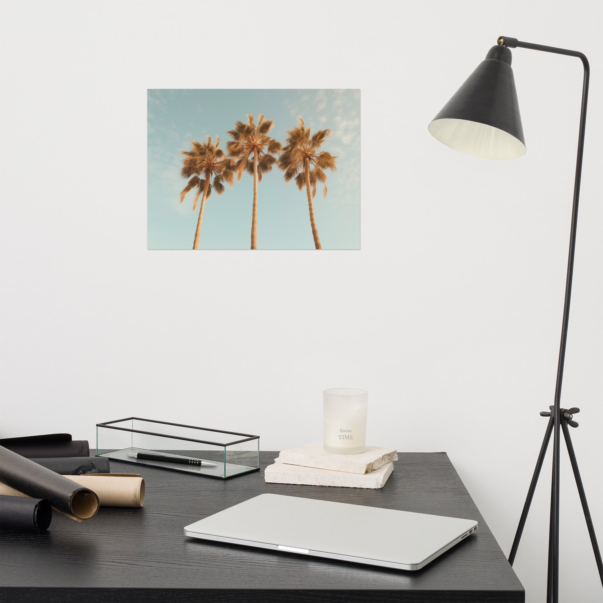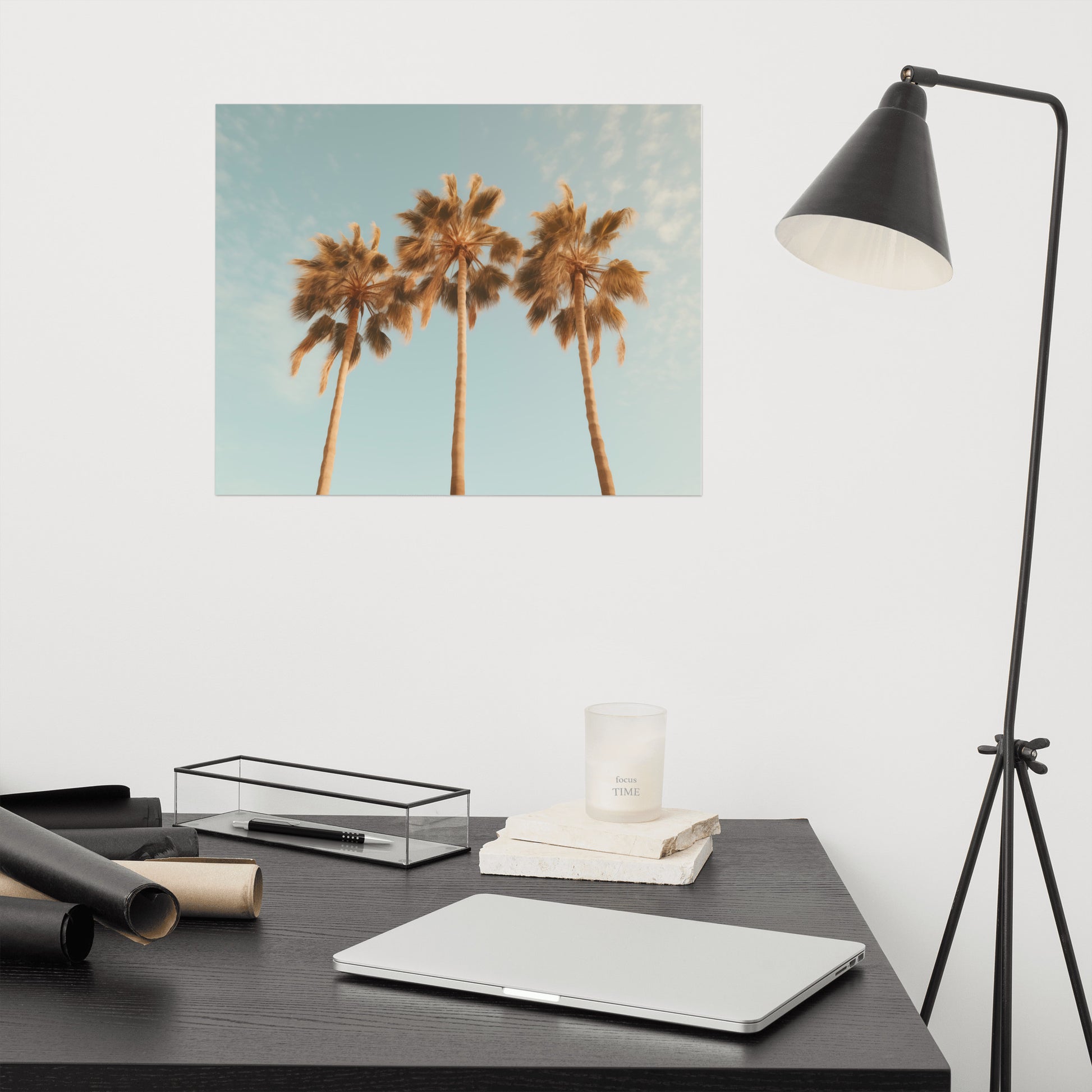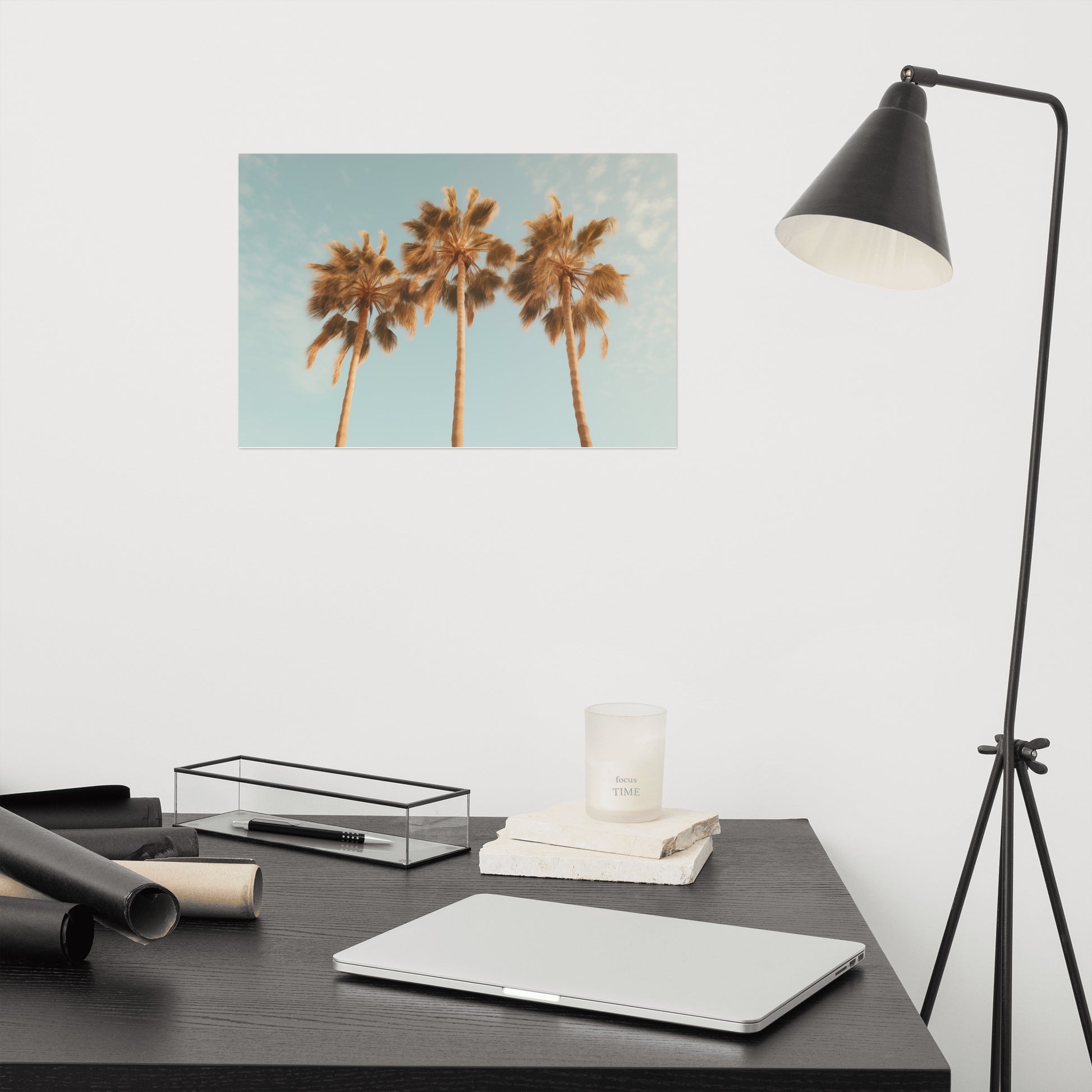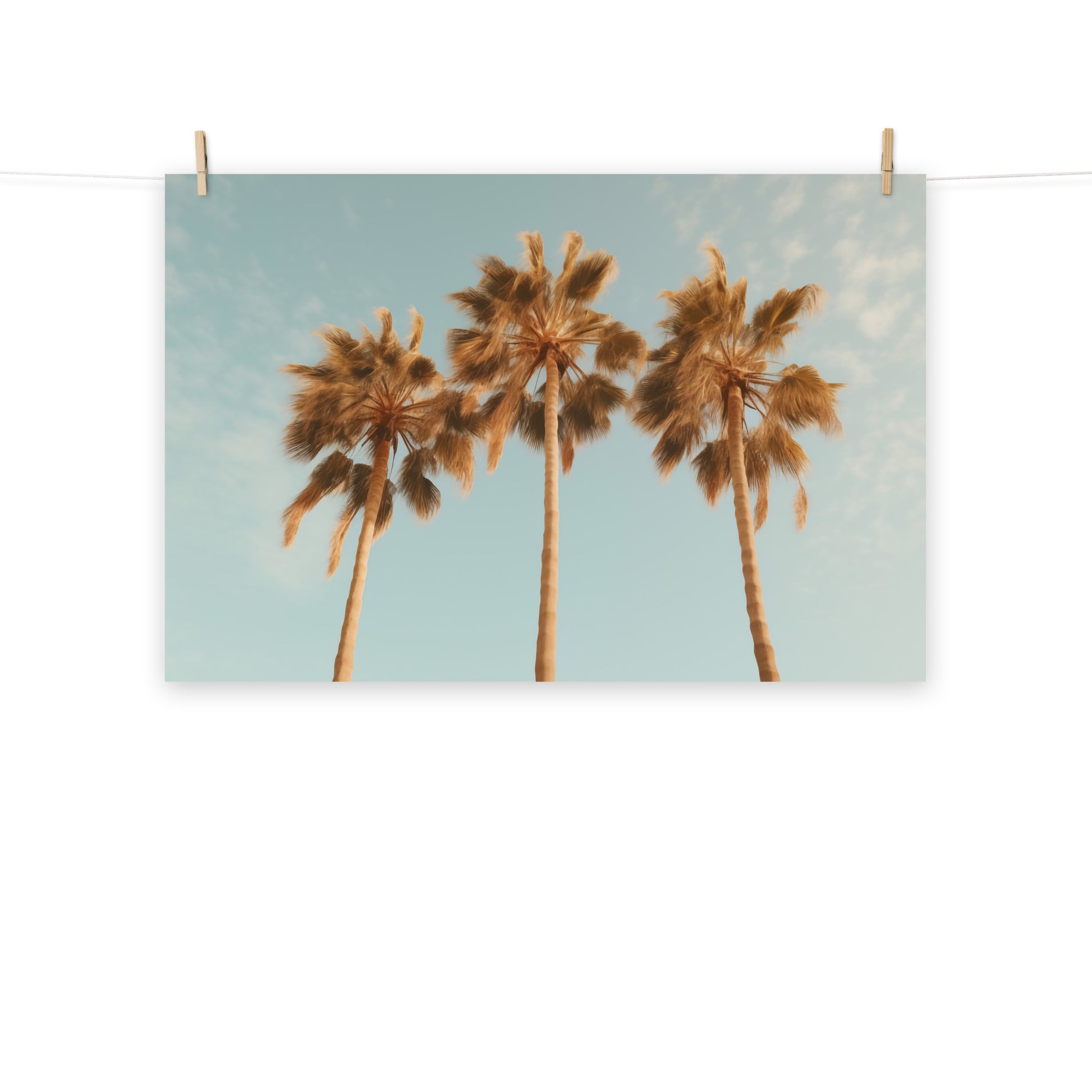 Escape to a tropical paradise with "Island Breeze," an artwork that captures the essence of a serene island getaway. This photorealistic print transports you to a sun-drenched oasis where three majestic palm trees stand tall against a clear blue sky. Their slender trunks and lush fronds sway gently in the breeze, creating a sense of tranquility and relaxation. The warm tones and vibrant colors evoke the feeling of a perfect island escape, inviting you to unwind and embrace the beauty of nature. Printed on high-quality photo paper with premium inks, "Island Breeze" brings the serenity and tropical charm of an island paradise into your home.