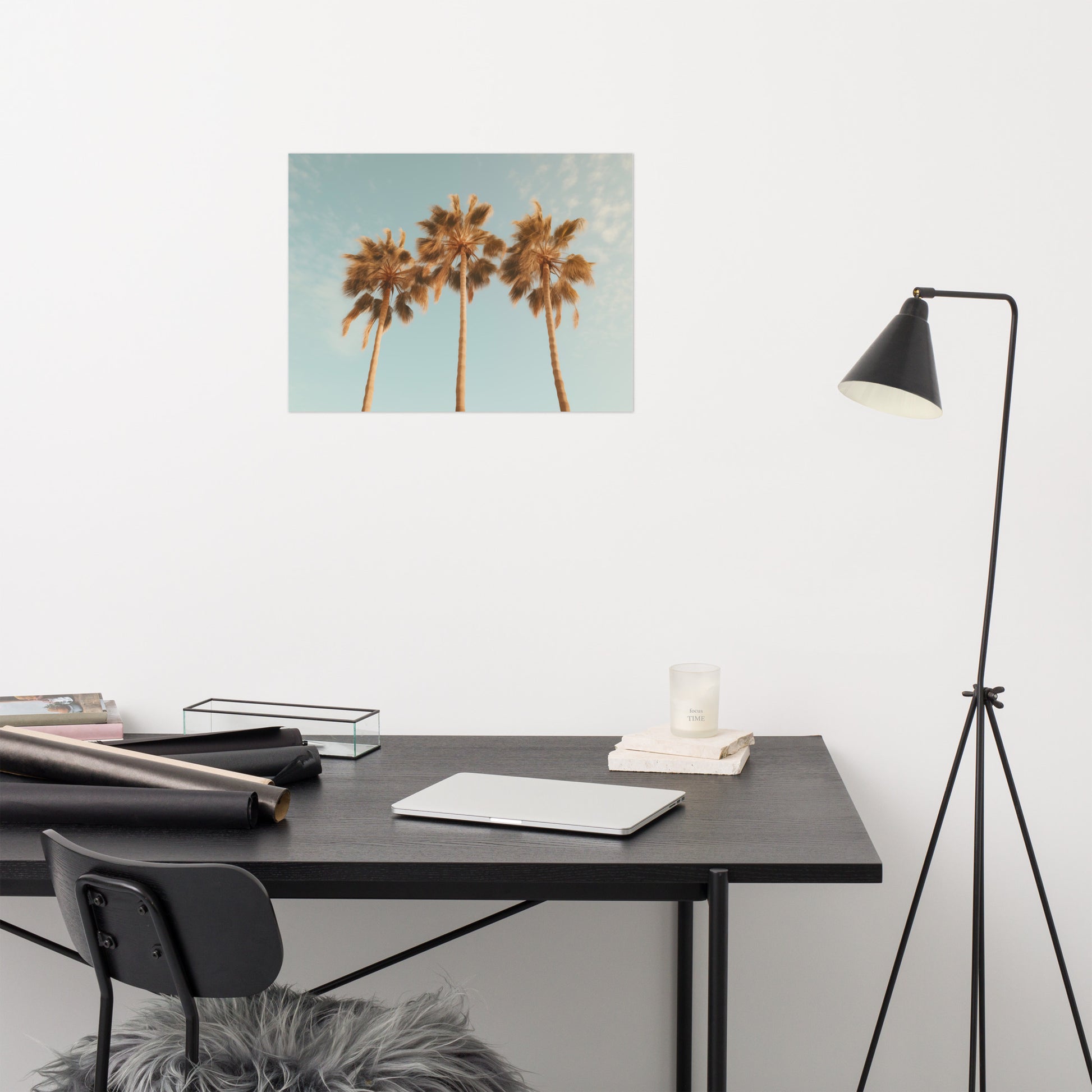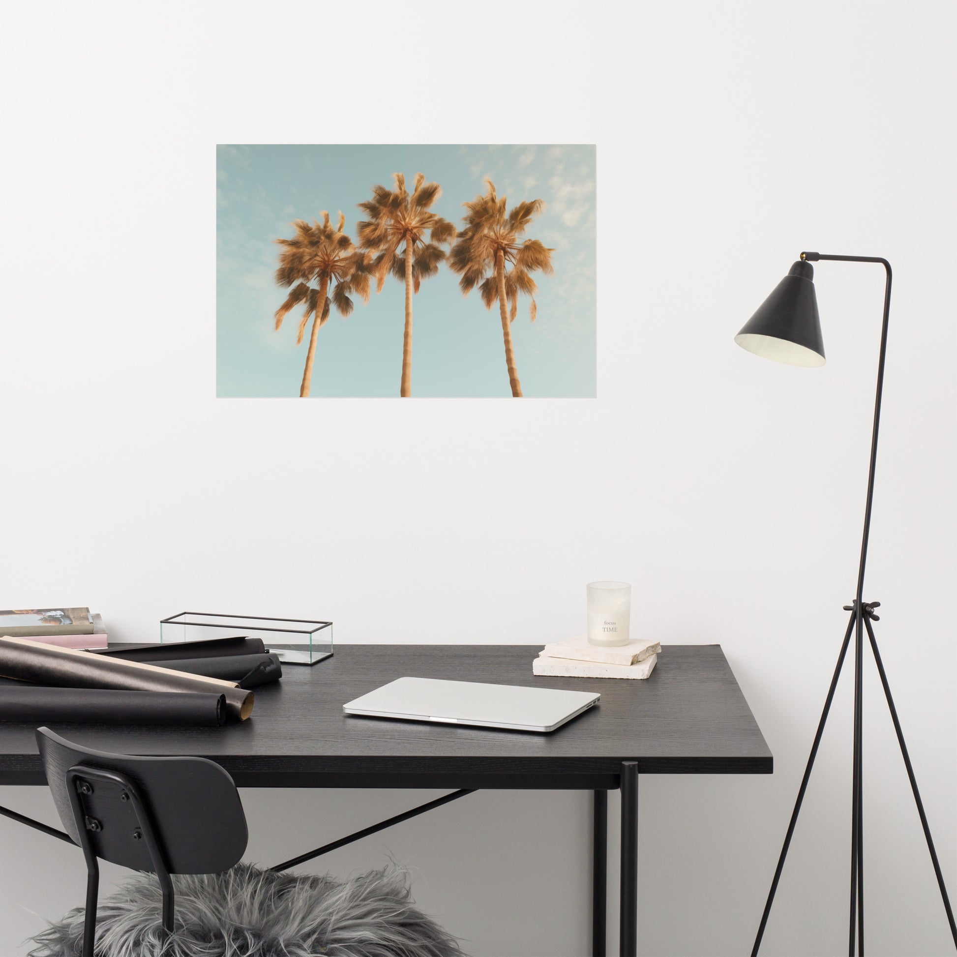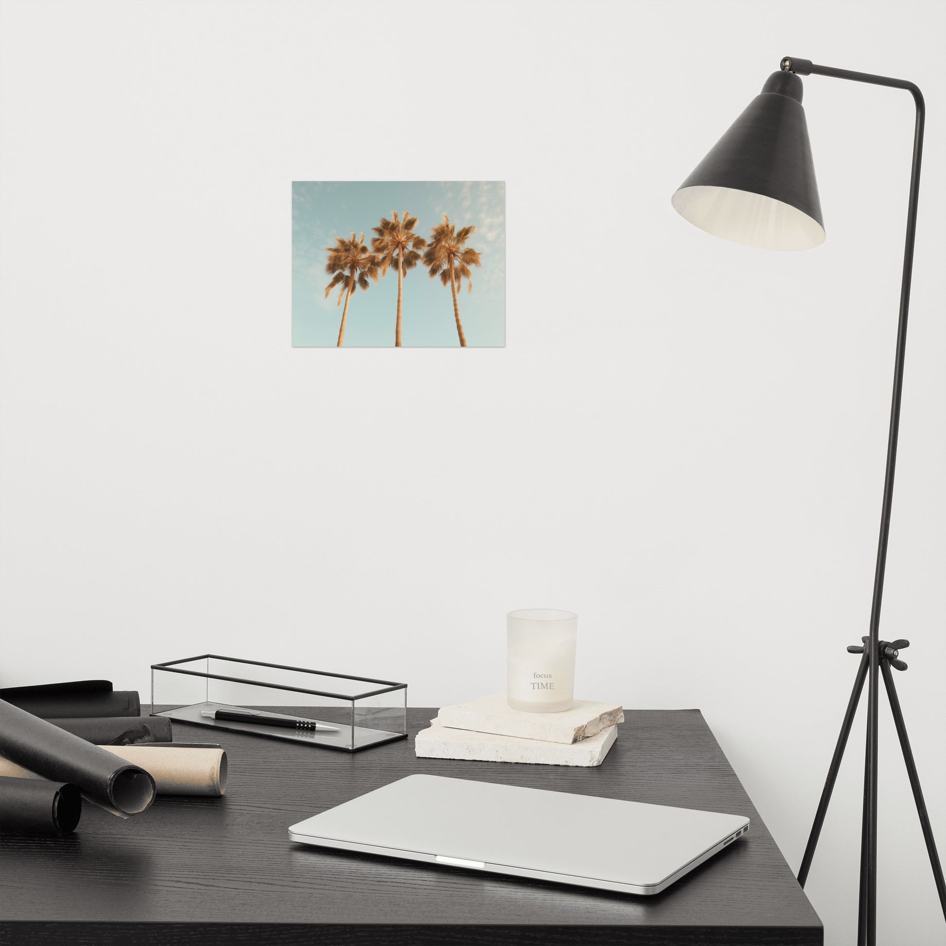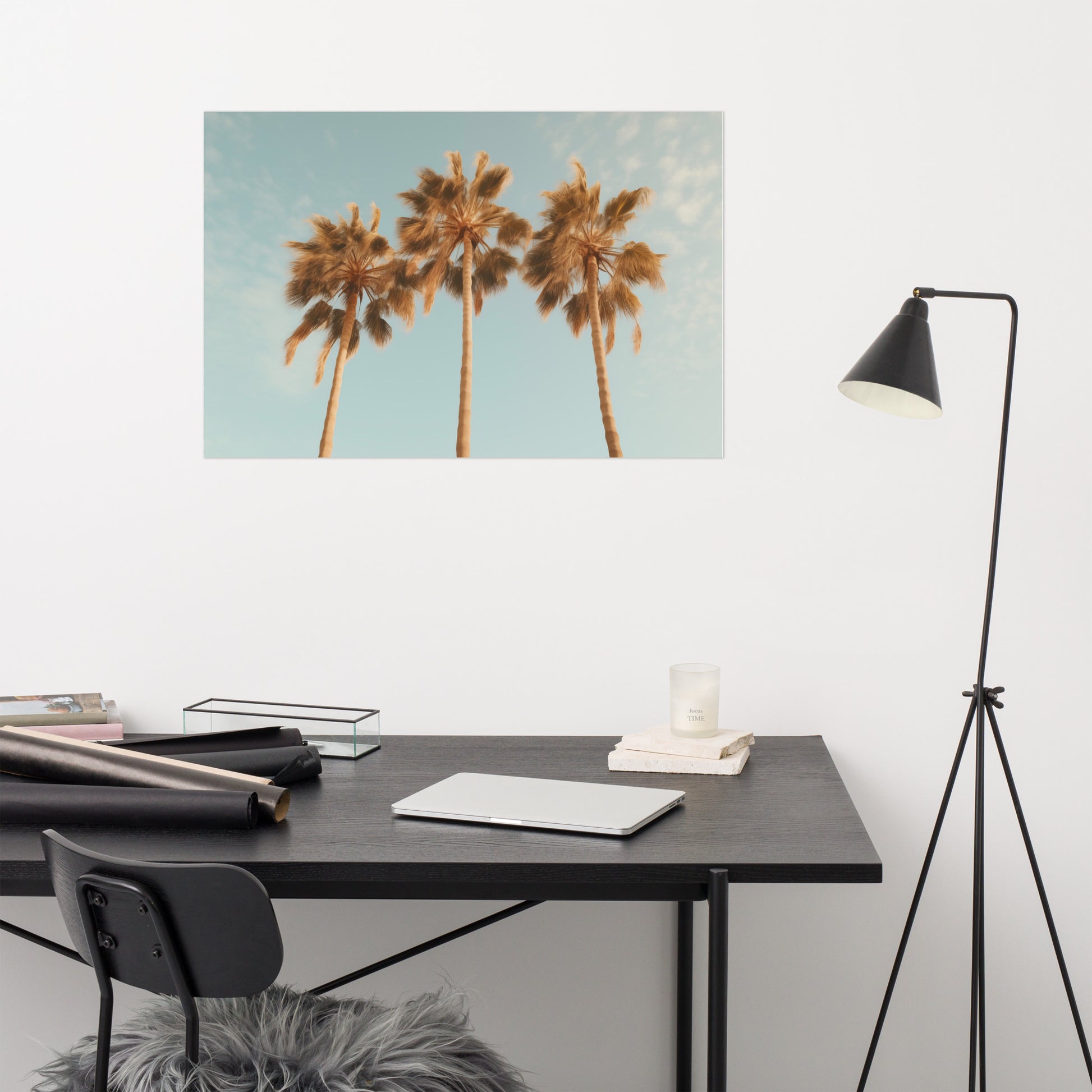 Escape to a tropical paradise with "Island Breeze," an artwork that captures the essence of a serene island getaway. This photorealistic print transports you to a sun-drenched oasis where three majestic palm trees stand tall against a clear blue sky. Their slender trunks and lush fronds sway gently in the breeze, creating a sense of tranquility and relaxation. The warm tones and vibrant colors evoke the feeling of a perfect island escape, inviting you to unwind and embrace the beauty of nature. Printed on high-quality photo paper with premium inks, "Island Breeze" brings the serenity and tropical charm of an island paradise into your home.