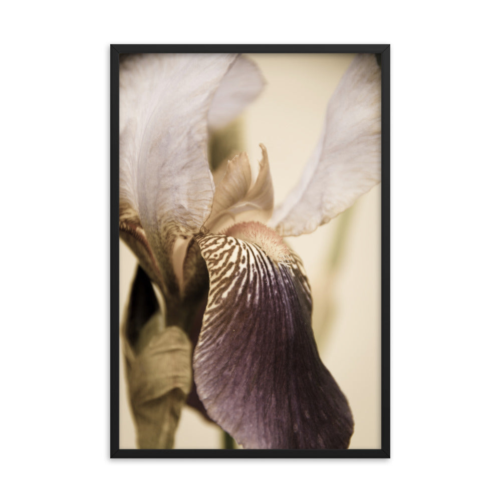 About this framed flower wall art: Capture the timeless beauty of Japanese Iris with this stunning framed wall art print. This vintage-inspired photograph showcases a single Iris flower in full bloom, its delicate petals unfurling to reveal a vibrant purple and white color palette. The flower's stamen are a bright yellow, adding a touch of contrast, while the background is a soft, aged paper texture.
