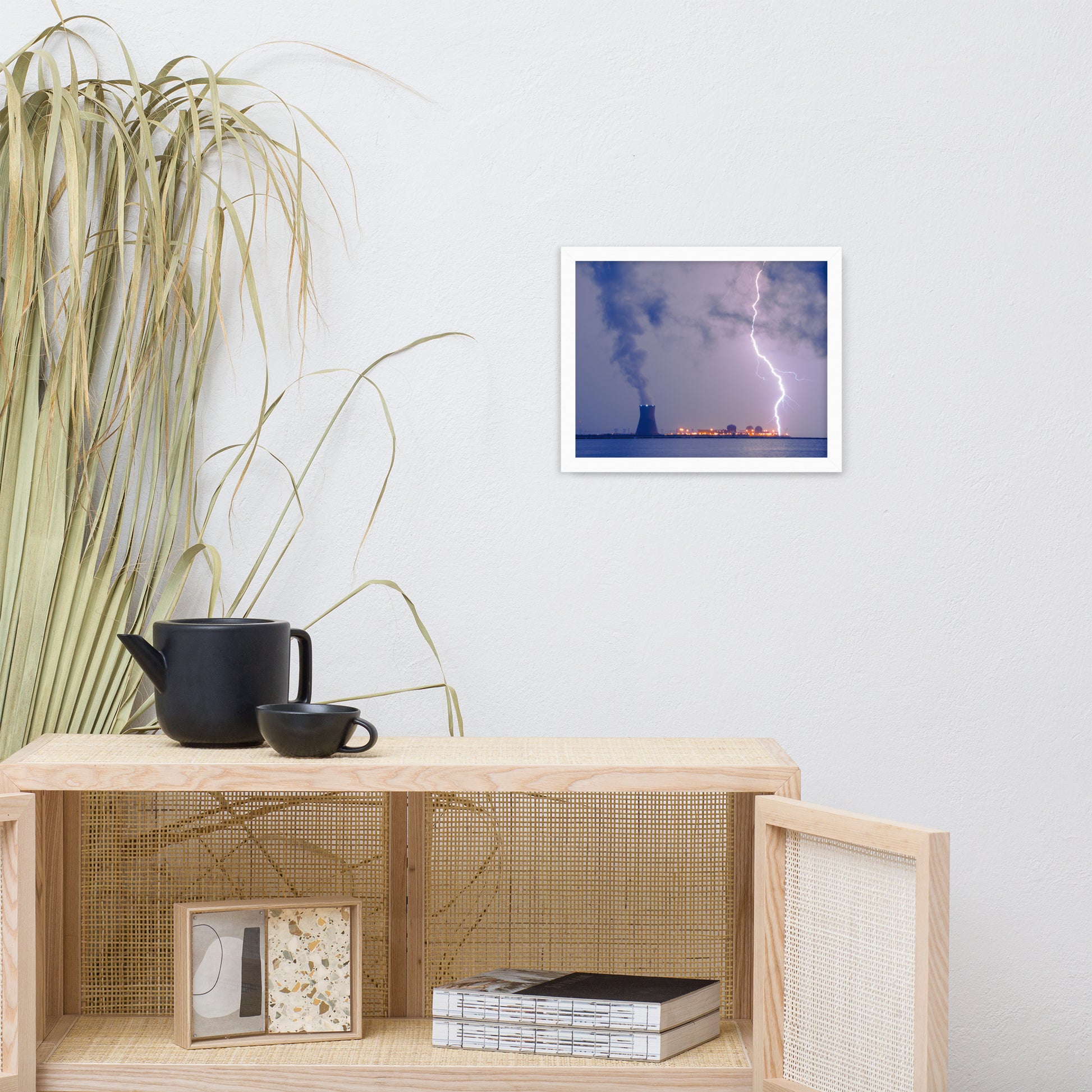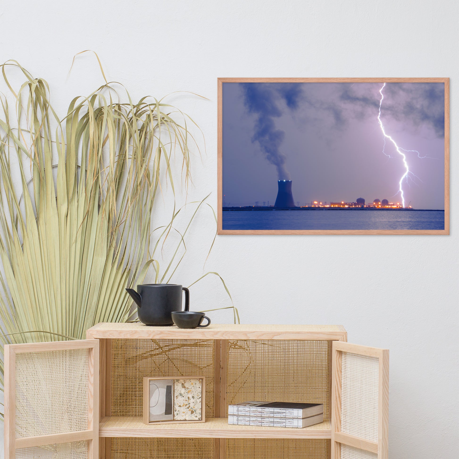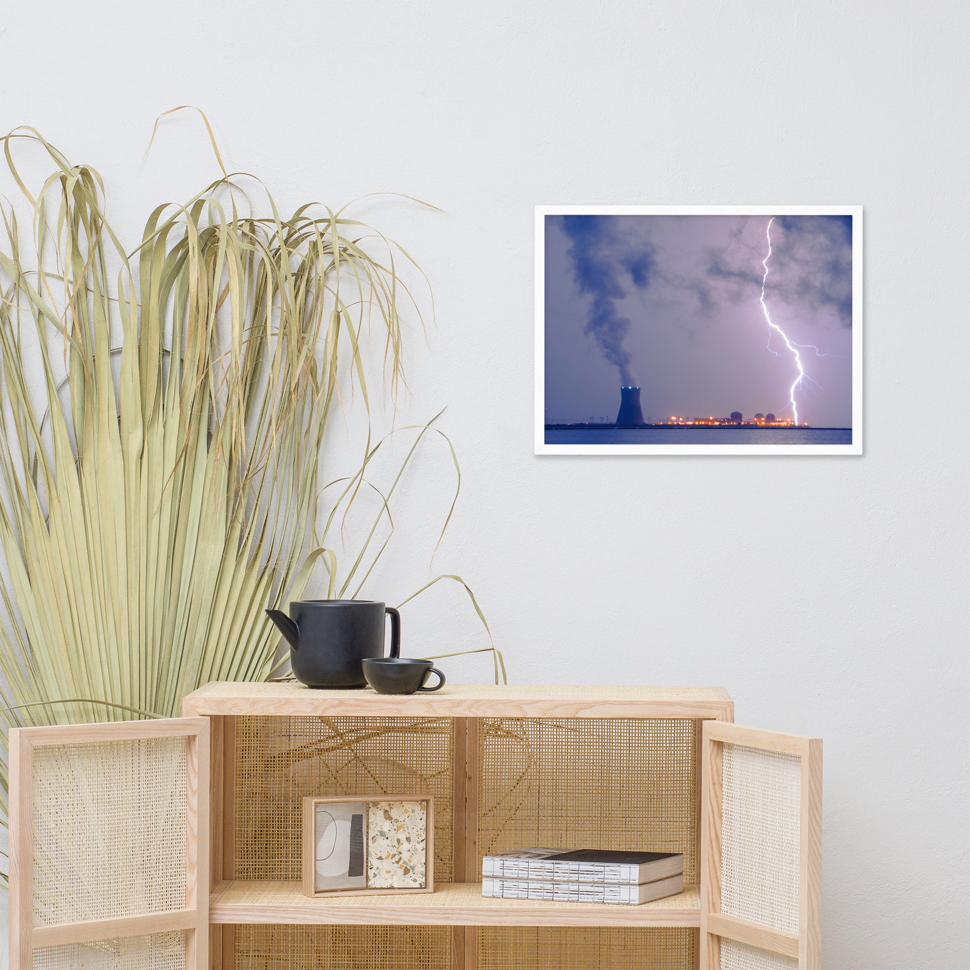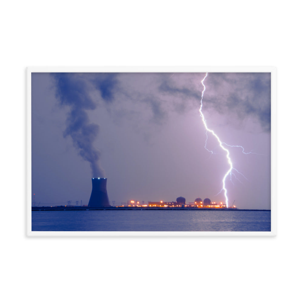 About this architectural art photography print: Capture the raw energy and captivating contrast between man-made structures and the untamed power of nature with this stunning framed print. "Lightning and Salem Power Plant 2" showcases a dramatic lightning bolt illuminating the night sky over the Salem Nuclear Power Plant, creating a breathtaking scene of power and beauty.