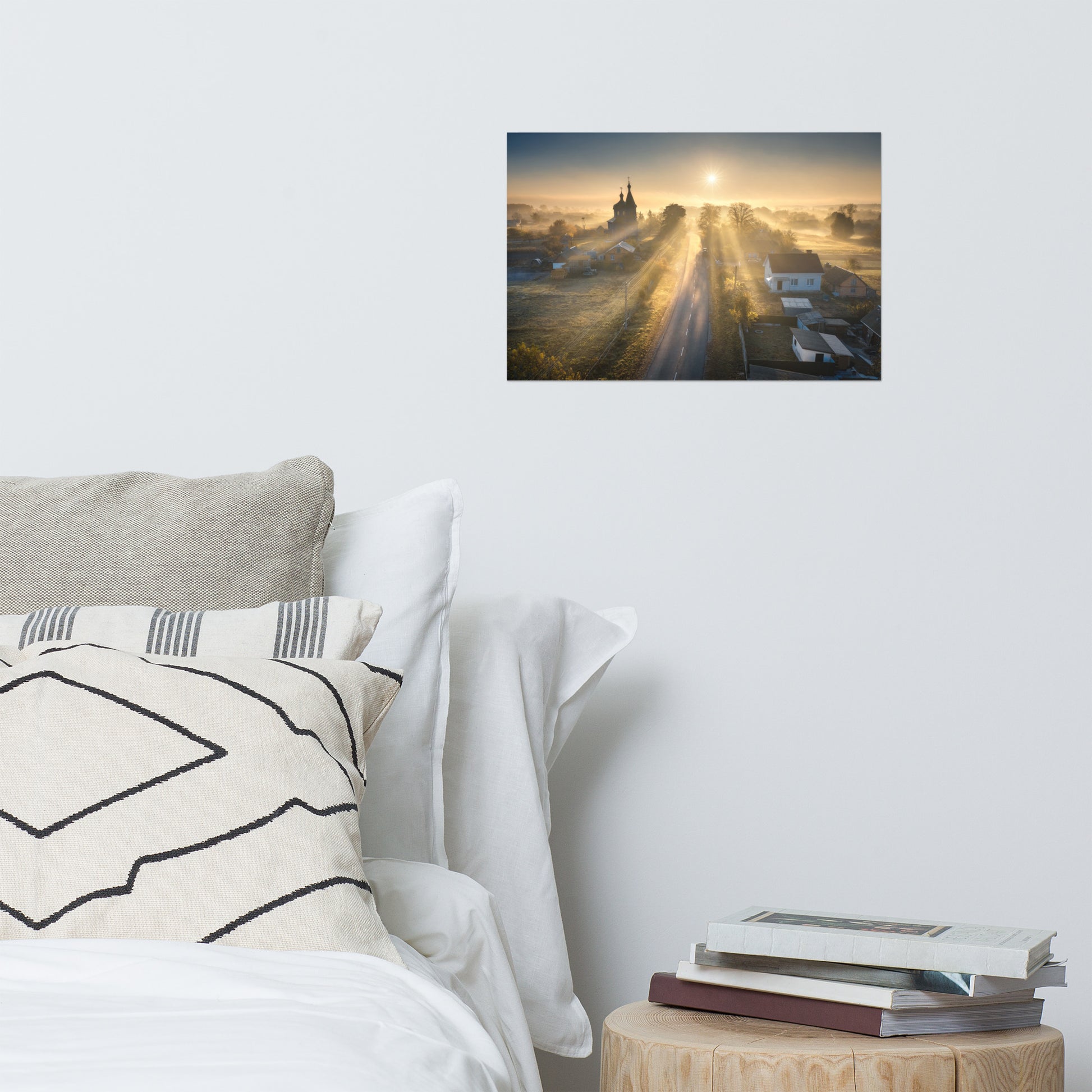 About this farmhouse style artwork: Capture the essence of fall's rural beauty with this stunning aerial art print. A winding road meanders through a quaint small town shrouded in a light fog, leading the eye to a breathtaking golden sky ablaze with the warm hues of the setting sun. This unframed print is perfect for adding a touch of rustic charm to any room.