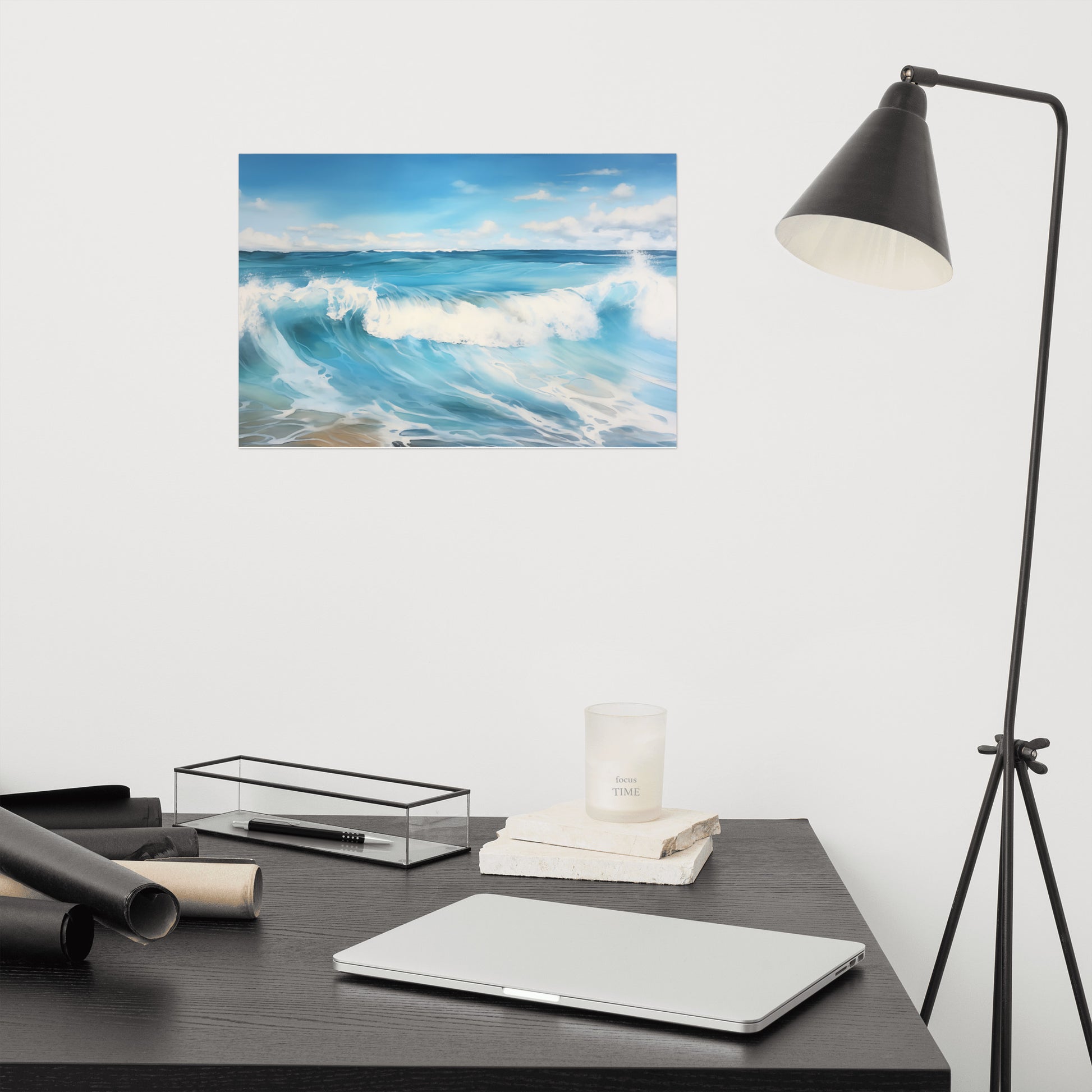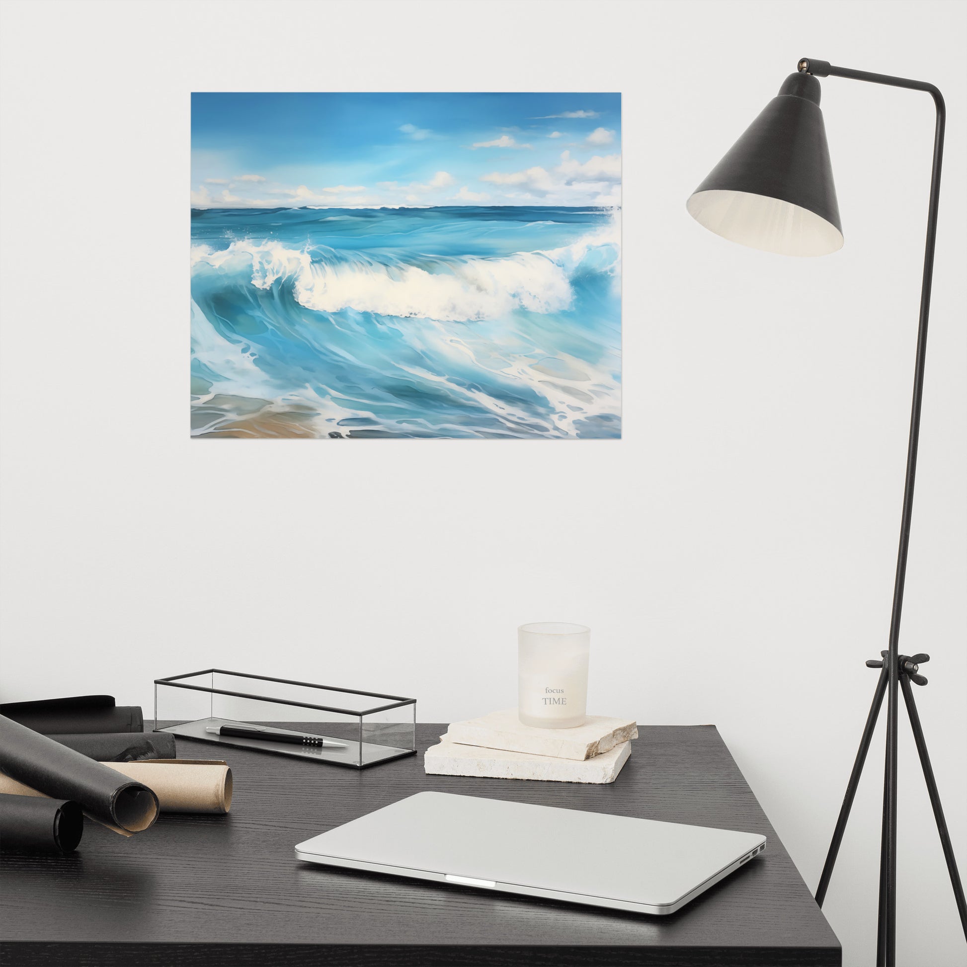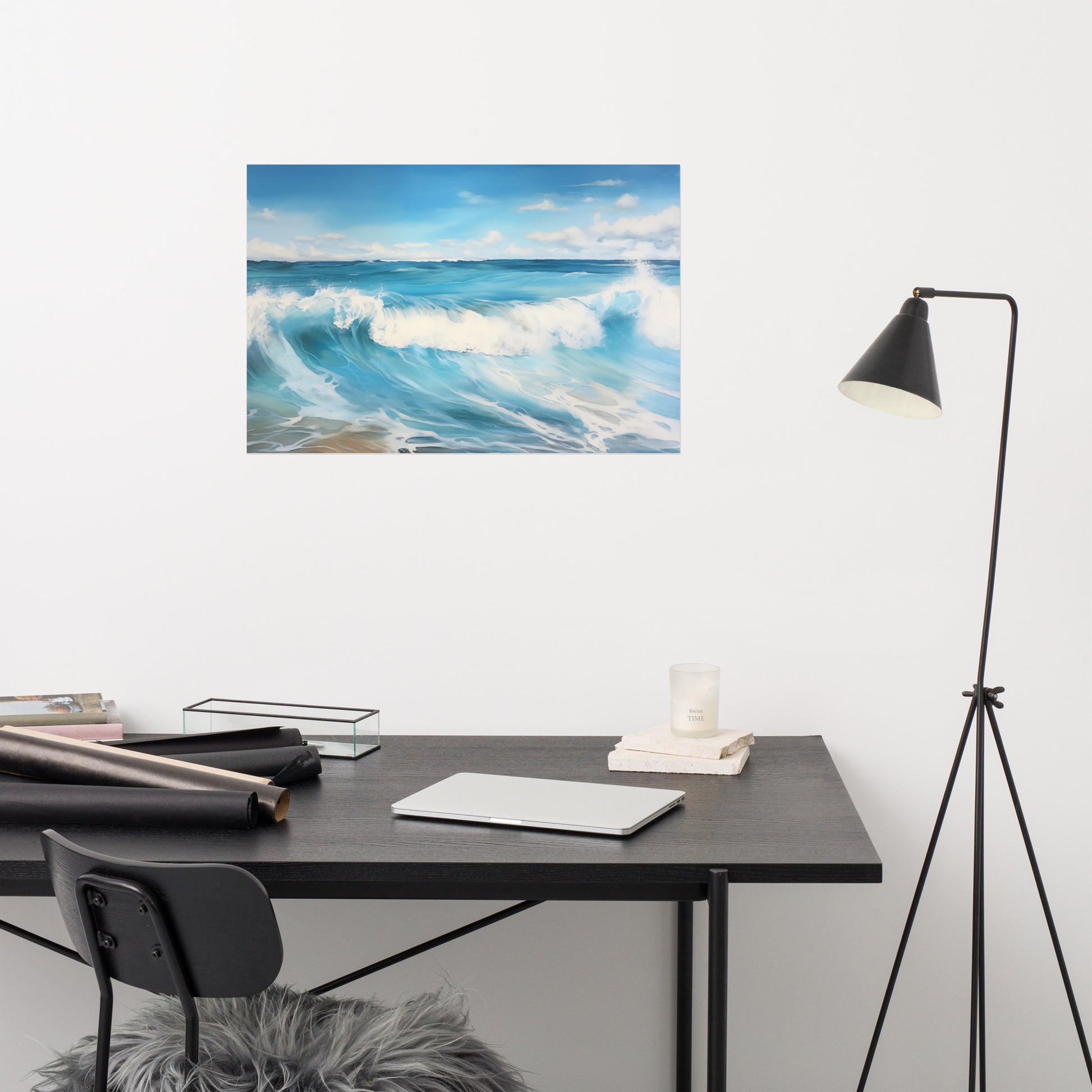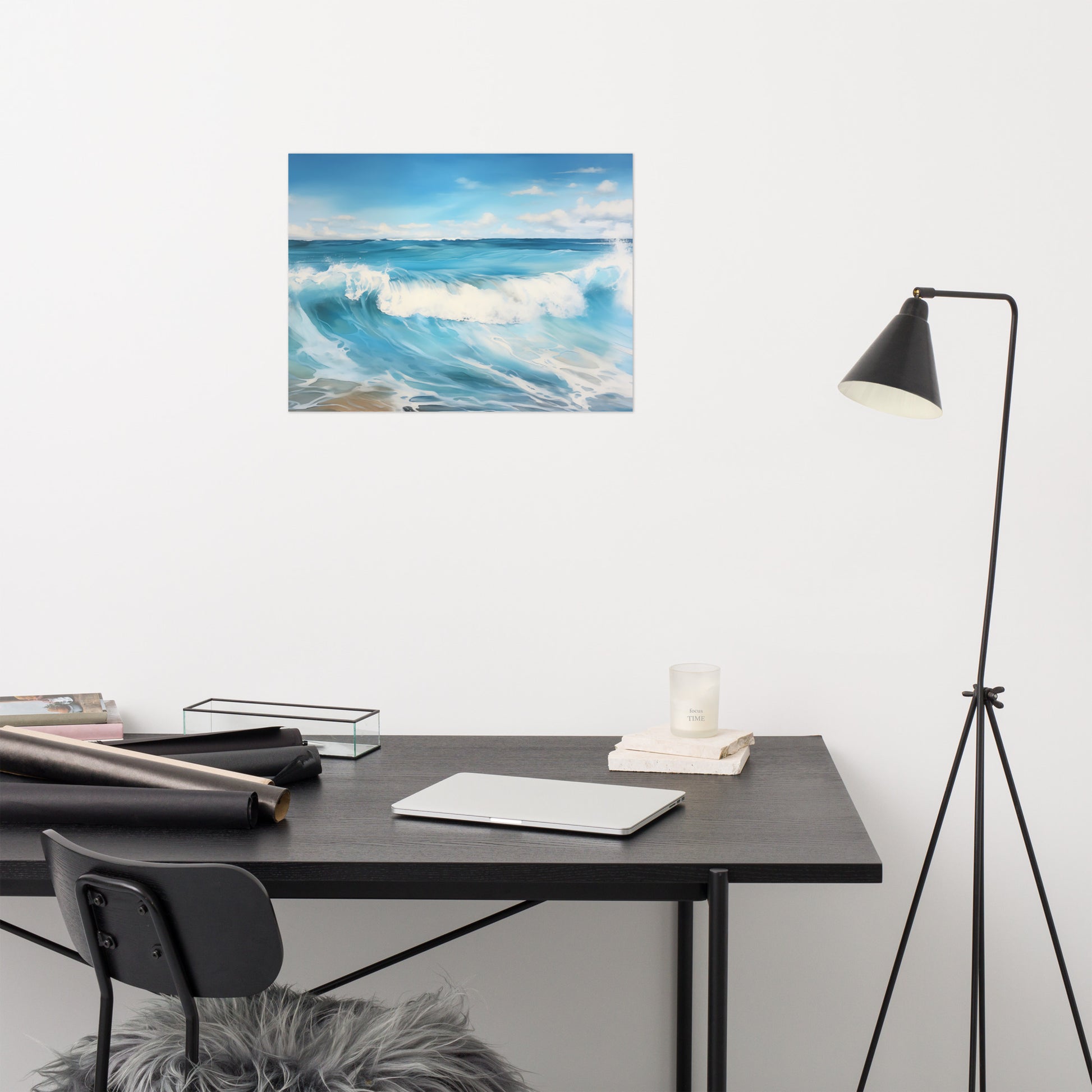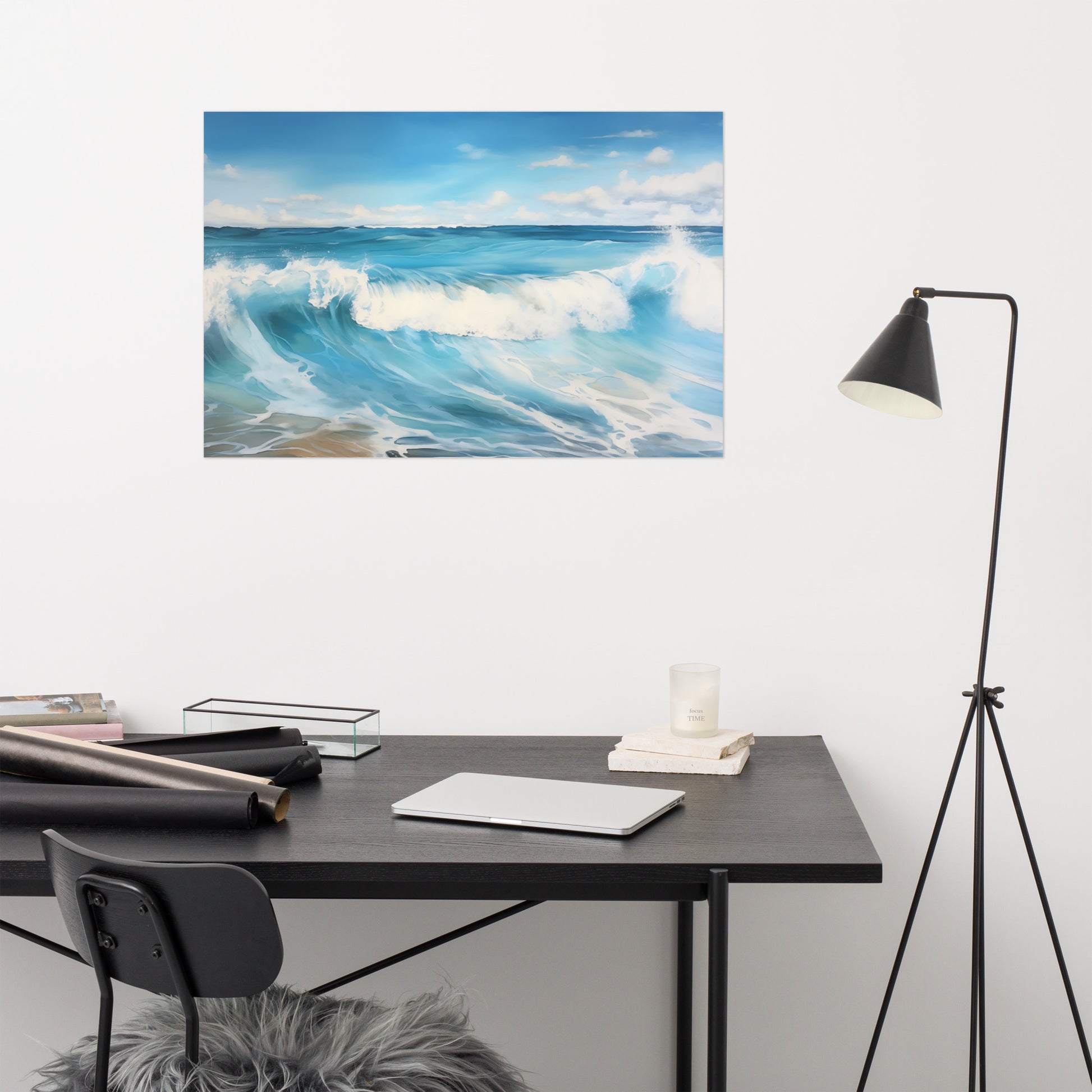 "Ocean's Embrace" captures the raw power and mesmerizing beauty of the sea in motion. This dynamic digital artwork showcases a powerful wave, its cresting form captured in stunning detail as it surges towards the shore. The vibrant hues of blue and turquoise blend seamlessly with the frothy white of the breaking wave, creating a sense of depth and movement. The artist's masterful use of light and shadow adds a dramatic touch, highlighting the wave's curves and textures. Printed on high-quality photo paper with premium inks, this unframed print preserves the rich details and vibrant colors of the ocean, bringing the energy and serenity of the sea into your home.