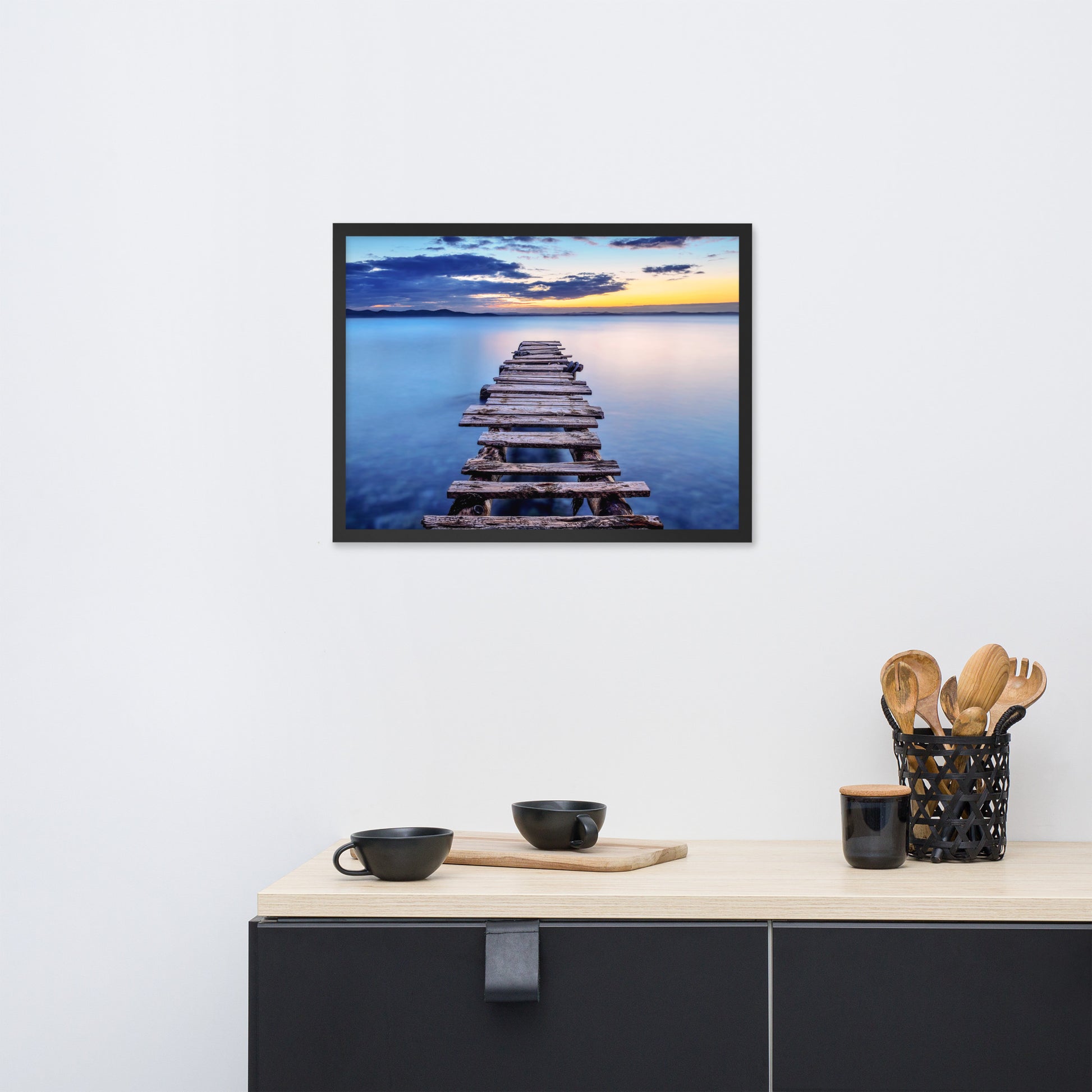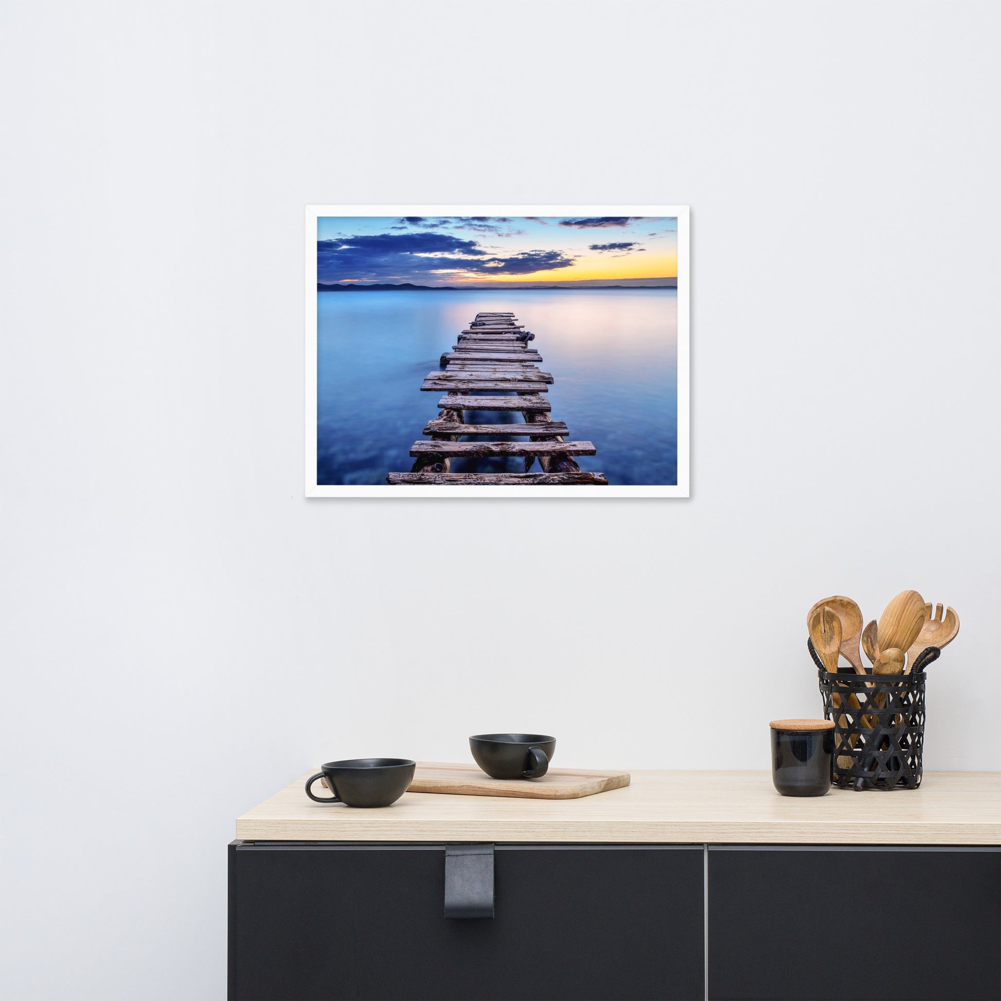 Old Weathered Lake Pier at Sunset Framed Wall Art Print