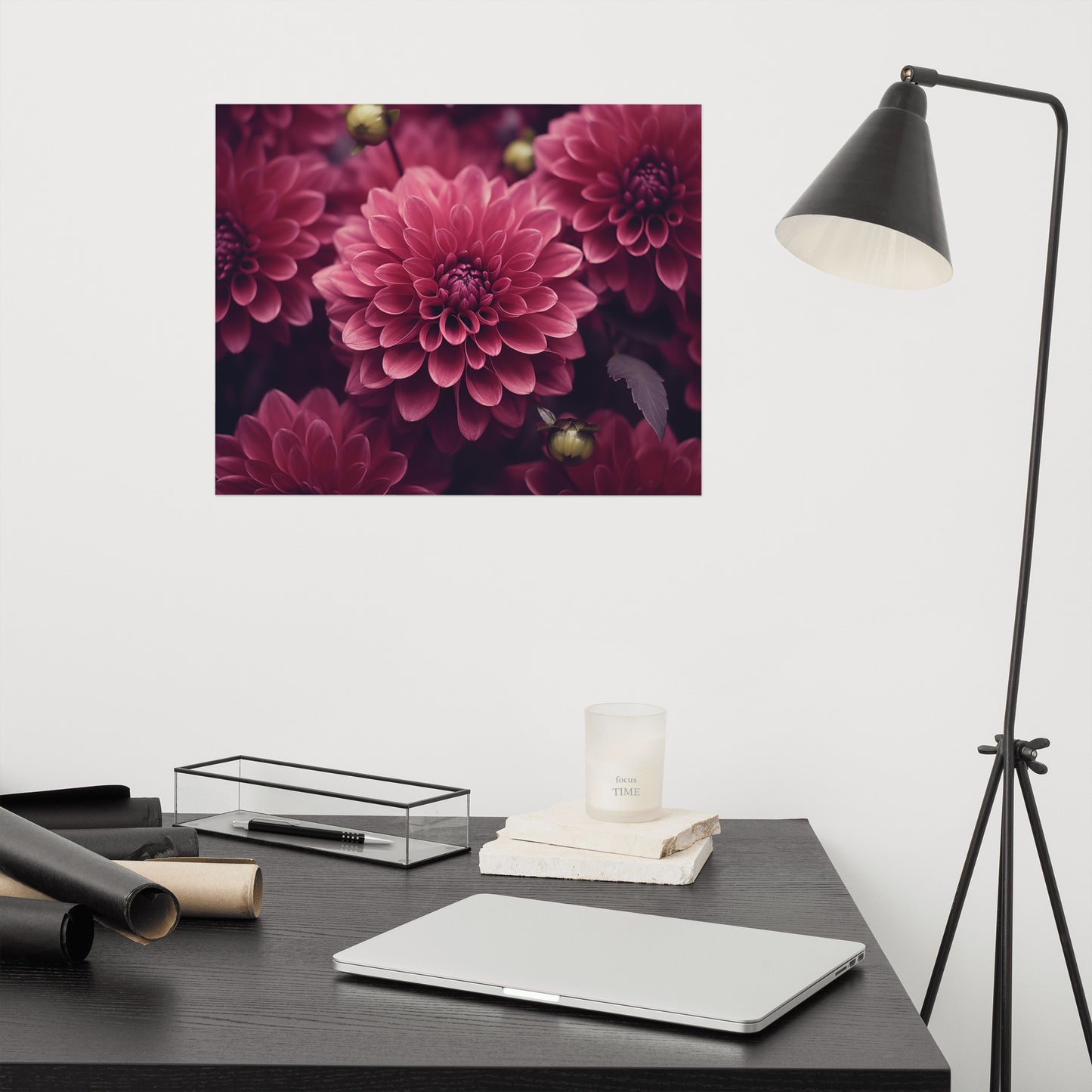 About this wall painting with flowers: Immerse yourself in the intricate beauty of nature with "Delicate Details." This stunning close-up captures the essence of a vibrant dahlia, showcasing the mesmerizing layers of petals that unfurl like a captivating secret. The rich, deep hues of magenta and burgundy create a sense of warmth and sophistication, inviting you to lose yourself in the delicate details of each petal and bud.