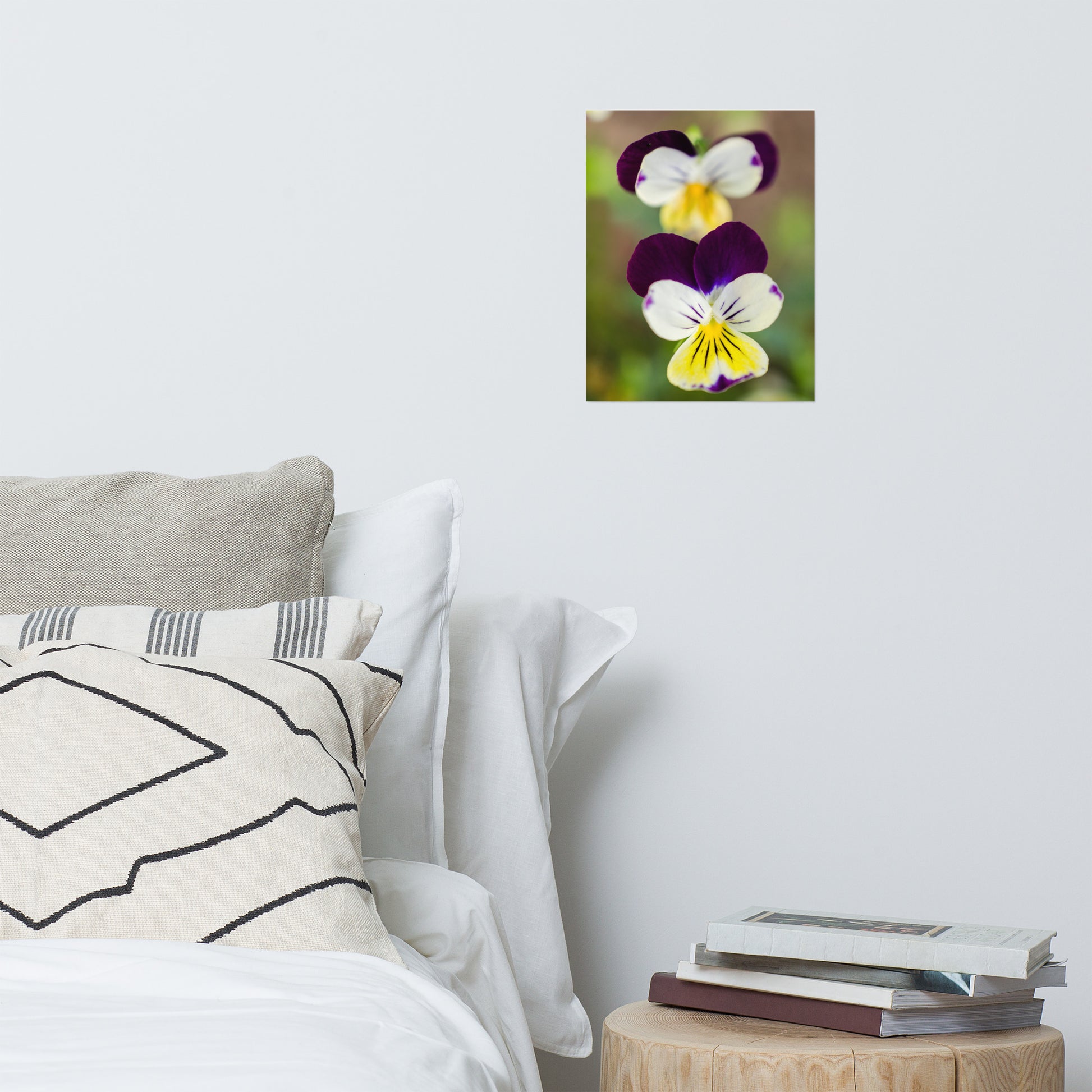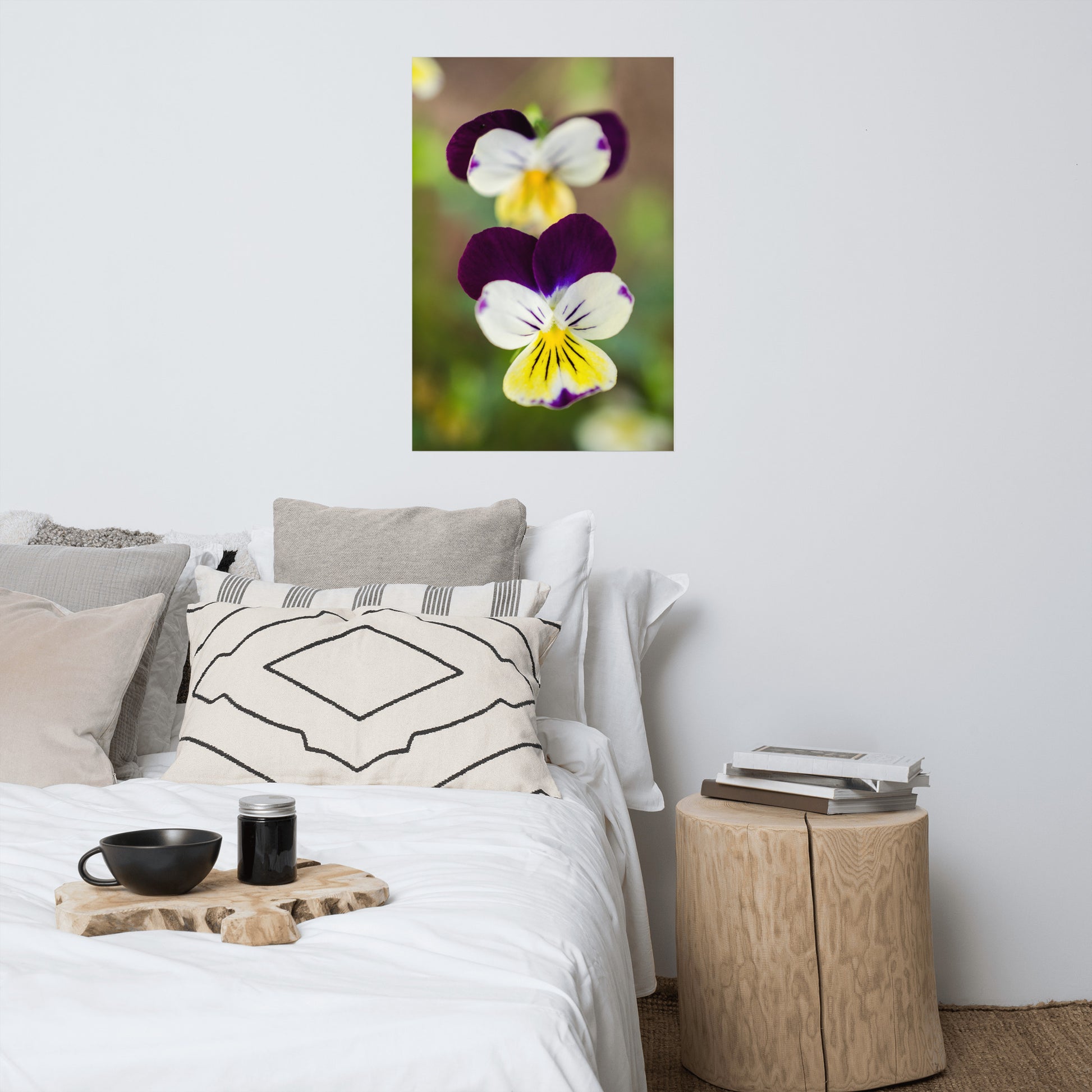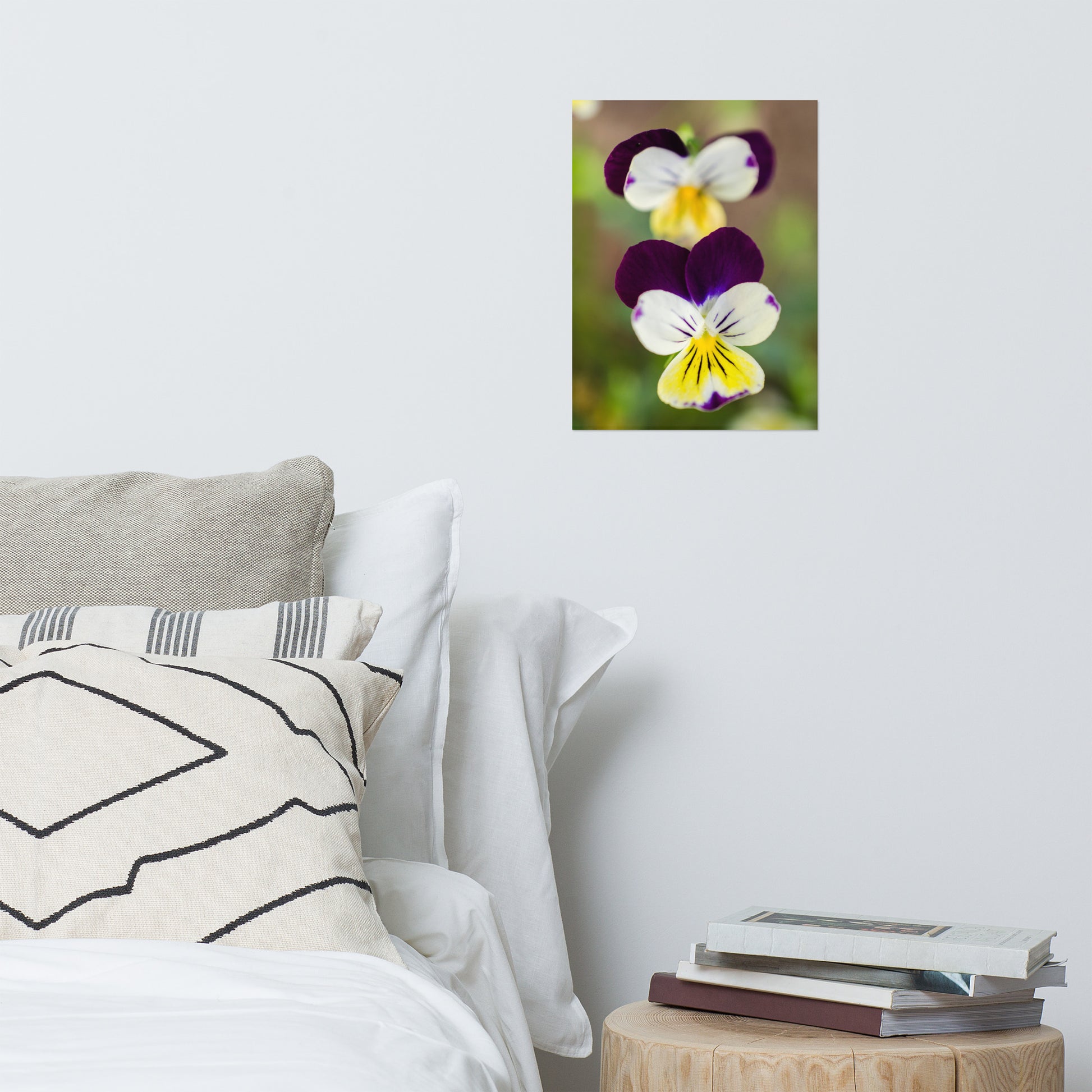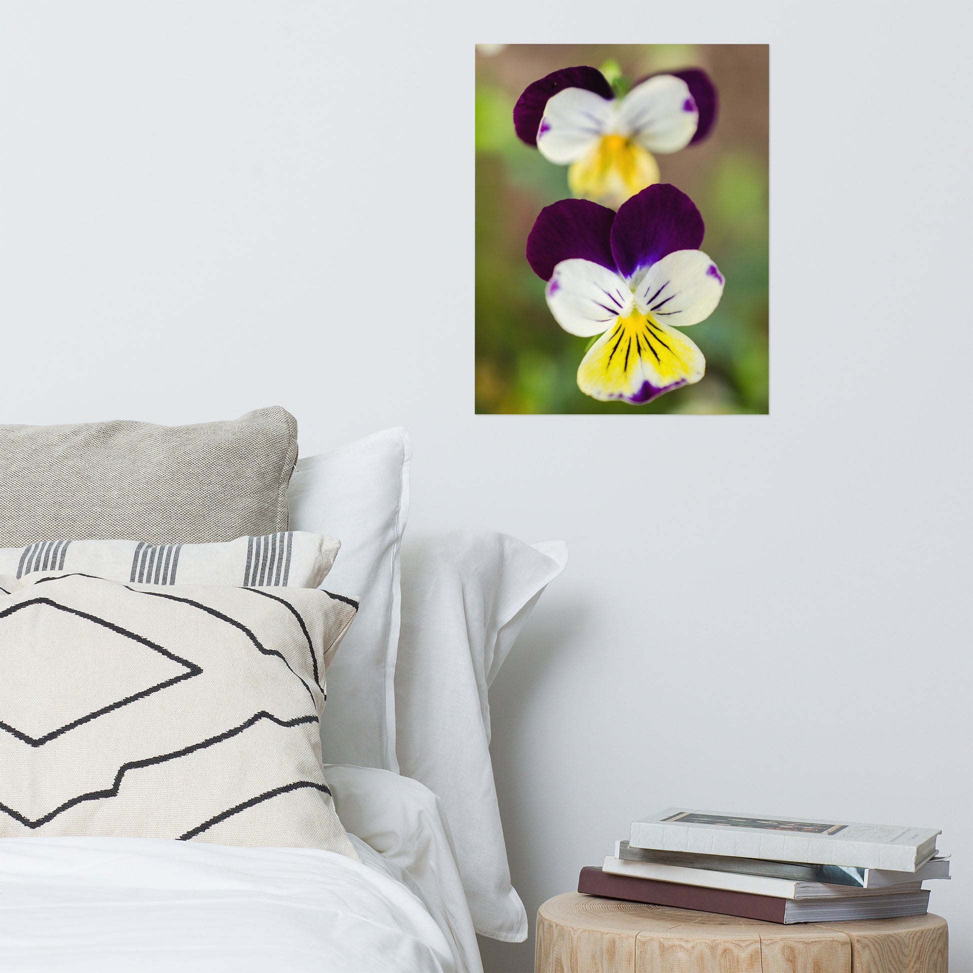 About this flower print wall art: "Pretty Little Violets" captures the delicate beauty of two small purple, white, and yellow Violet blossoms in full bloom. This soft focus nature photograph showcases the peaceful serenity of these tiny flowers thriving in the dappled shade of a garden, making it a perfect addition to any space seeking a touch of natural charm and elegance.