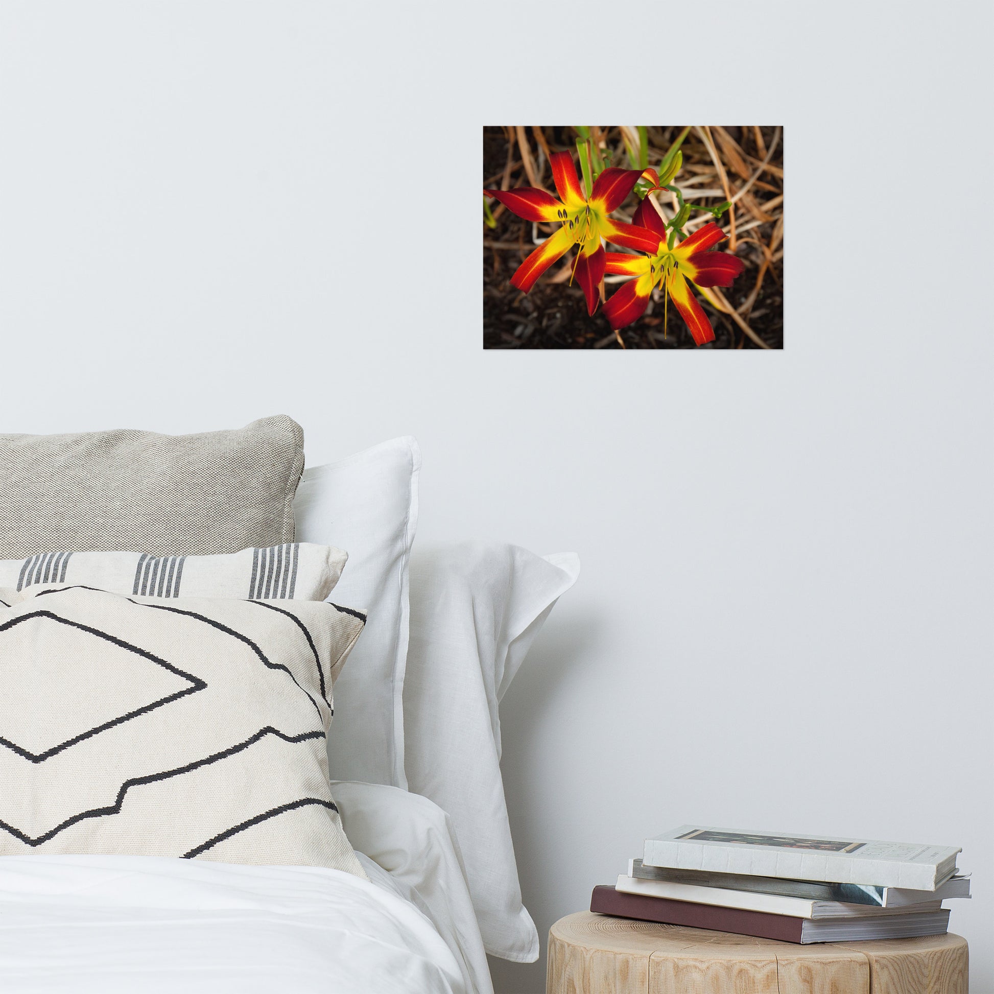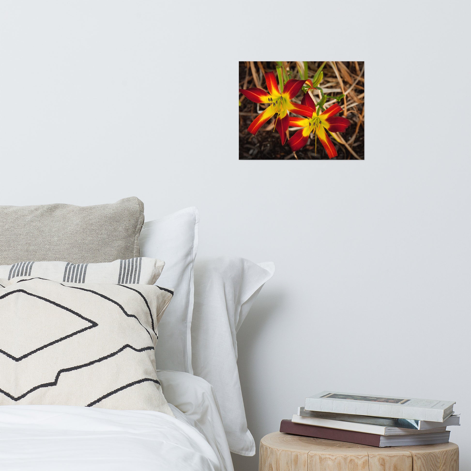About these modern floral art prints: Capture the striking beauty of nature with "Royal Sunset Lilies," a captivating nature photograph showcasing two vibrant red and yellow lilies in full bloom. Set against a dramatic dark background accented by wilted leaves, this print emphasizes the stark contrast between the flowers' warm, bold colors and the muted tones of the surrounding soil and foliage. A stunning addition to any space, this unframed art print invites you to bring the captivating allure of nature into your home.