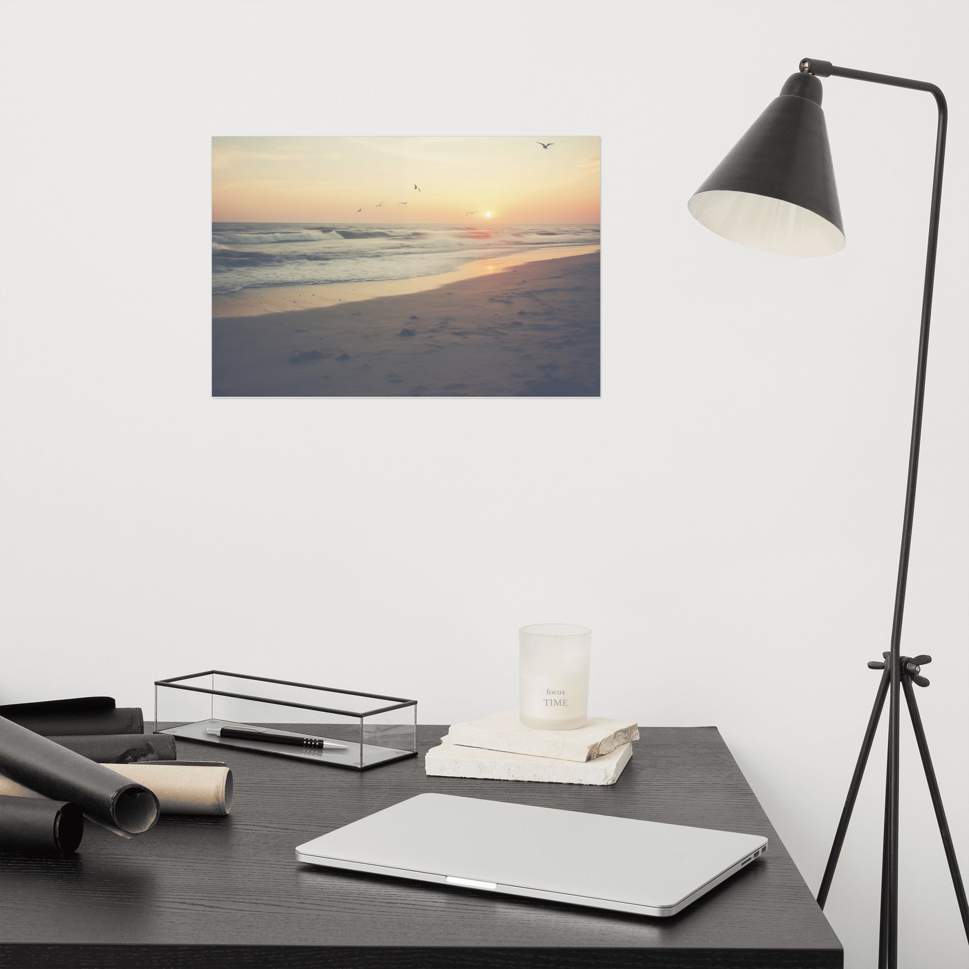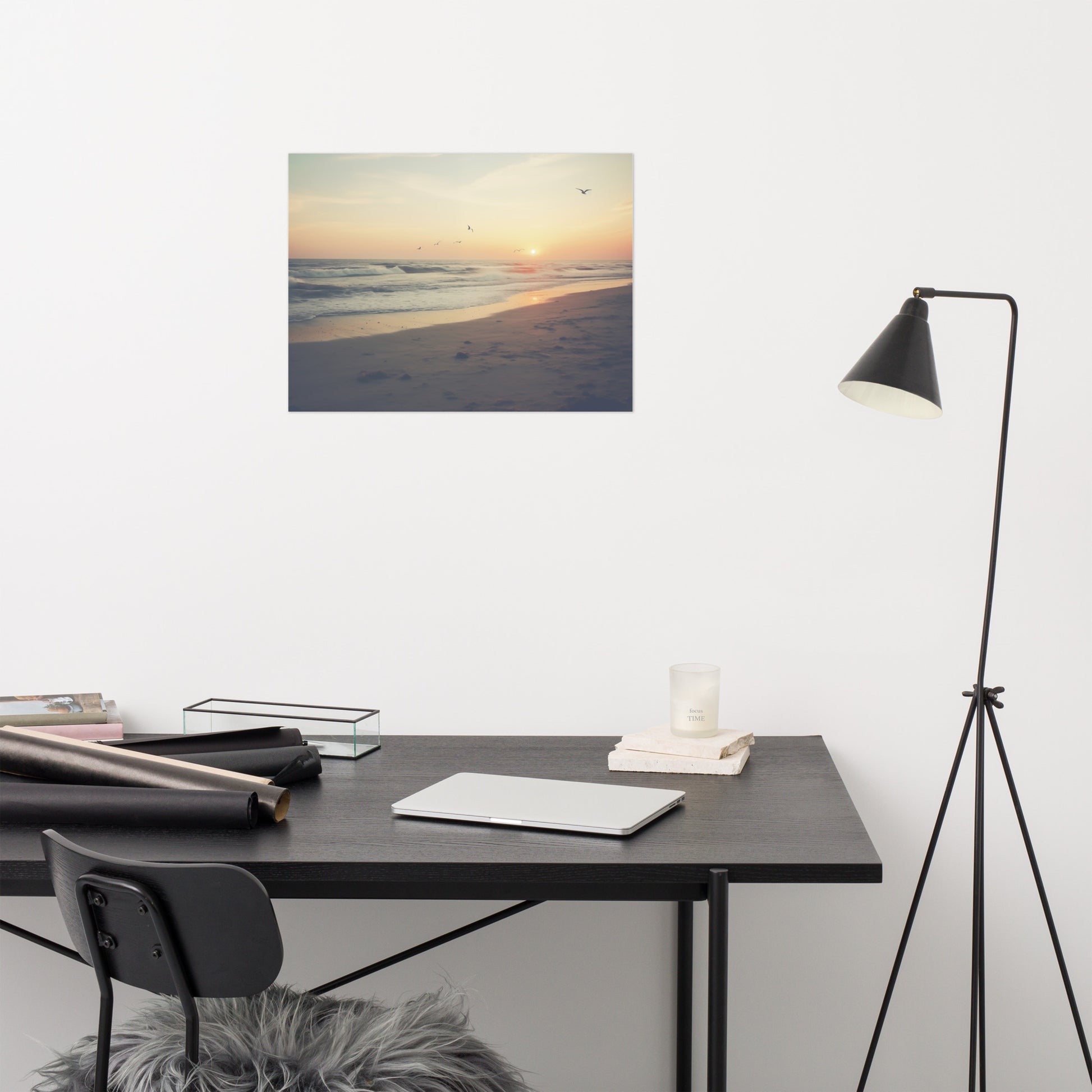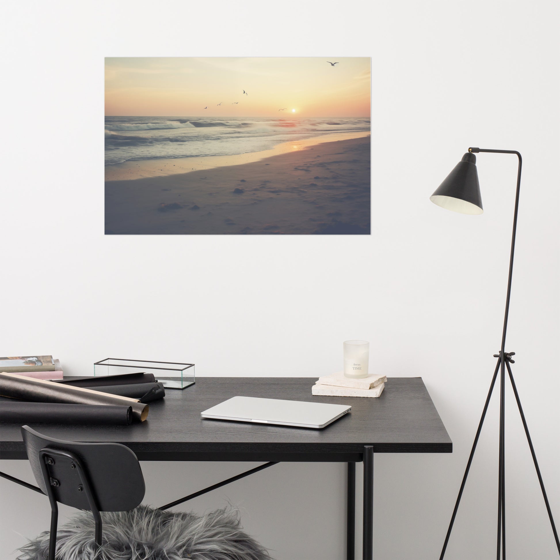 This artwork would be a great addition to various interior design styles, especially those that focus on creating a relaxing and calming atmosphere. Its soft colors and serene subject matter make it suitable for coastal or beach-themed rooms, where it can complement the natural elements of the space. The tranquil scene also works well in minimalist or Scandinavian-inspired interiors, adding a subtle touch of natural beauty without overwhelming the clean lines and simple aesthetic. Furthermore, its calming effect makes it appropriate for bedrooms or meditation spaces within a Zen or transitional design, promoting a sense of peace and tranquility. The photorealistic style allows it to blend seamlessly into both traditional and modern settings, offering a versatile piece that can enhance a variety of decorating schemes.