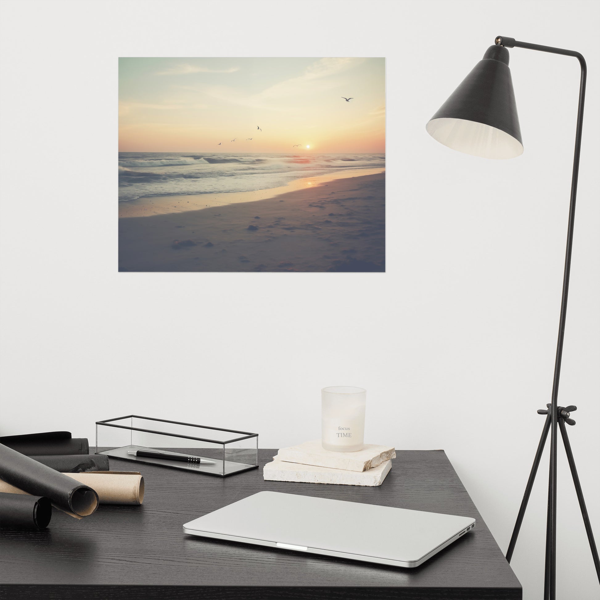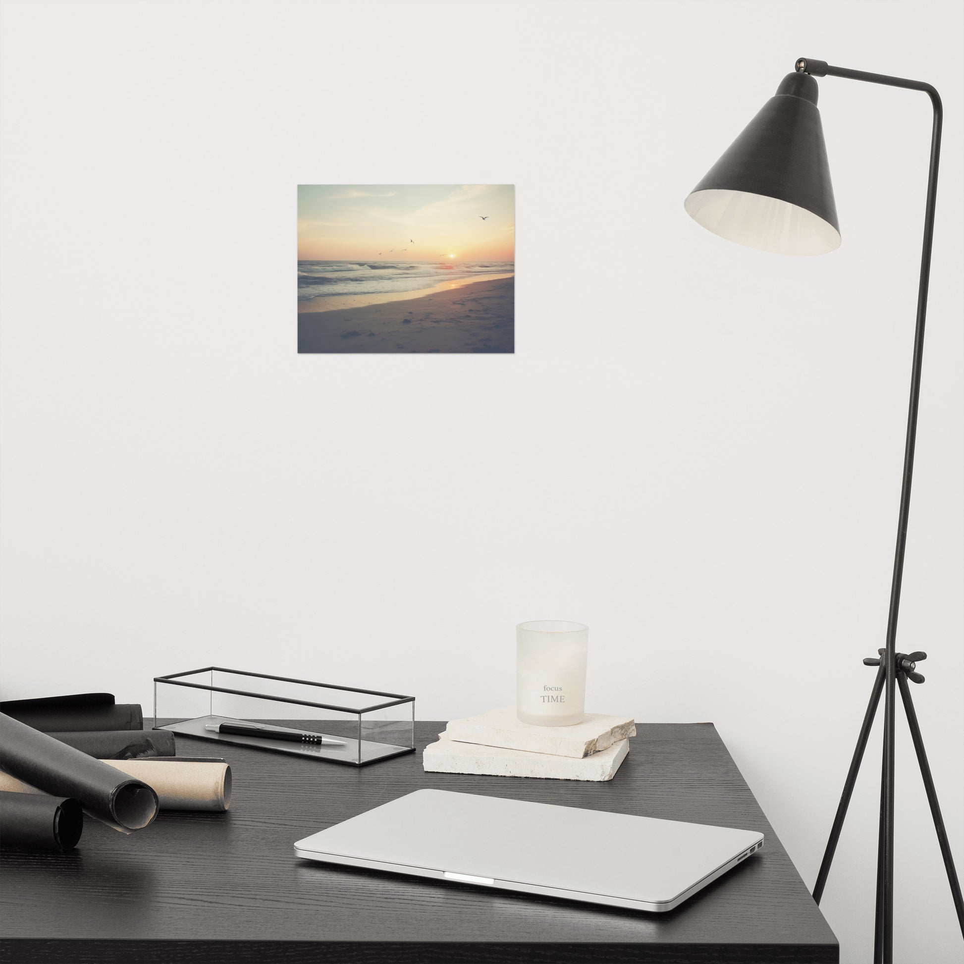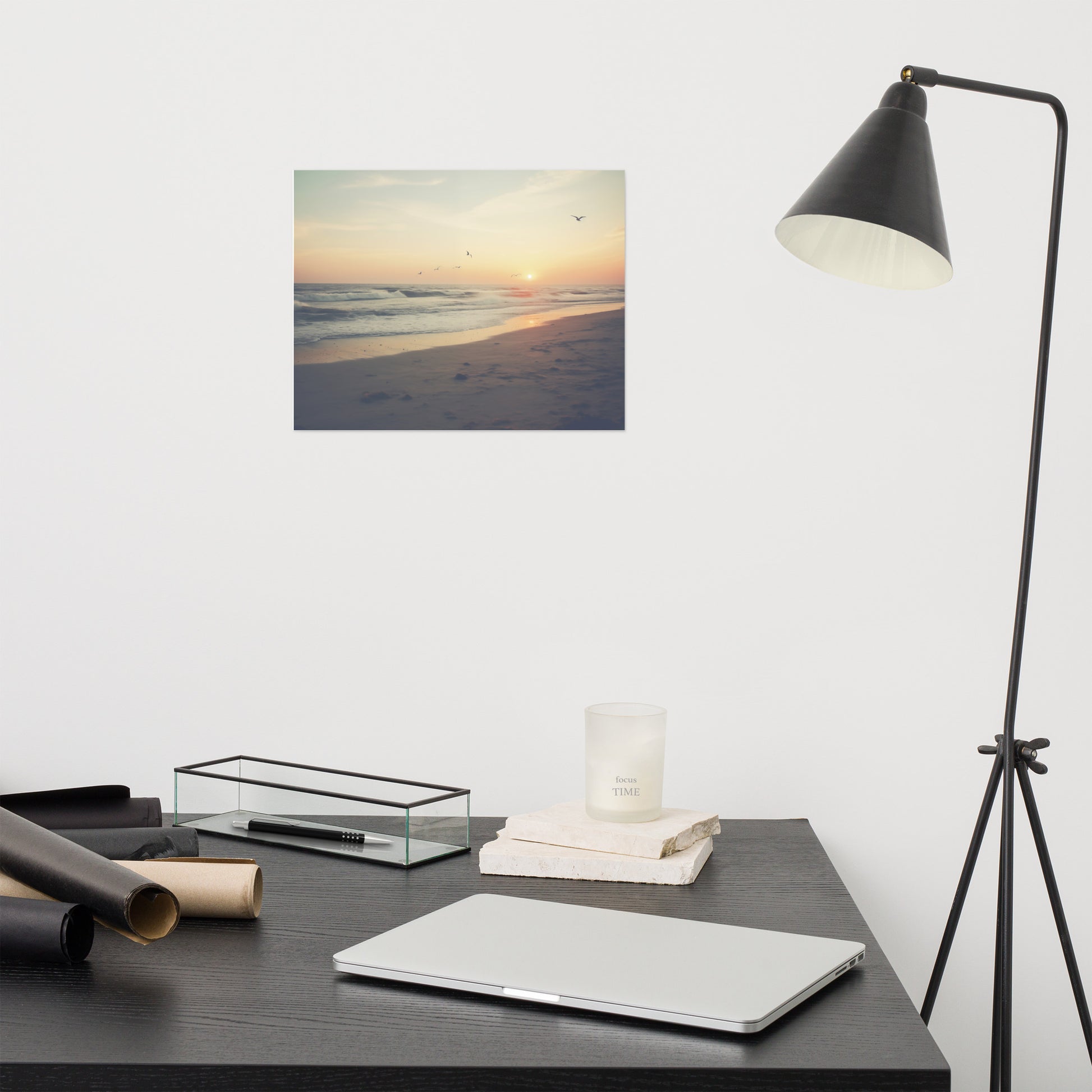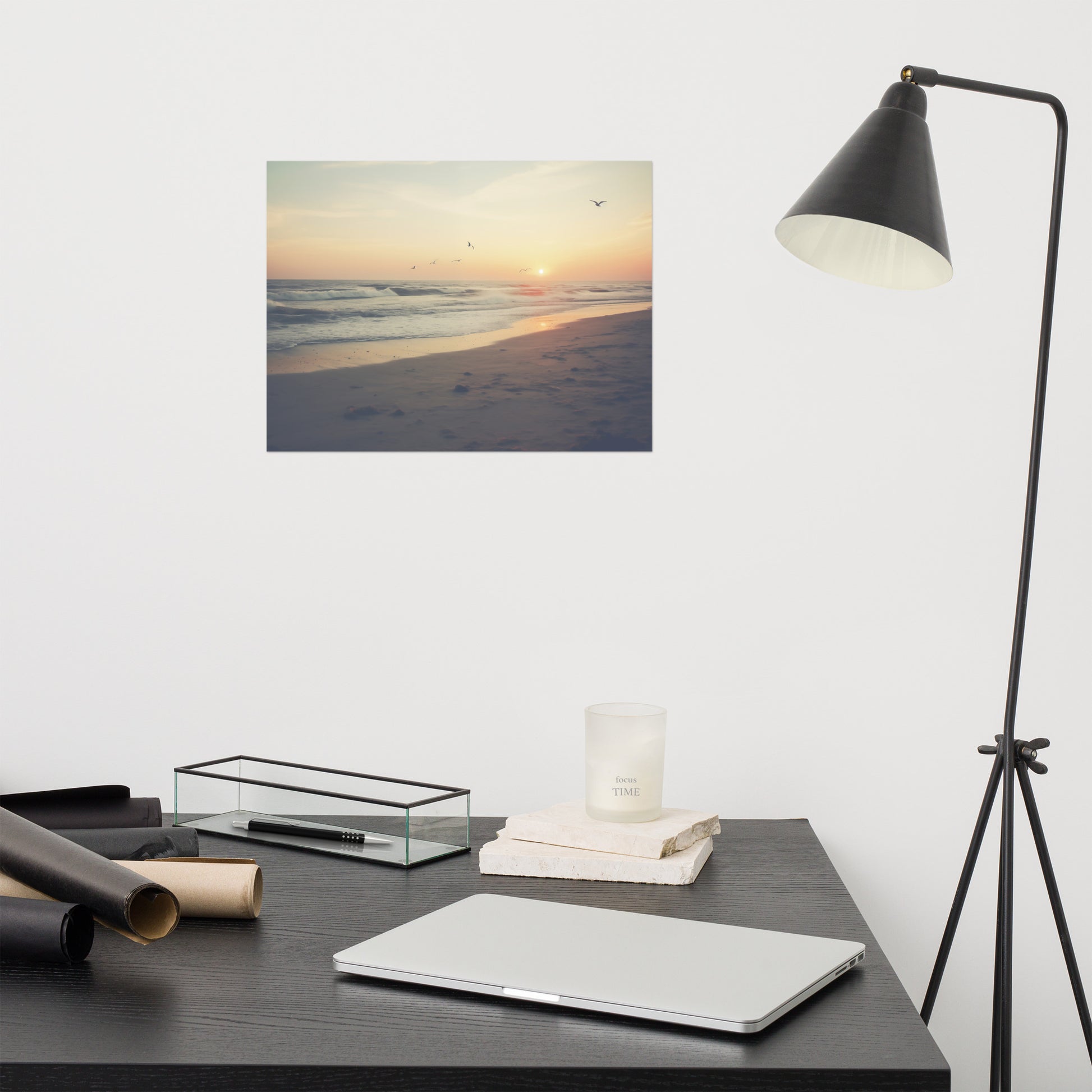 This artwork would be a great addition to various interior design styles, especially those that focus on creating a relaxing and calming atmosphere. Its soft colors and serene subject matter make it suitable for coastal or beach-themed rooms, where it can complement the natural elements of the space. The tranquil scene also works well in minimalist or Scandinavian-inspired interiors, adding a subtle touch of natural beauty without overwhelming the clean lines and simple aesthetic. Furthermore, its calming effect makes it appropriate for bedrooms or meditation spaces within a Zen or transitional design, promoting a sense of peace and tranquility. The photorealistic style allows it to blend seamlessly into both traditional and modern settings, offering a versatile piece that can enhance a variety of decorating schemes.