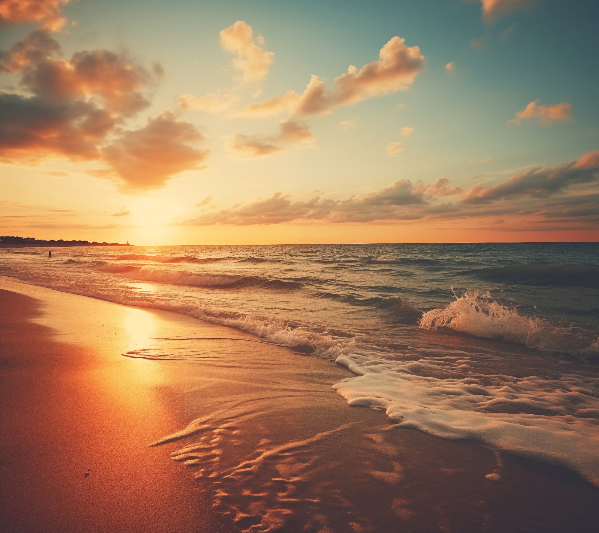 "Seascape Serenade" is a digitally rendered image that captures the tranquil beauty of a beach at sunset. The photorealistic style emphasizes the natural elements of the scene, showcasing gentle waves rolling onto the shore under a sky ablaze with warm hues. The sun, partially set beyond the horizon, casts a golden glow across the sand and water, creating a serene and picturesque view. Fluffy clouds scattered across the sky add depth and texture to the composition, while the interplay of light and shadow enhances the overall sense of realism. The focus on natural beauty and the peaceful atmosphere makes this artwork a calming and visually appealing piece.