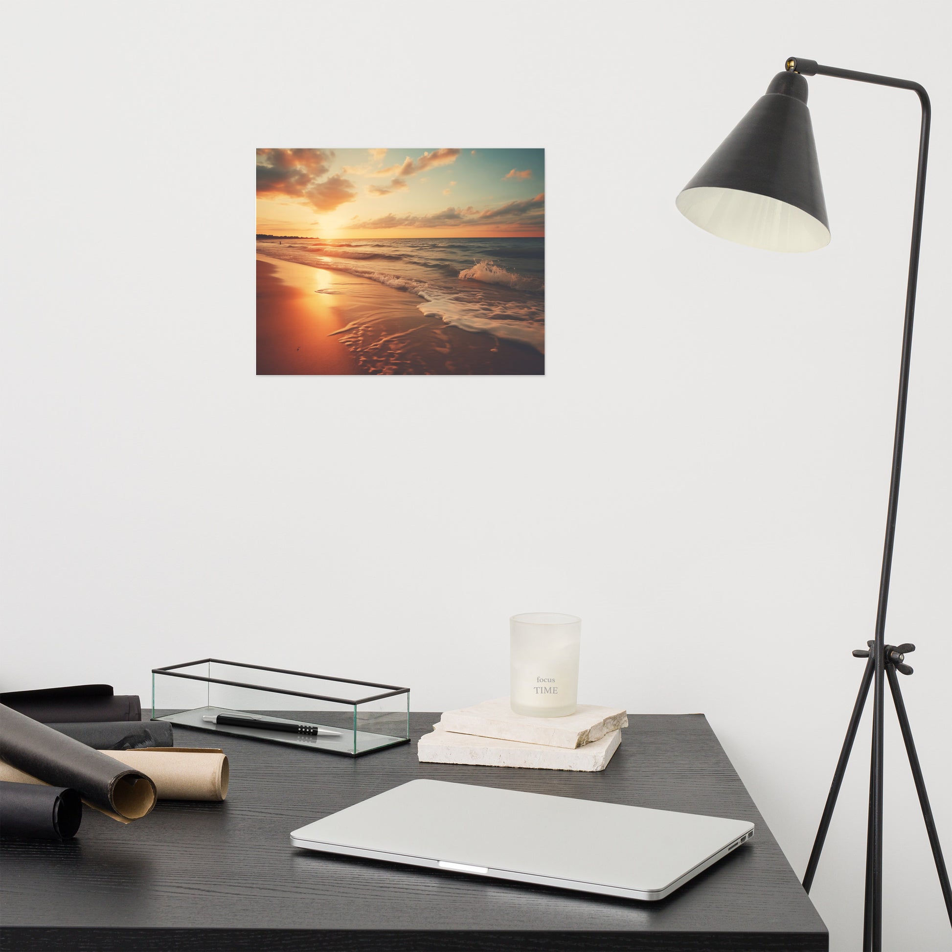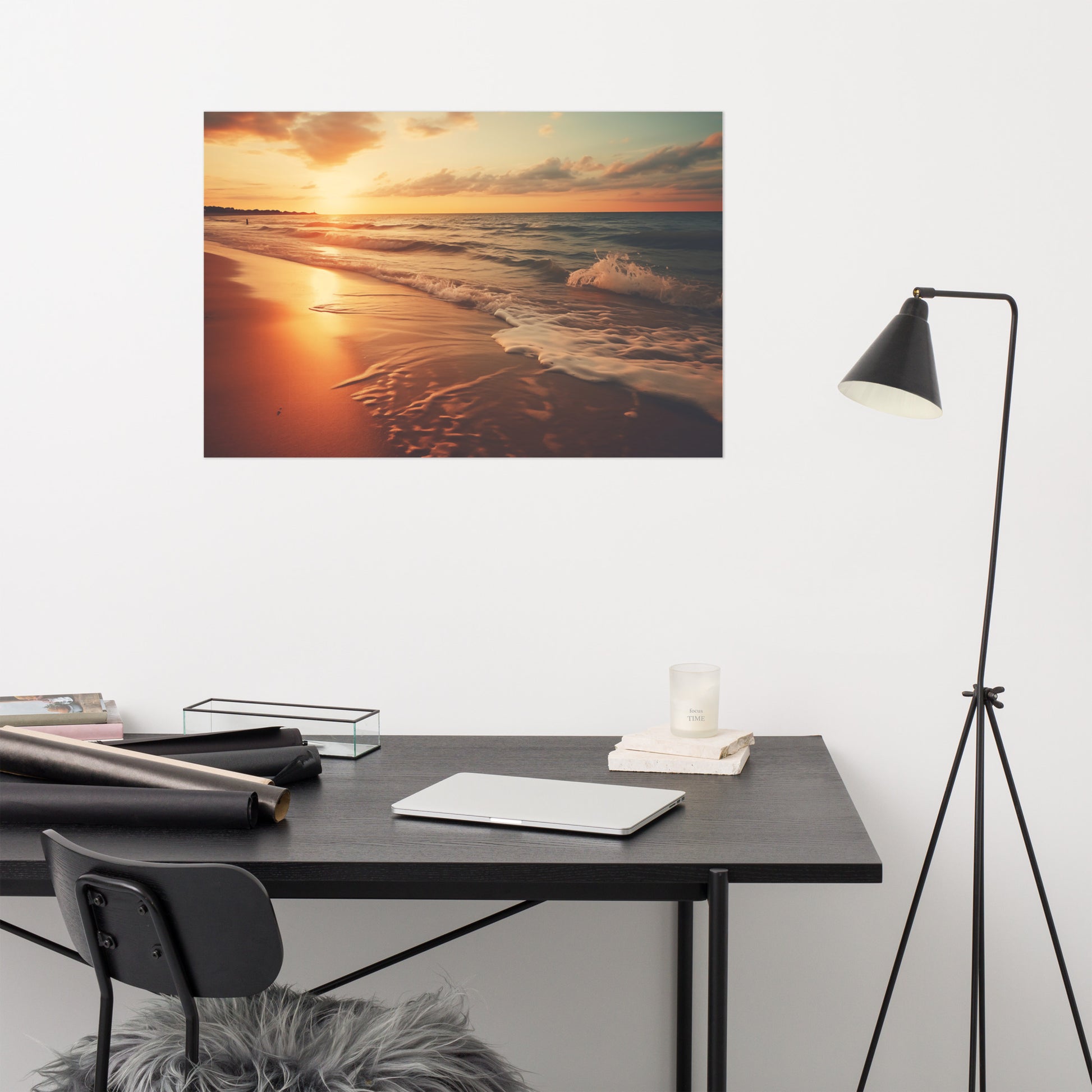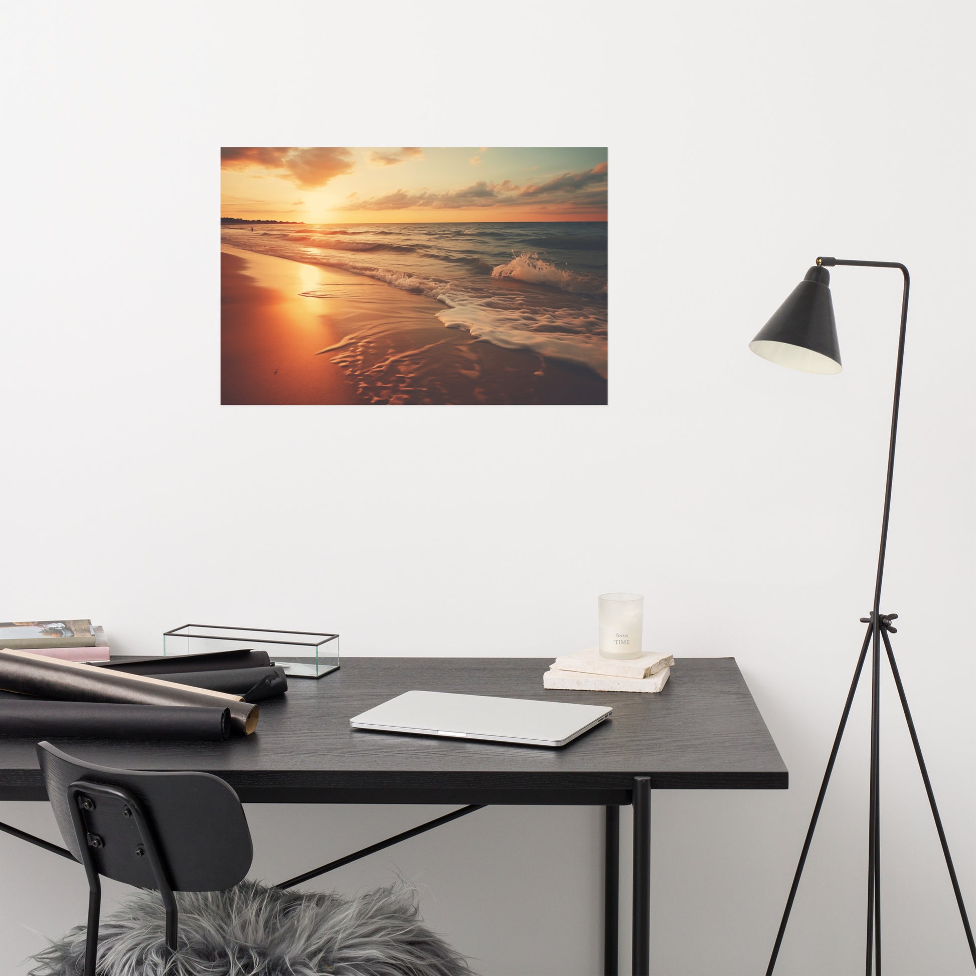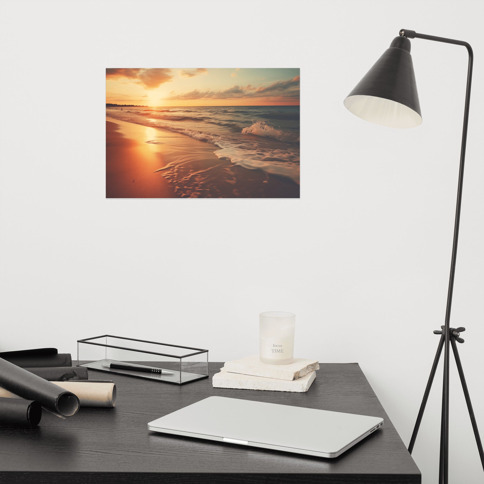 This artwork would complement a variety of interior design styles, particularly those that prioritize creating a serene and relaxing environment. Its tranquil subject matter and warm color palette make it an excellent choice for coastal or beach-themed rooms, where it can enhance the natural elements of the space. The calming scene also works well in minimalist or Scandinavian-inspired interiors, adding a subtle yet impactful touch of natural beauty without disrupting the clean lines and simplicity. Furthermore, its peaceful ambiance makes it suitable for bedrooms or meditation spaces within Zen or transitional designs, promoting a sense of calm and tranquility. The photorealistic style allows it to seamlessly integrate into both traditional and modern settings, offering a versatile piece that can enhance a wide range of decorating schemes.
