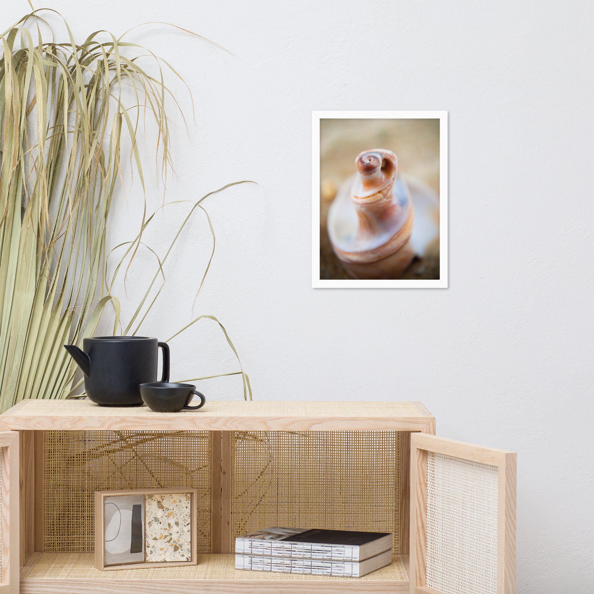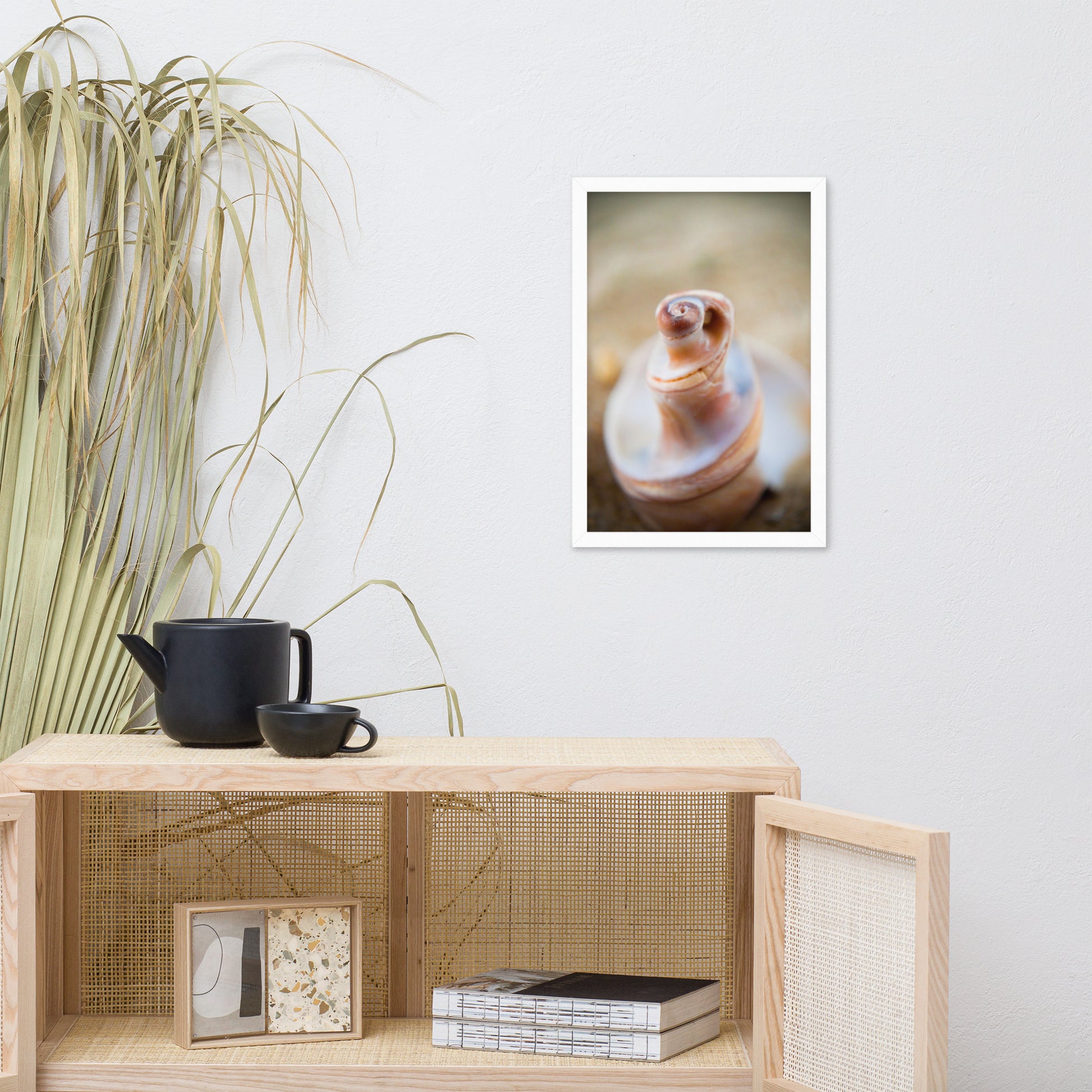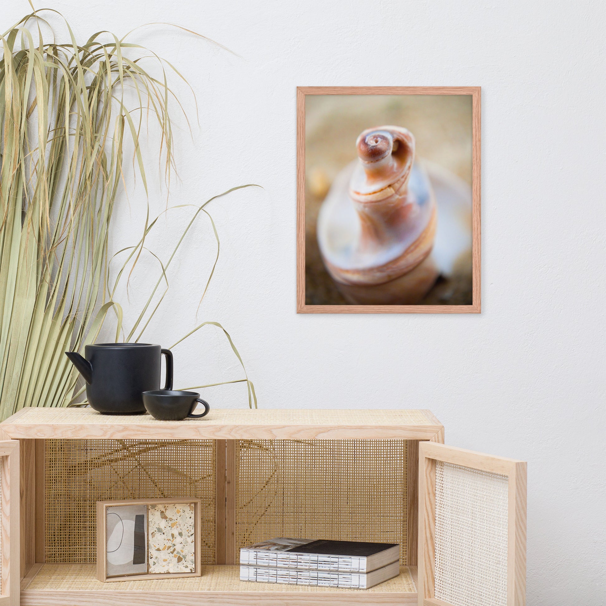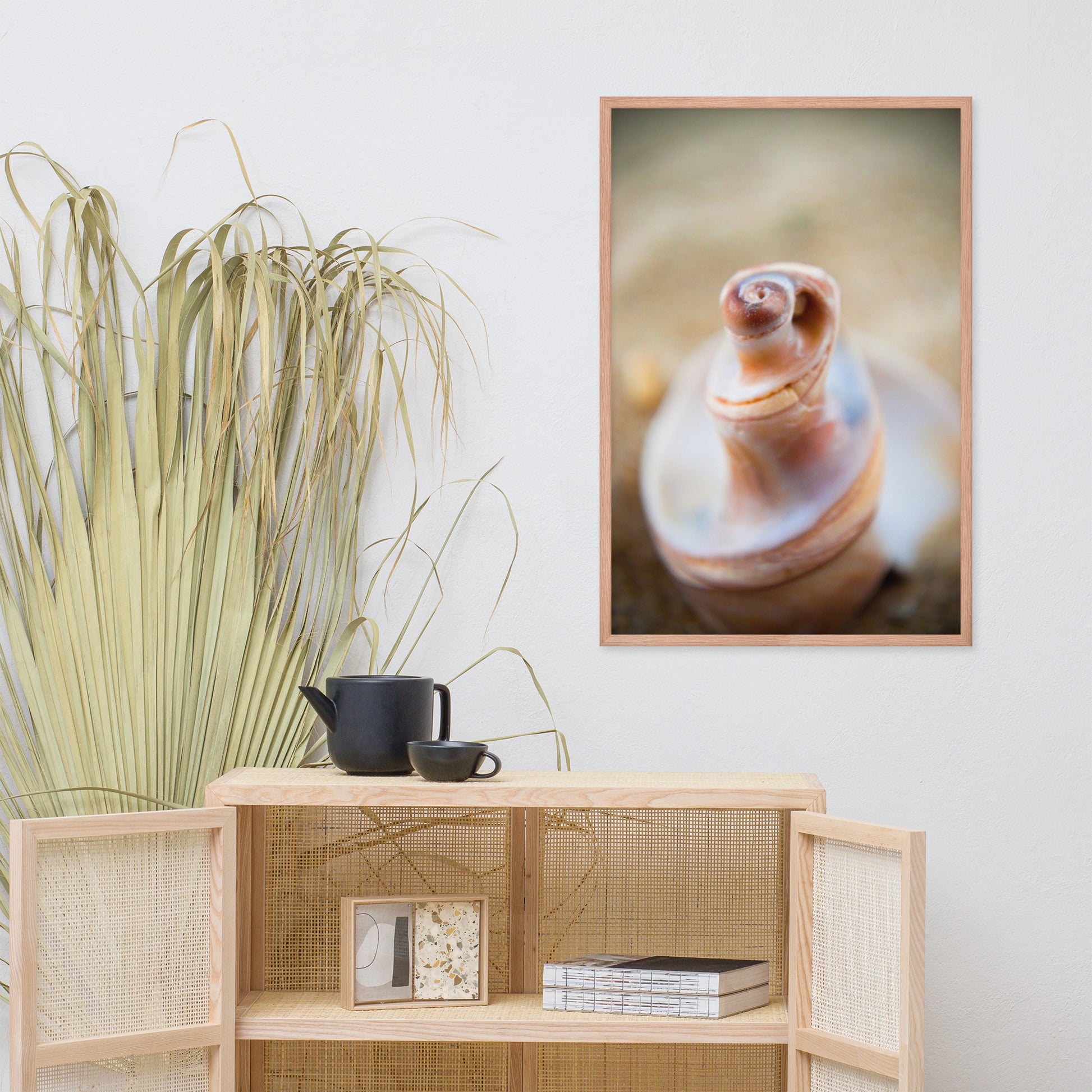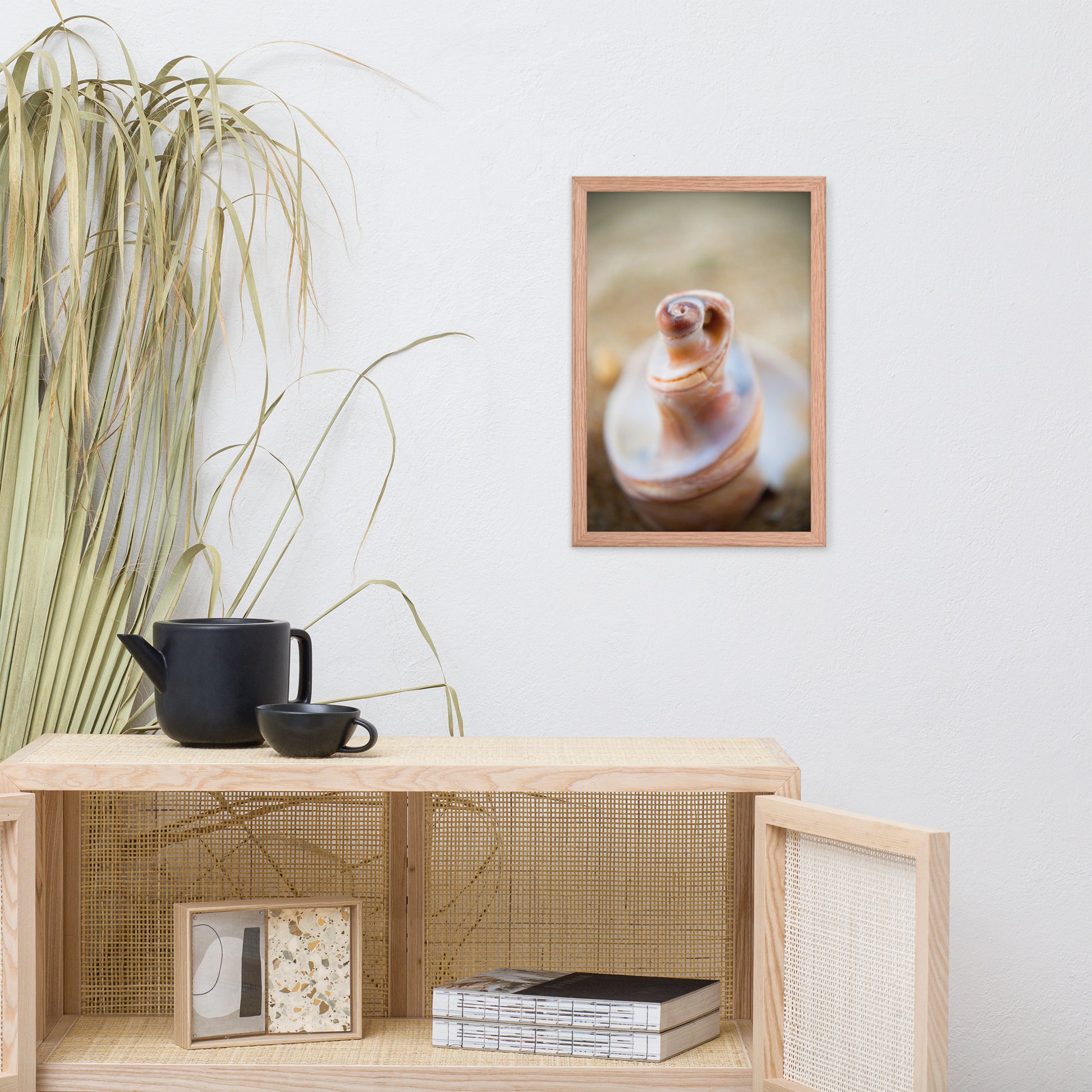 About these framed art beach scenes: "Smooth Erosion" captures the serene beauty of a weathered seashell, its outer layers worn away by the relentless tides, revealing the delicate pink spiral within. This softly lit, neutral-toned photograph invites a sense of tranquility and contemplation, evoking the gentle power of nature's transformative touch.