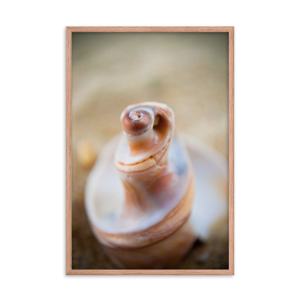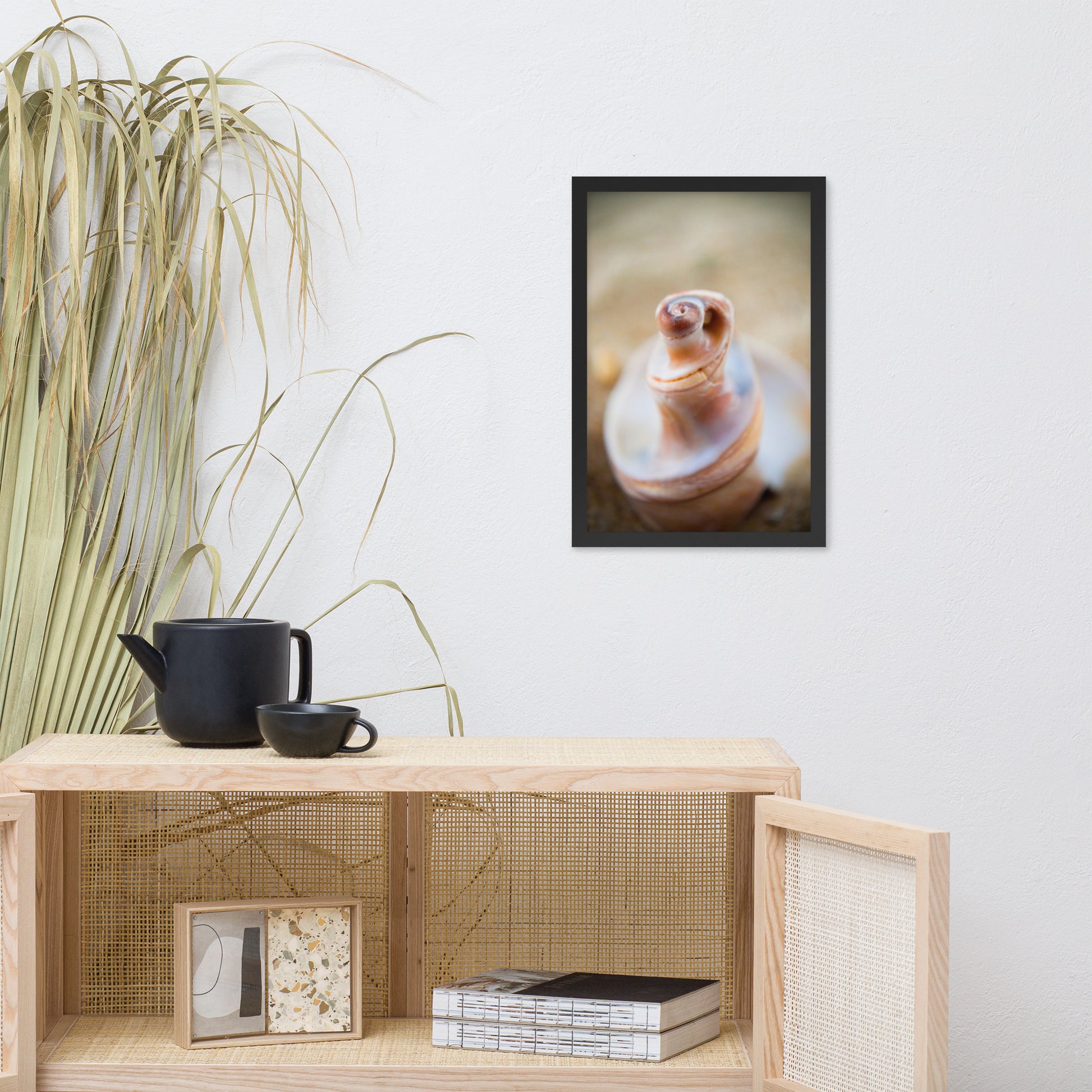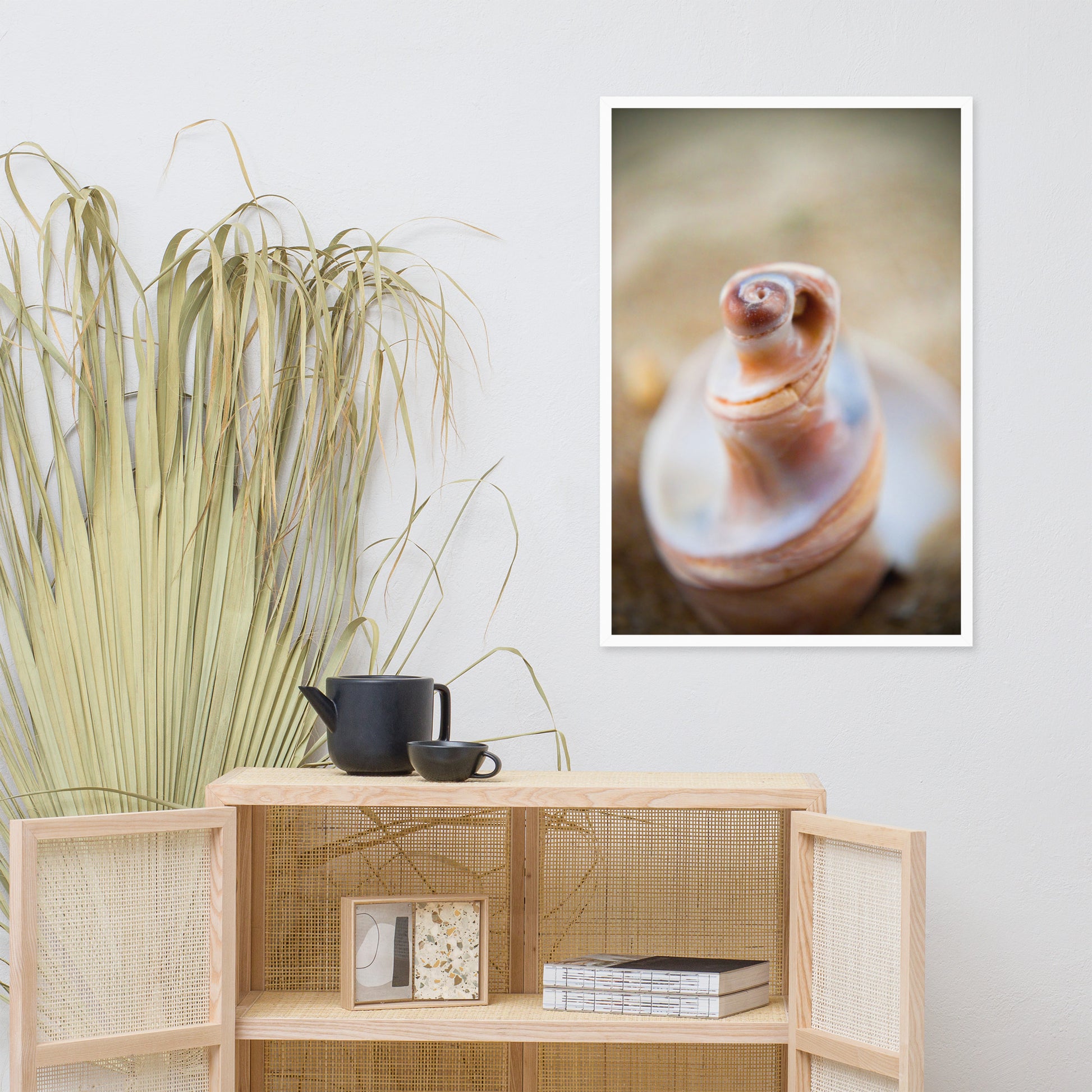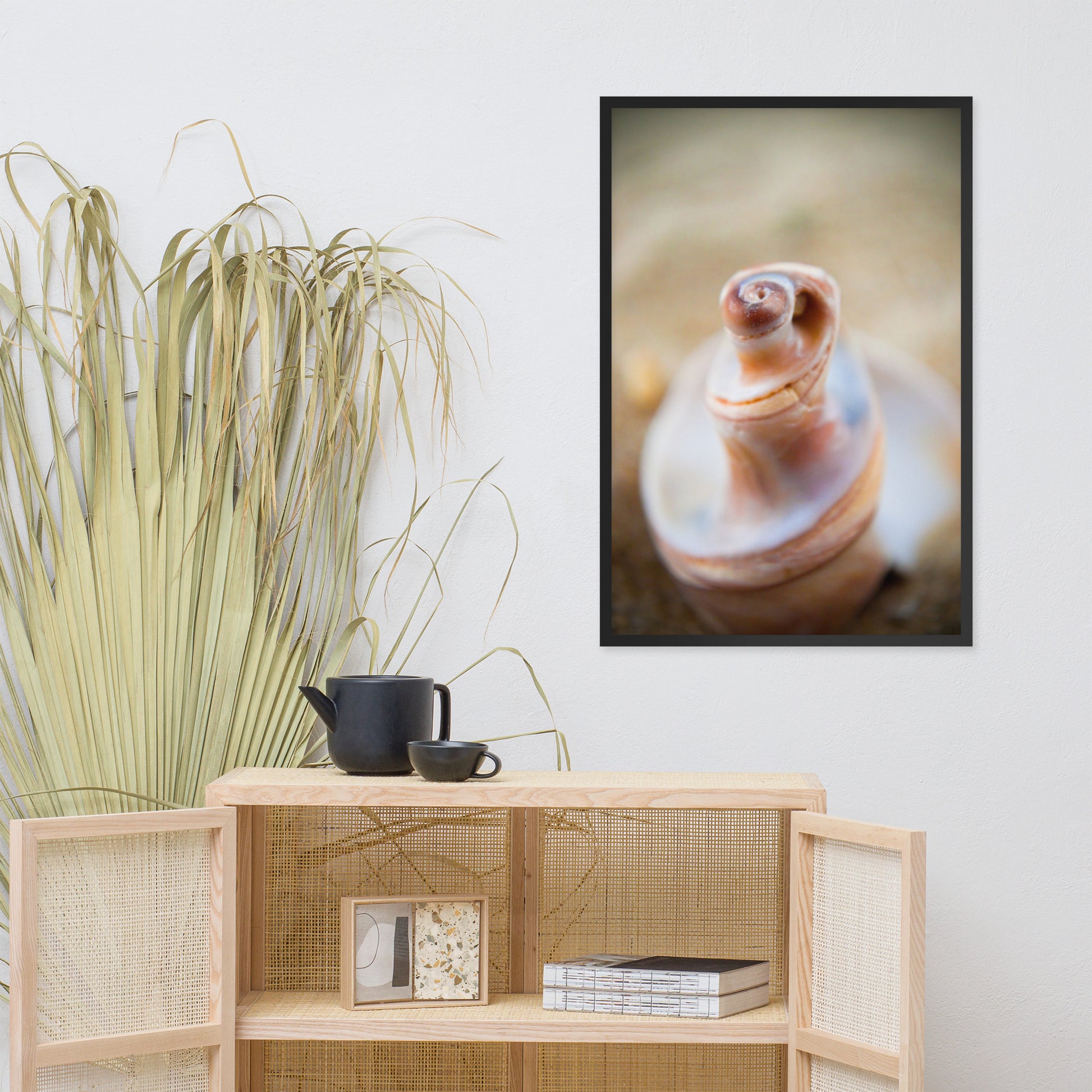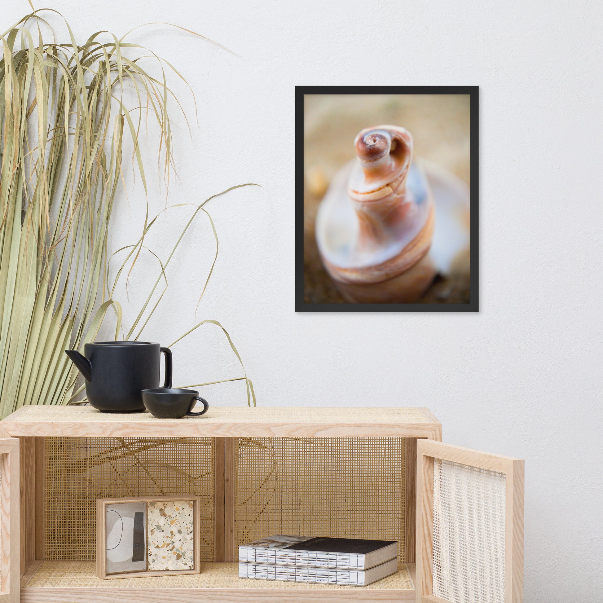About these framed art beach scenes: "Smooth Erosion" captures the serene beauty of a weathered seashell, its outer layers worn away by the relentless tides, revealing the delicate pink spiral within. This softly lit, neutral-toned photograph invites a sense of tranquility and contemplation, evoking the gentle power of nature's transformative touch.