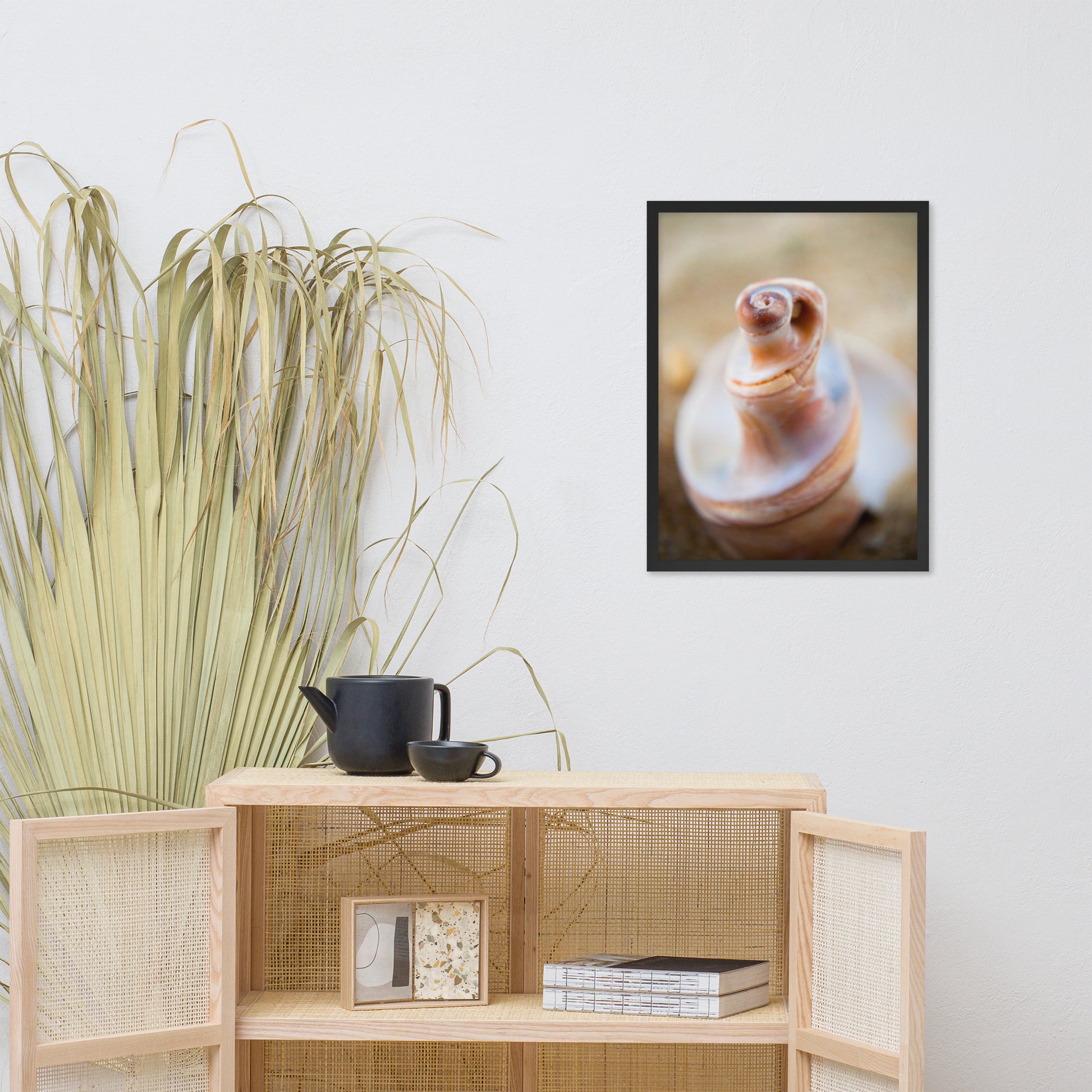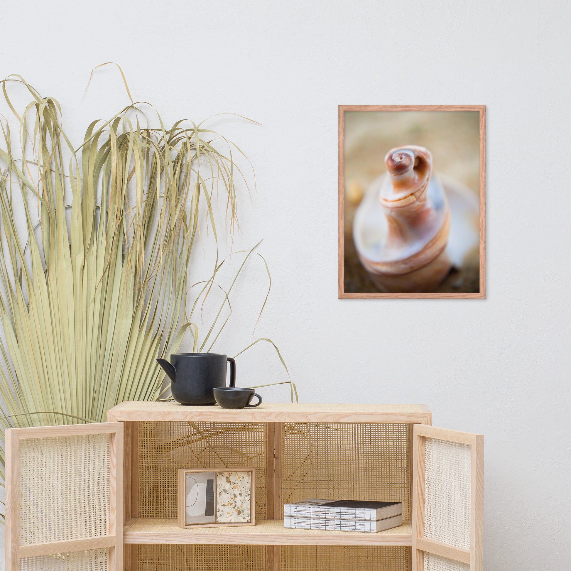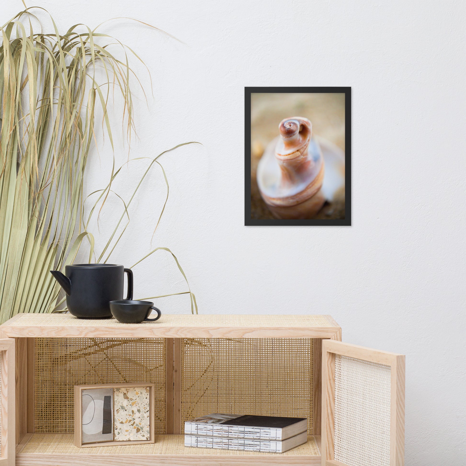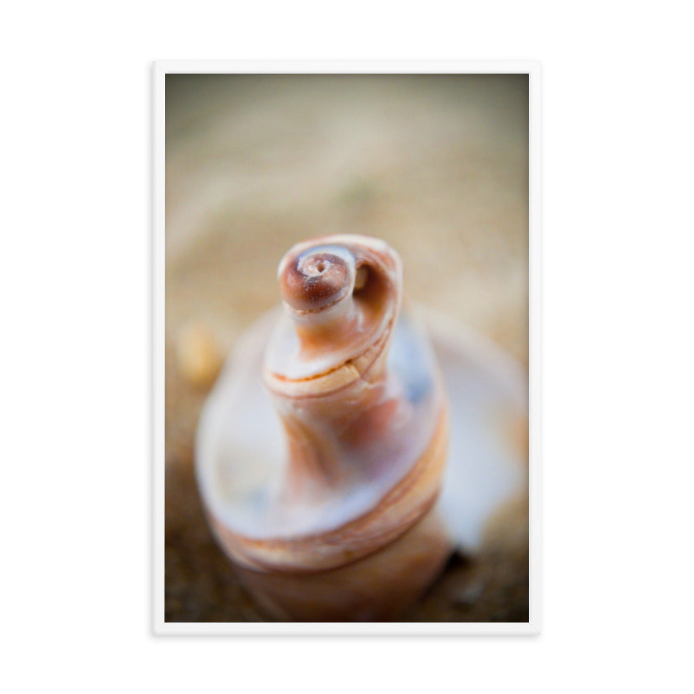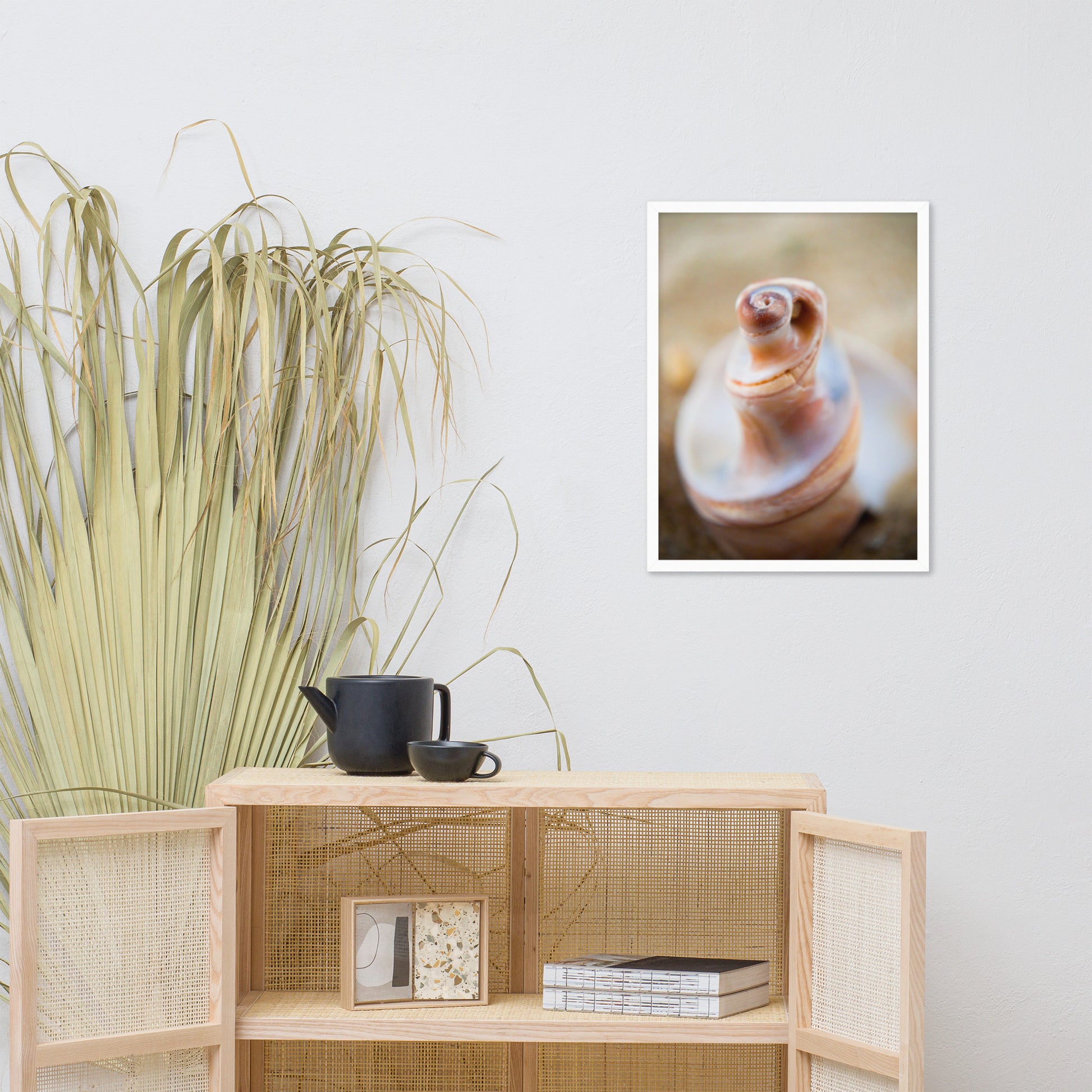 About these framed art beach scenes: "Smooth Erosion" captures the serene beauty of a weathered seashell, its outer layers worn away by the relentless tides, revealing the delicate pink spiral within. This softly lit, neutral-toned photograph invites a sense of tranquility and contemplation, evoking the gentle power of nature's transformative touch.