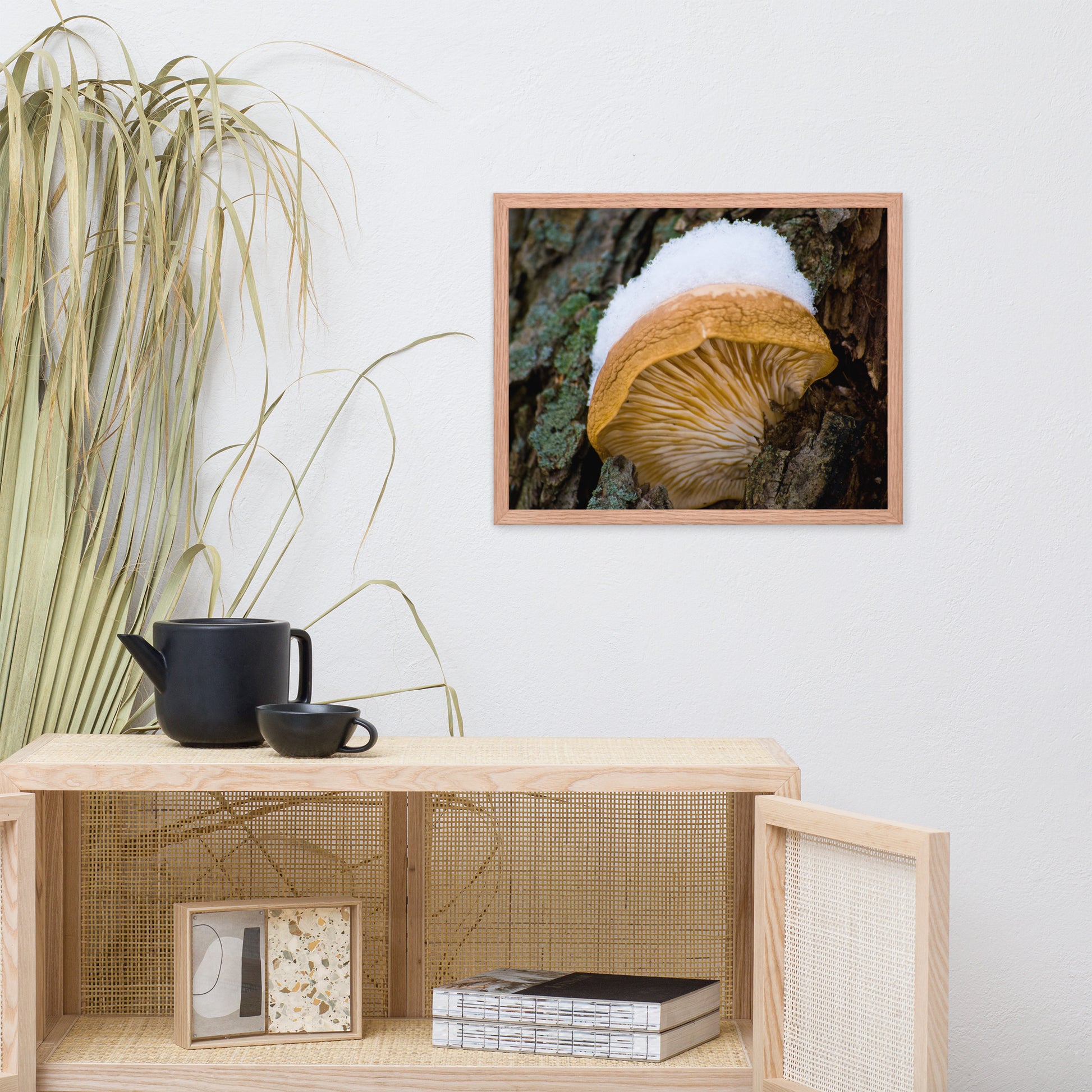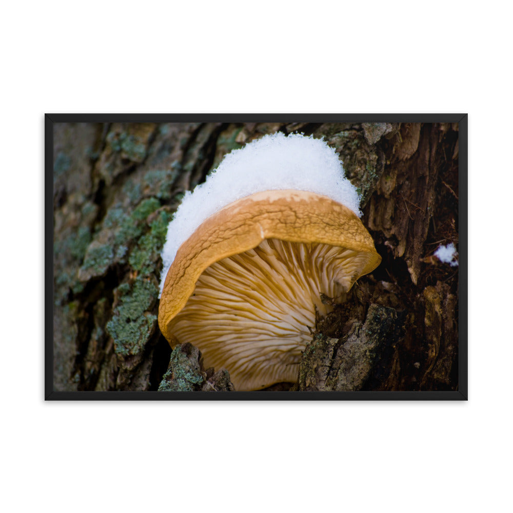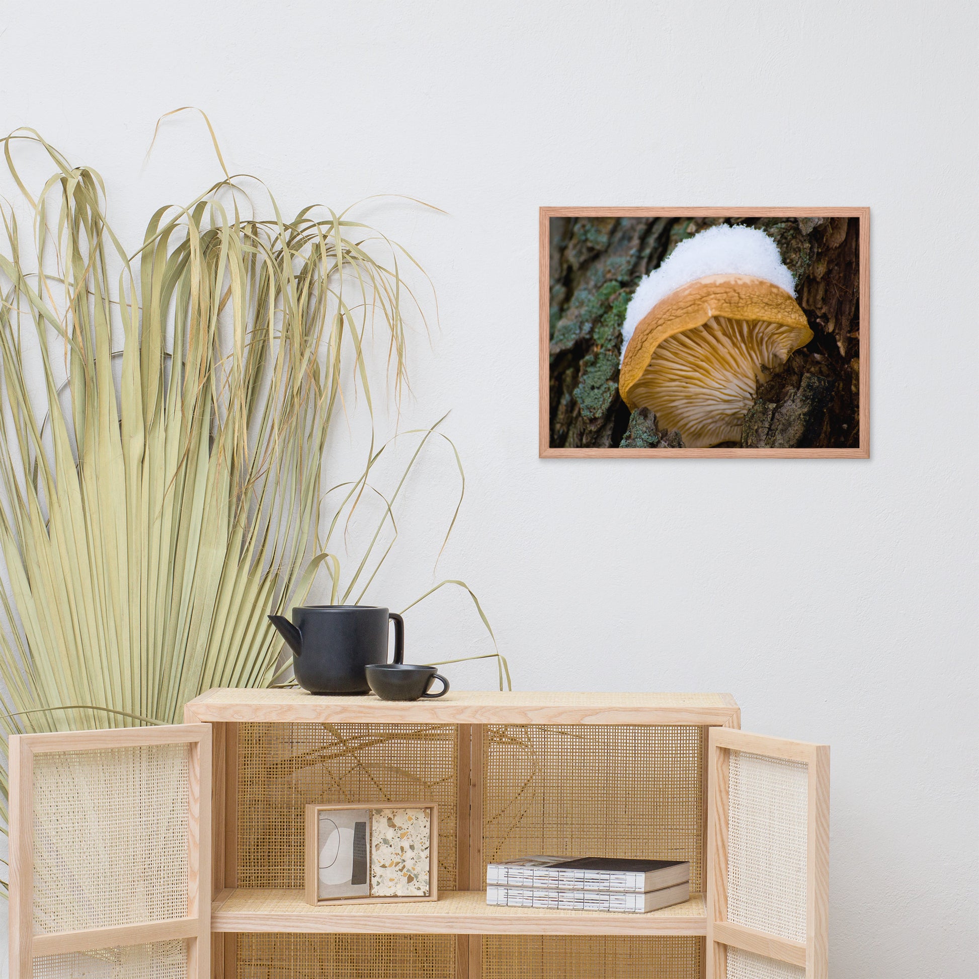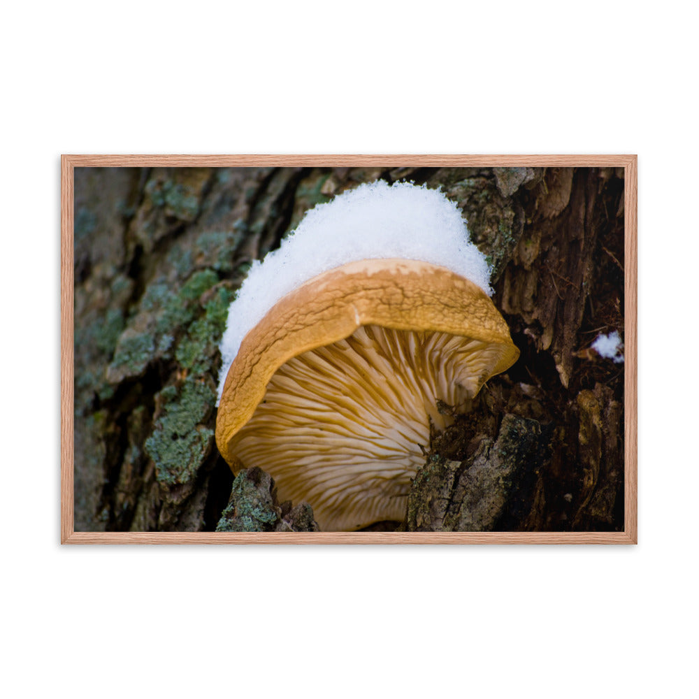 About this rustic framed art: Bring the tranquility and resilience of nature into your home with "Snow Fungus." This captivating framed art print showcases a delicate mushroom, adorned with a pristine blanket of snow, clinging to a weathered tree trunk. The contrasting textures of the smooth snow, the intricate gills of the mushroom, and the rugged bark create a visually stunning composition that draws the viewer in. The warm, earthy tones of the fungus juxtaposed with the cool, crisp white of the snow evoke a sense of harmony and balance.