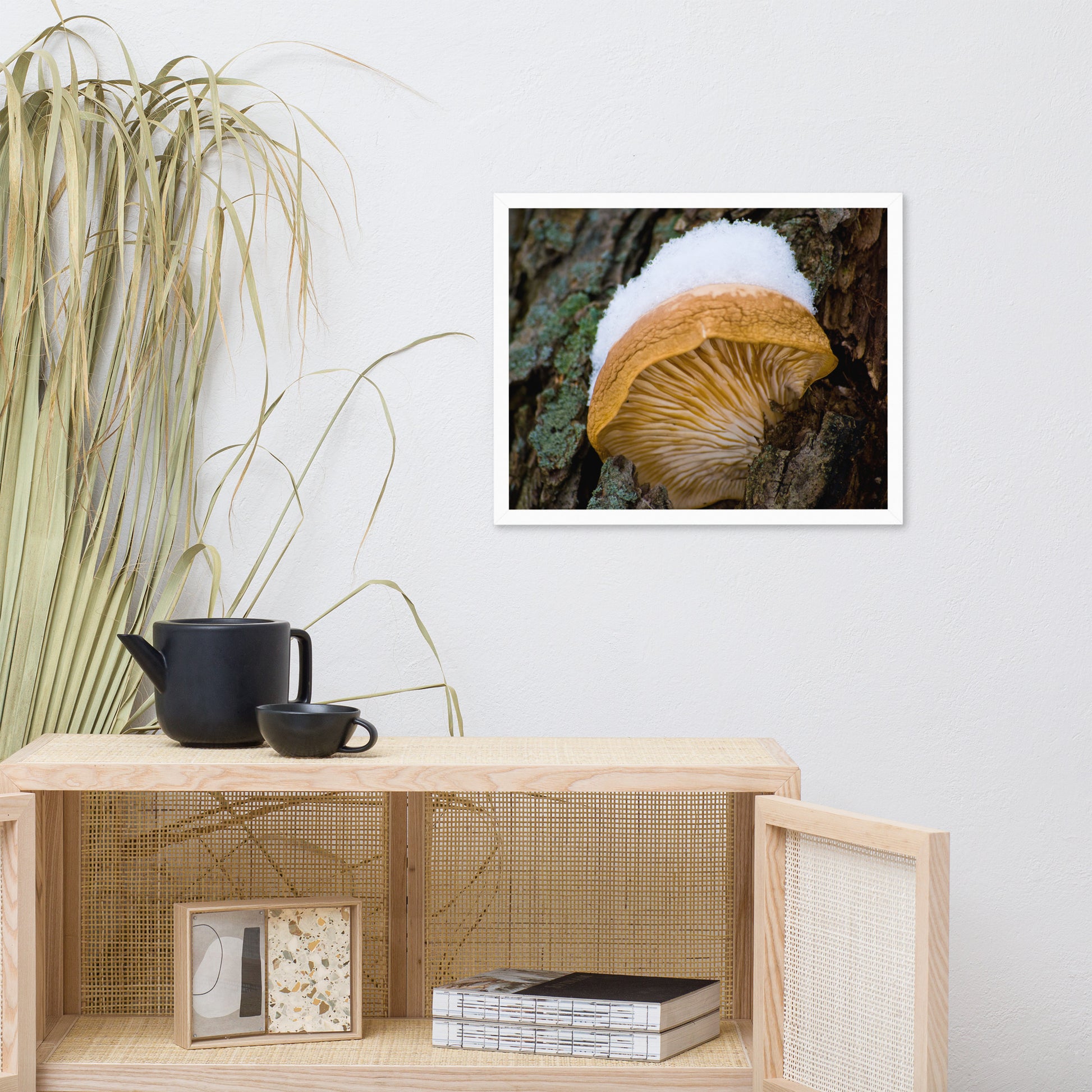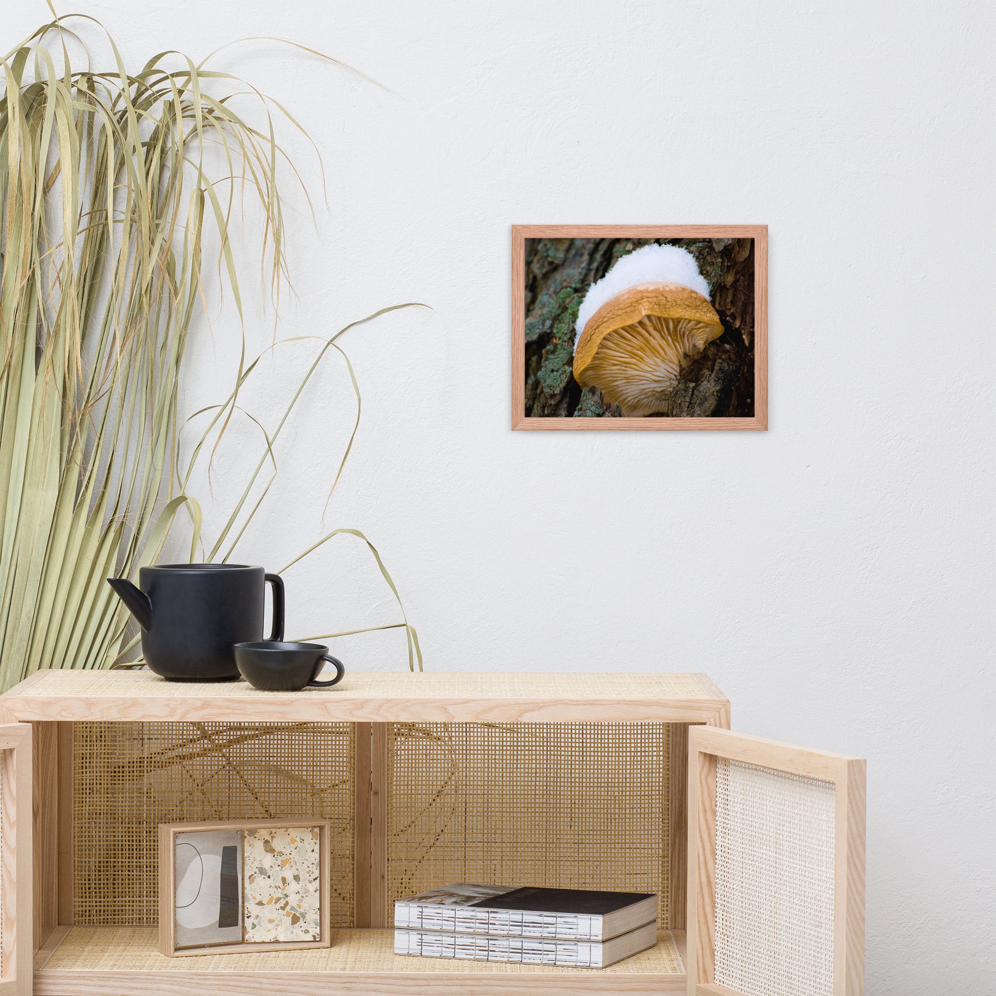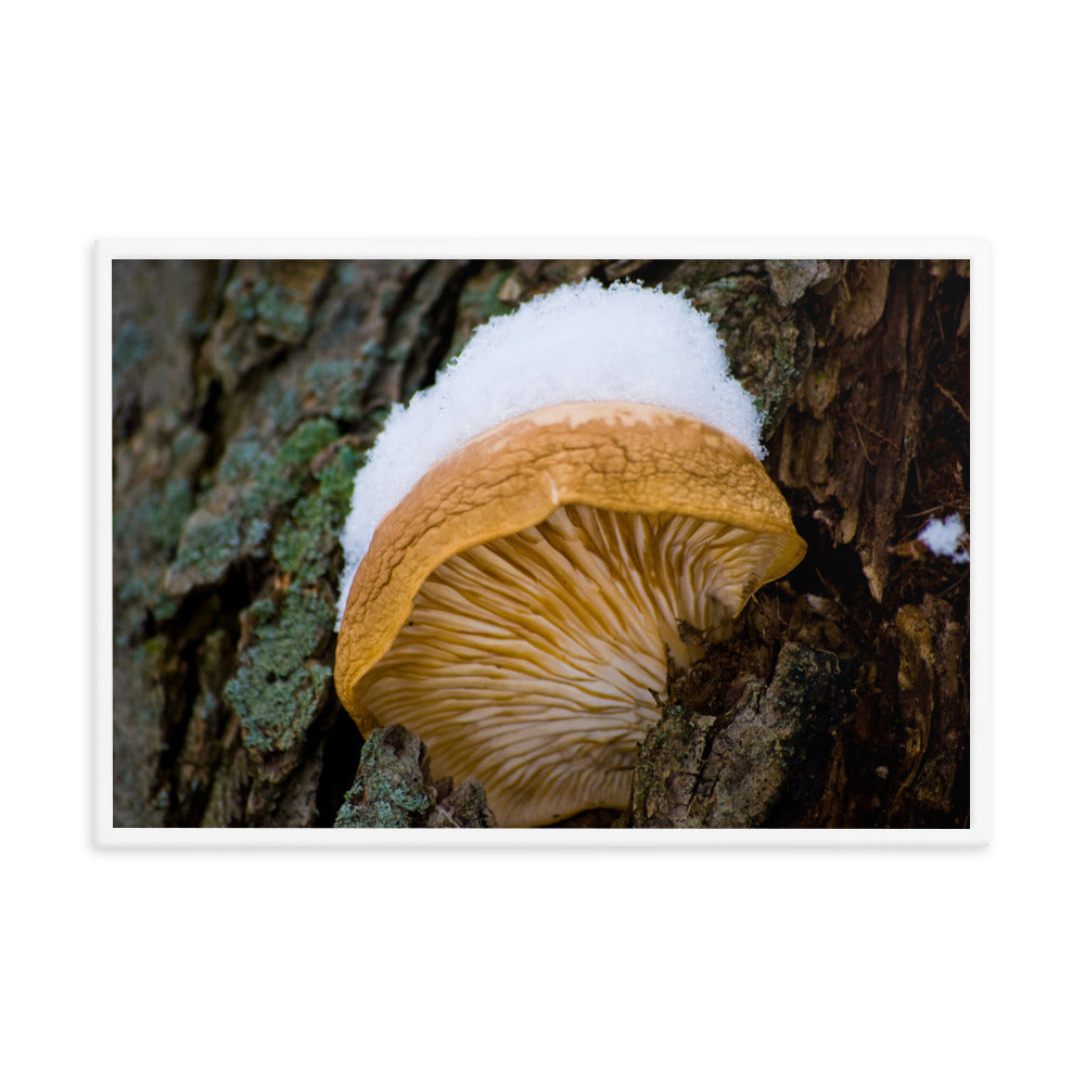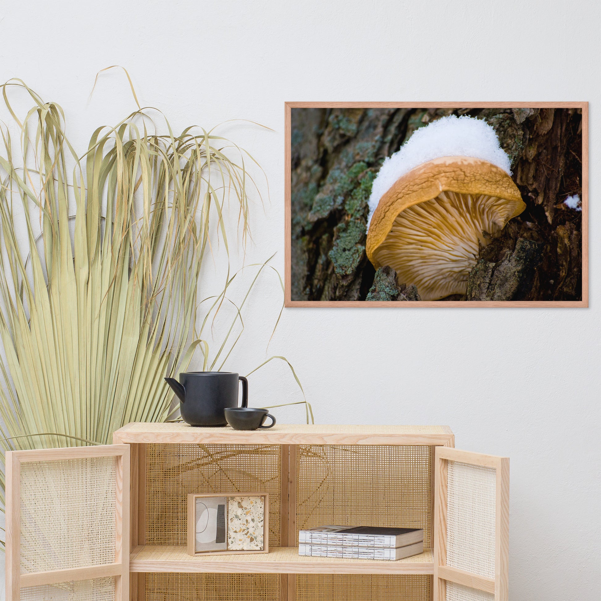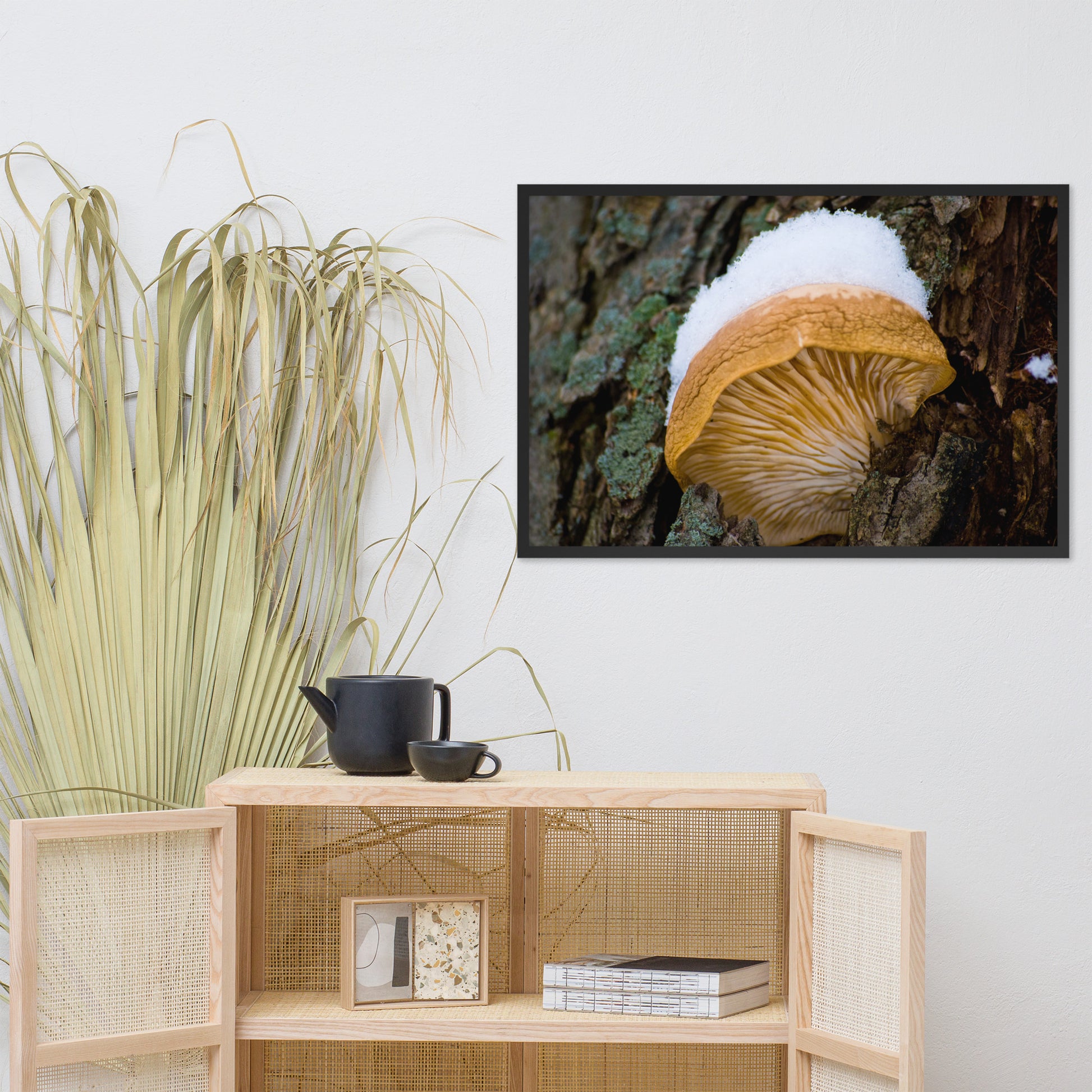 About this rustic framed art: Bring the tranquility and resilience of nature into your home with "Snow Fungus." This captivating framed art print showcases a delicate mushroom, adorned with a pristine blanket of snow, clinging to a weathered tree trunk. The contrasting textures of the smooth snow, the intricate gills of the mushroom, and the rugged bark create a visually stunning composition that draws the viewer in. The warm, earthy tones of the fungus juxtaposed with the cool, crisp white of the snow evoke a sense of harmony and balance.