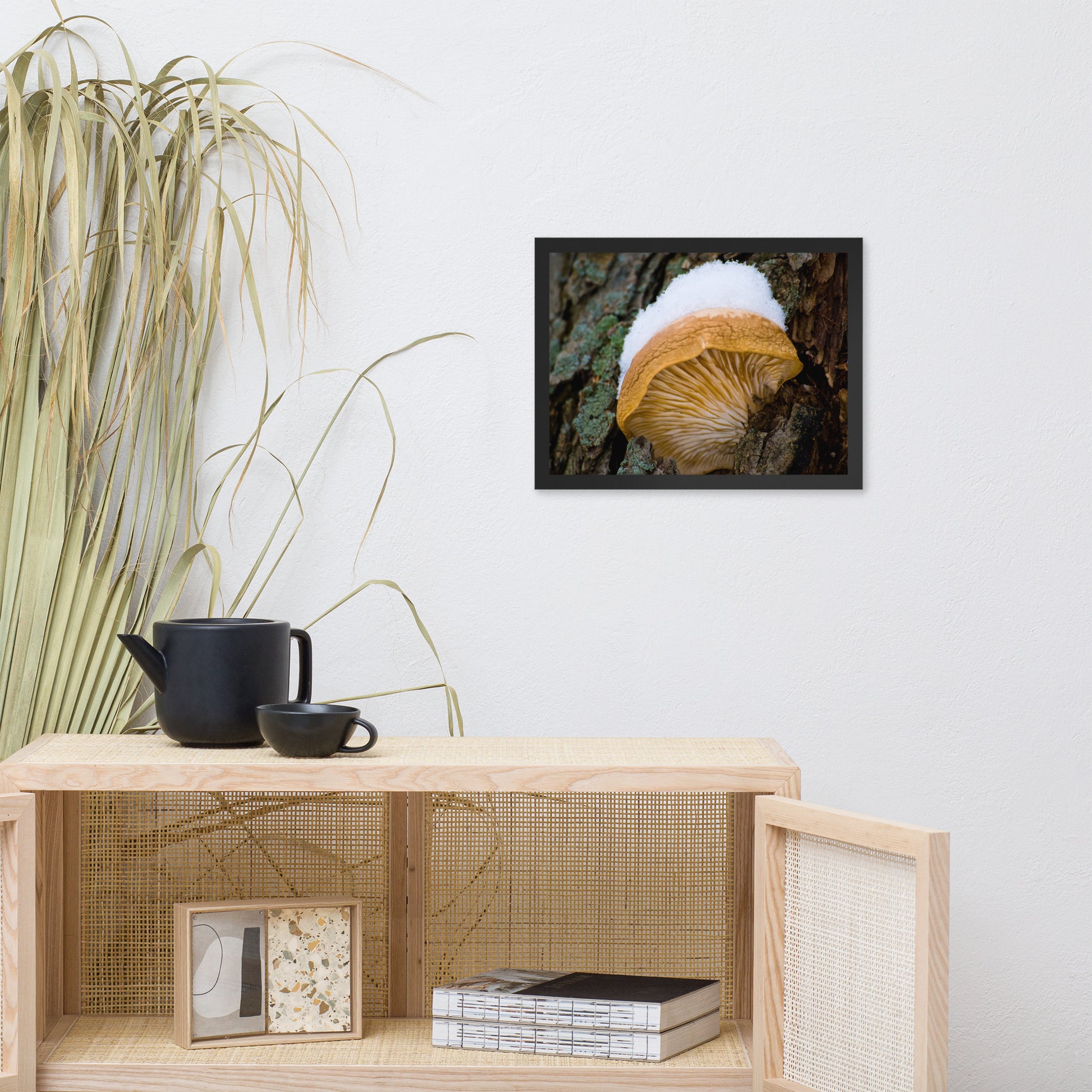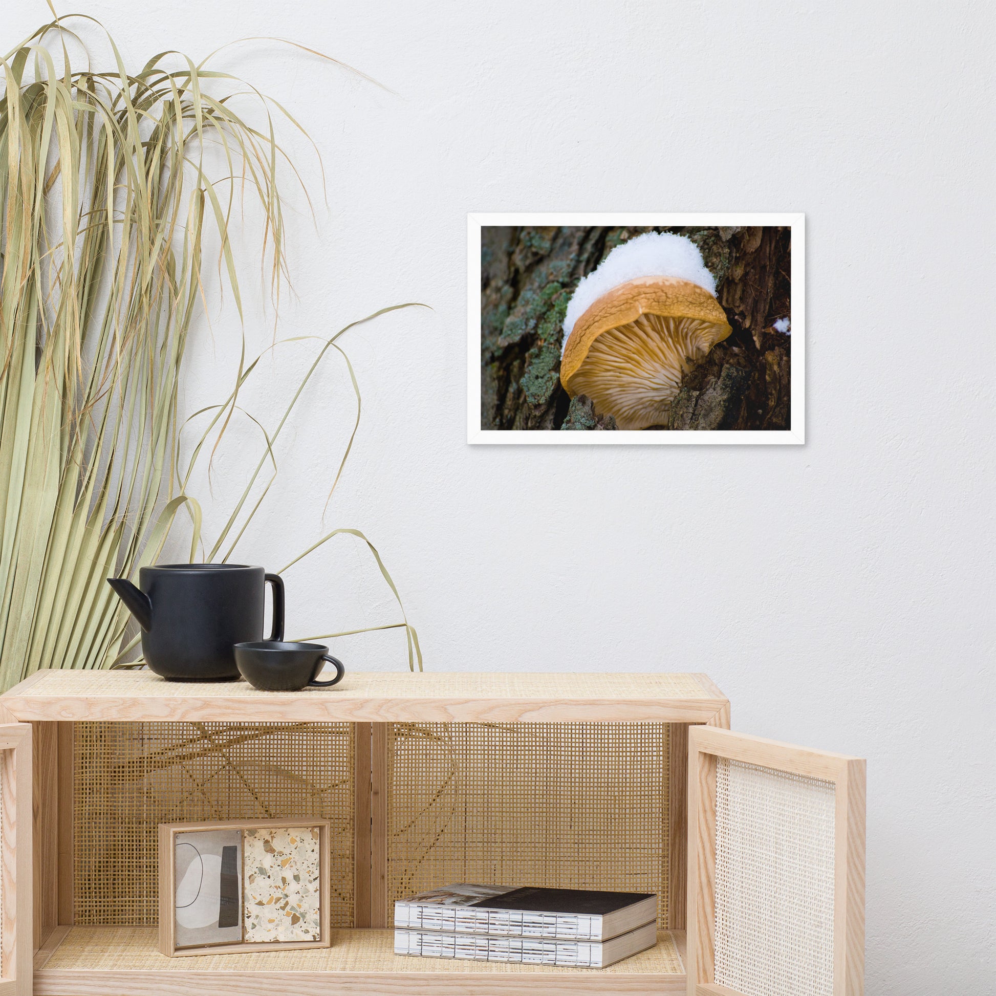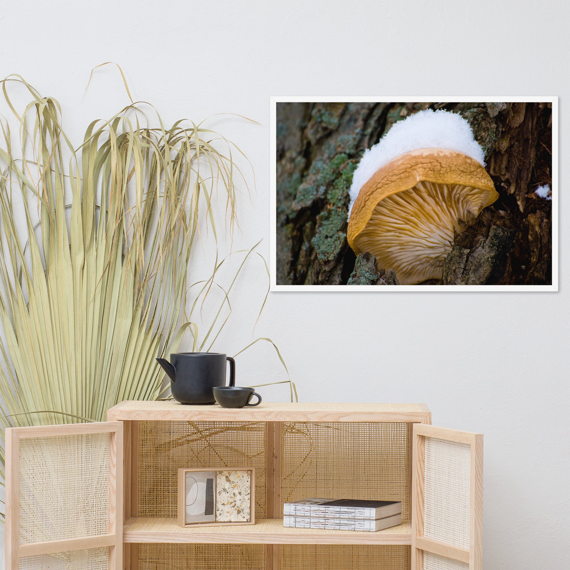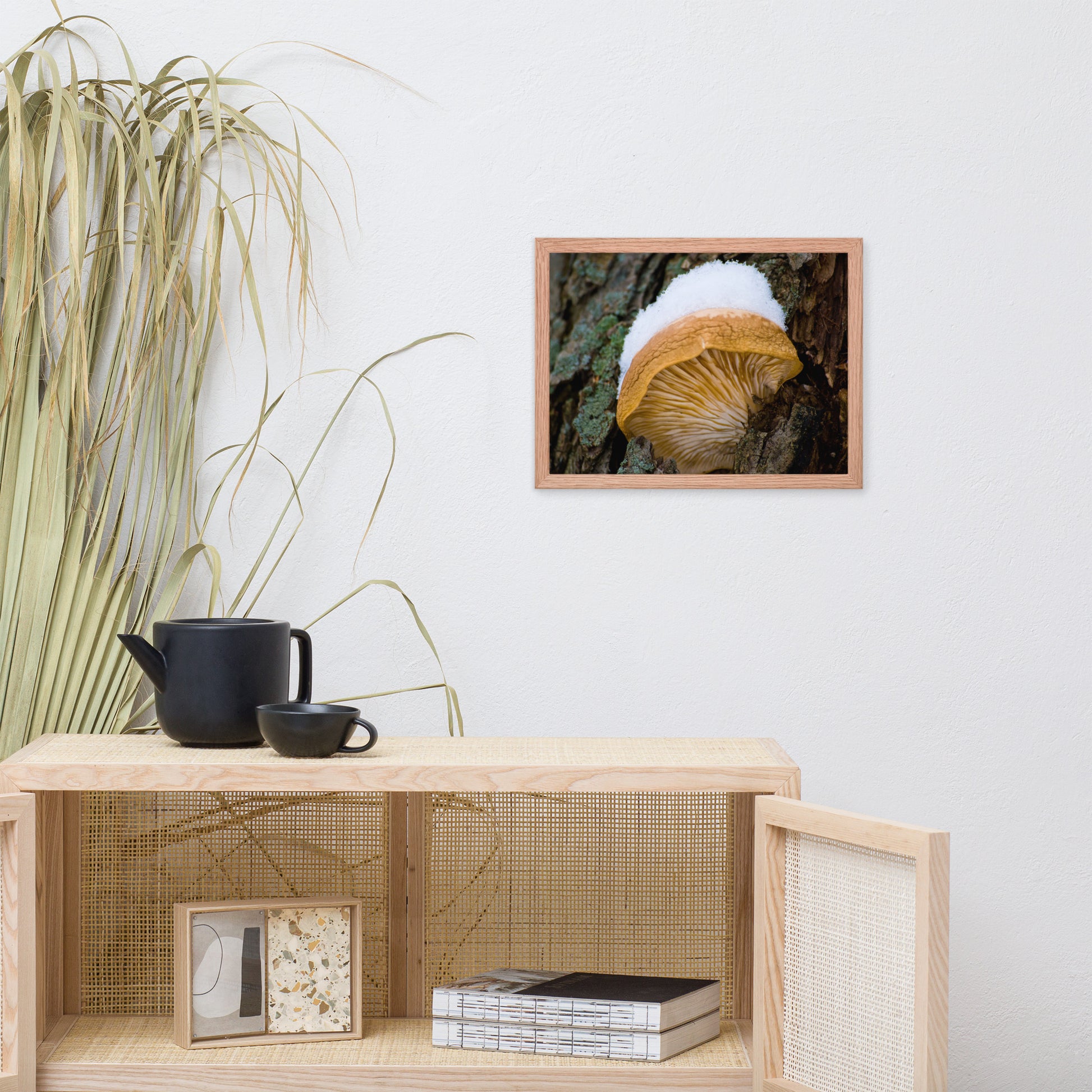 About this rustic framed art: Bring the tranquility and resilience of nature into your home with "Snow Fungus." This captivating framed art print showcases a delicate mushroom, adorned with a pristine blanket of snow, clinging to a weathered tree trunk. The contrasting textures of the smooth snow, the intricate gills of the mushroom, and the rugged bark create a visually stunning composition that draws the viewer in. The warm, earthy tones of the fungus juxtaposed with the cool, crisp white of the snow evoke a sense of harmony and balance.
