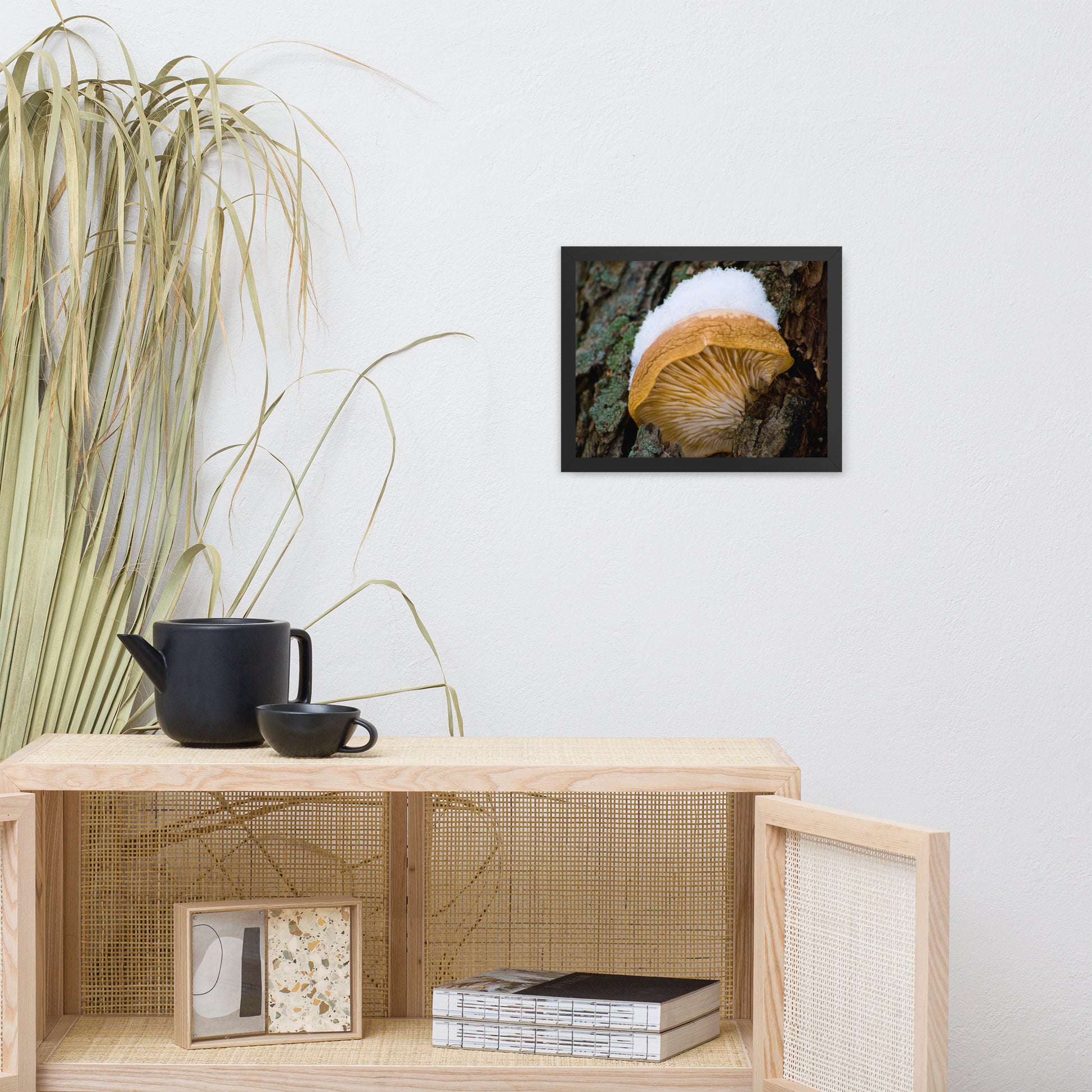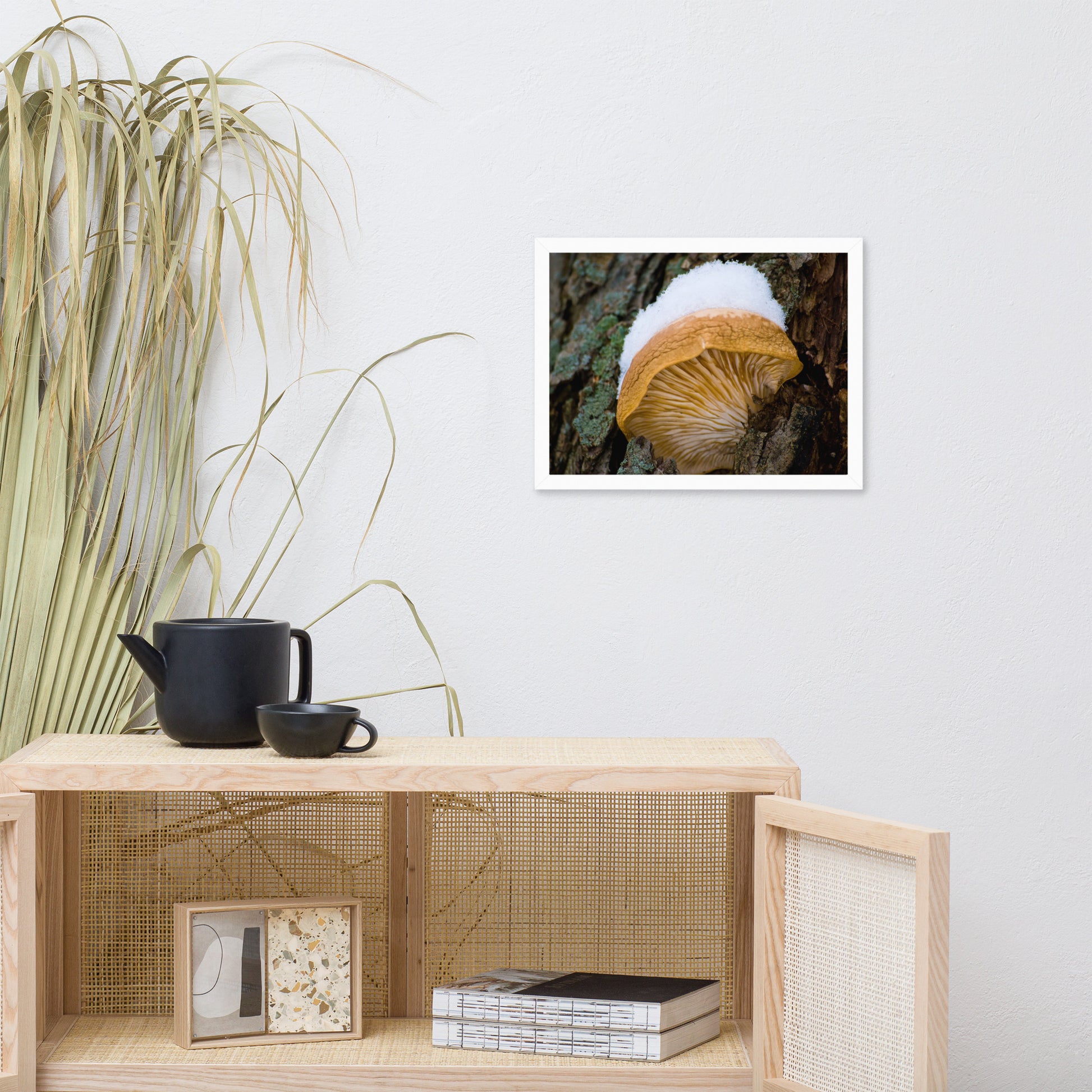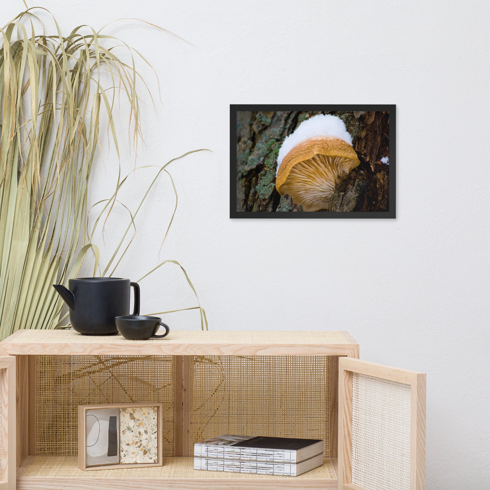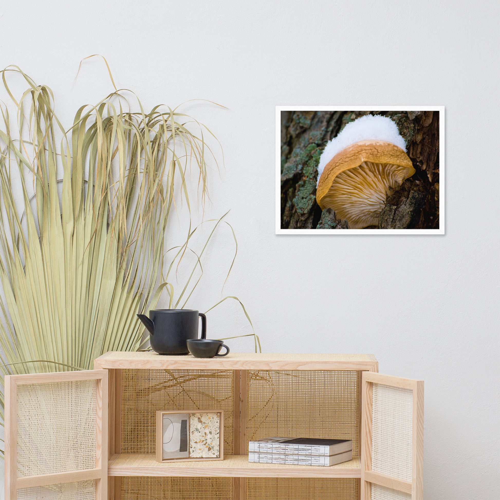 About this rustic framed art: Bring the tranquility and resilience of nature into your home with "Snow Fungus." This captivating framed art print showcases a delicate mushroom, adorned with a pristine blanket of snow, clinging to a weathered tree trunk. The contrasting textures of the smooth snow, the intricate gills of the mushroom, and the rugged bark create a visually stunning composition that draws the viewer in. The warm, earthy tones of the fungus juxtaposed with the cool, crisp white of the snow evoke a sense of harmony and balance.