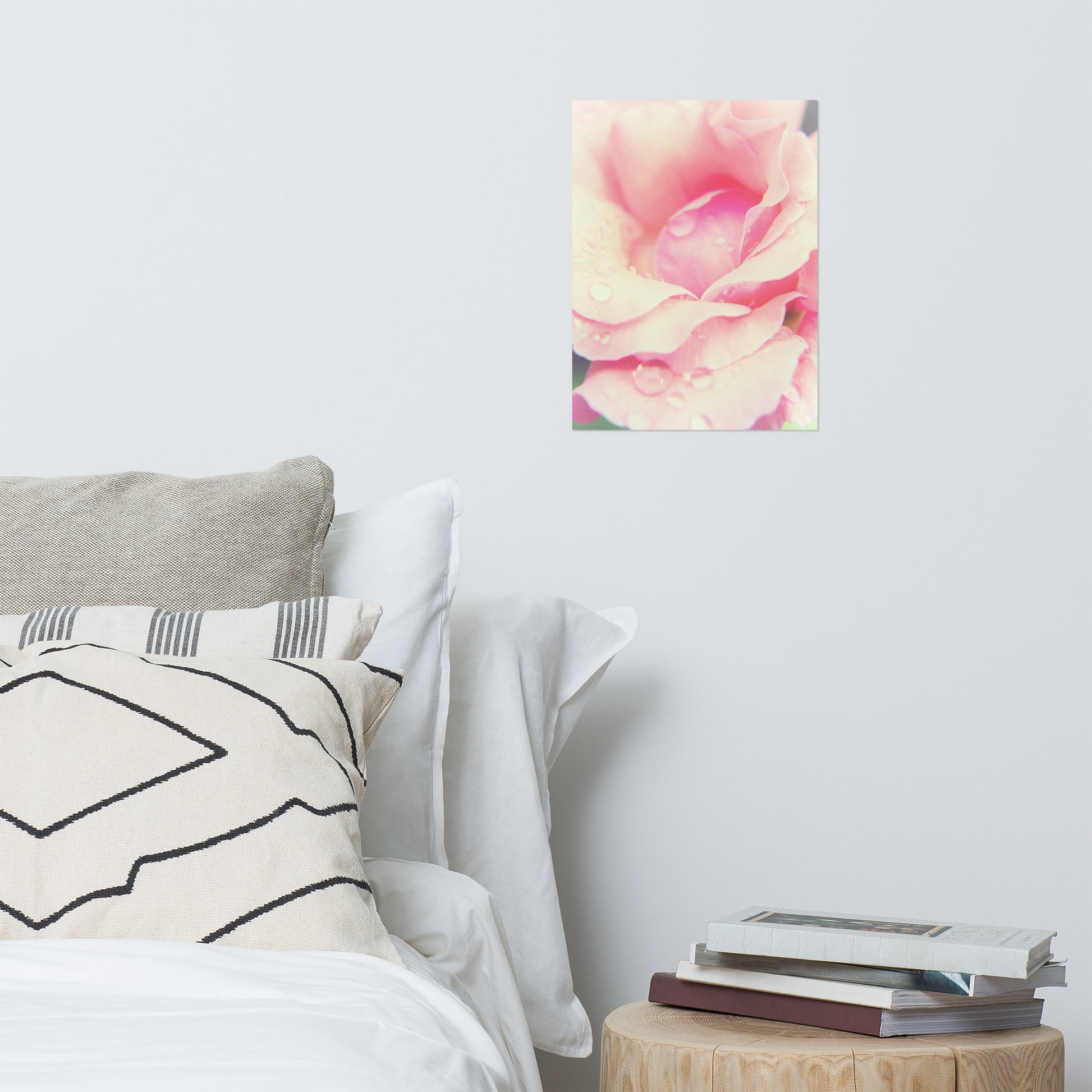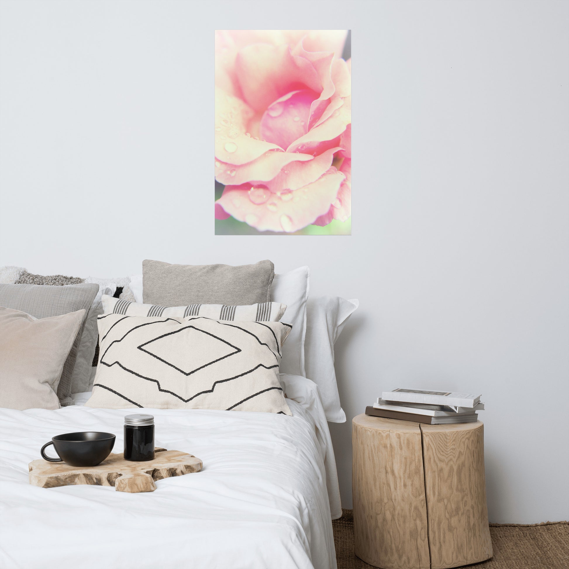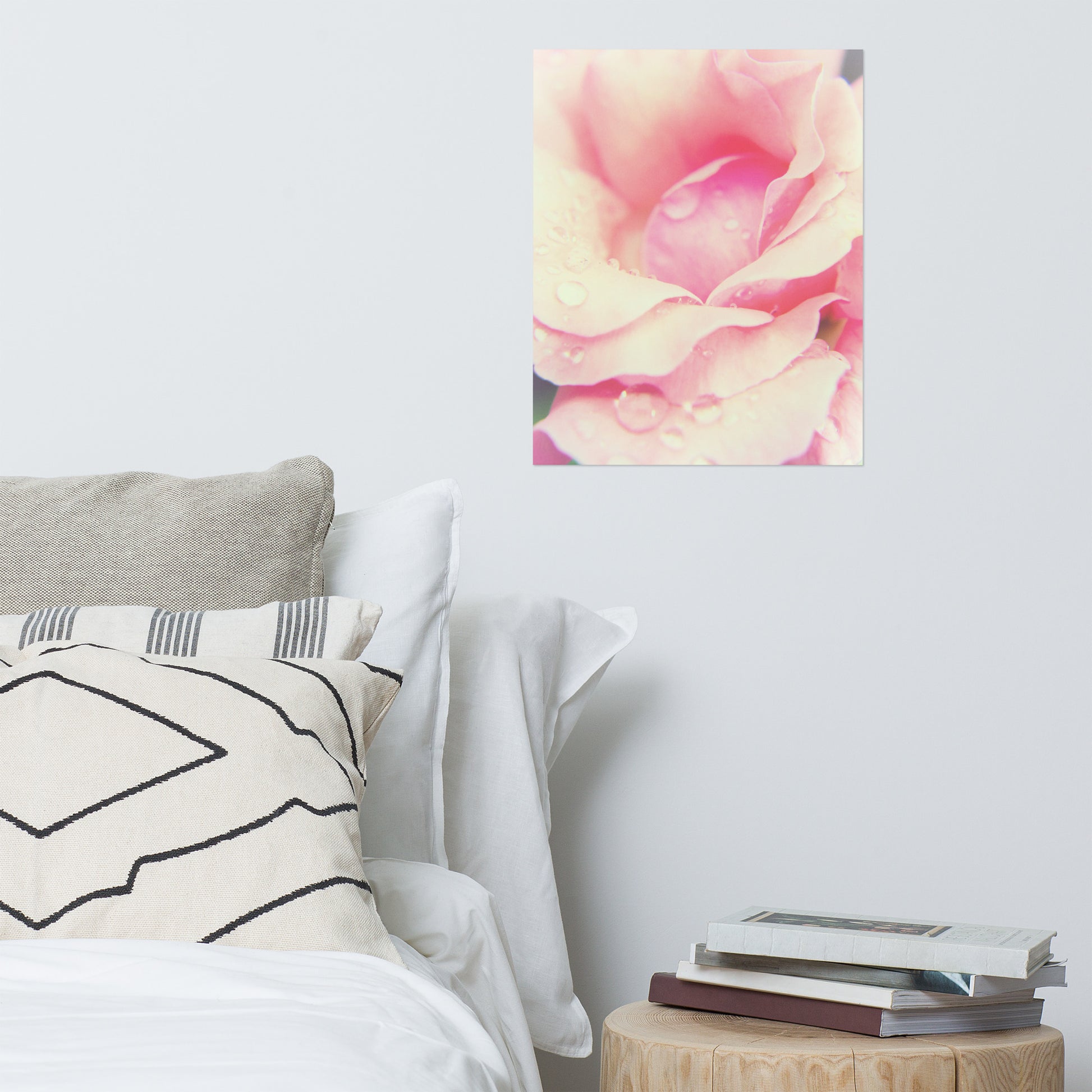 About these floral poster prints: "Softened Rose" is a tranquil and ethereal macrophotograph capturing the delicate beauty of a pale pink rose bathed in gentle light. Discovered in the serene Brandywine Park gardens of Wilmington, Delaware, this image showcases the flower's damp petals in exquisite detail. A white vignette and a dreamy overlay further enhance the soft, calming, and almost otherworldly atmosphere surrounding the rose.