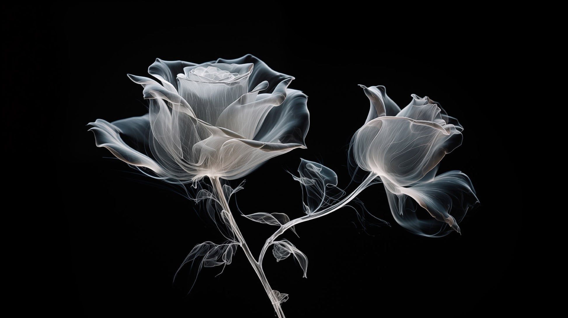 "Spectral Roses" is a photorealistic digital artwork showcasing two roses in a unique, x-ray-like style. The flowers, rendered in shades of white and gray, appear translucent, revealing their internal structures and delicate vein patterns. The petals, though detailed, have a ghostly, ethereal quality, contrasting starkly with the solid black background. The stems and leaves, also rendered in the same spectral style, appear delicate and almost fragile. The overall effect is one of mysterious beauty and quiet elegance, highlighting the intricate details of the roses in an unconventional way.