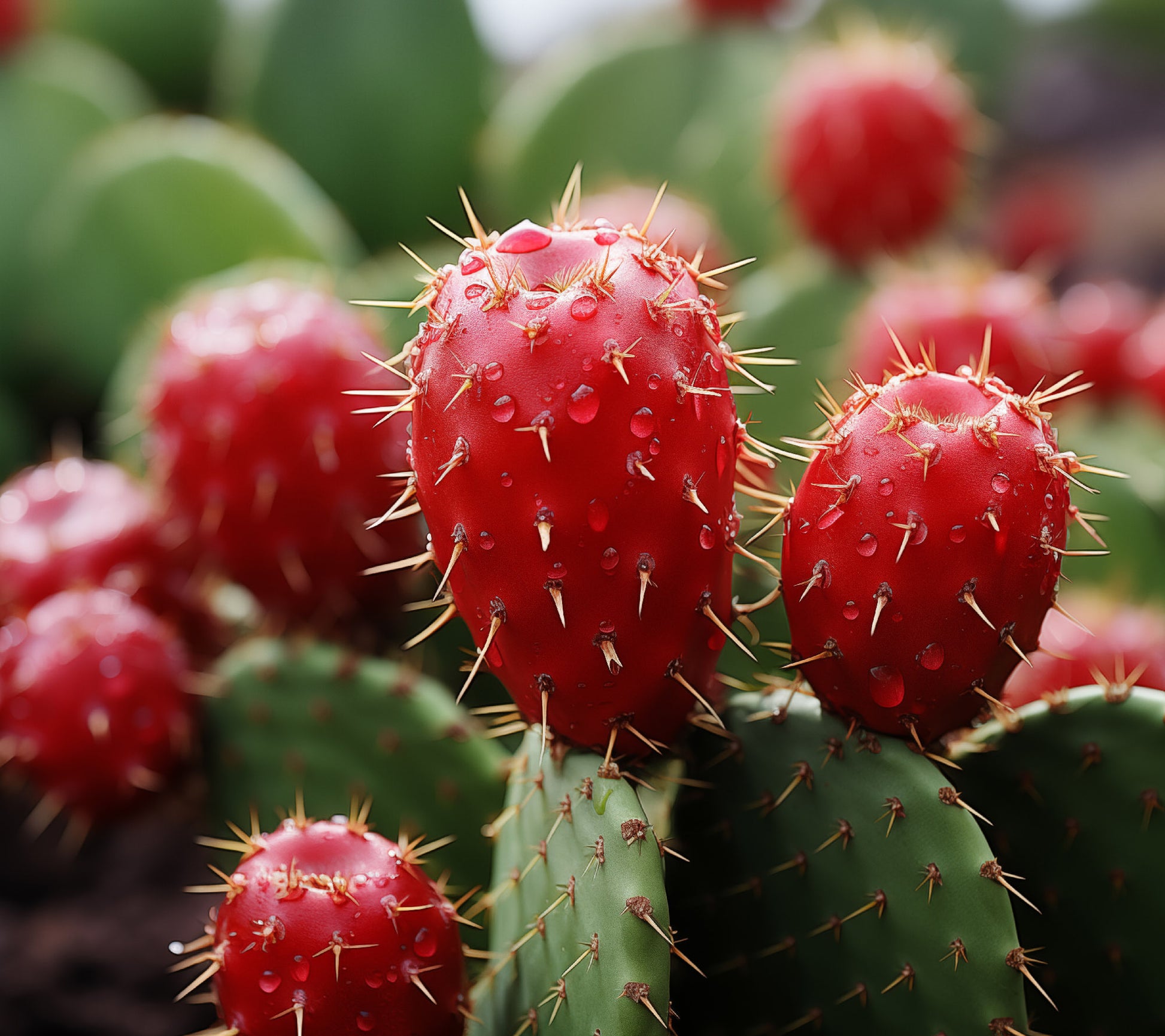 "Spiny Symphony" is a photorealistic digital artwork showcasing the vibrant beauty of prickly pear cacti. The image focuses on a cluster of bright red prickly pear fruits, their smooth, glossy skin punctuated by numerous spines. The fruits, rendered with meticulous detail, appear plump and juicy, their vibrant color contrasting with the muted green of the cactus pads. The pads, also rendered with realistic textures and subtle shading, form a backdrop for the fruits, creating a visually appealing composition. The background is intentionally blurred, allowing the viewer to focus entirely on the intricate details of the cacti.