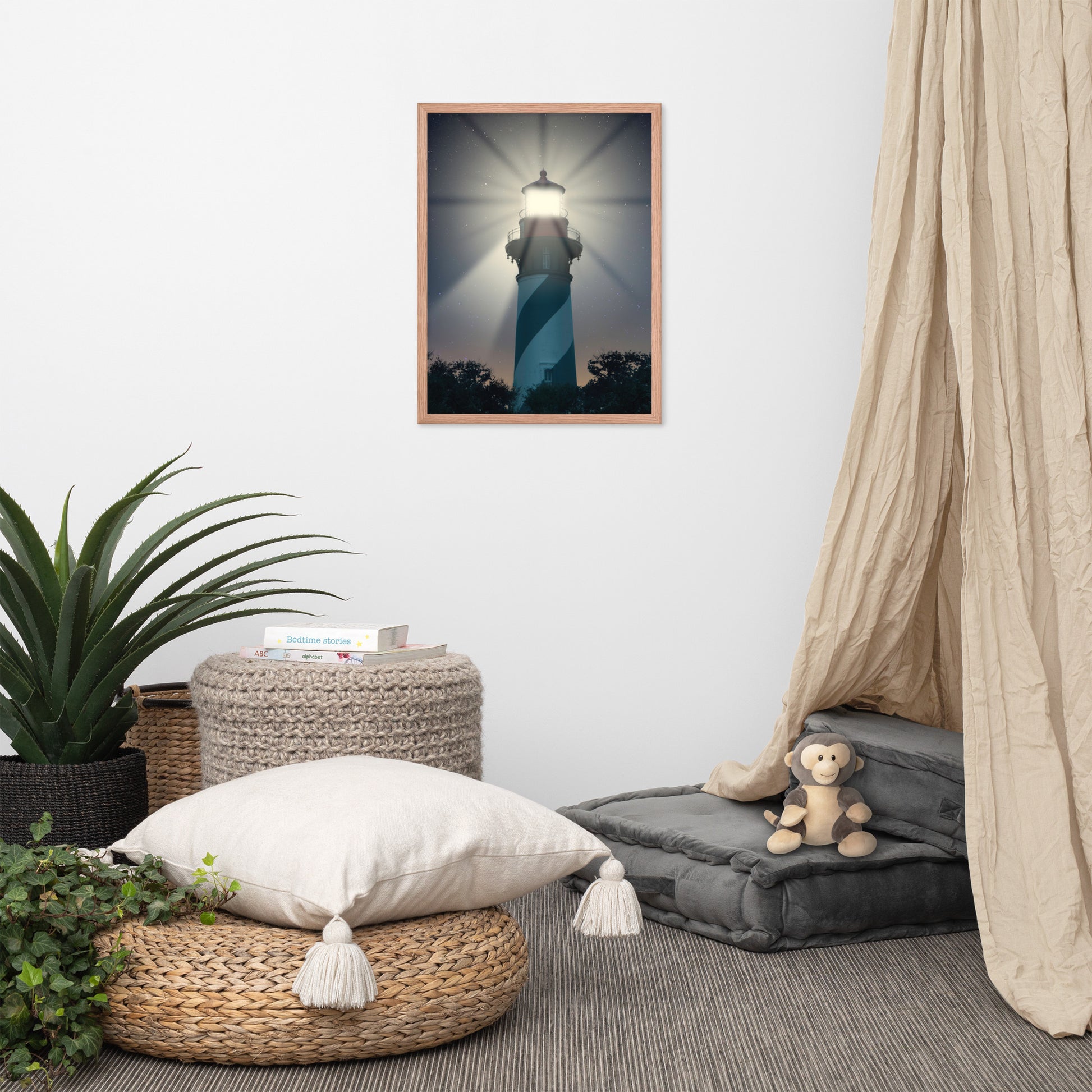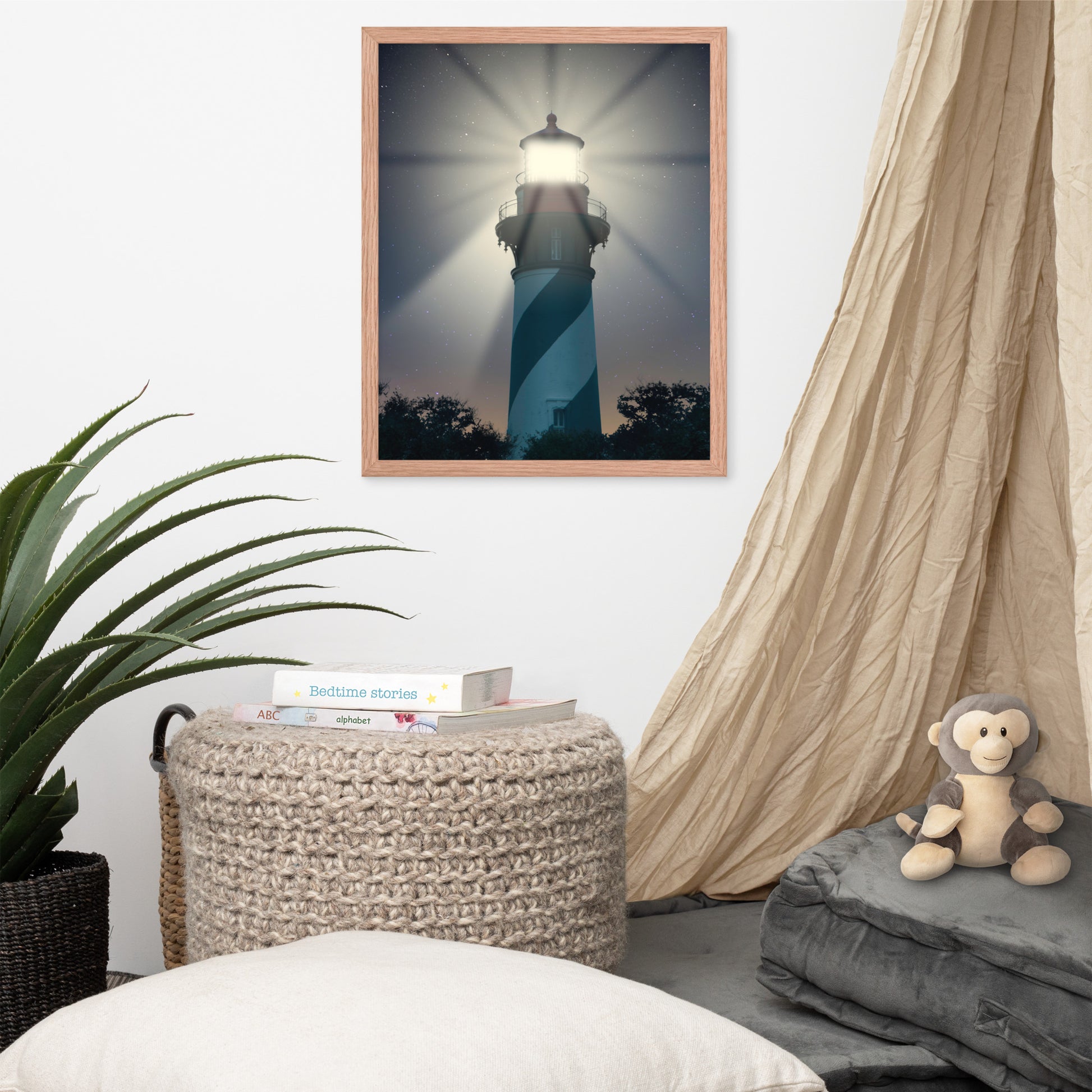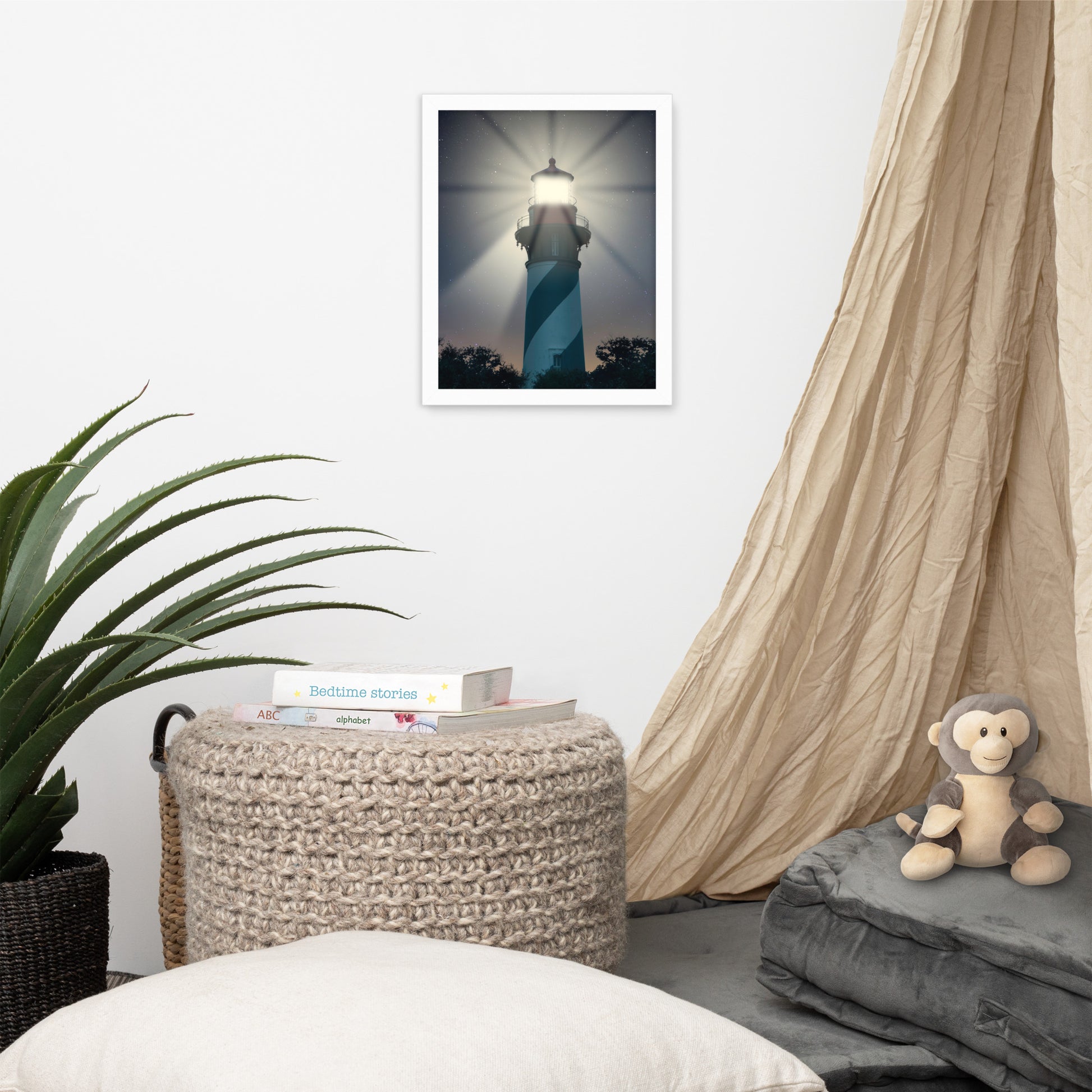 About this nautical framed wall art: Bring the enchantment of a moonlit night at sea into your home with our "St. Augustine Lighthouse Night Light" framed wall art. This mesmerizing print captures the iconic St. Augustine Lighthouse bathed in the soft glow of moonlight and its powerful beam reaching out into the star-studded sky.