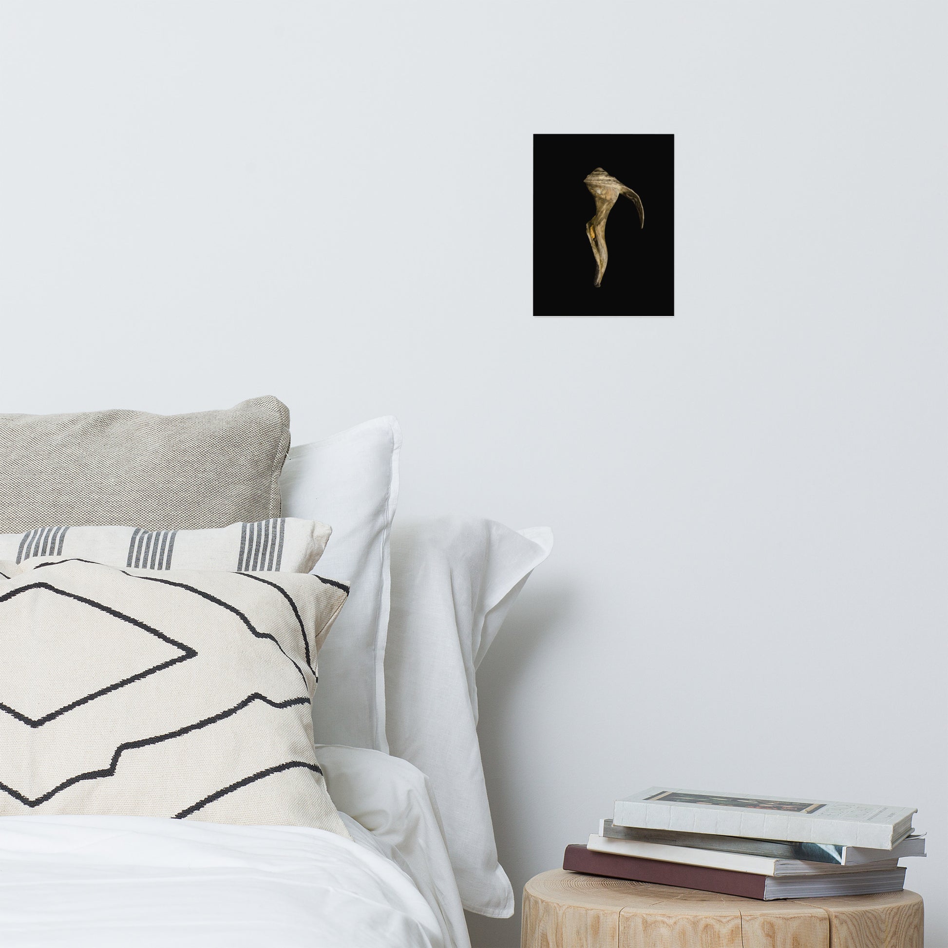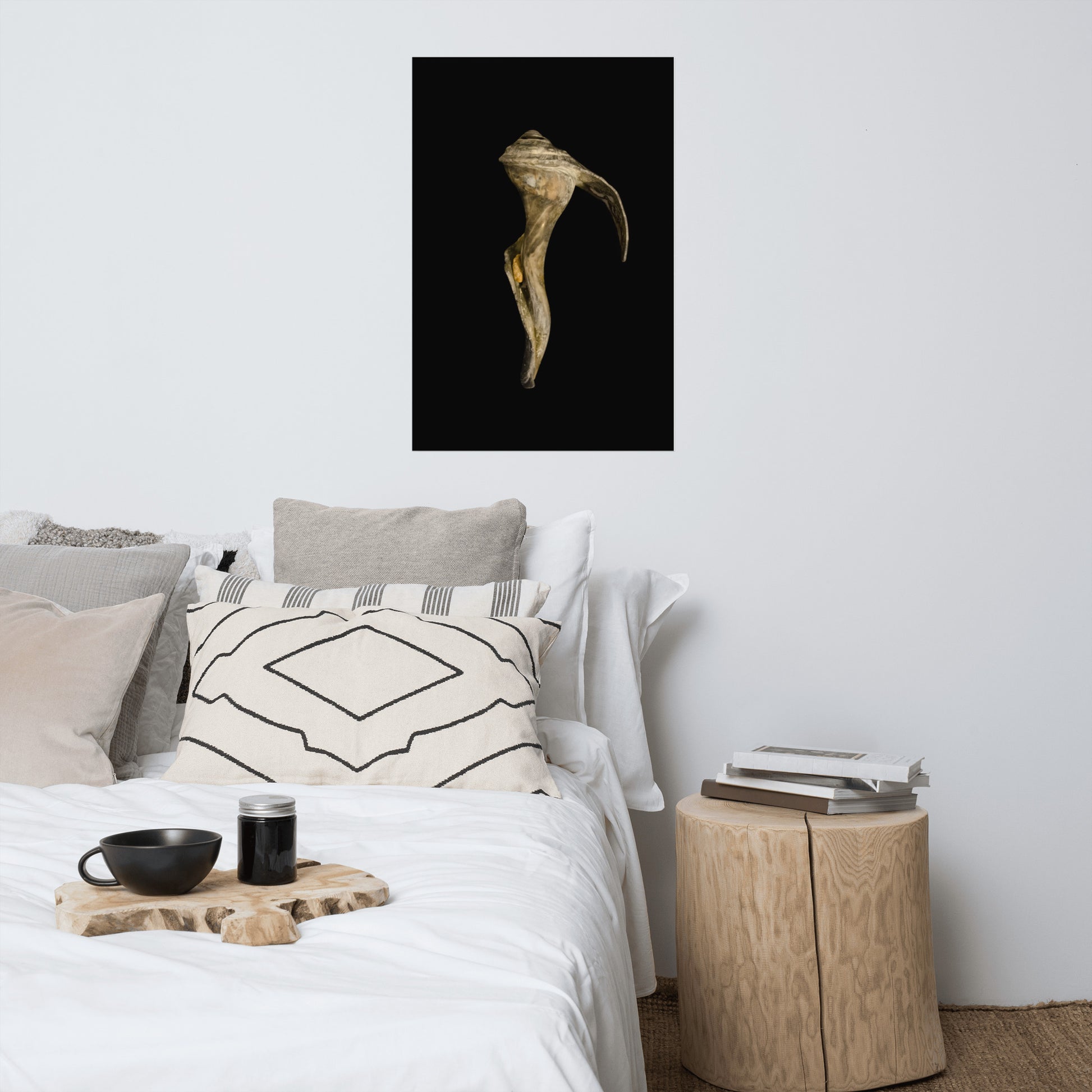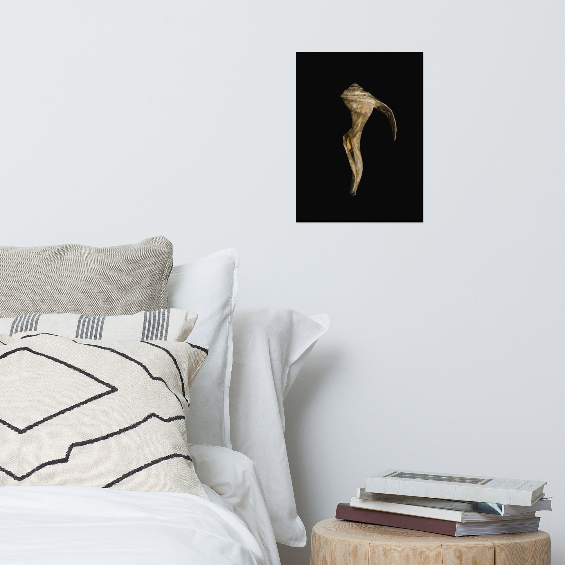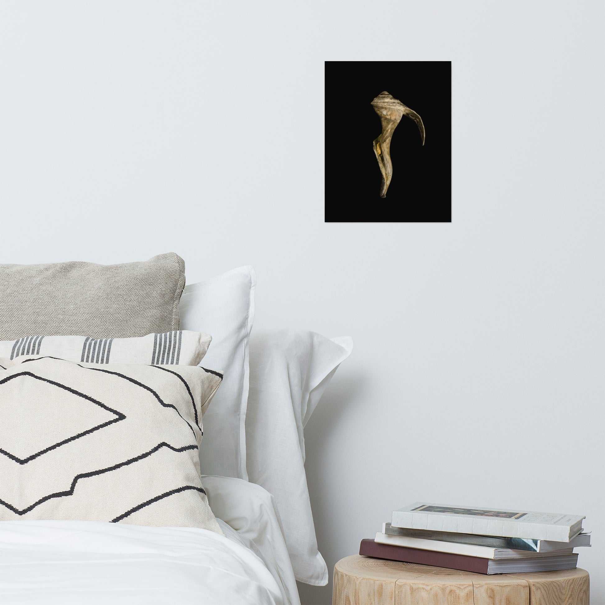 Photographed against a stark black background, the shell's curves, hues, and textures are brought to the forefront, inviting you to contemplate the passage of time and the delicate artistry of erosion. This striking print is a perfect addition to any space, adding a touch of coastal allure and a reminder of the hidden treasures found in the most unexpected places.