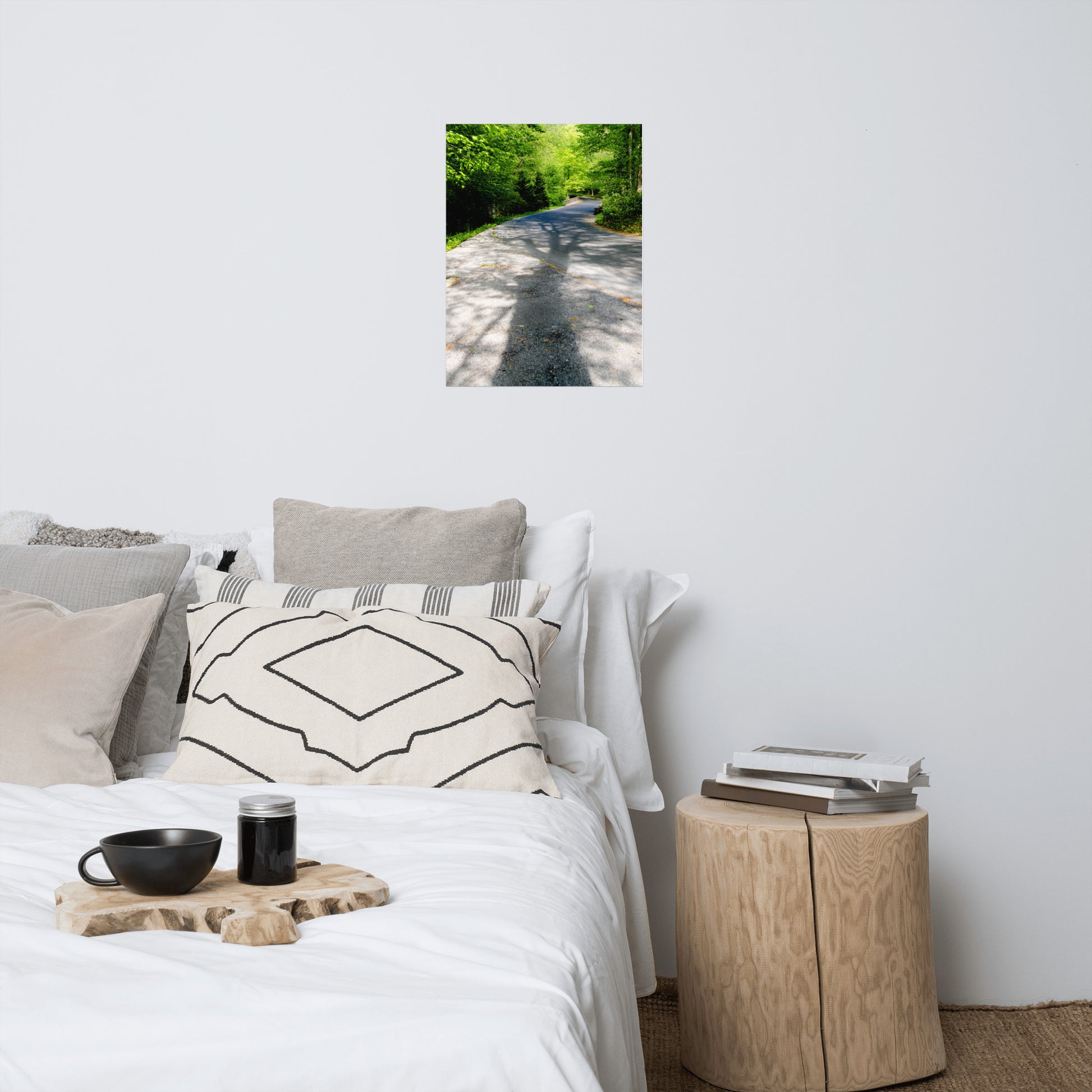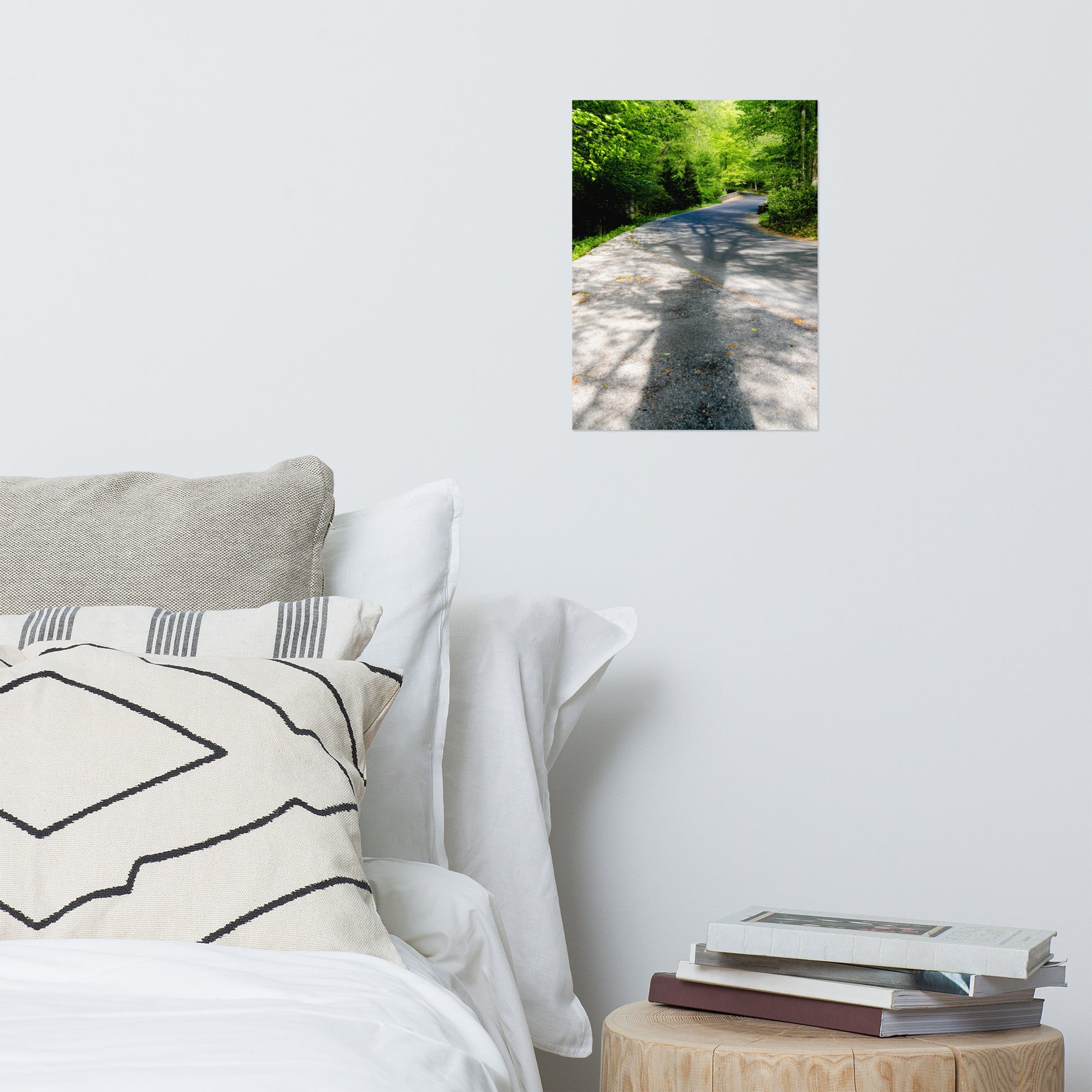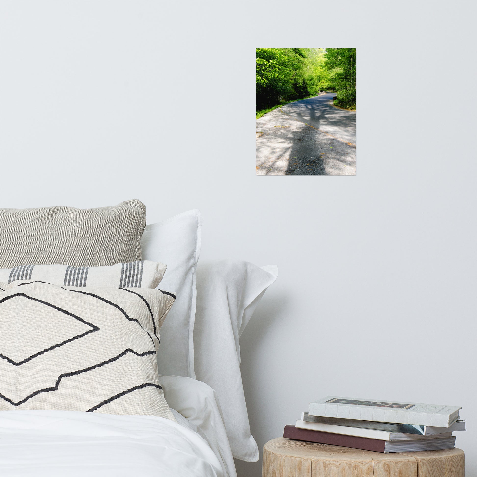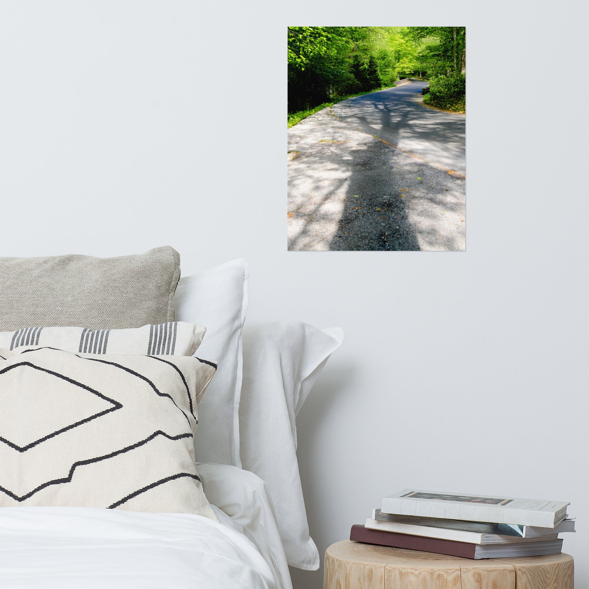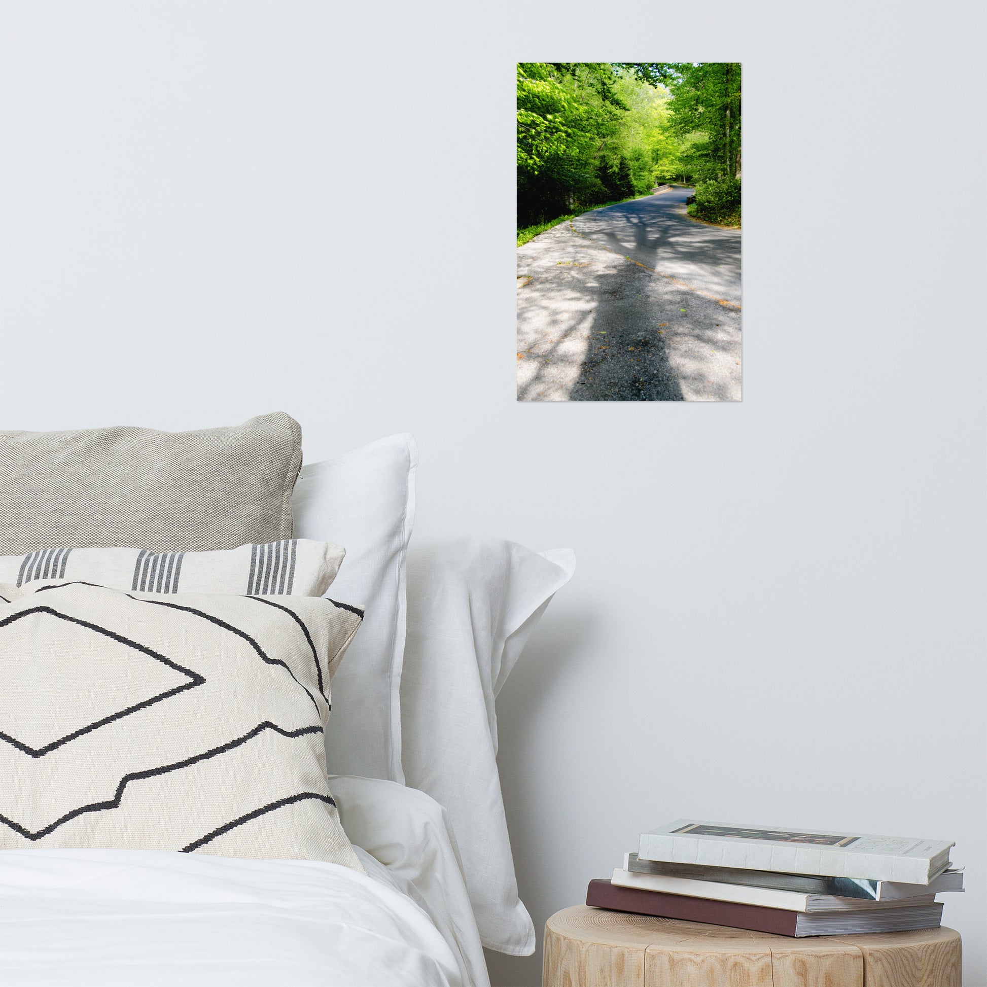 The photographer was inspired by the early evening sun, which cast deep shadows that aligned perfectly with the tree-lined path, resulting in this unique composition. Bring the tranquility of nature into your home with this stunning print, a perfect addition to any art collection.