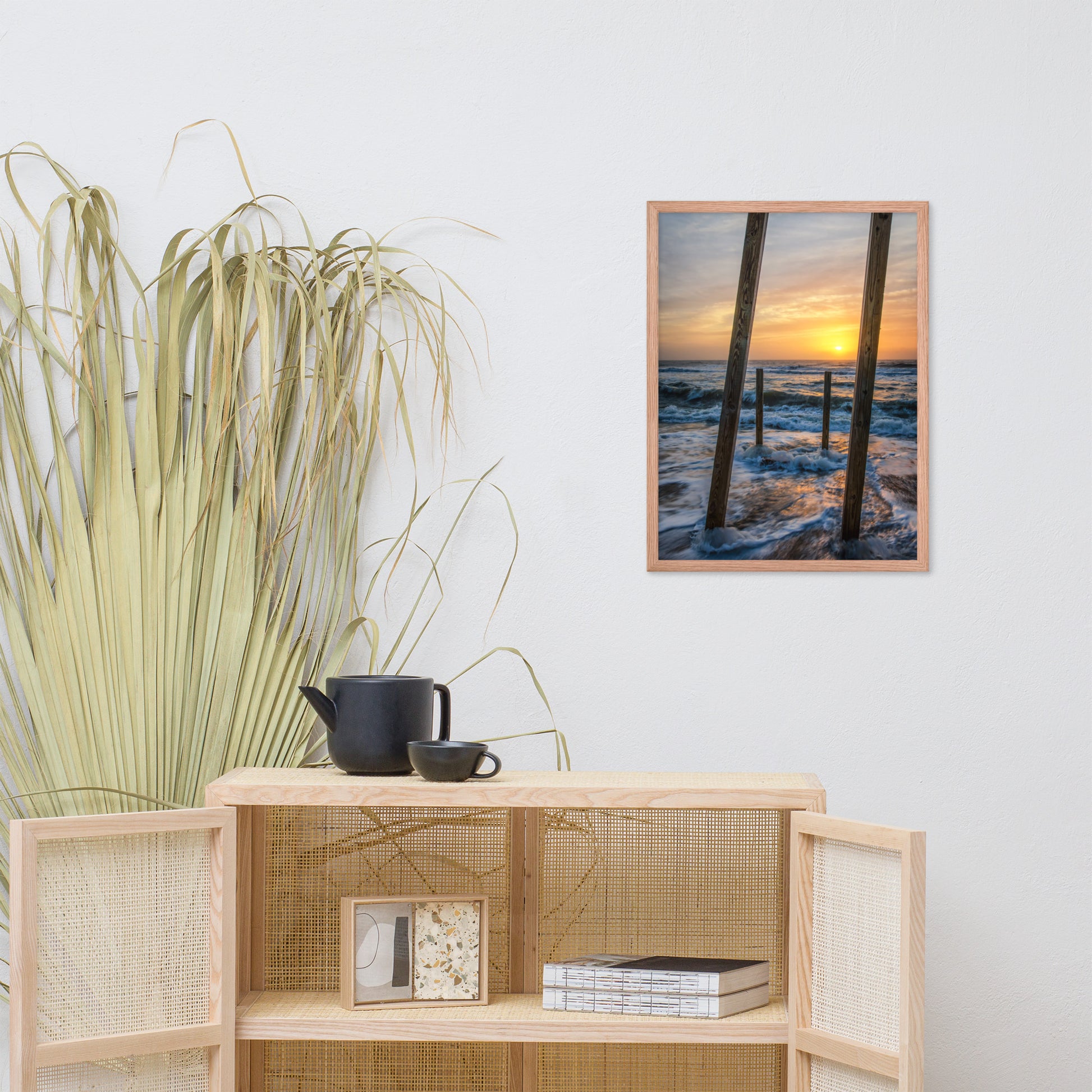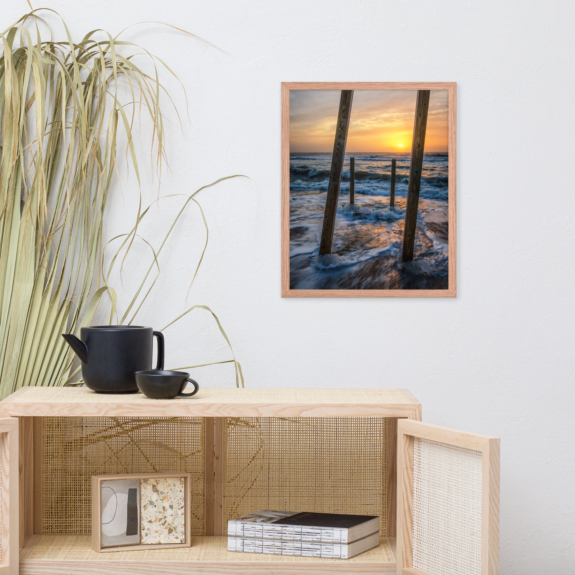 Bring the calming beauty of the coast into your everyday life with "Sunrise Between the Pillars." Order your framed wall art print today and experience the transformative power of art.