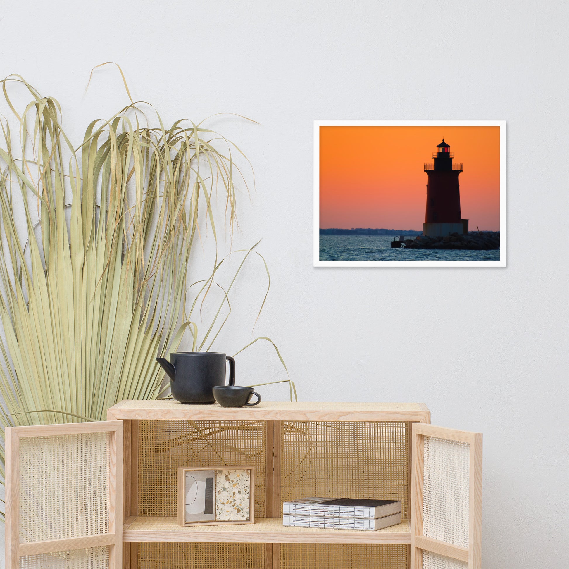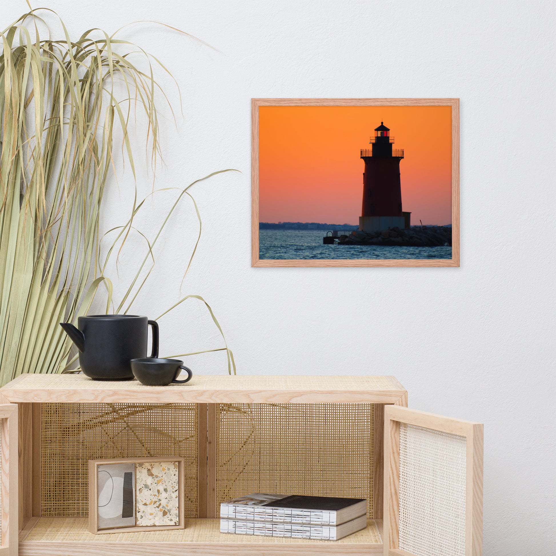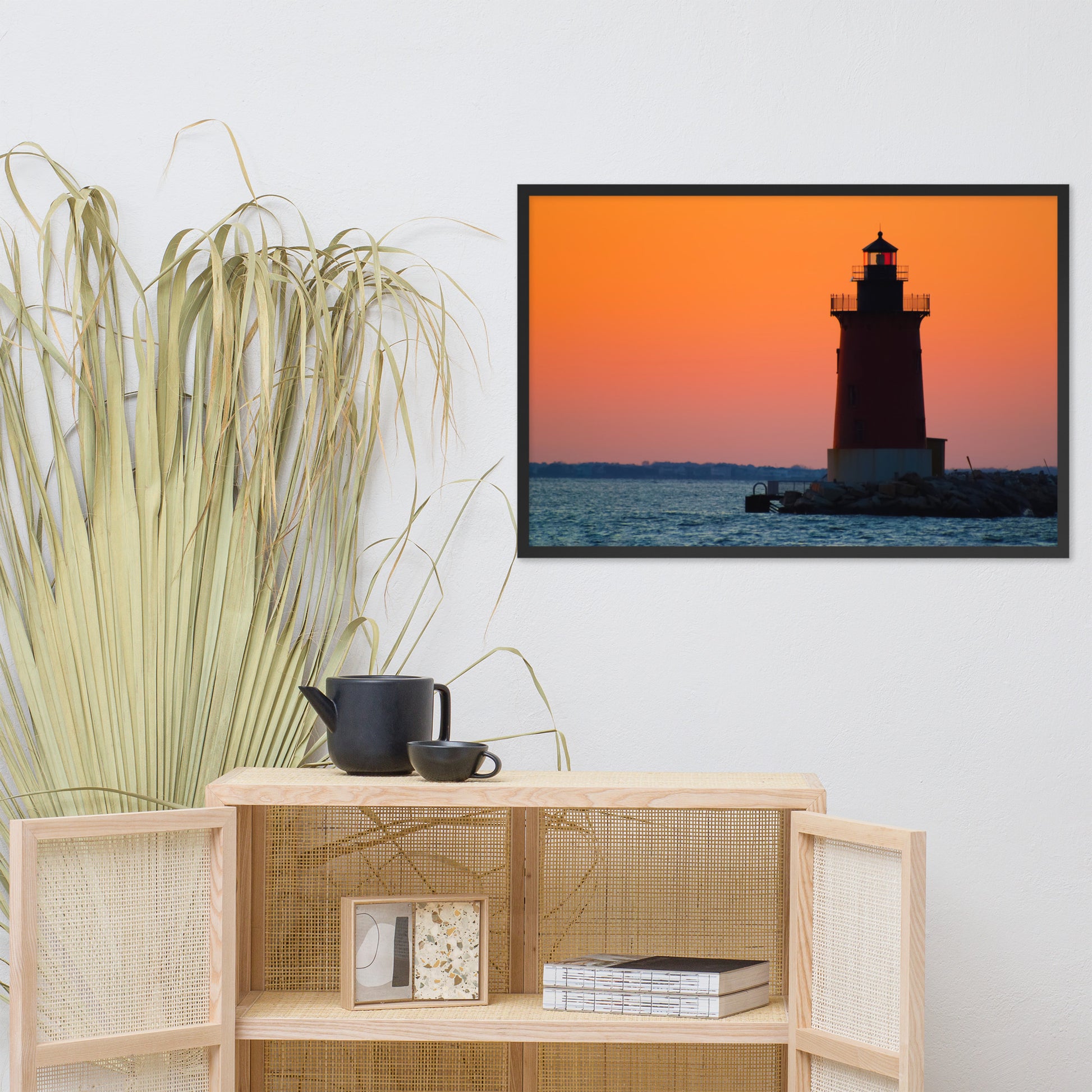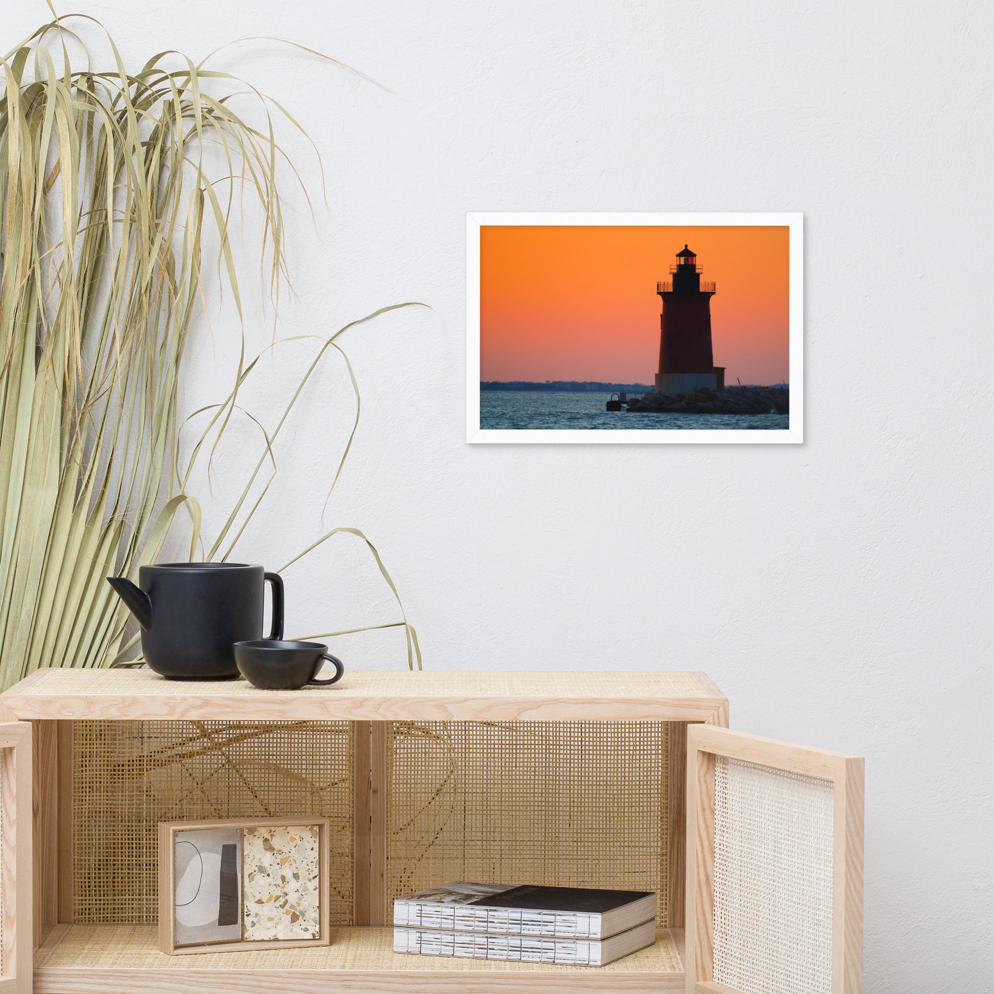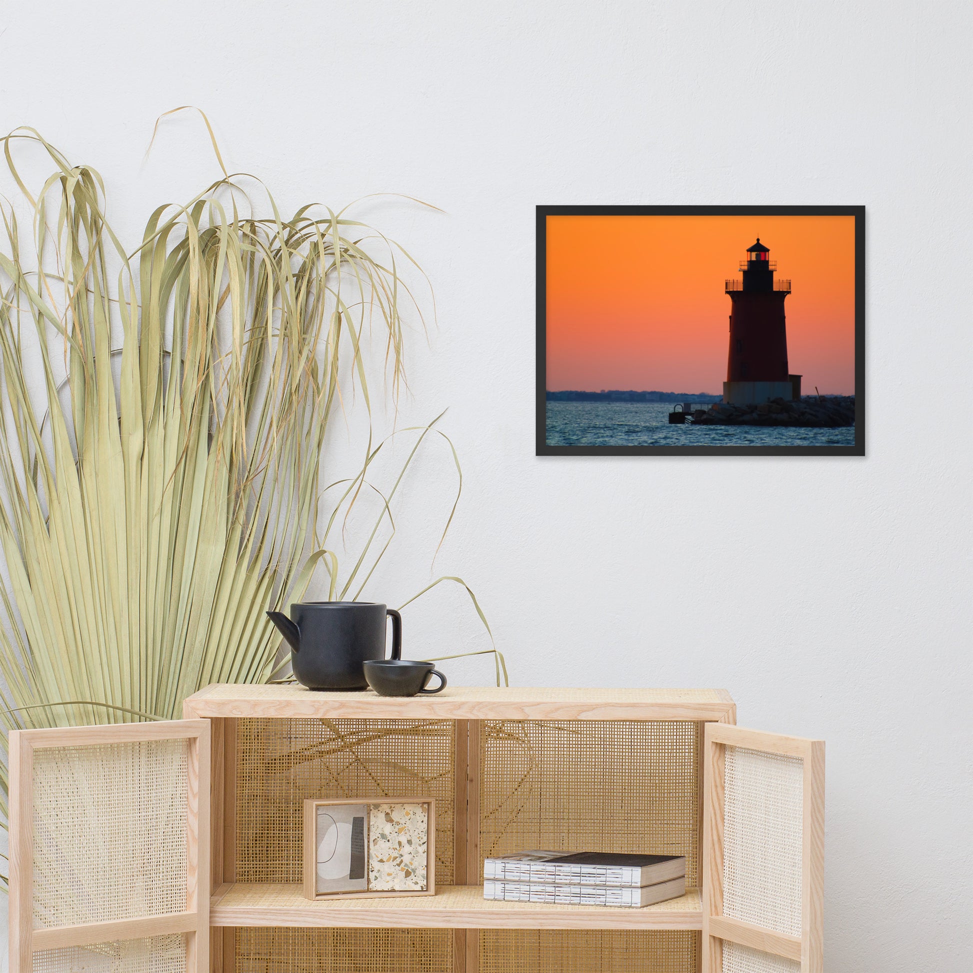 Perfect for any room in your home or office, this framed print invites viewers to pause and reflect upon the beauty of nature's artistry. The vibrant orange and pink sky, the dark silhouette of the lighthouse, and the gentle ripples of the water create a harmonious scene that evokes feelings of peace and tranquility.