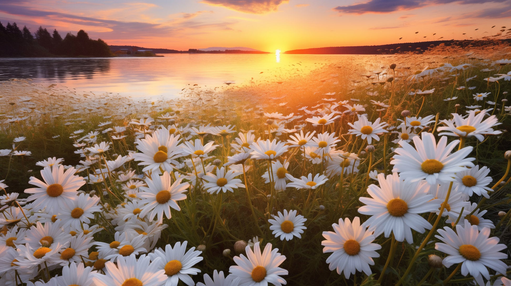 "Sunset Serenade" is a digitally created image showcasing a vast field of daisies stretching towards a tranquil lake at sunset. The photorealistic rendering captures the delicate details of the daisies, their white petals and yellow centers, creating a focal point that is both eye-catching and calming. The warm glow of the setting sun illuminates the scene, casting a golden light across the field and the lake, enhancing the natural beauty of the landscape. The lake reflects the vibrant colors of the sky, adding depth and dimension to the composition. The overall effect is one of serene beauty and peaceful harmony, celebrating the simple elegance of a field of daisies at dusk.