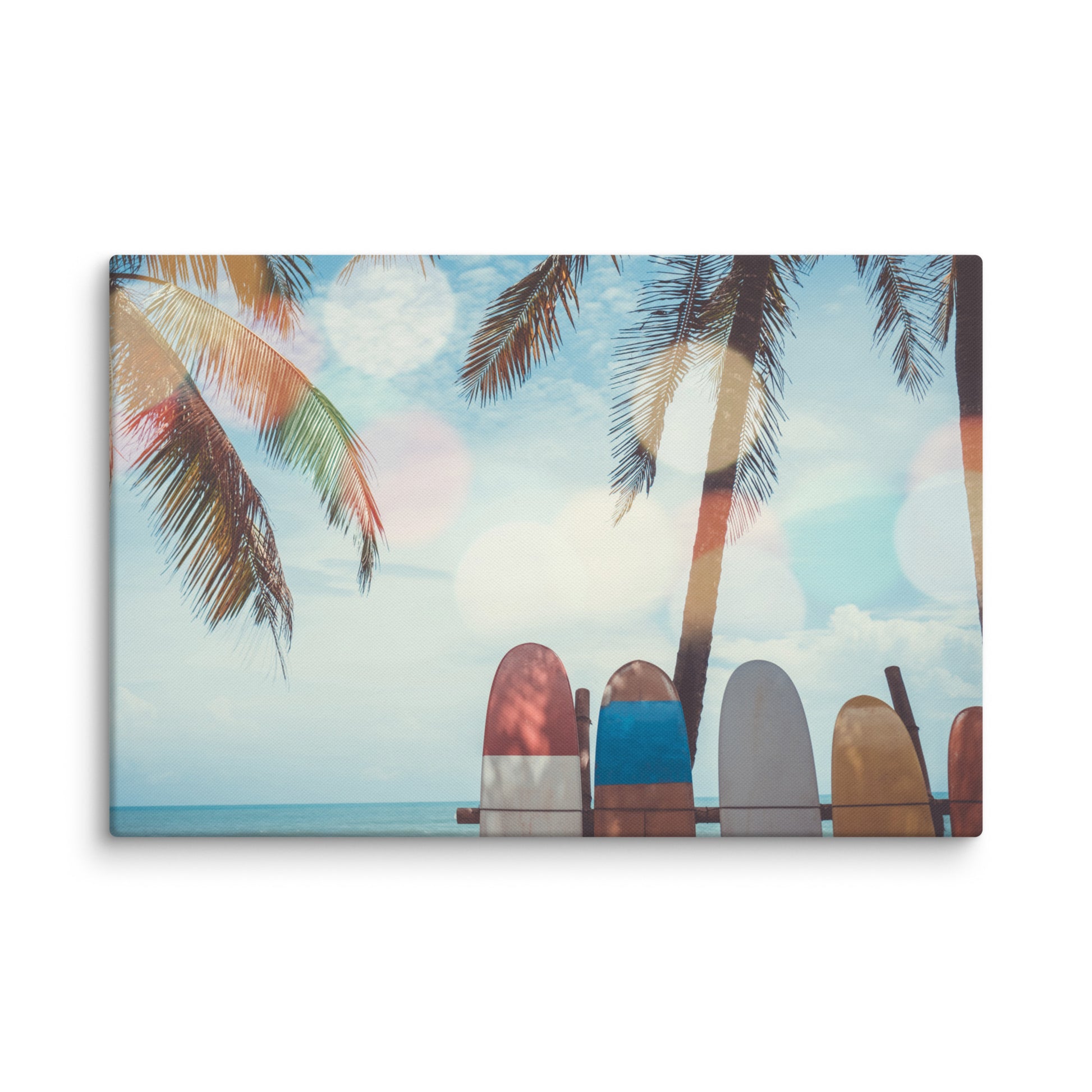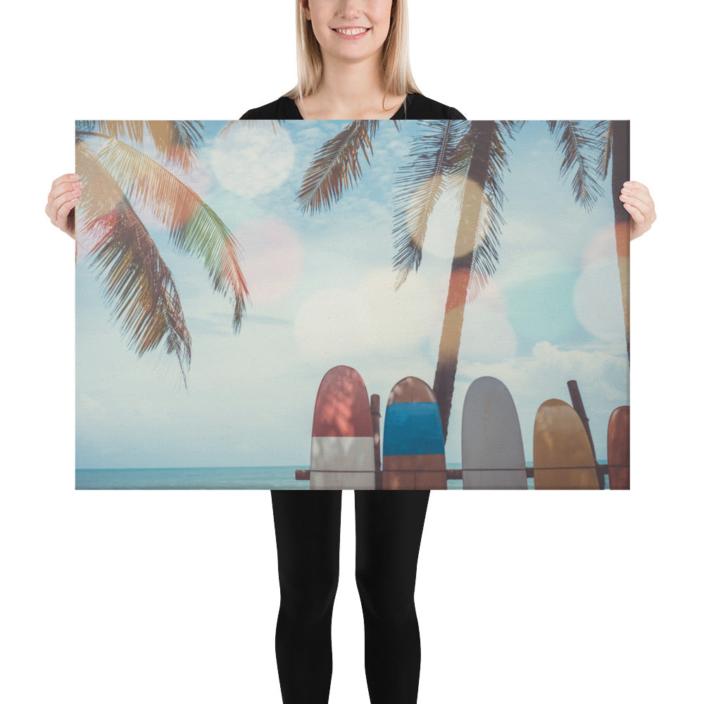 About these beach canvases: Imagine this the gentle caress of warm sand between your toes, the invigorating tang of salt spray on your skin. Close your eyes and picture the scene - surfboards languidly propped against swaying palm trees, the endless expanse of the ocean shimmering a mesmerizing turquoise under a cloudless sky. This isn't just a daydream, it's the embodiment of your perfect escape. Here, amidst the tranquility of the ocean breeze, your worries dissolve like grains of sand slipping through your fingers. The rhythmic crash of the waves becomes the soundtrack to your life, a constant reminder of the peace and rejuvenation that awaits you. Bask in that feeling everyday with this canvas wall art print.