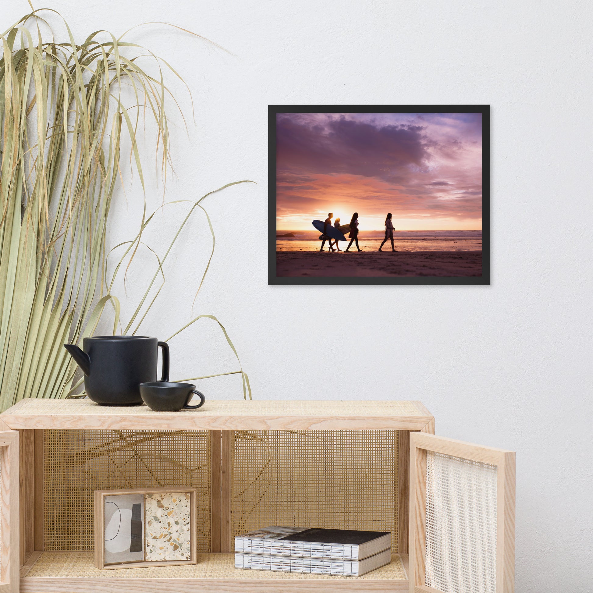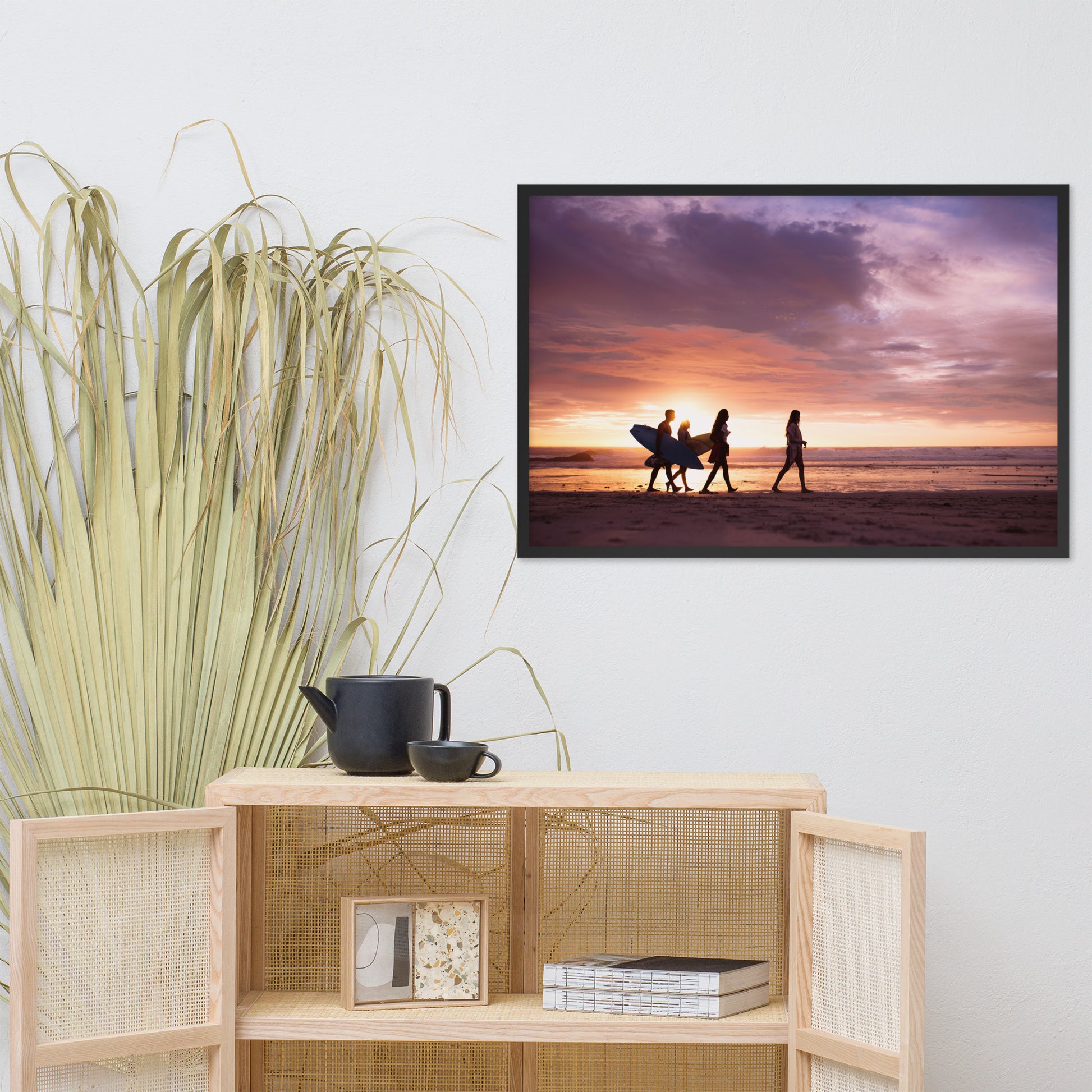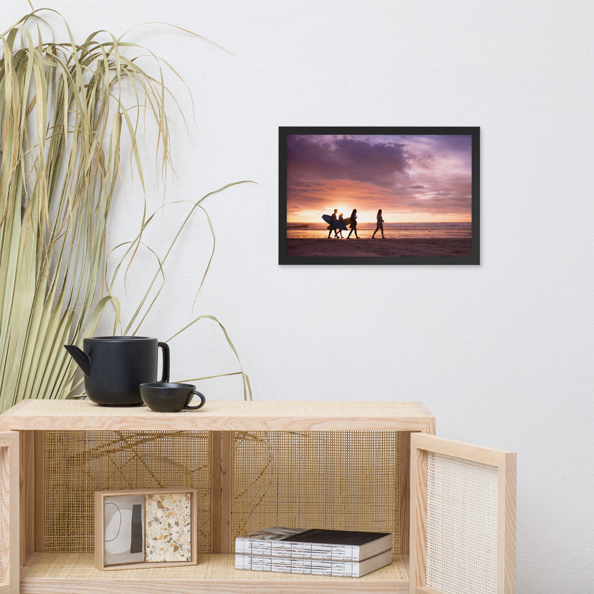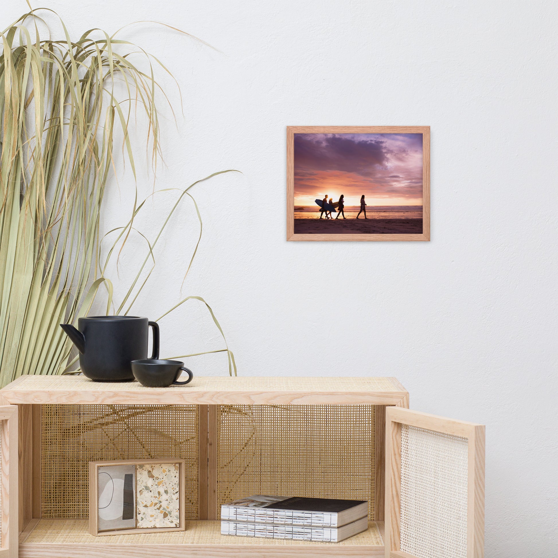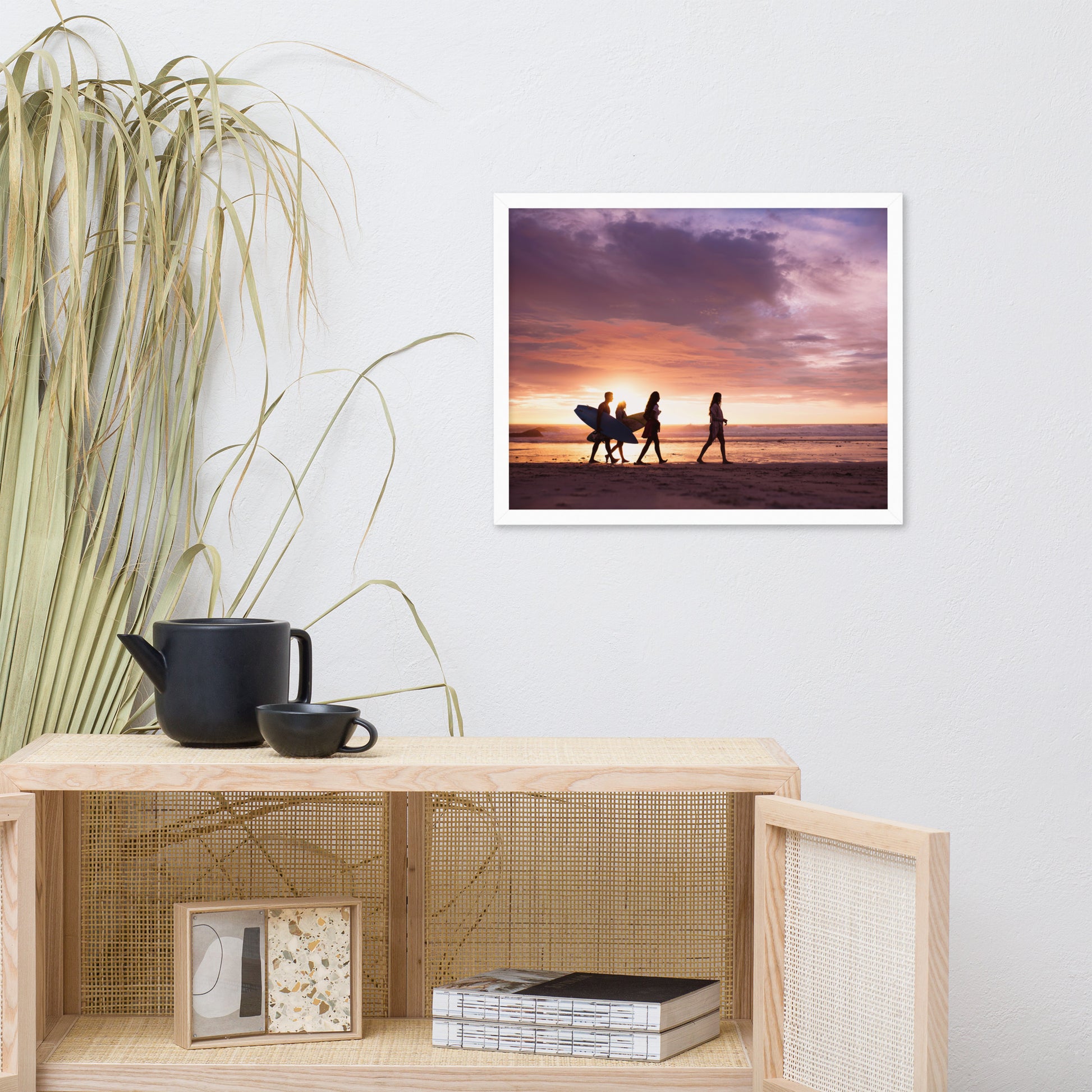 Surf Artwork: Surfers and Sunset on the Shore Coastal Landscape Lifestyle Photograph Framed Wall Art Print