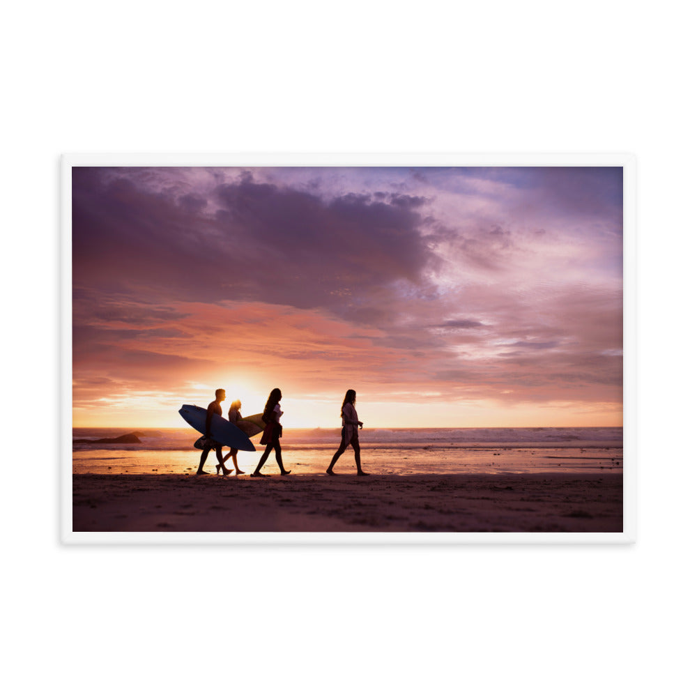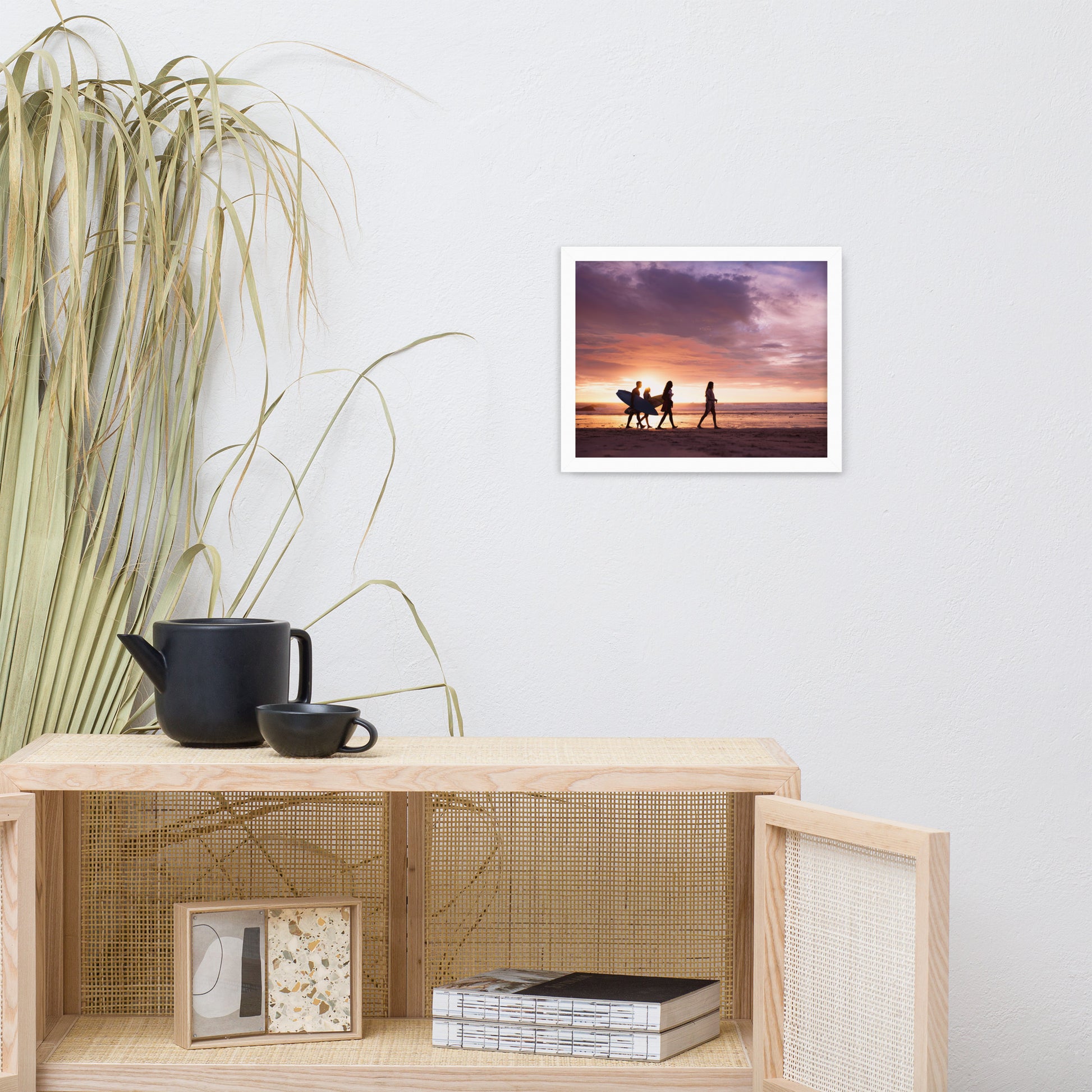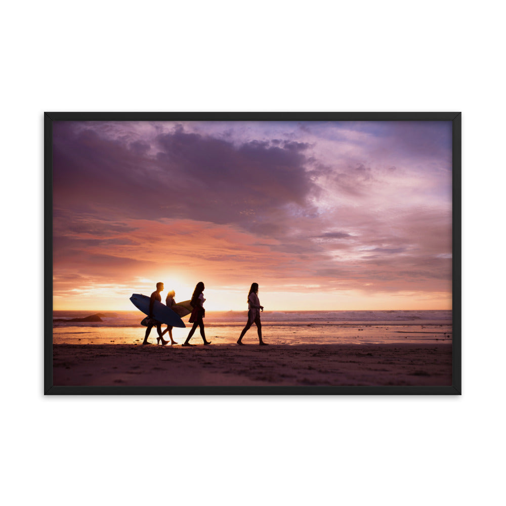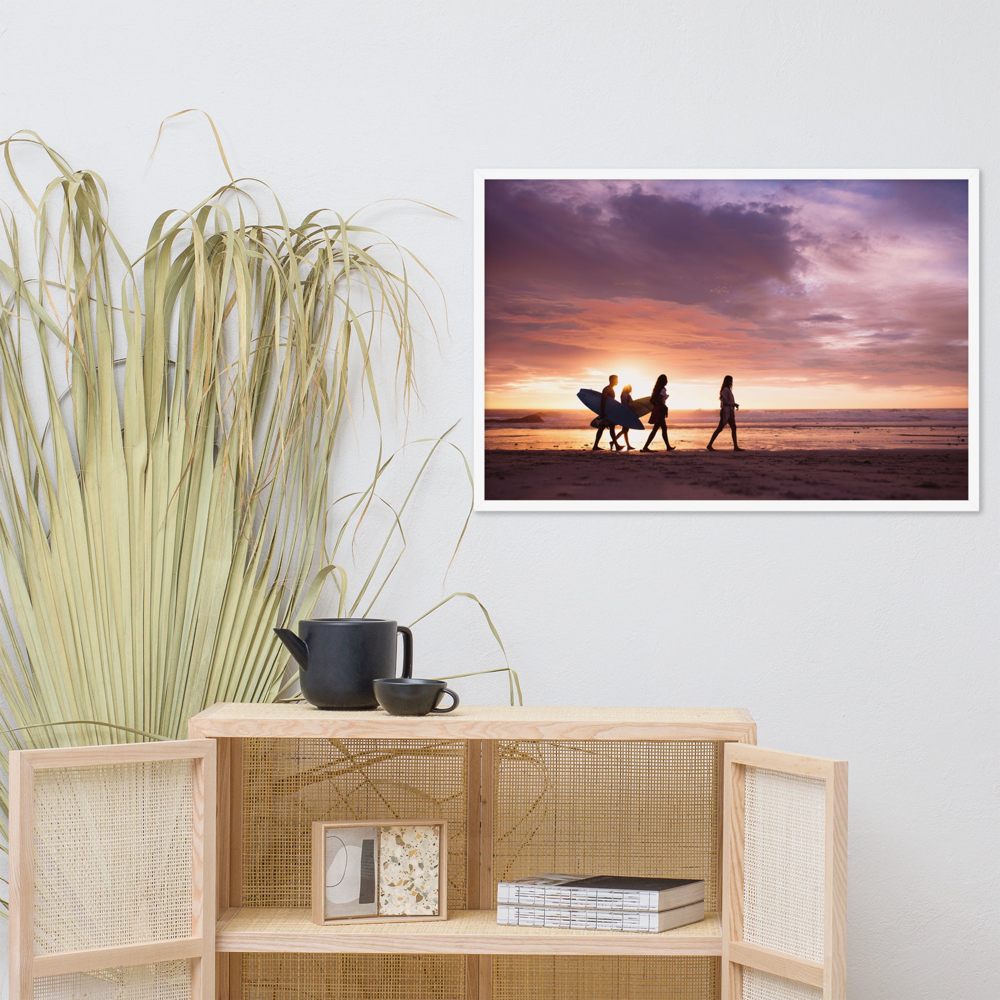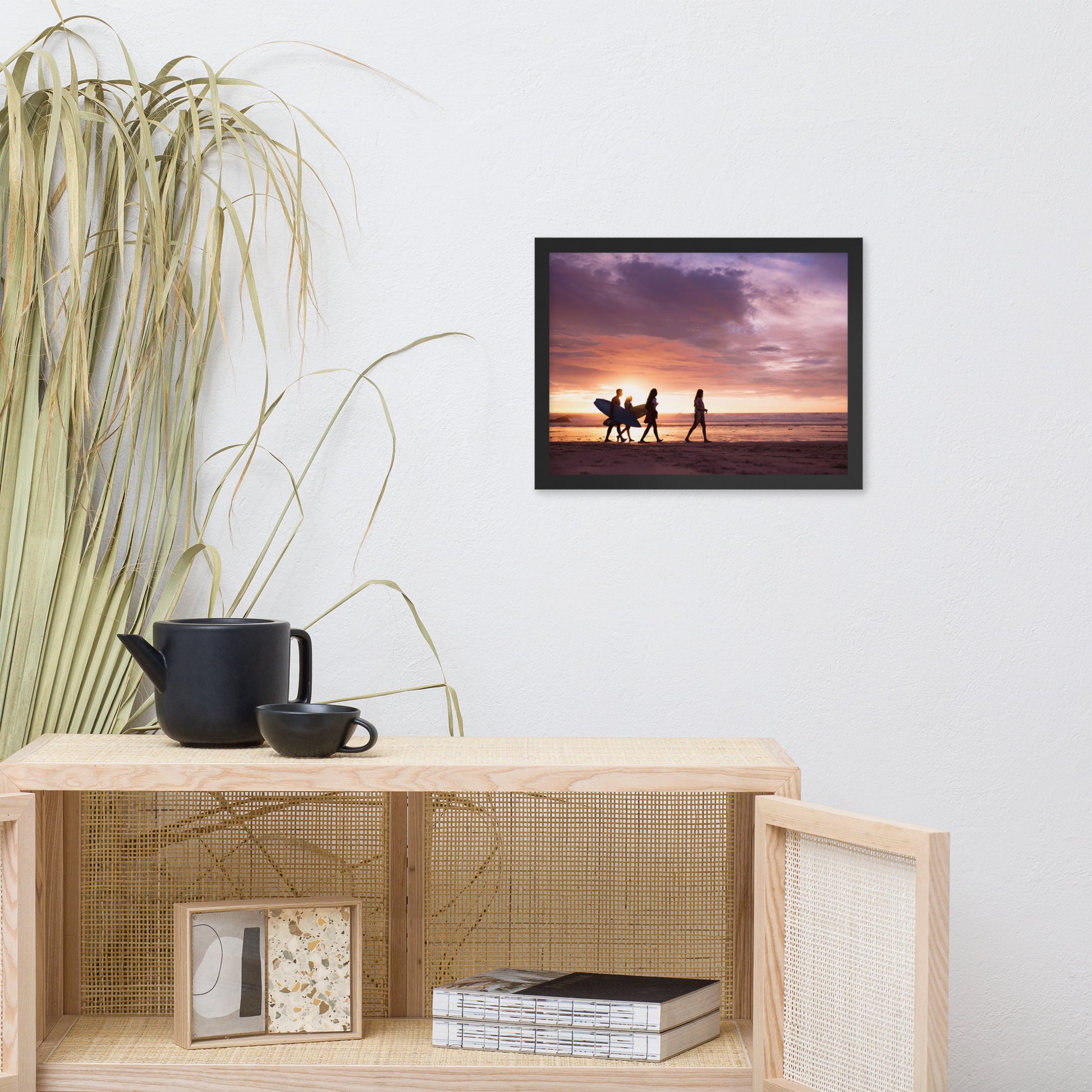 Surf Artwork: Surfers and Sunset on the Shore Coastal Landscape Lifestyle Photograph Framed Wall Art Print