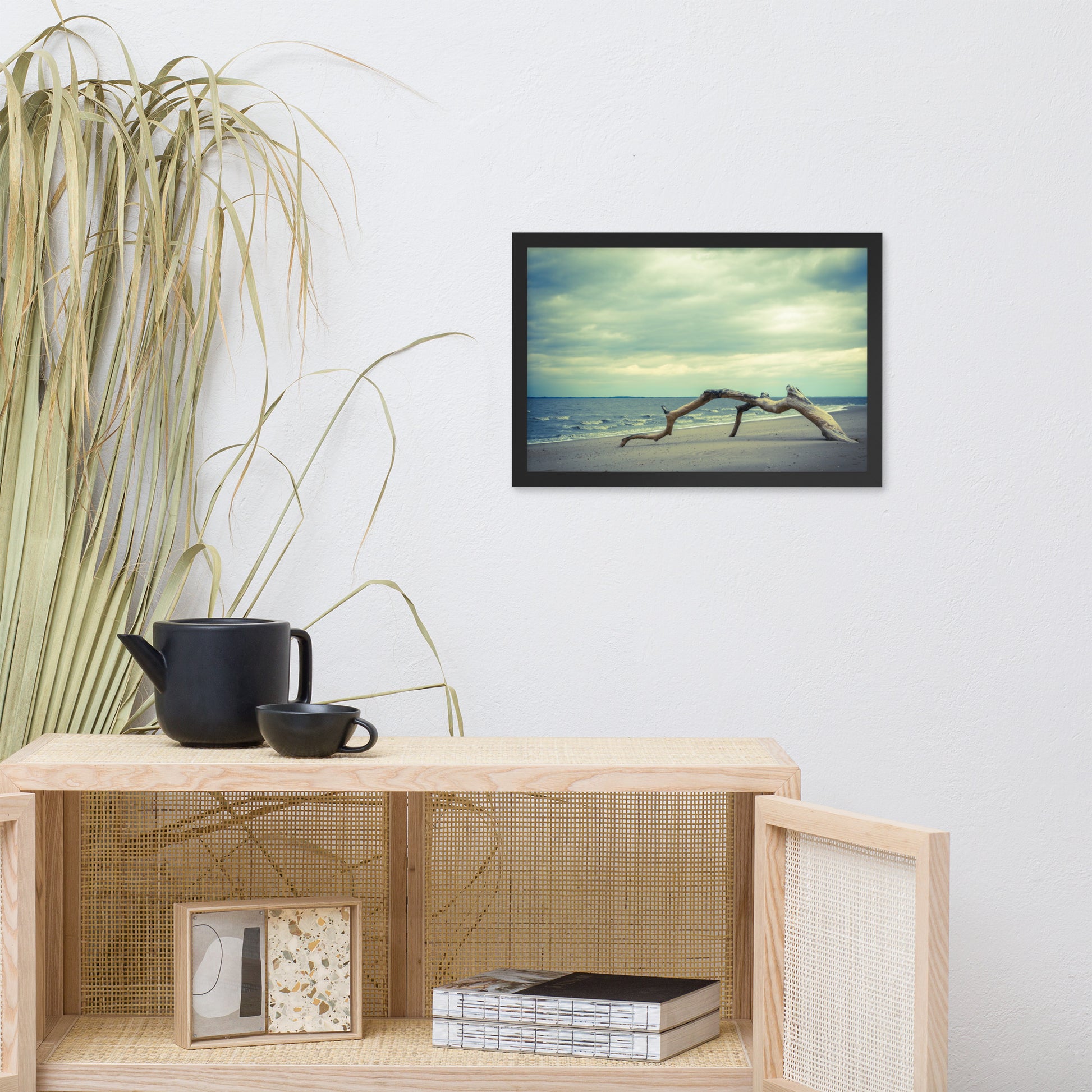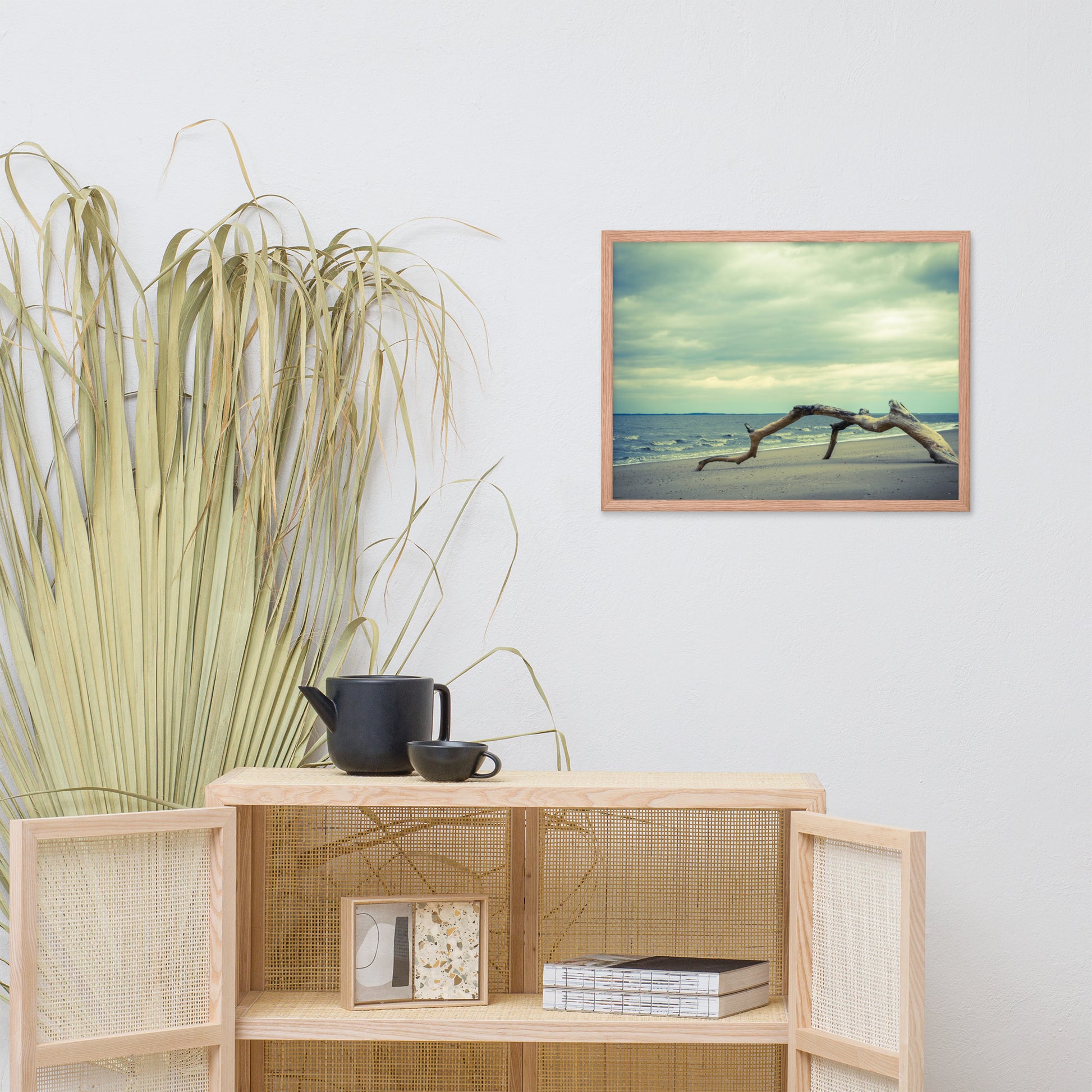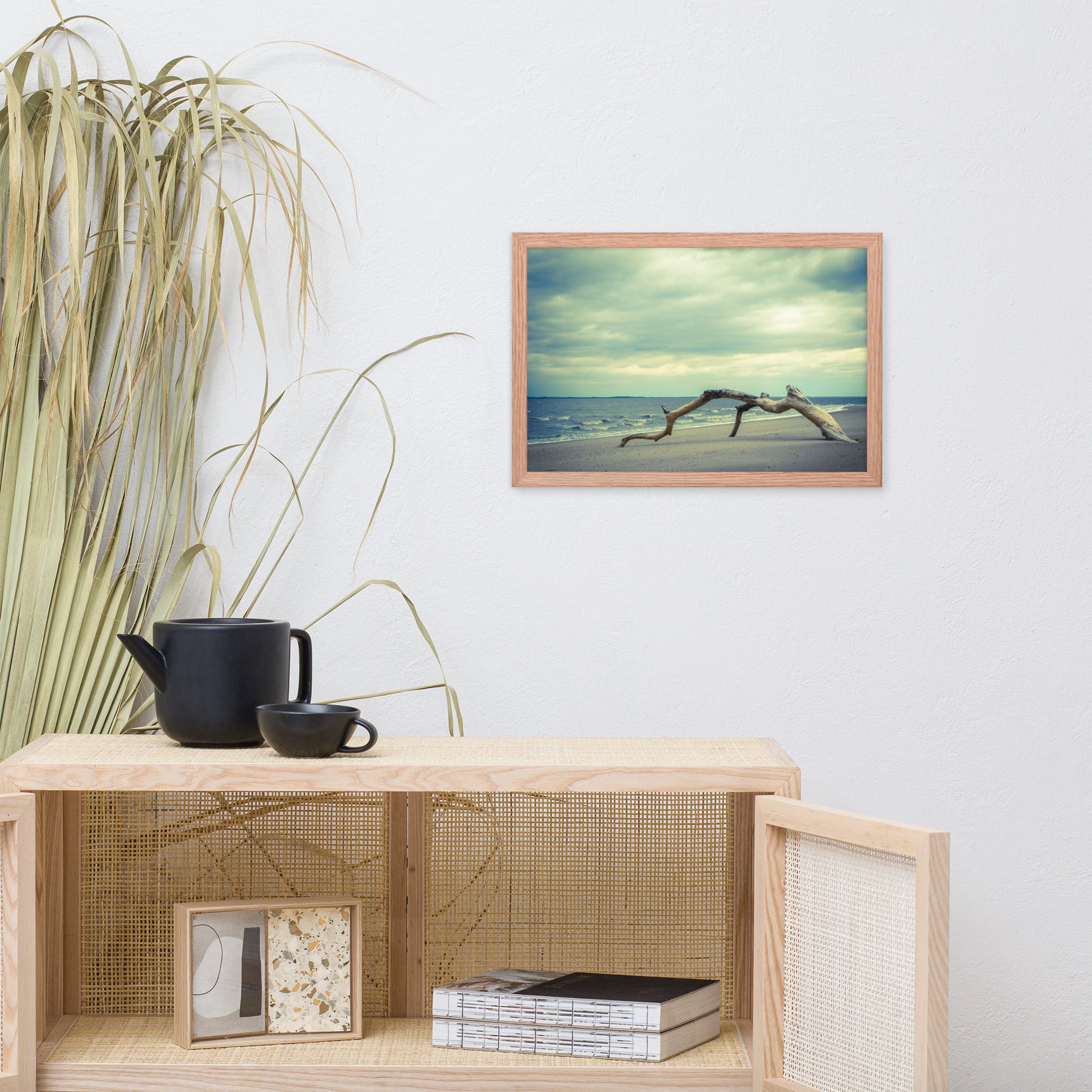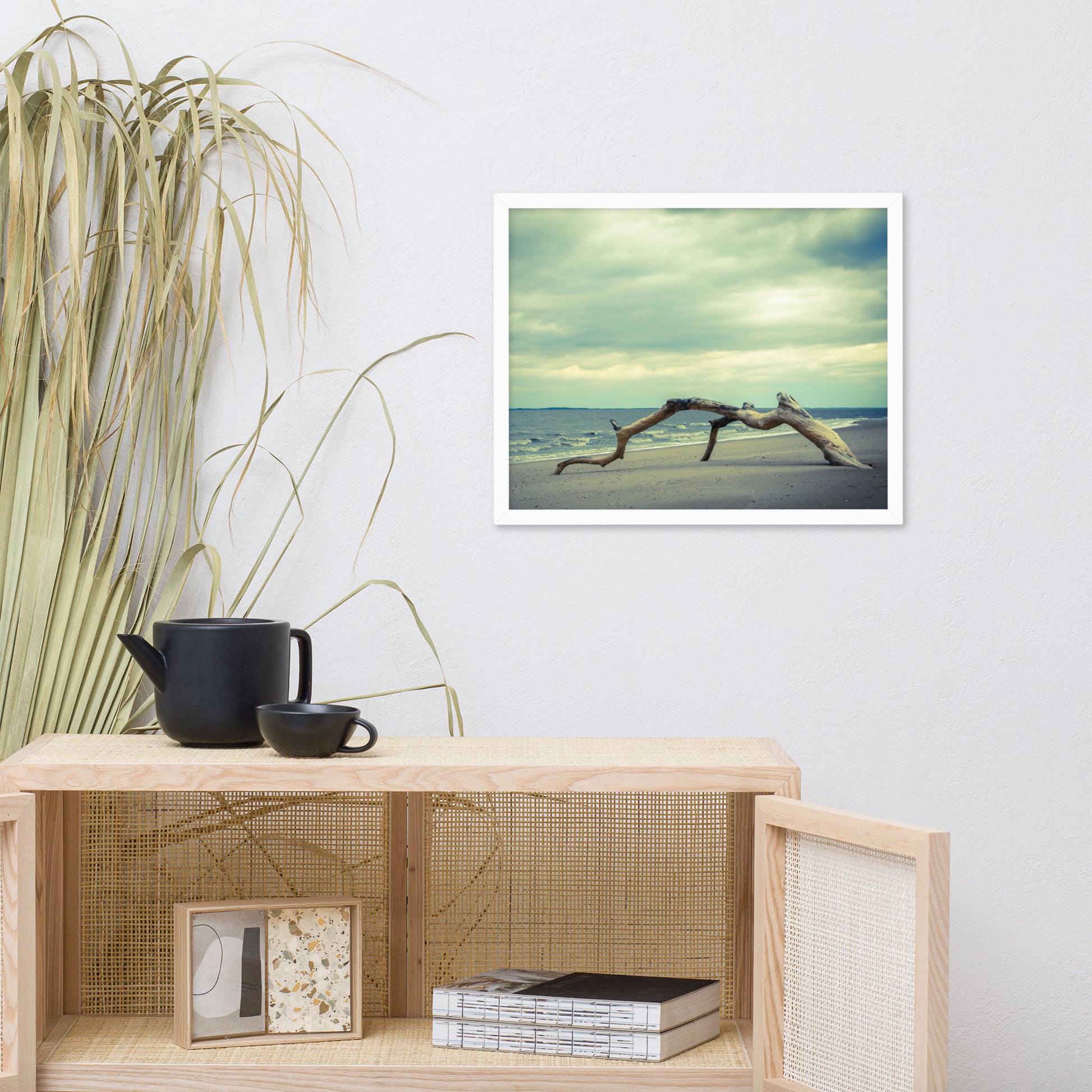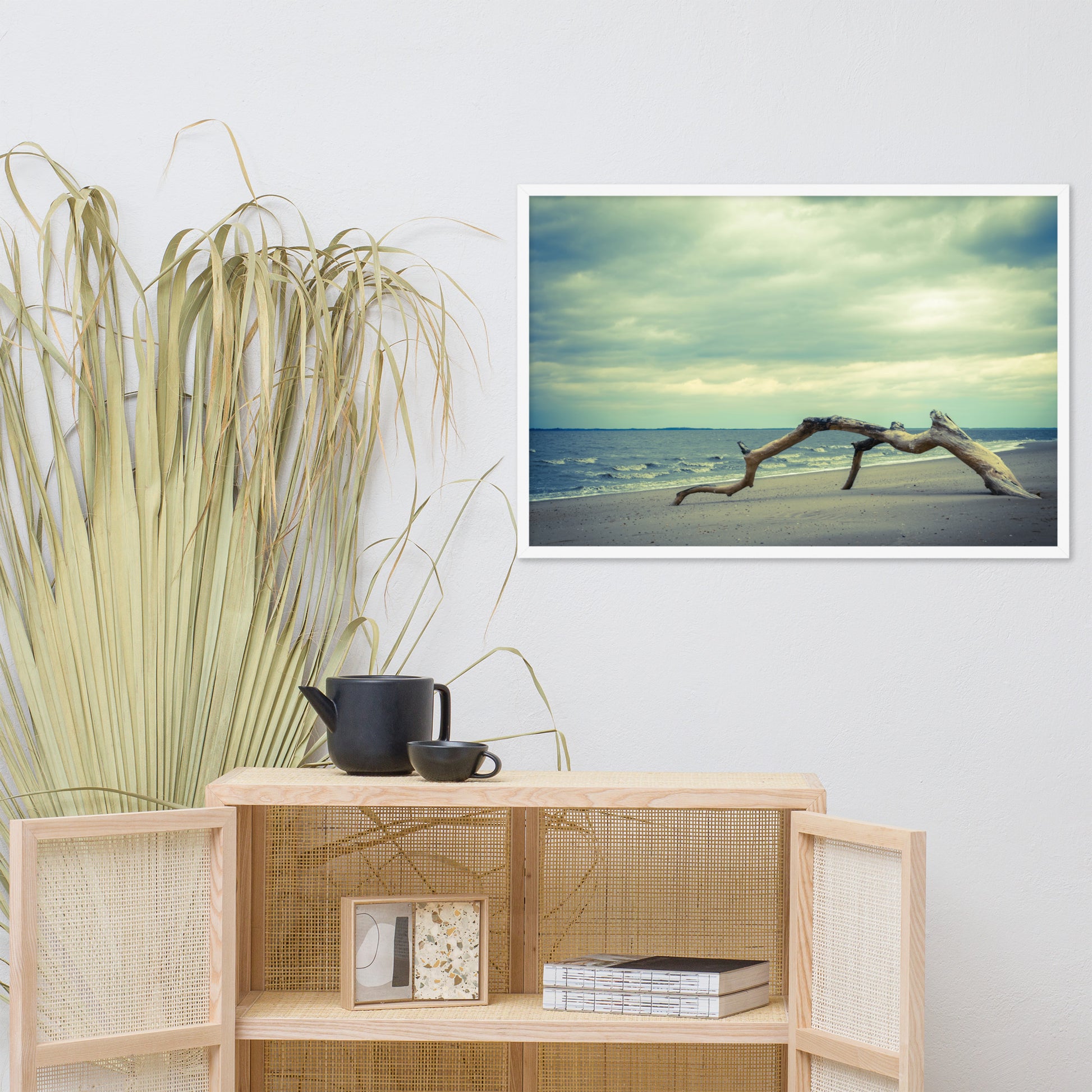 About this sea shore wall art: This striking art print transports you to the windswept shores of Woodland Beach, Delaware. A lone, weathered tree, twisted and sculpted by time and tide, stands defiant against the dramatic backdrop of a stormy sky. The teal-infused palette adds a touch of drama and intrigue, while the soft light filtering through the clouds creates a sense of ethereal beauty.
