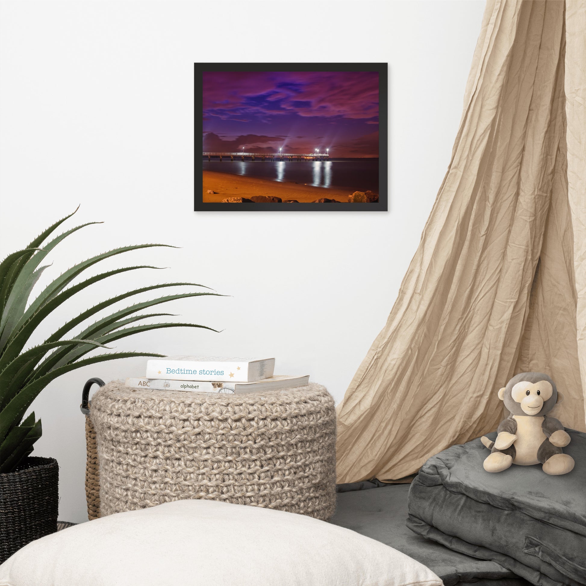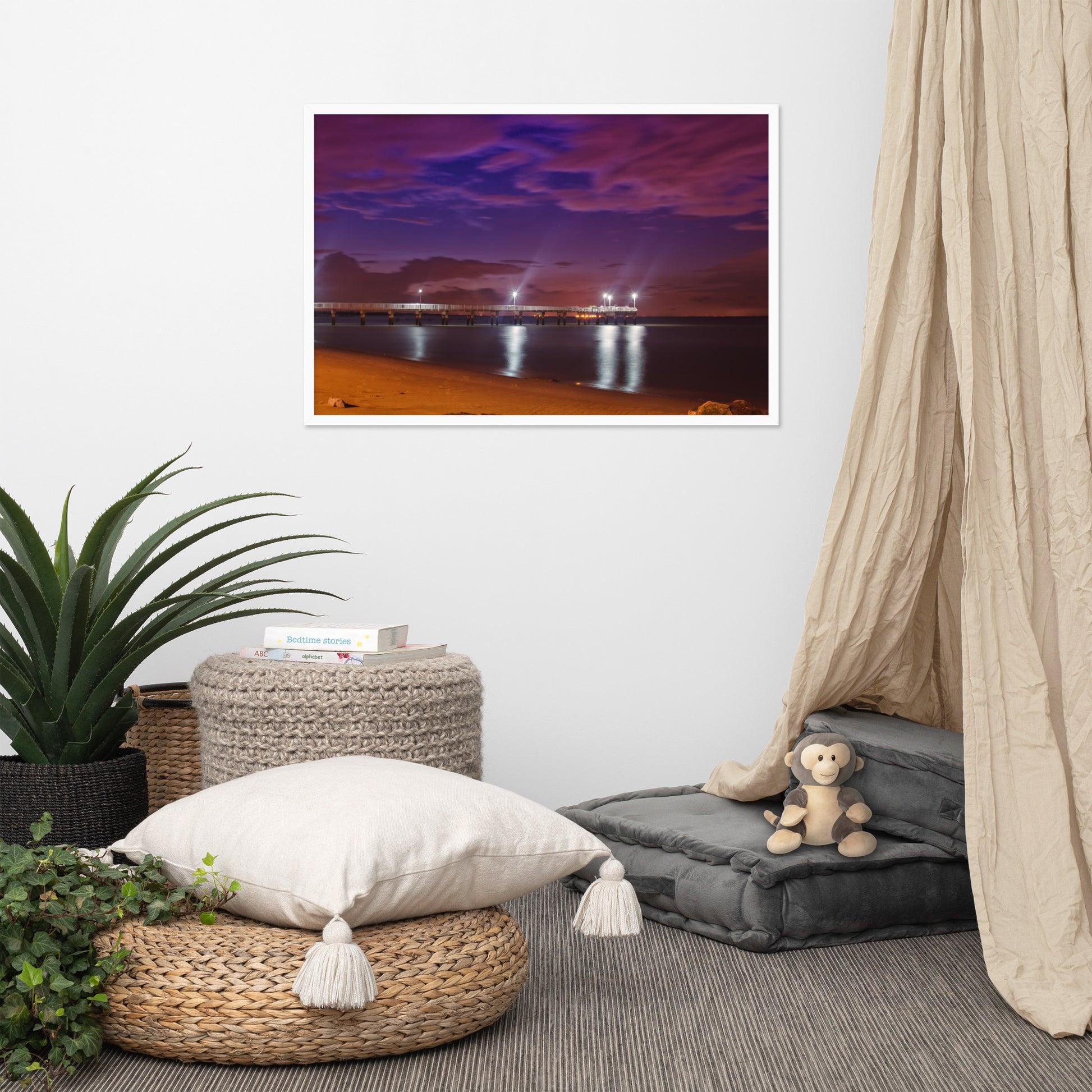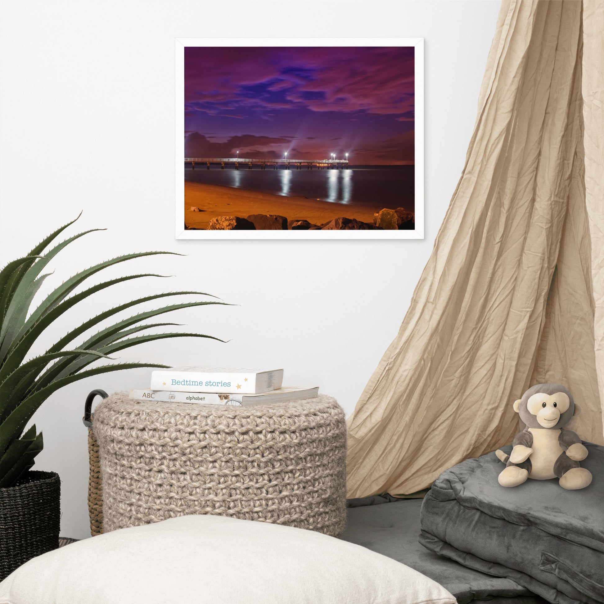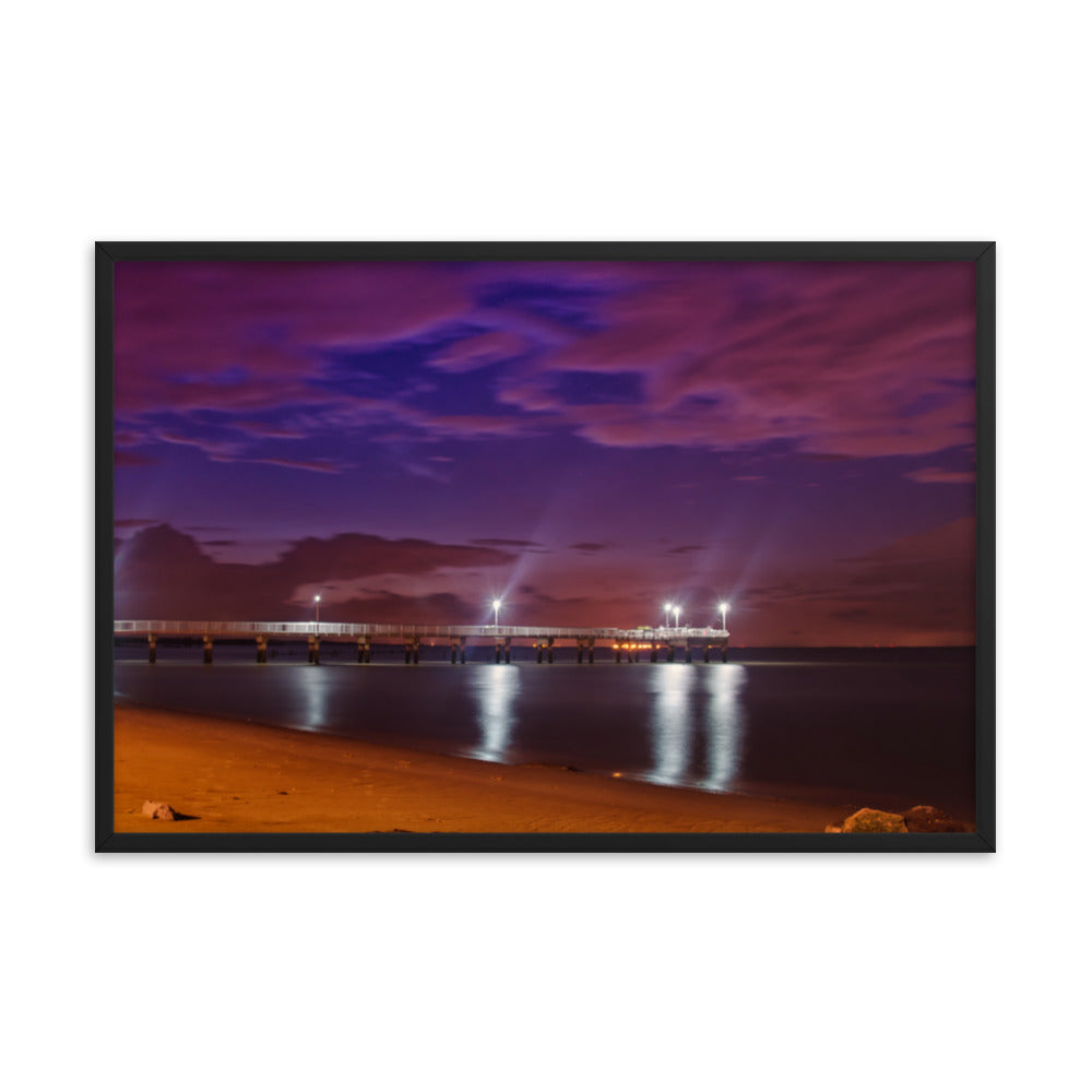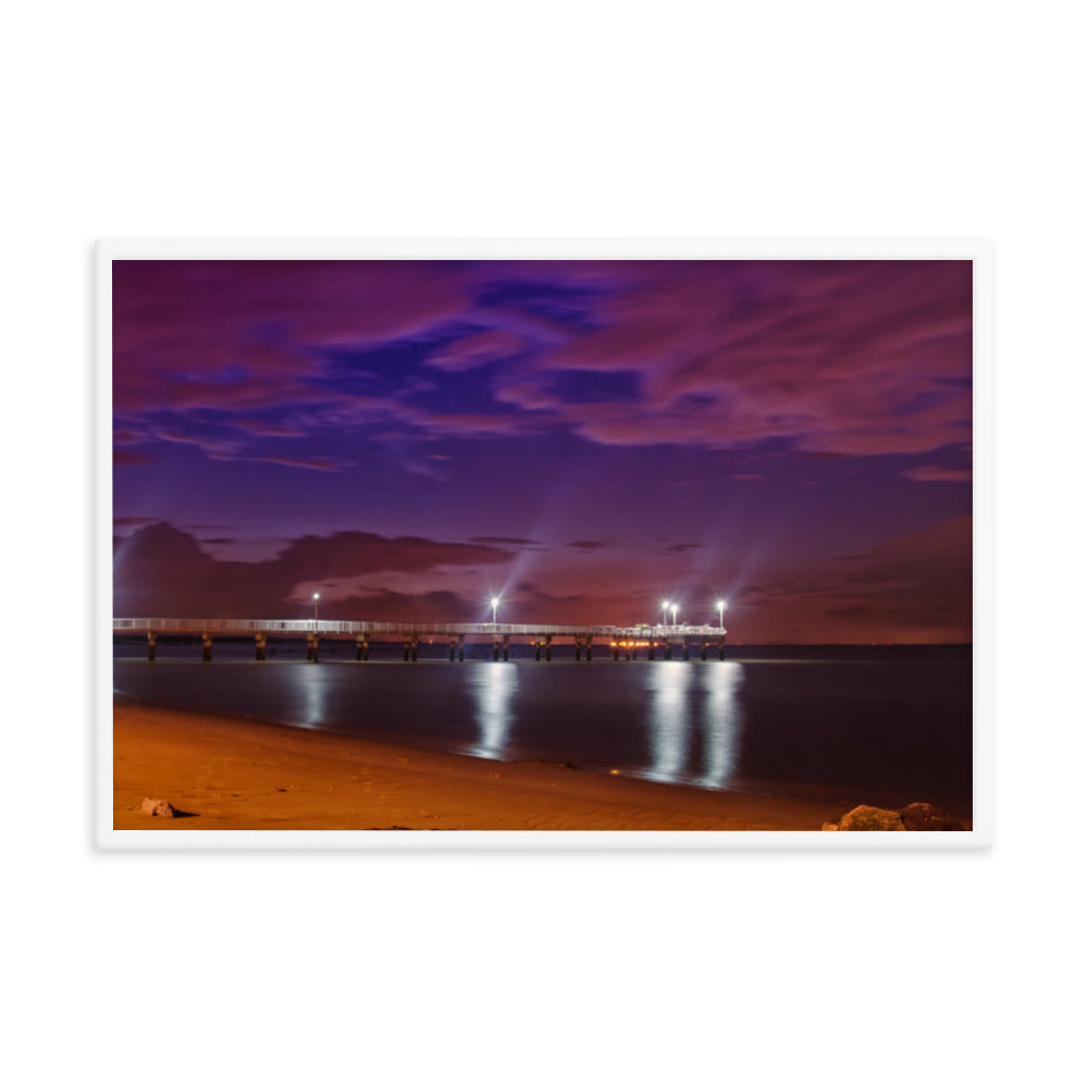 About these seashore art prints: Capture the serene beauty of the coast with this stunning framed print. "The Pier at Woodland Beach" showcases a breathtaking twilight scene where the sky is ablaze with vibrant hues of purple, pink, and blue. The pier stretches out into the calm waters, illuminated by warm, inviting lights that reflect on the gentle waves. The soft sandy beach, dotted with rocks, adds a touch of natural charm to this captivating composition.
