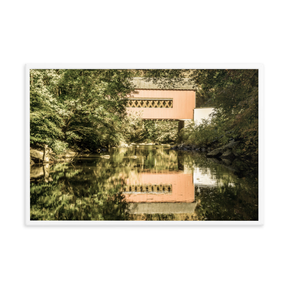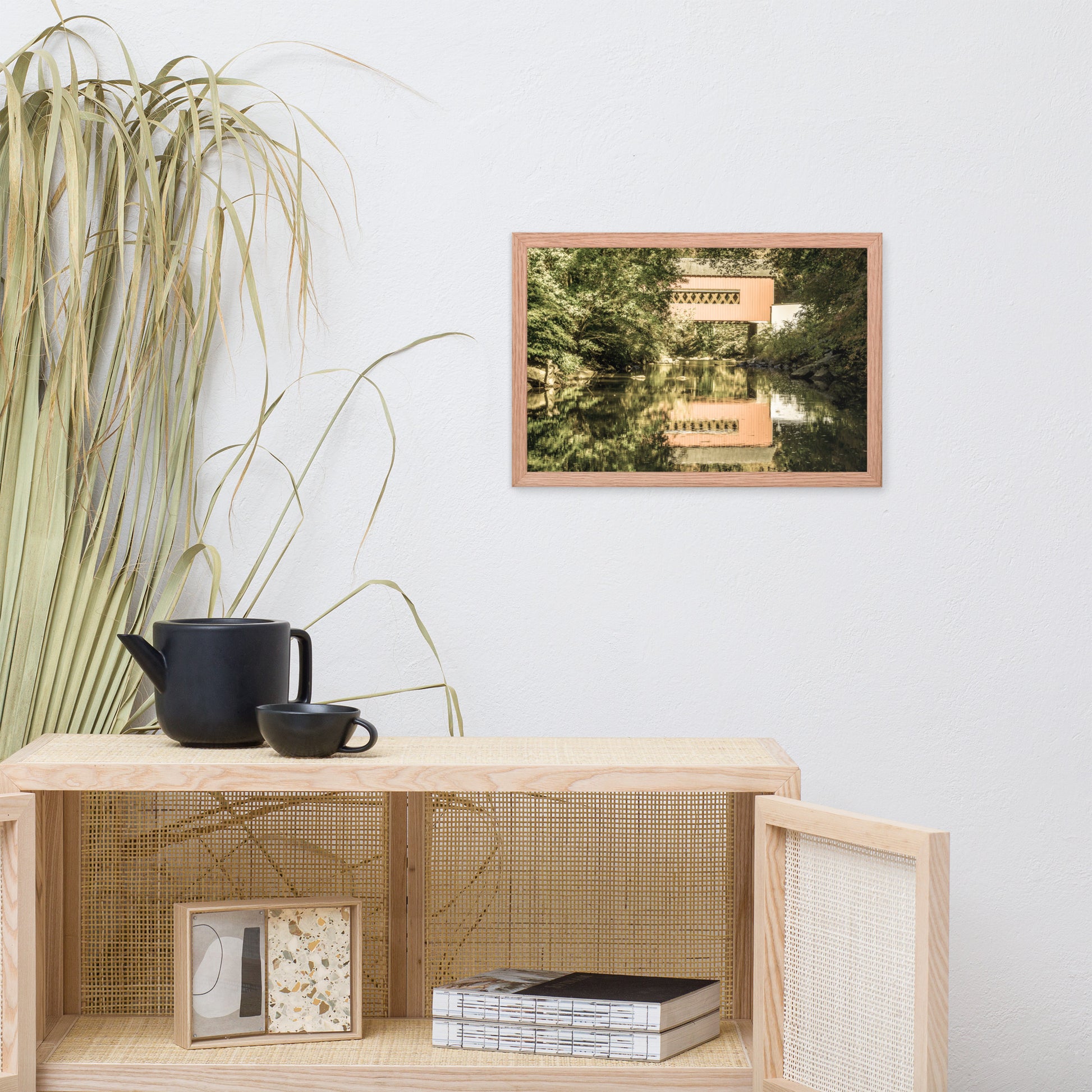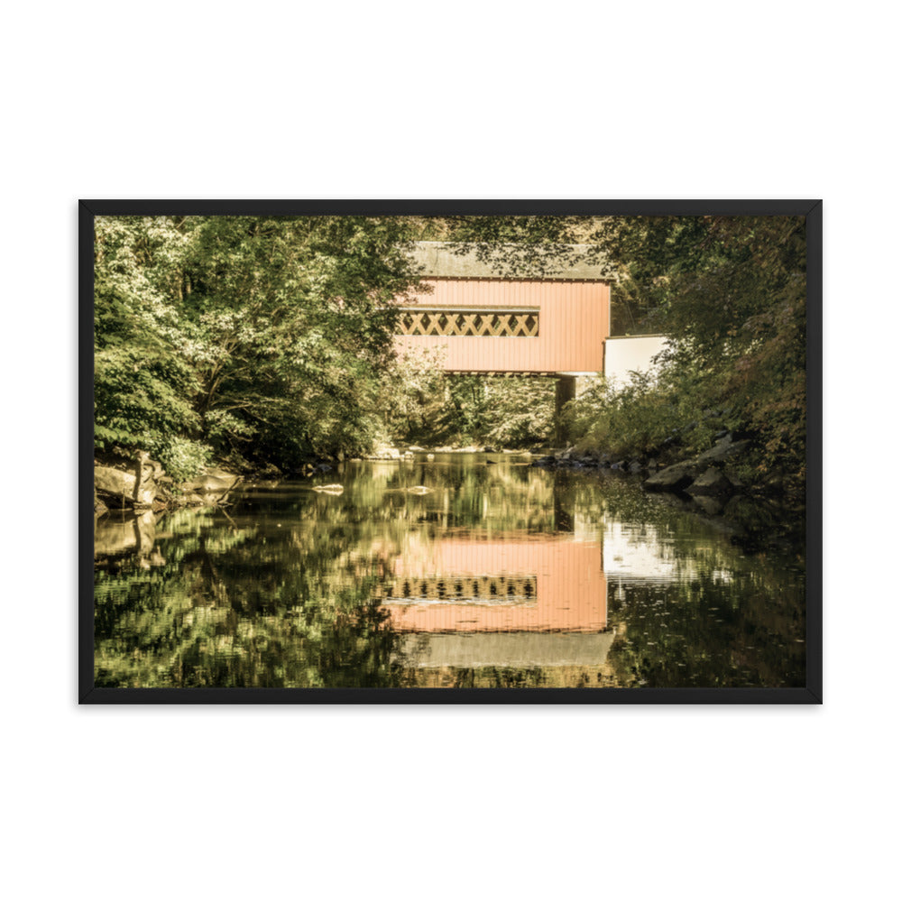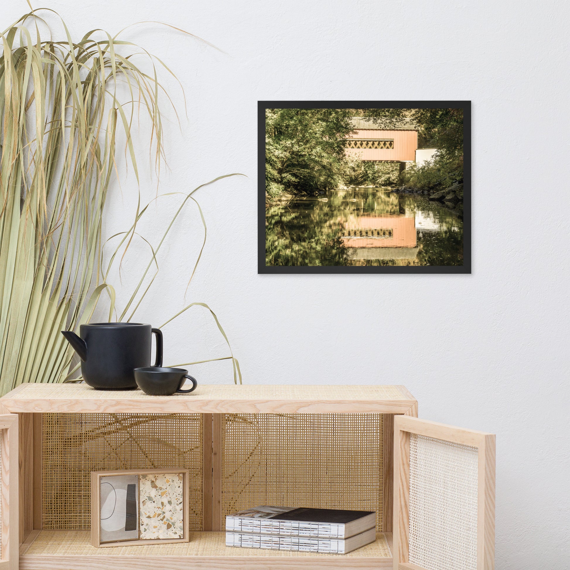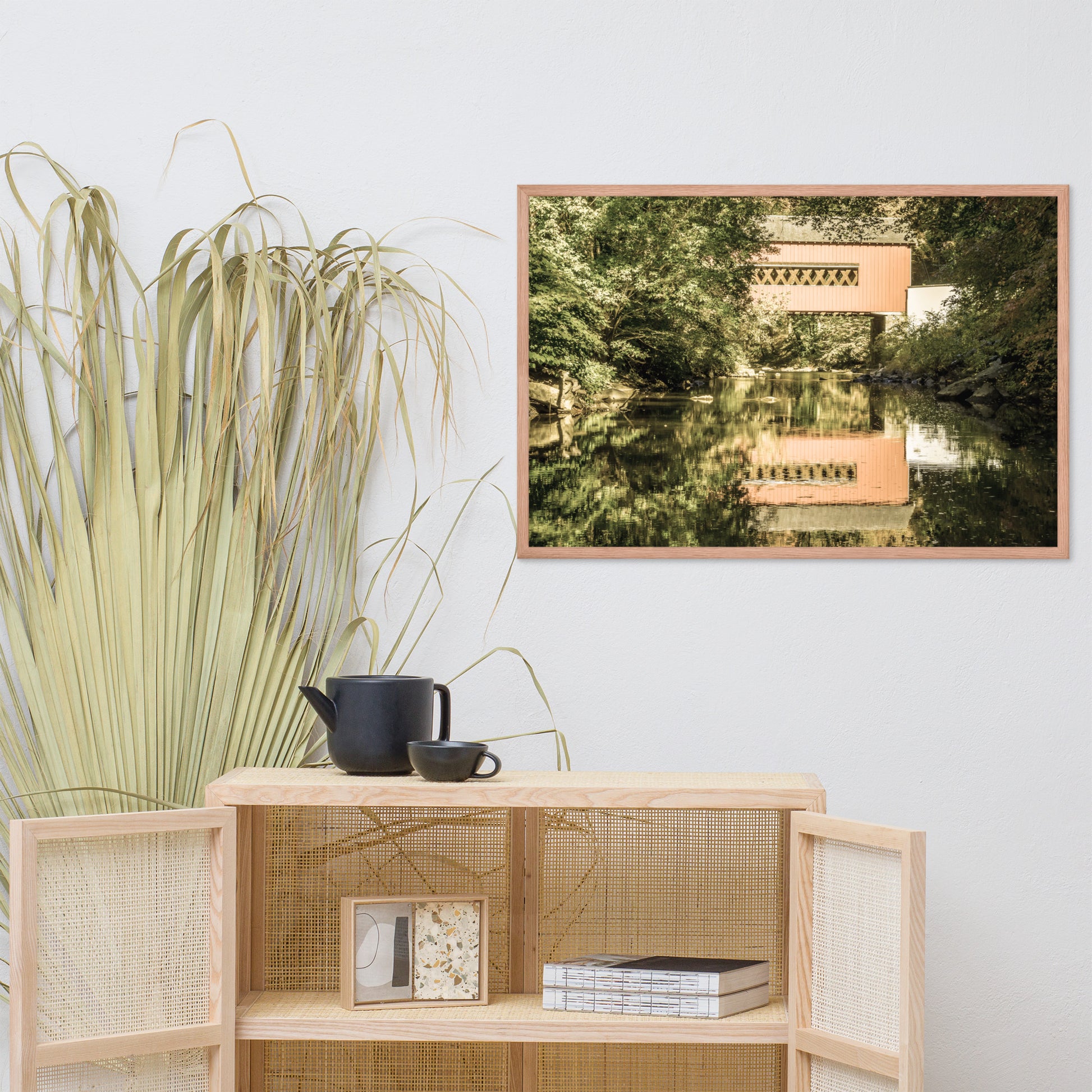 Rustic Framed Art: The Reflection of Wooddale Covered Bridge Aged - Rural / Country Style / Landscape / Nature Photographic Print - Artwork - Wall Decor