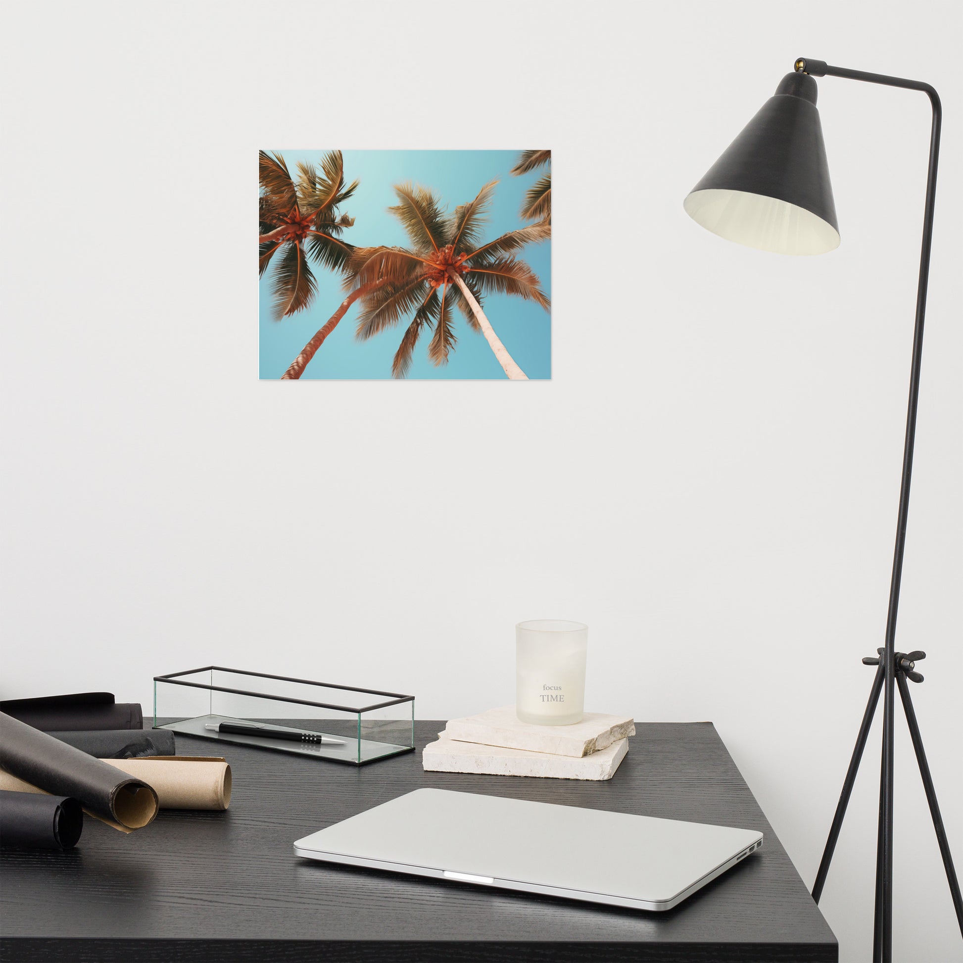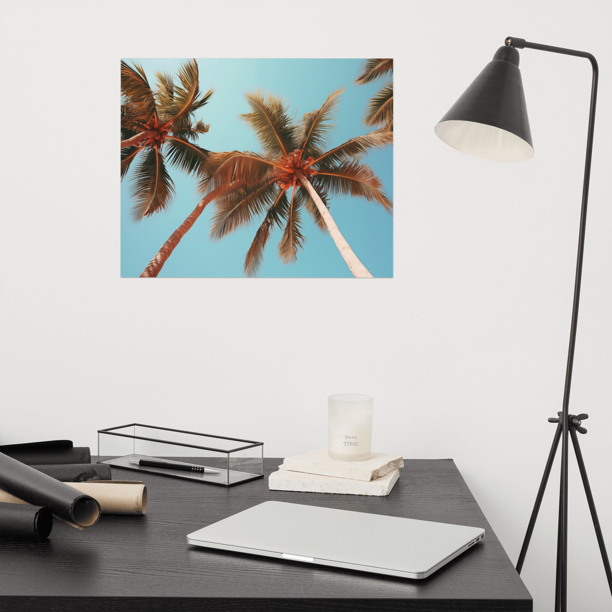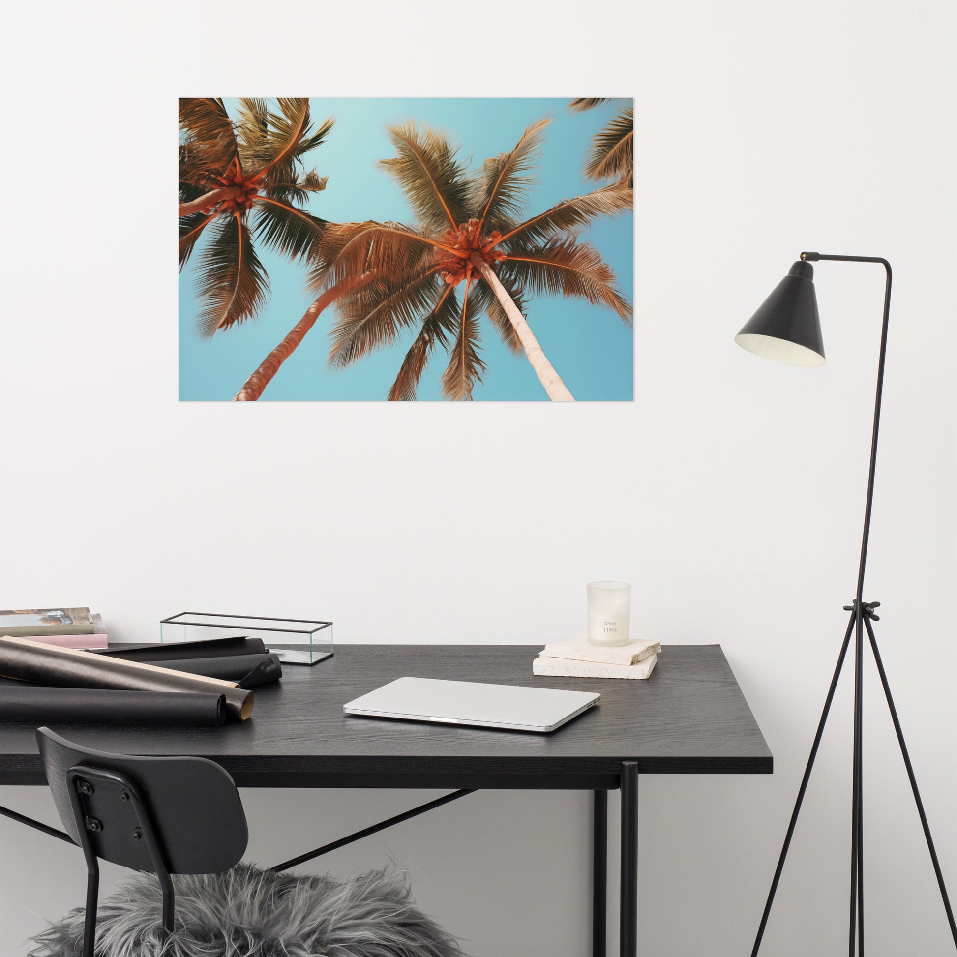 "Tropical Tranquility" evokes a sense of serene escape with its depiction of lush palm trees against a vibrant blue sky. The digitally created artwork captures the texture of the palm fronds and the smooth, sun-kissed trunks with photorealistic detail. The minimalist composition focuses on the upward sweep of the trees, drawing the eye towards the clear, open sky. The warm tones and lush greenery create a sense of tropical paradise. Available as an unframed art print, allowing for personalized framing to complement any decor.