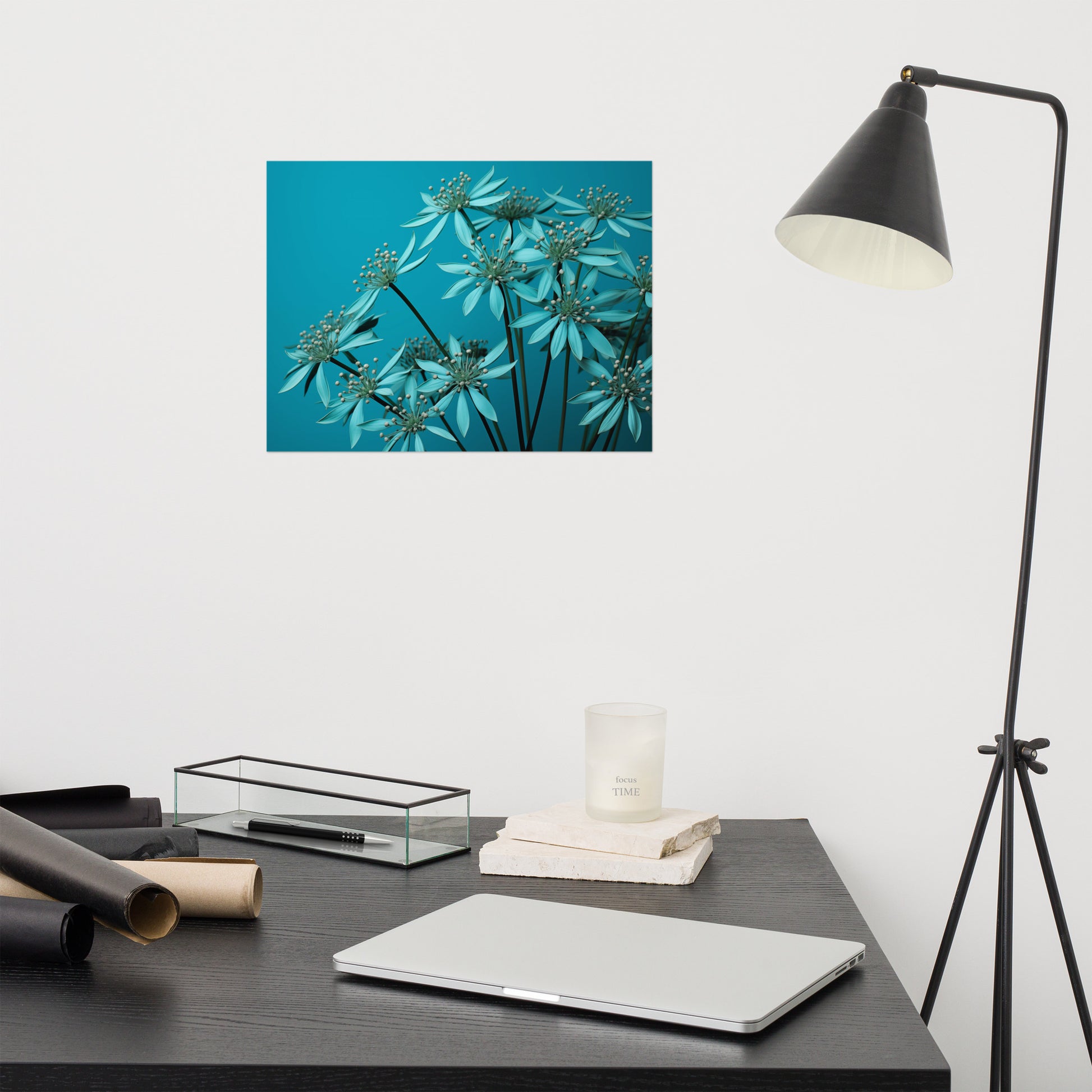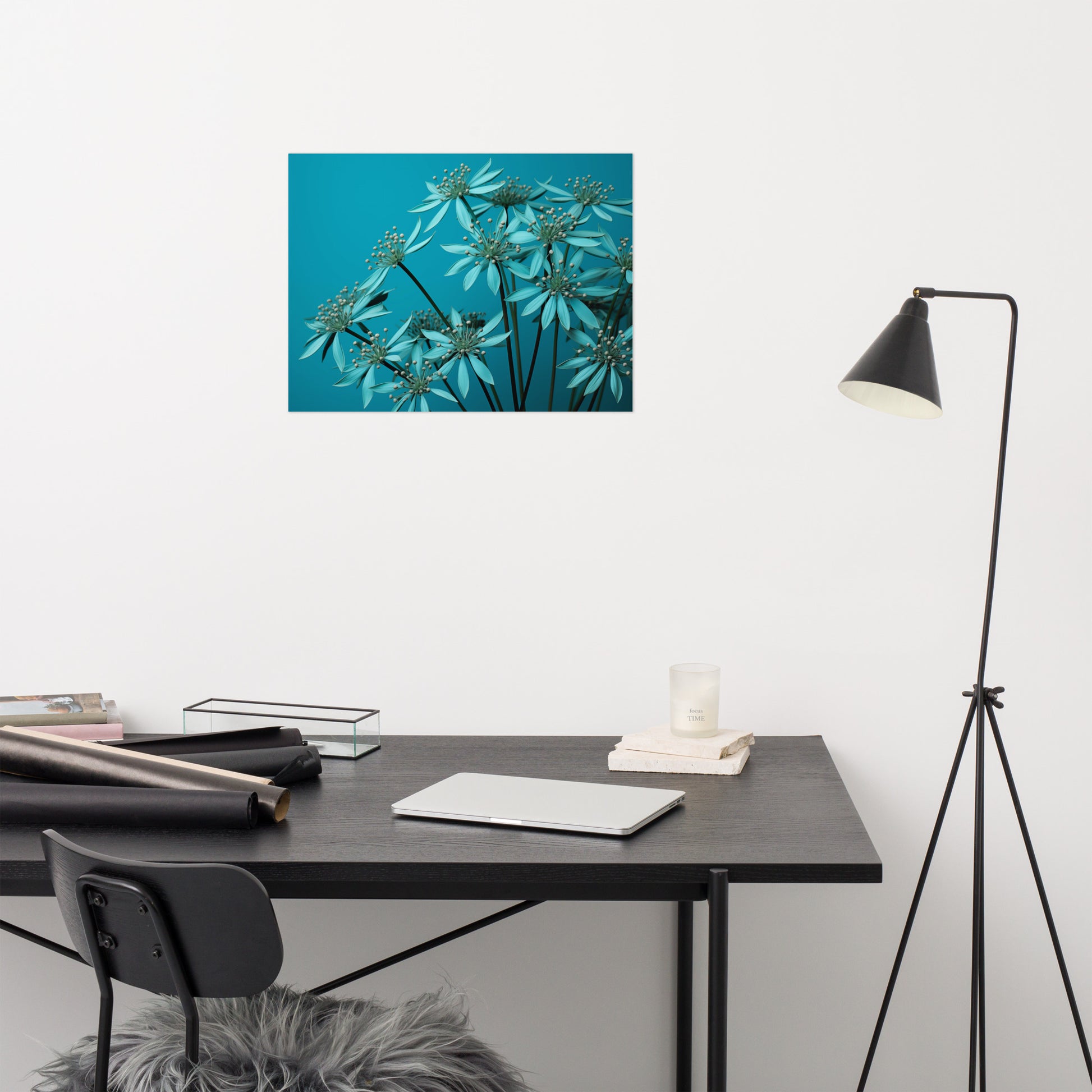 "Turquoise Tranquility" presents a cluster of delicate, star-shaped flowers in a captivating shade of teal. The digitally created artwork captures the intricate details of the petals and stamens with photorealistic precision, showcasing their delicate textures and subtle variations in color. The minimalist composition focuses on the graceful forms of the flowers, their slender stems and vibrant blooms creating a sense of natural elegance. Available as an unframed art print, allowing for personalized framing to suit any decor.