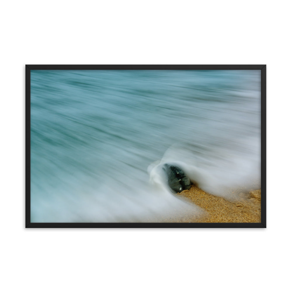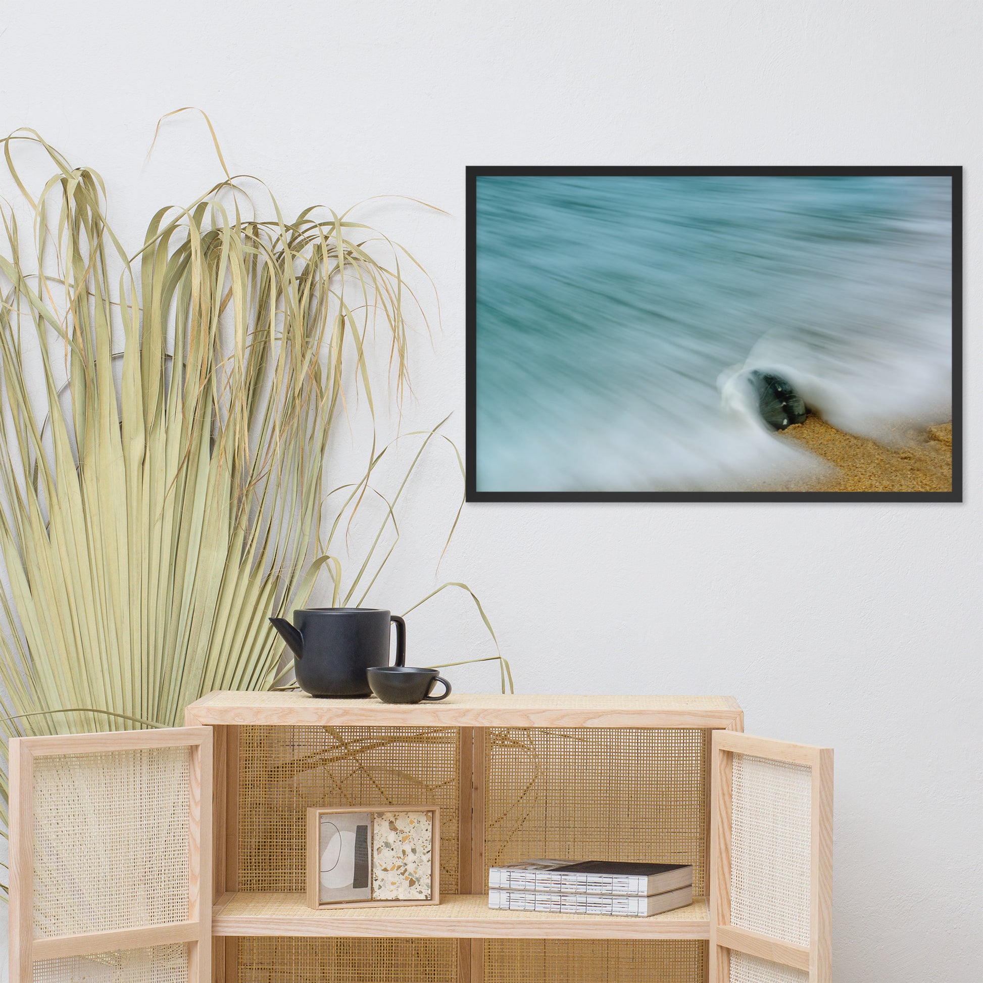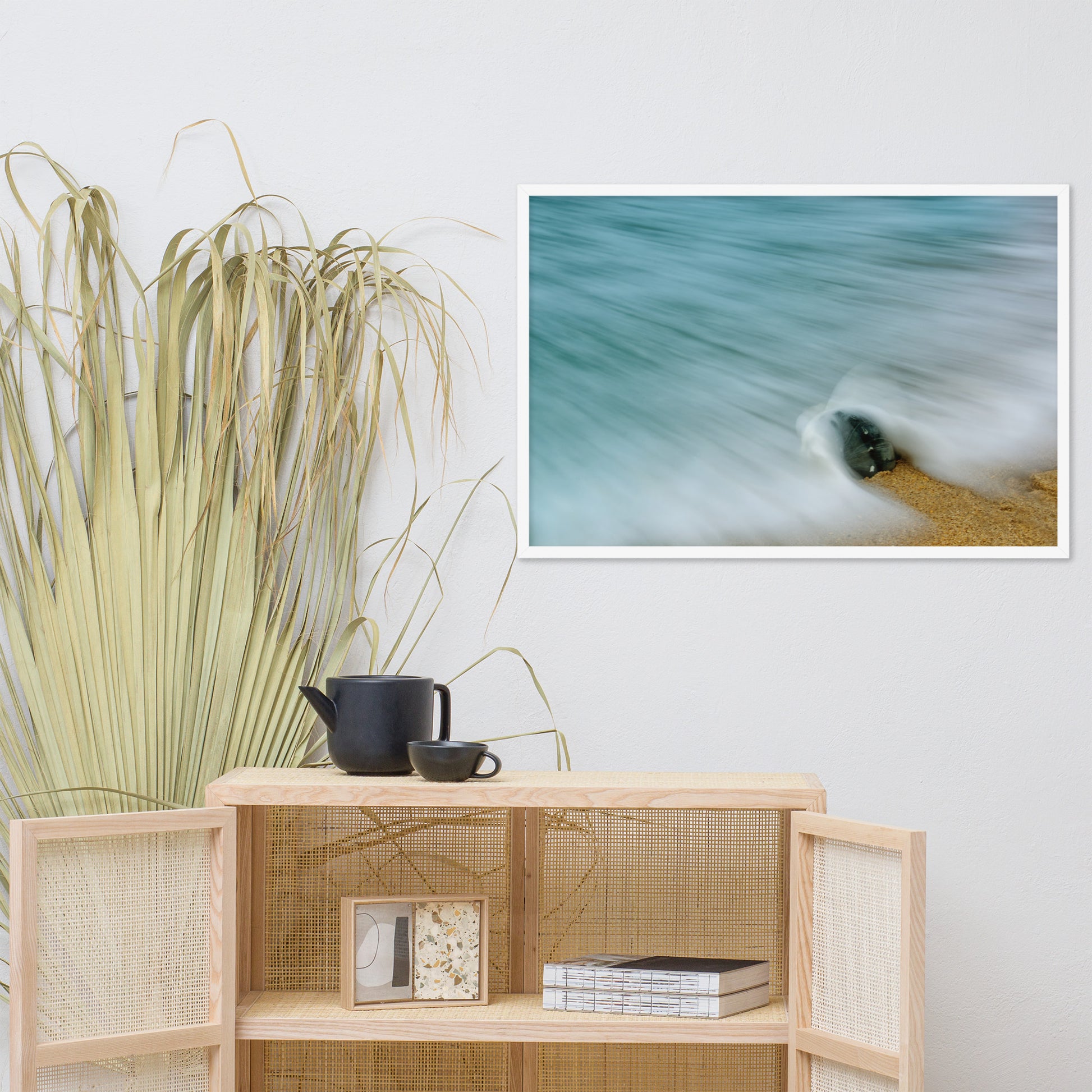 About this beach picture wall art: Transform your space into a tranquil coastal escape with this mesmerizing framed print, "Whelk Seashell and Misty Wave." This captivating artwork captures the ethereal beauty of the shoreline, where a lone whelk shell rests peacefully on the sandy beach. The ocean's gentle caress transforms into a misty veil, creating a sense of movement and wonder.