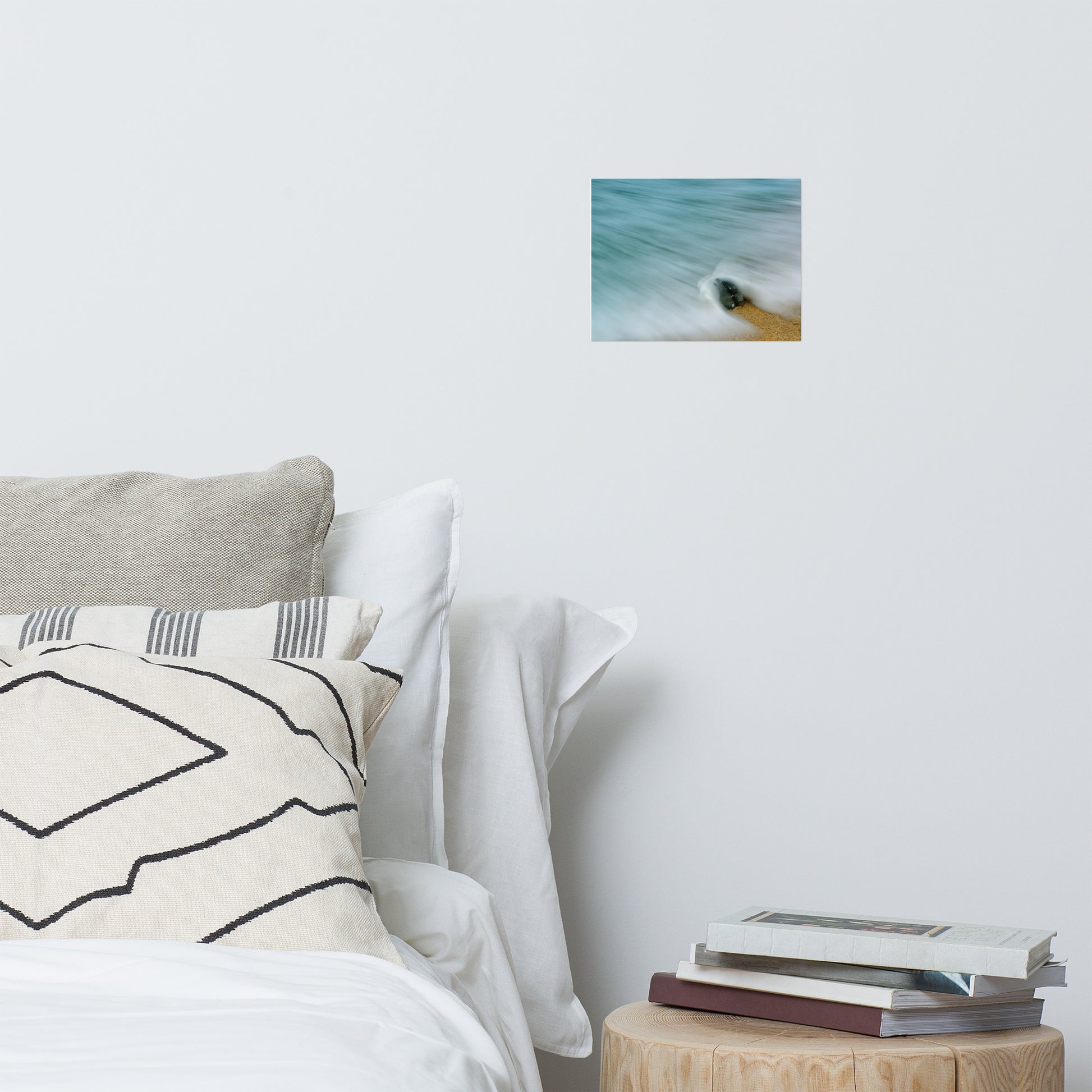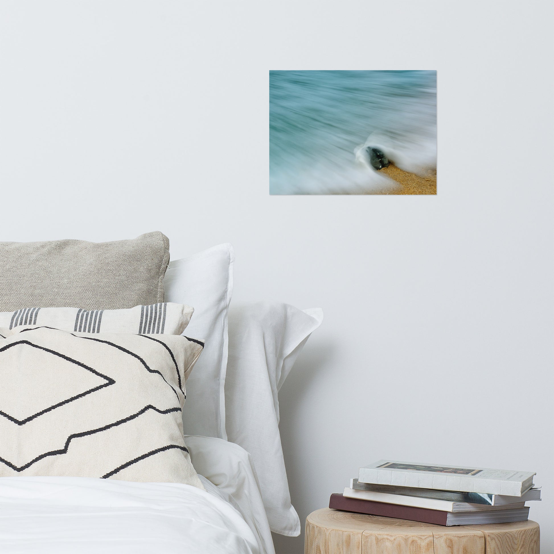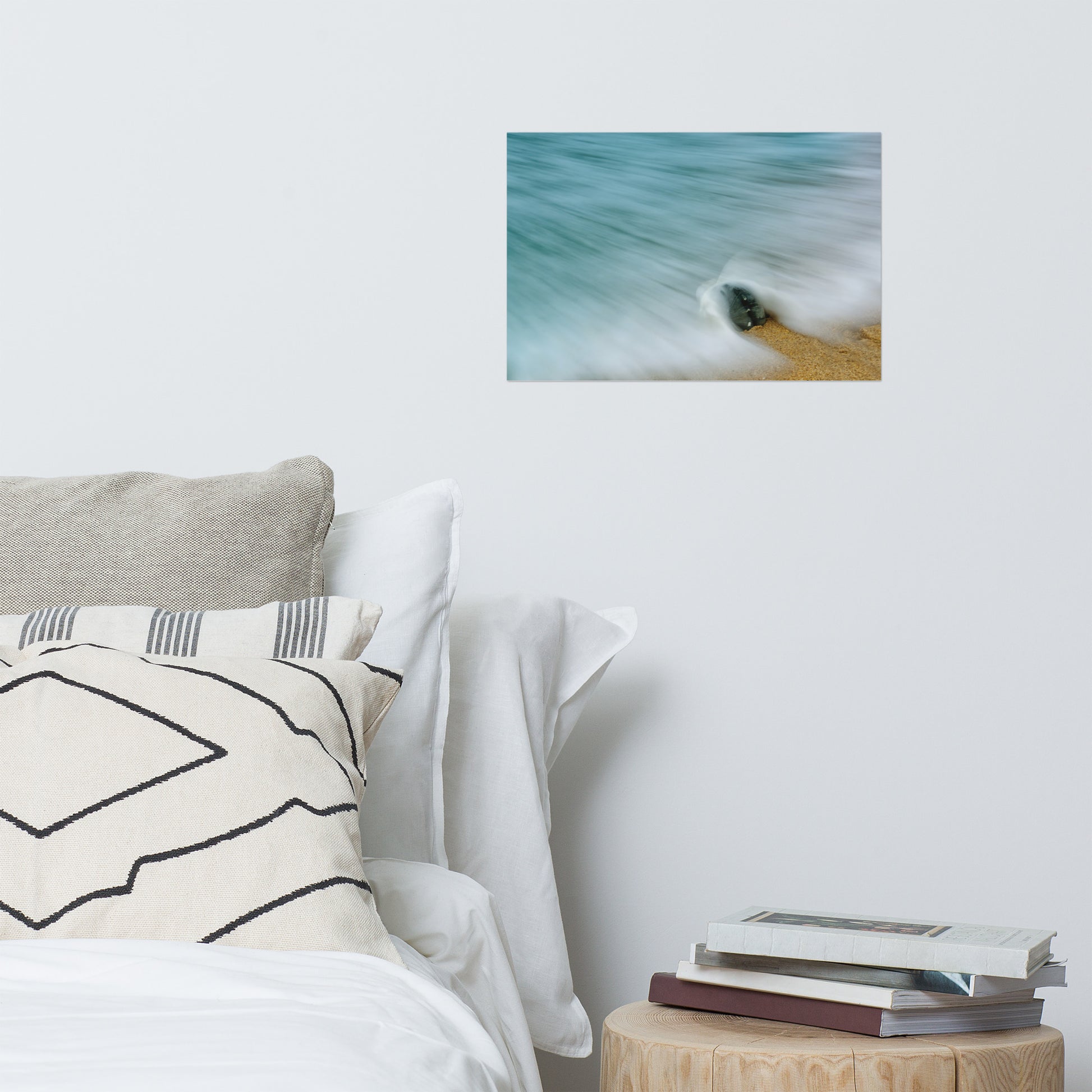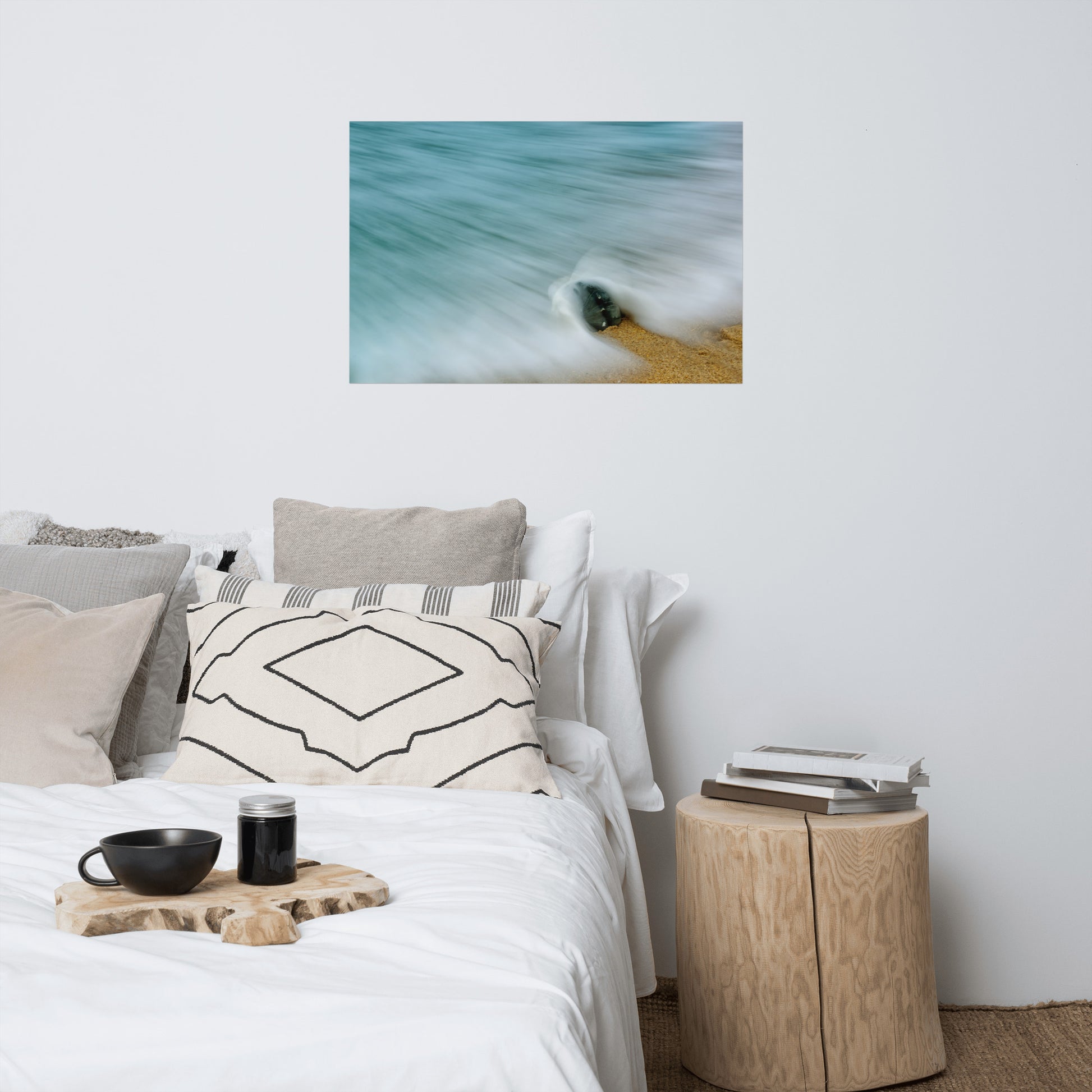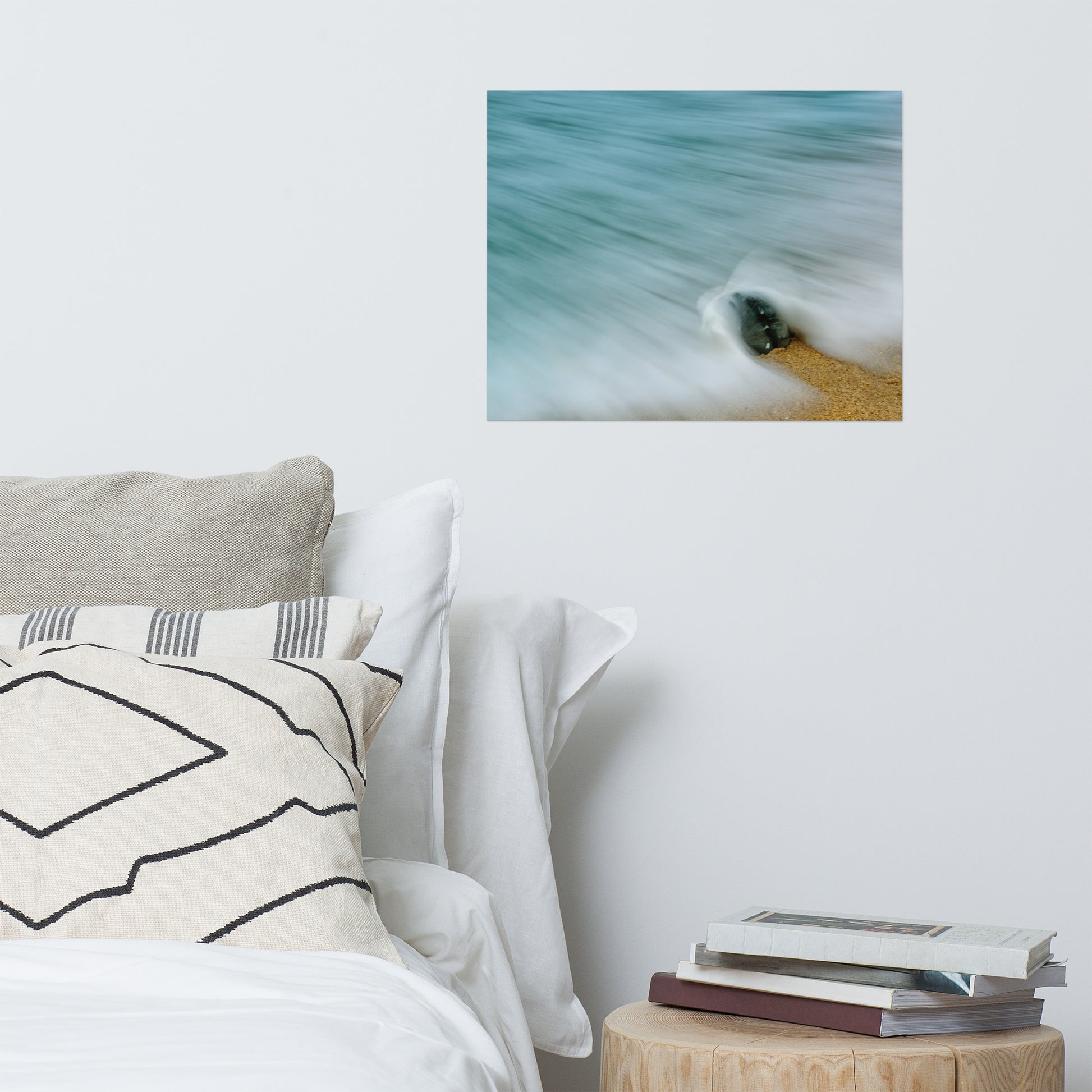 About this abstract beach print: Capture the ethereal beauty of the coast with this stunning frameless art print, "Whelk Seashell and Misty Wave." Taken on the sandy shores of Ocracoke Island, North Carolina, this long exposure photograph showcases a dark, weathered whelk shell as a misty wave washes over it. The slower shutter speed transforms the rushing water into an ethereal mist, creating a sense of tranquility and wonder. Bring a touch of coastal magic to your home with this unique and evocative piece.