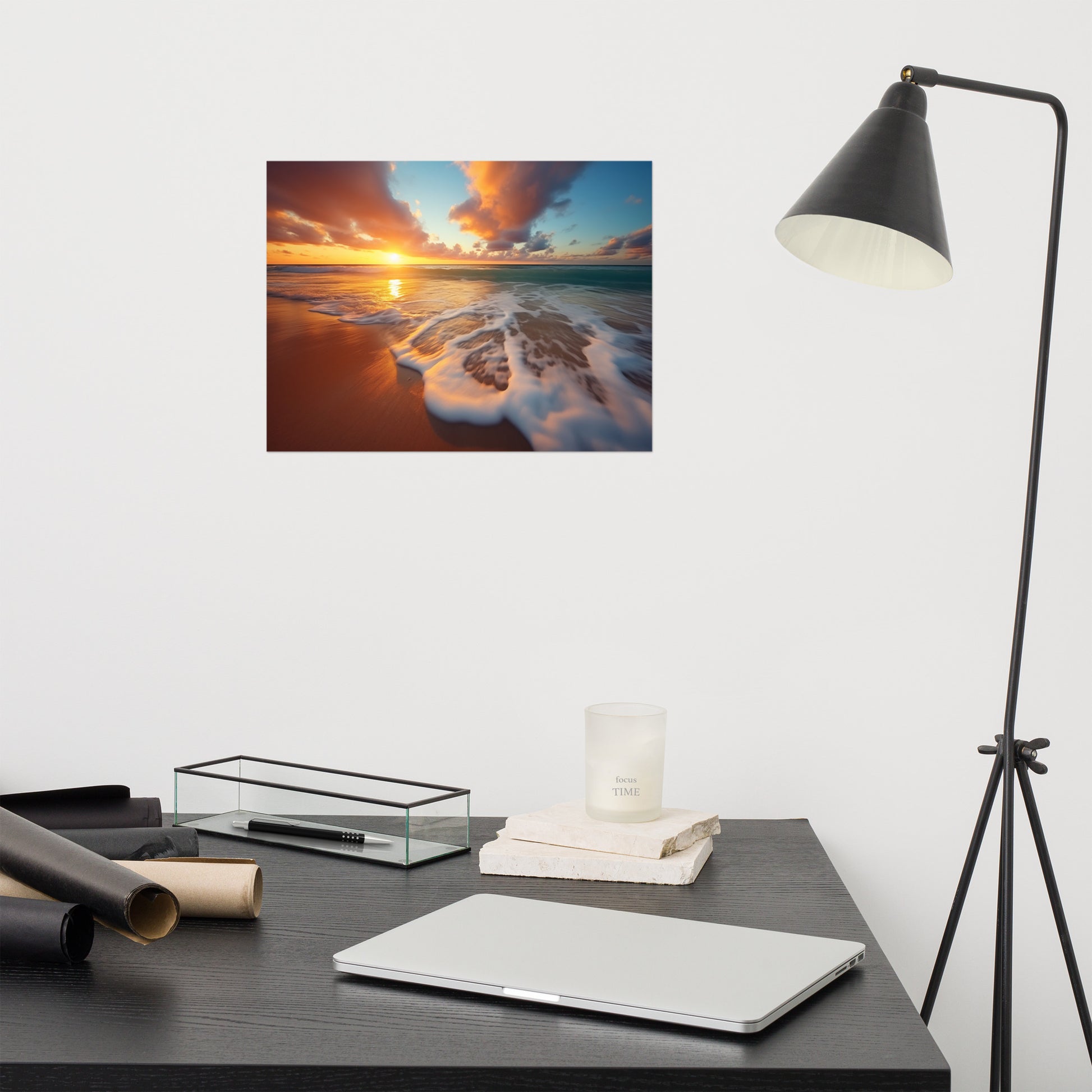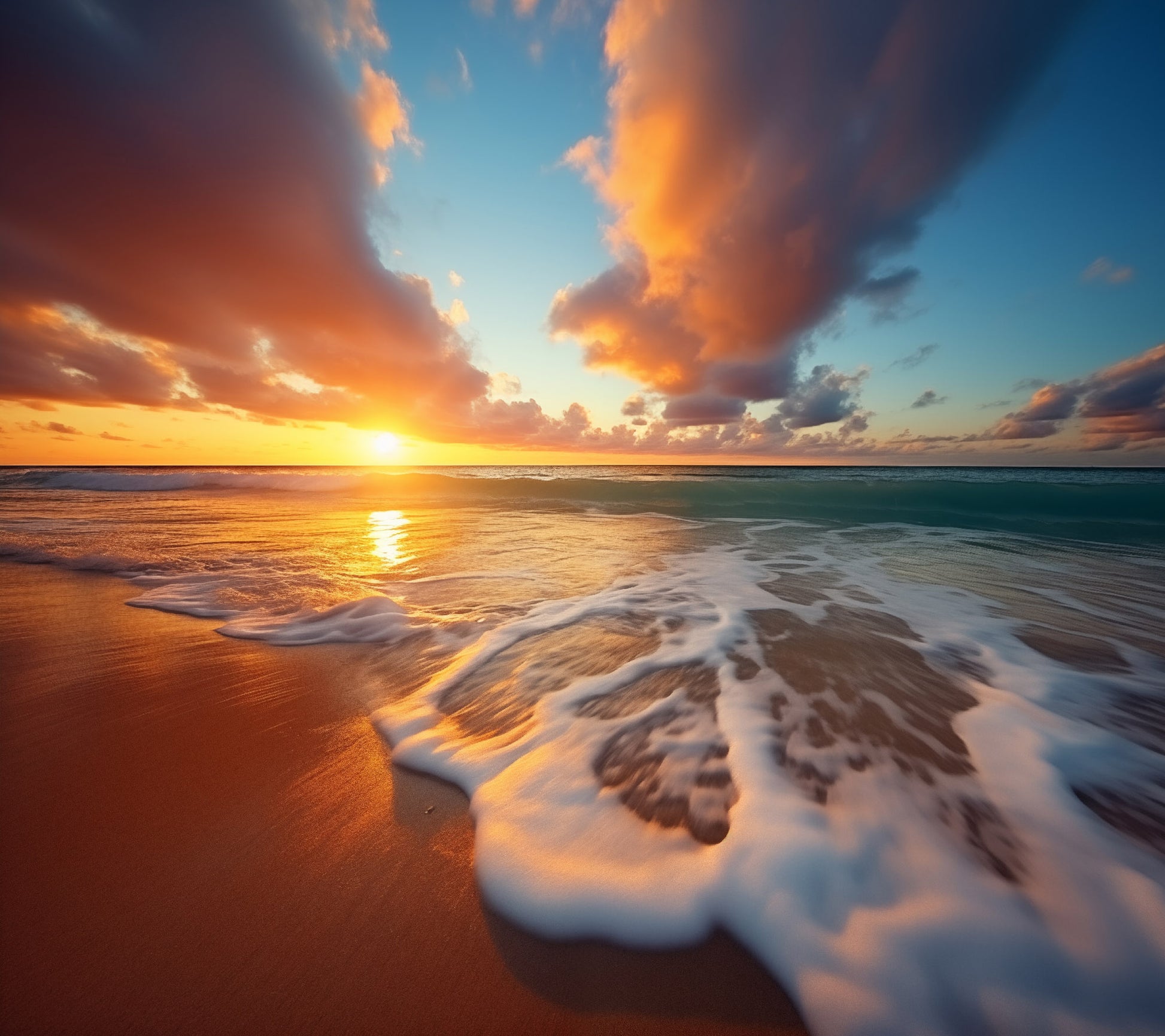 "Whispering Waves" is a digitally created photorealistic illustration capturing the breathtaking beauty of a sunrise over a tranquil ocean beach. The perspective is low, placing the viewer at the edge of the water as gentle waves wash over the smooth sand. The rising sun, just above the horizon, casts a warm, golden glow across the scene, illuminating the foamy tips of the waves and the wet sand. Dramatic clouds, tinged with hues of orange and pink, fill the sky, adding depth and a sense of movement to the composition. The transition from the cool blues of the ocean to the warm tones of the sky is seamless and natural. The overall effect is one of serene beauty and peaceful tranquility, capturing the magic of a perfect morning at the shore.
